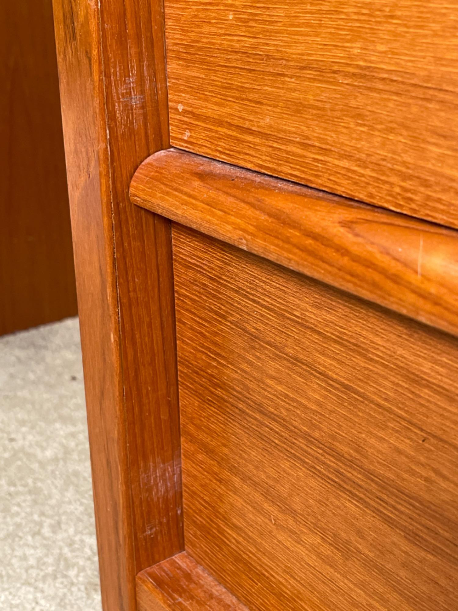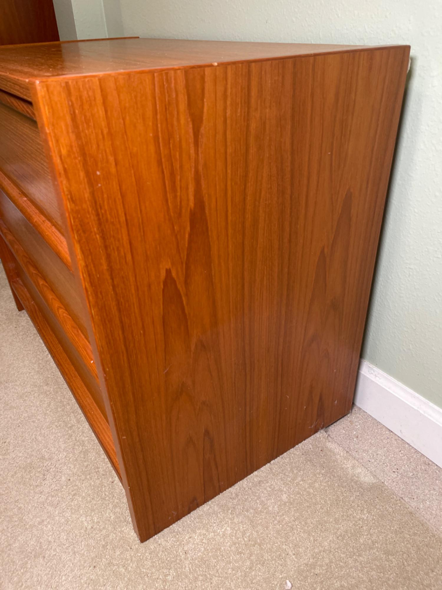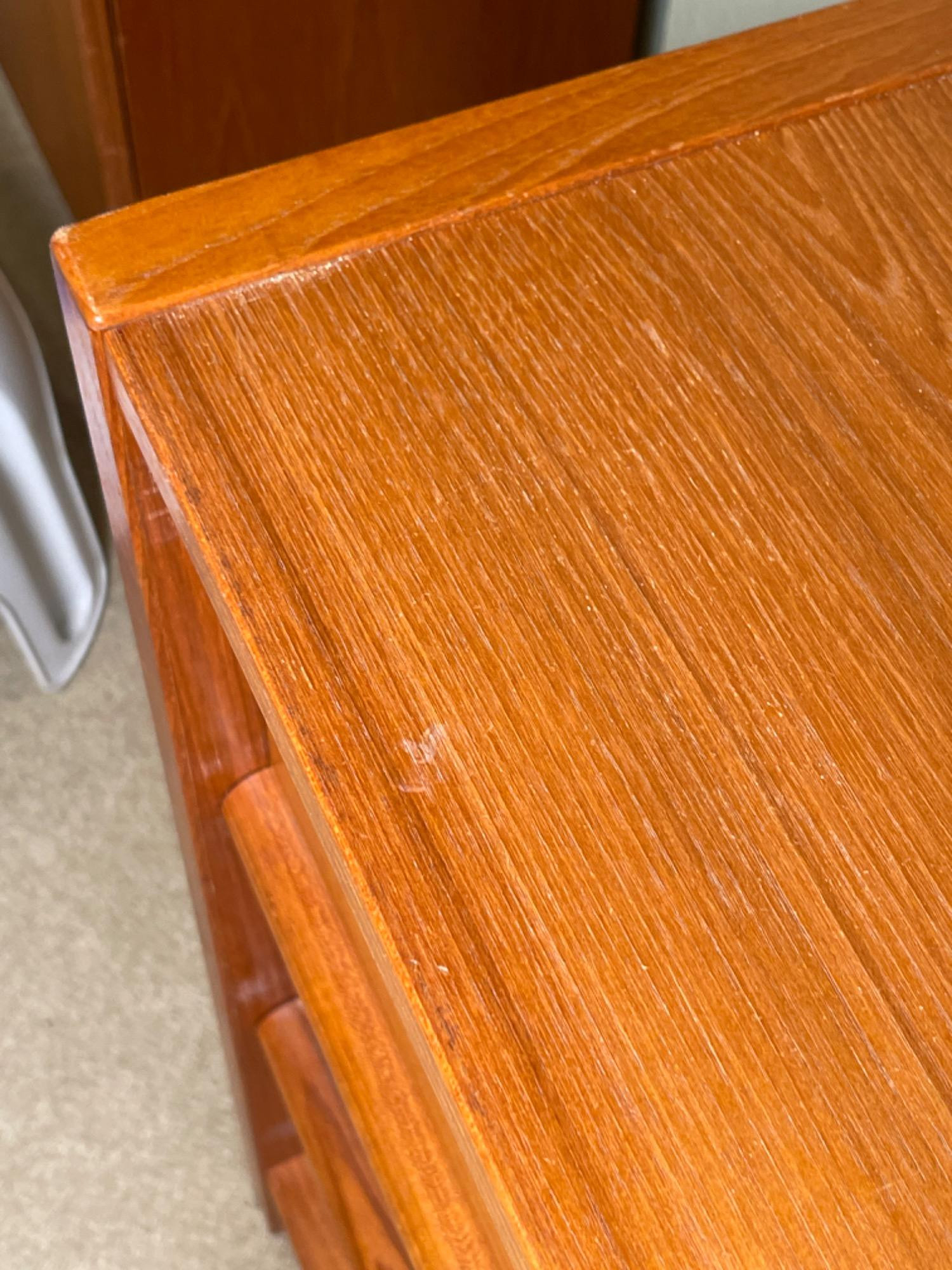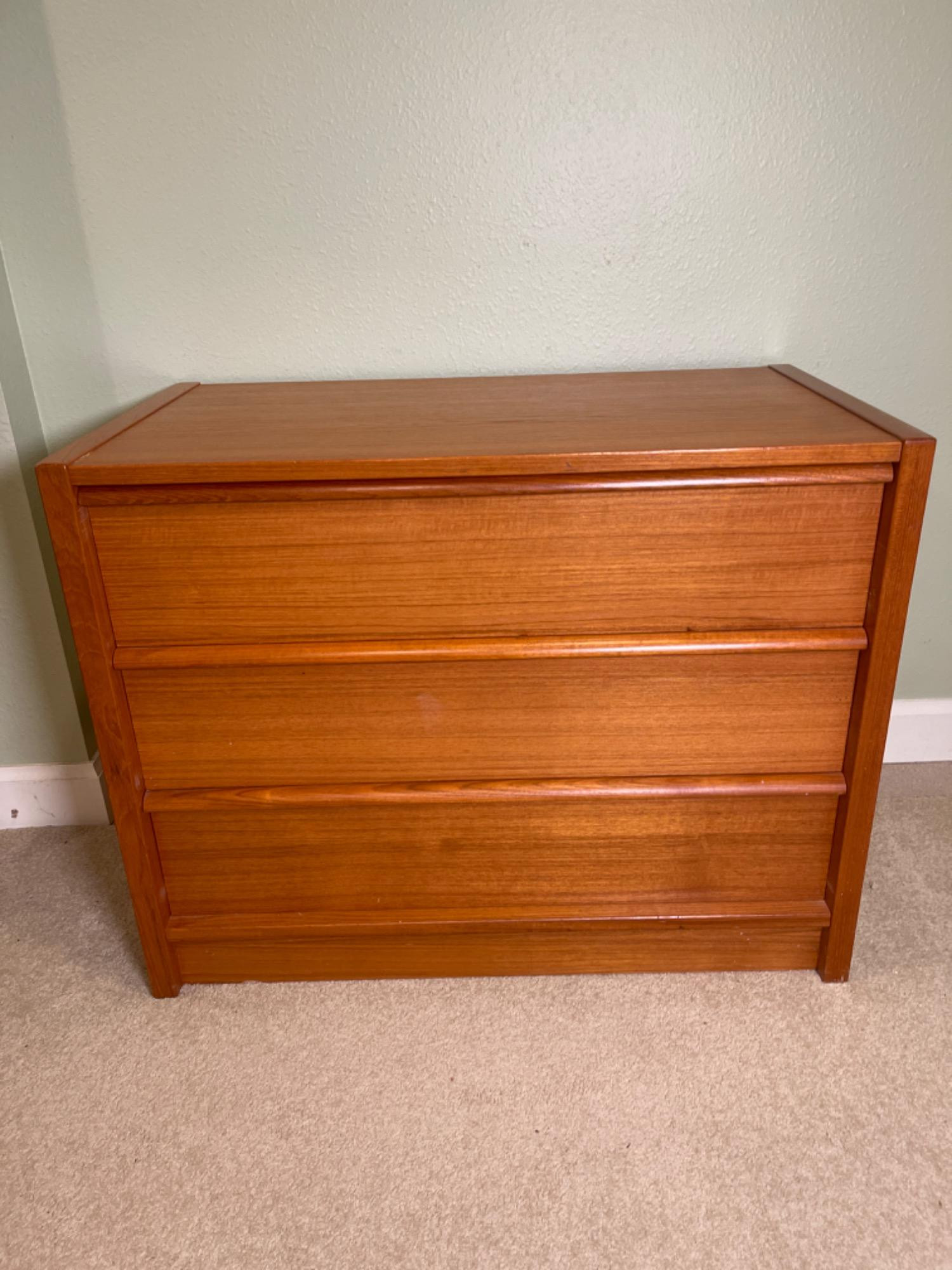 Vintage Teak Veneer 3-Drawer Dresser – Mid-Century Modern Style This vintage teak-veneered dresser embodies the timeless elegance of mid-century modern design, featuring a sleek, minimalist silhouette with integrated drawer pulls. With three spacious drawers, it provides both style and functionality, making it a perfect fit for bedrooms, living spaces, or offices. Condition: