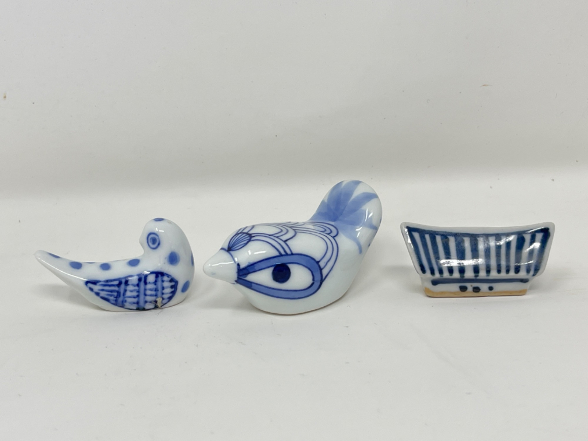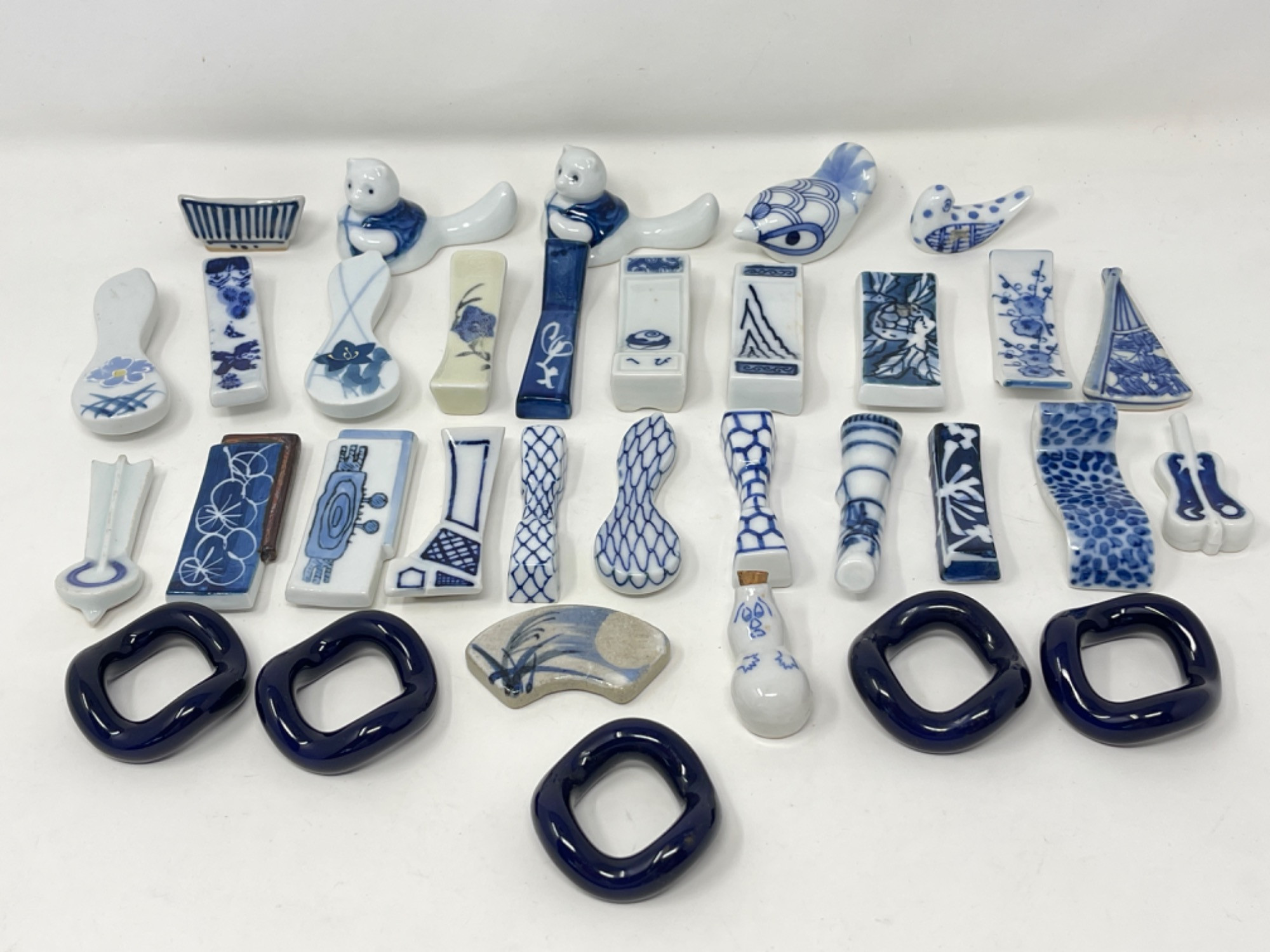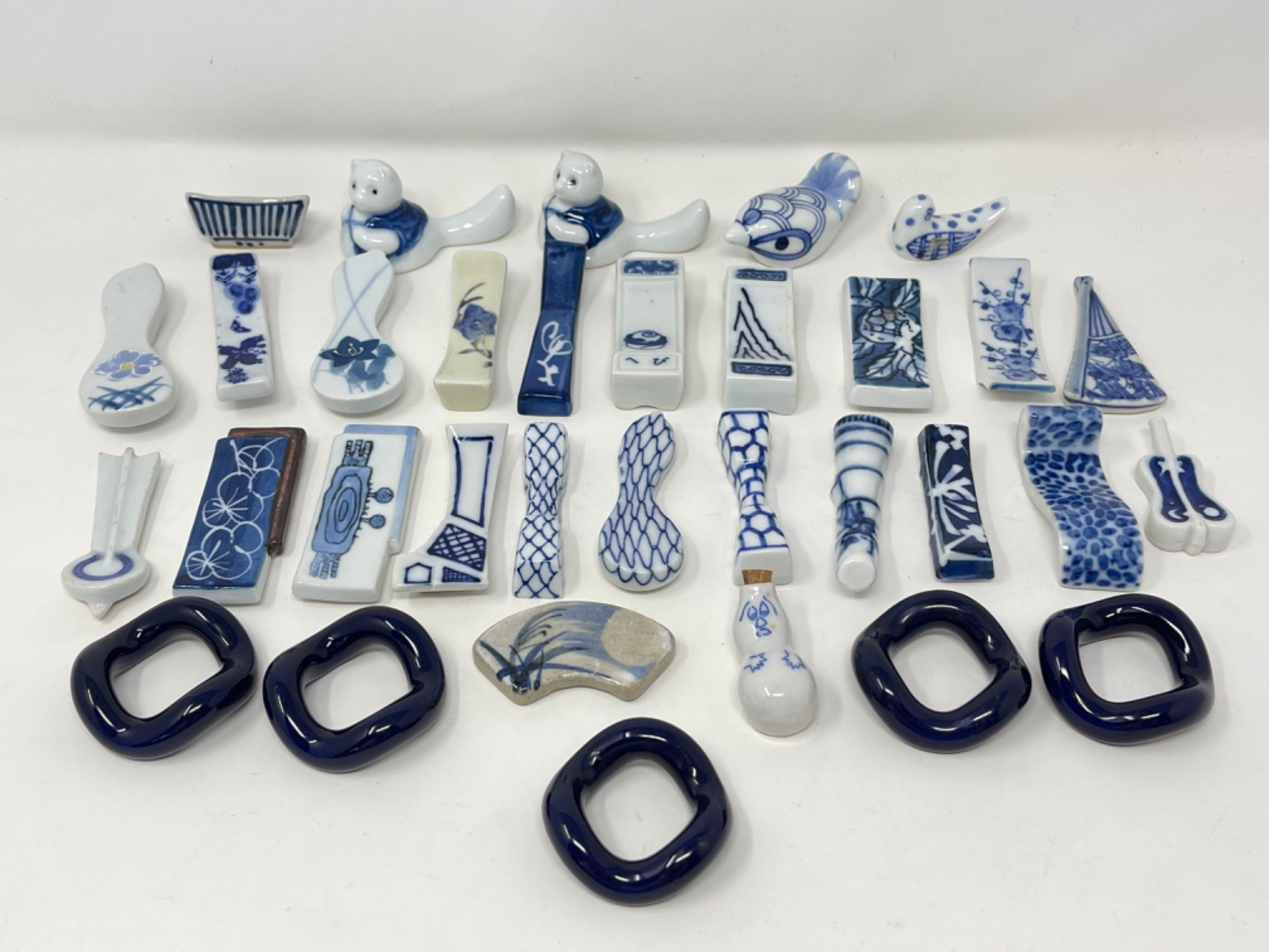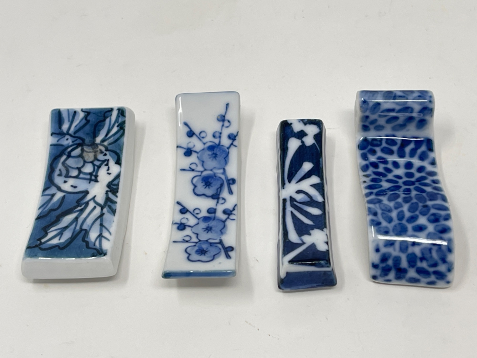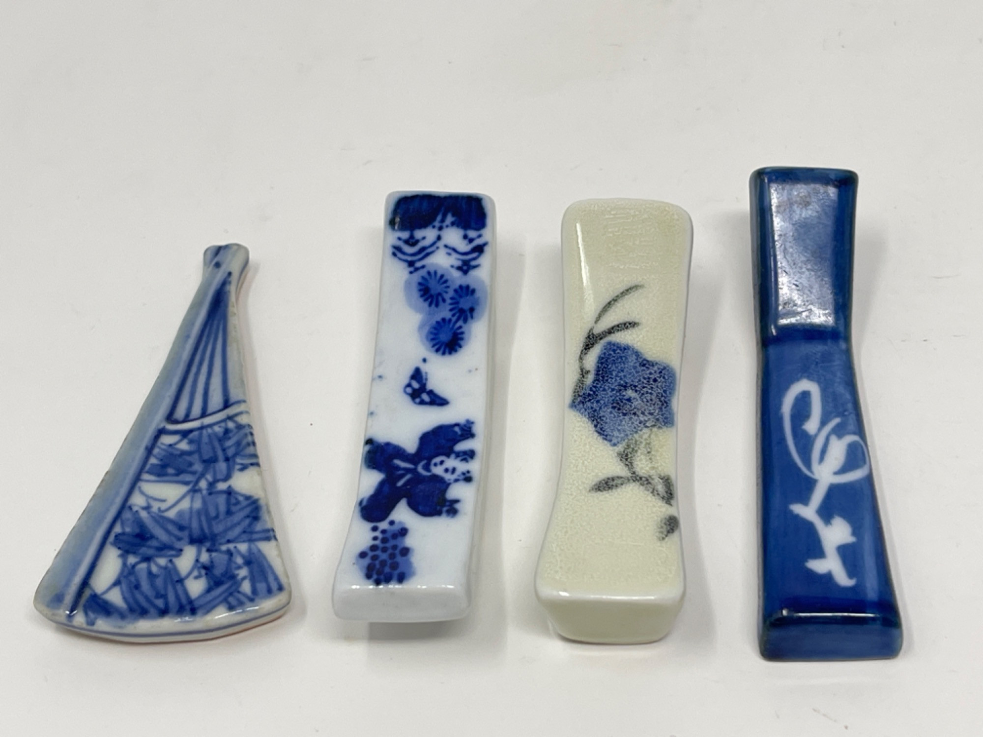 Vintage Hand-Painted Japanese Chopstick Rests – Assorted Designs This beautiful collection of vintage hand-painted Japanese chopstick rests showcases an array of traditional blue and white porcelain designs, each with its own unique artistic charm. Purchased in Japan, these one-of-a-kind rests feature intricate patterns, delicate brushwork, and a variety of shapes, including animals, abstract forms, and classic Japanese motifs. Condition: A couple of small chips and stains consistent with age and use. Largest: 3” L