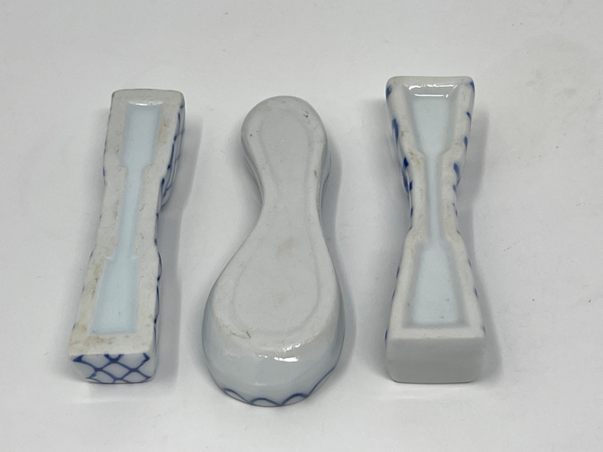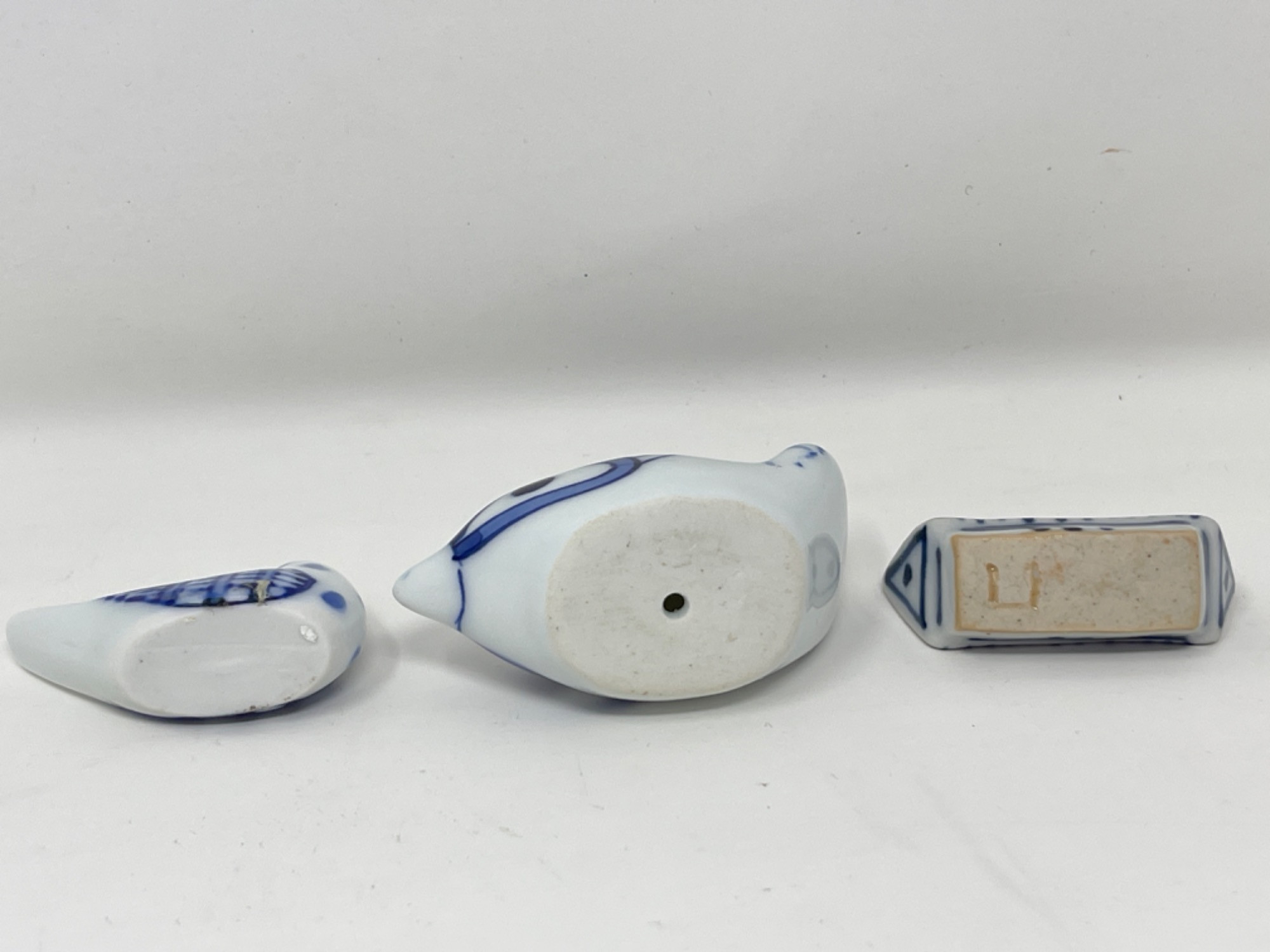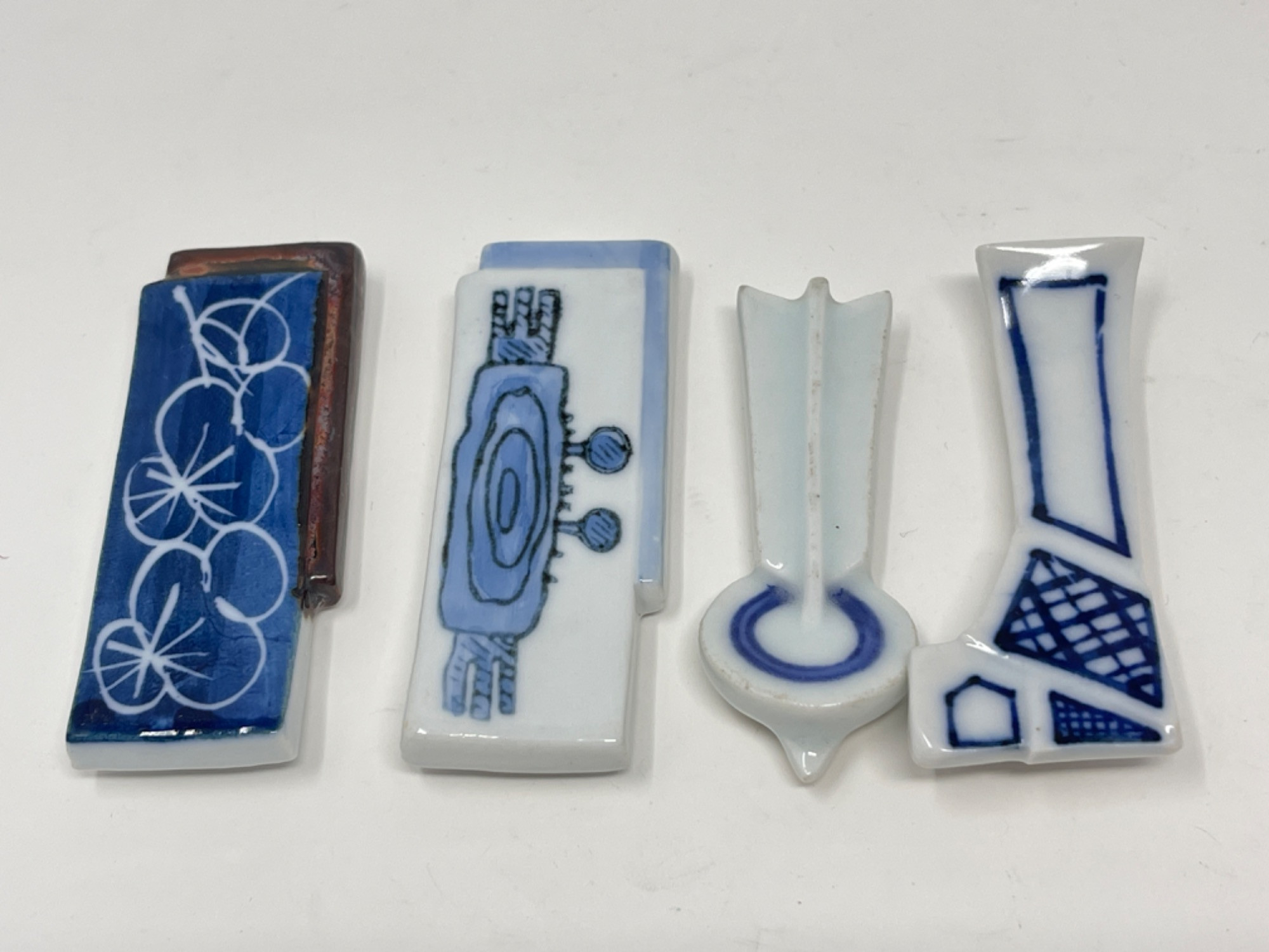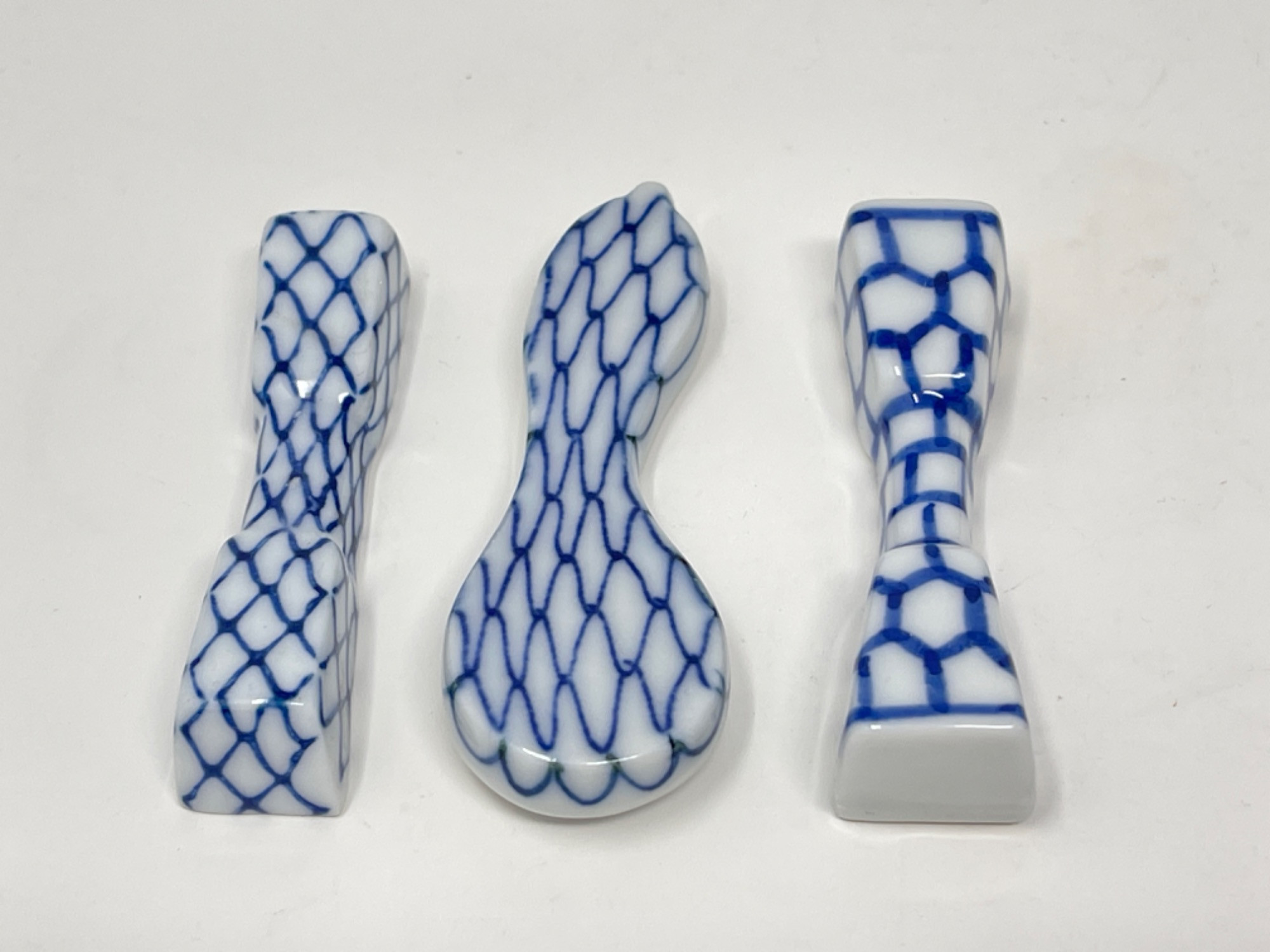 Vintage Hand-Painted Japanese Chopstick Rests – Assorted Designs This beautiful collection of vintage hand-painted Japanese chopstick rests showcases an array of traditional blue and white porcelain designs, each with its own unique artistic charm. Purchased in Japan, these one-of-a-kind rests feature intricate patterns, delicate brushwork, and a variety of shapes, including animals, abstract forms, and classic Japanese motifs. Condition: A couple of small chips and stains consistent with age and use. Largest: 3” L