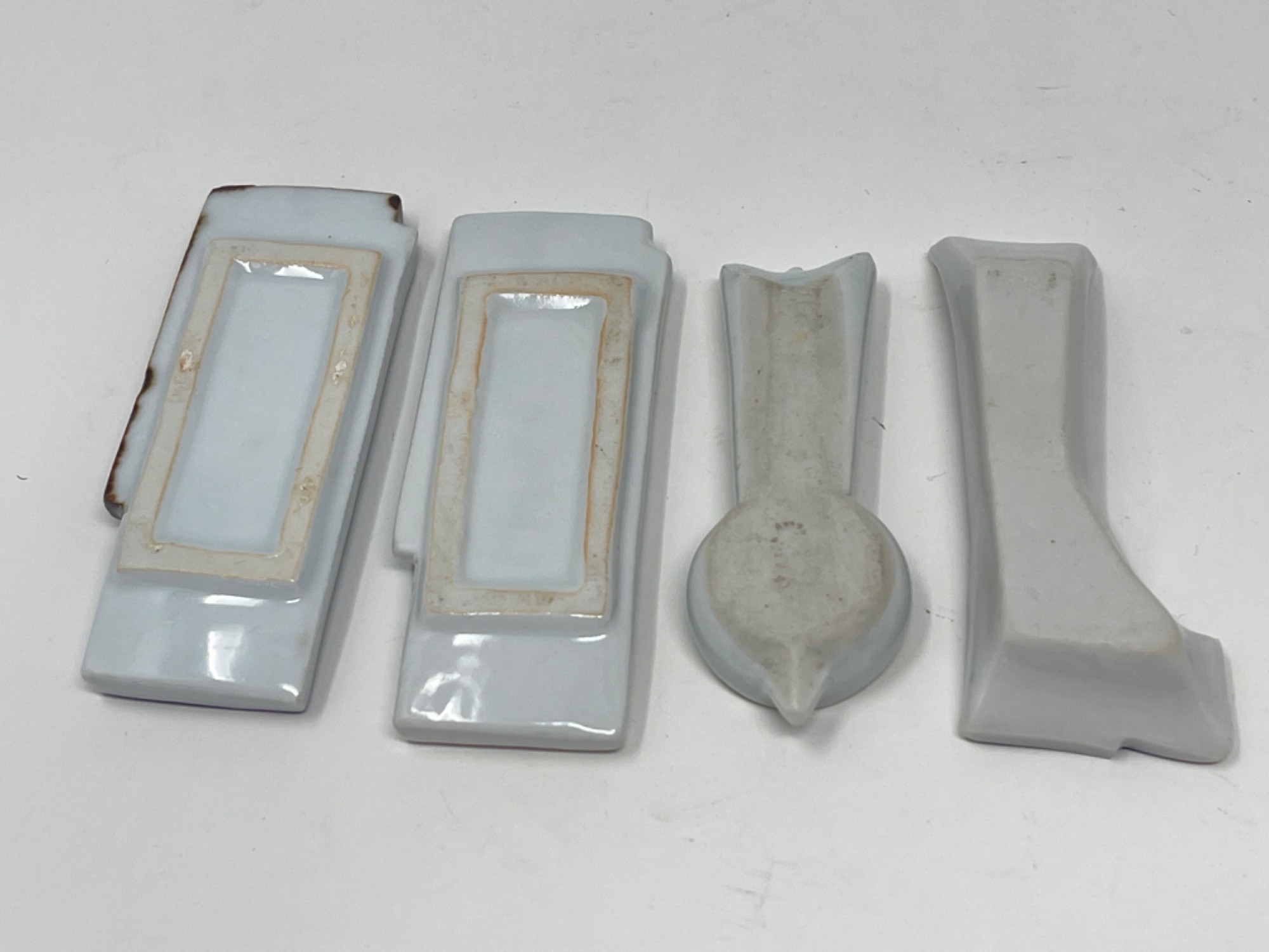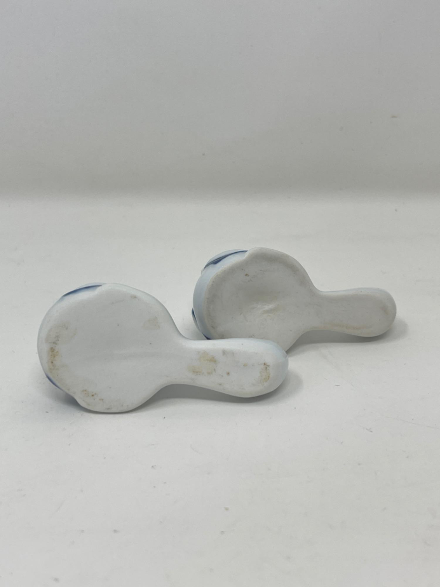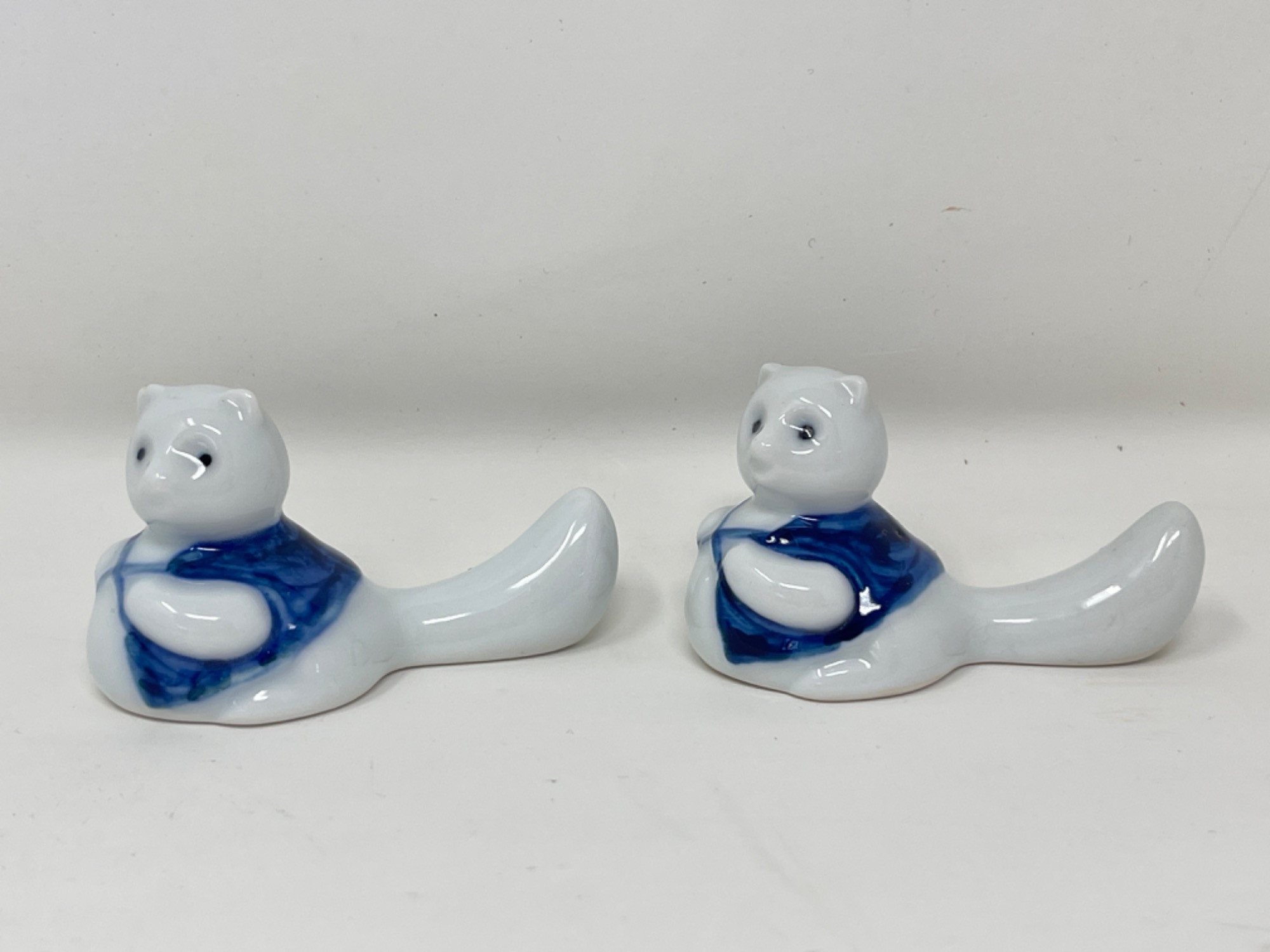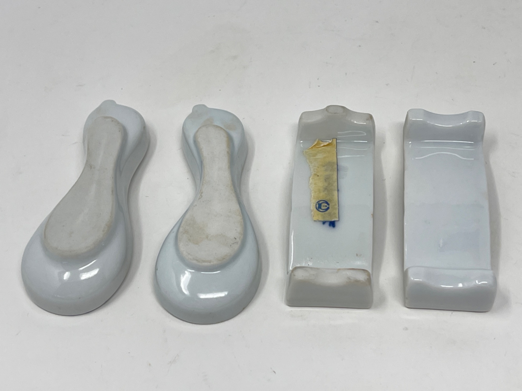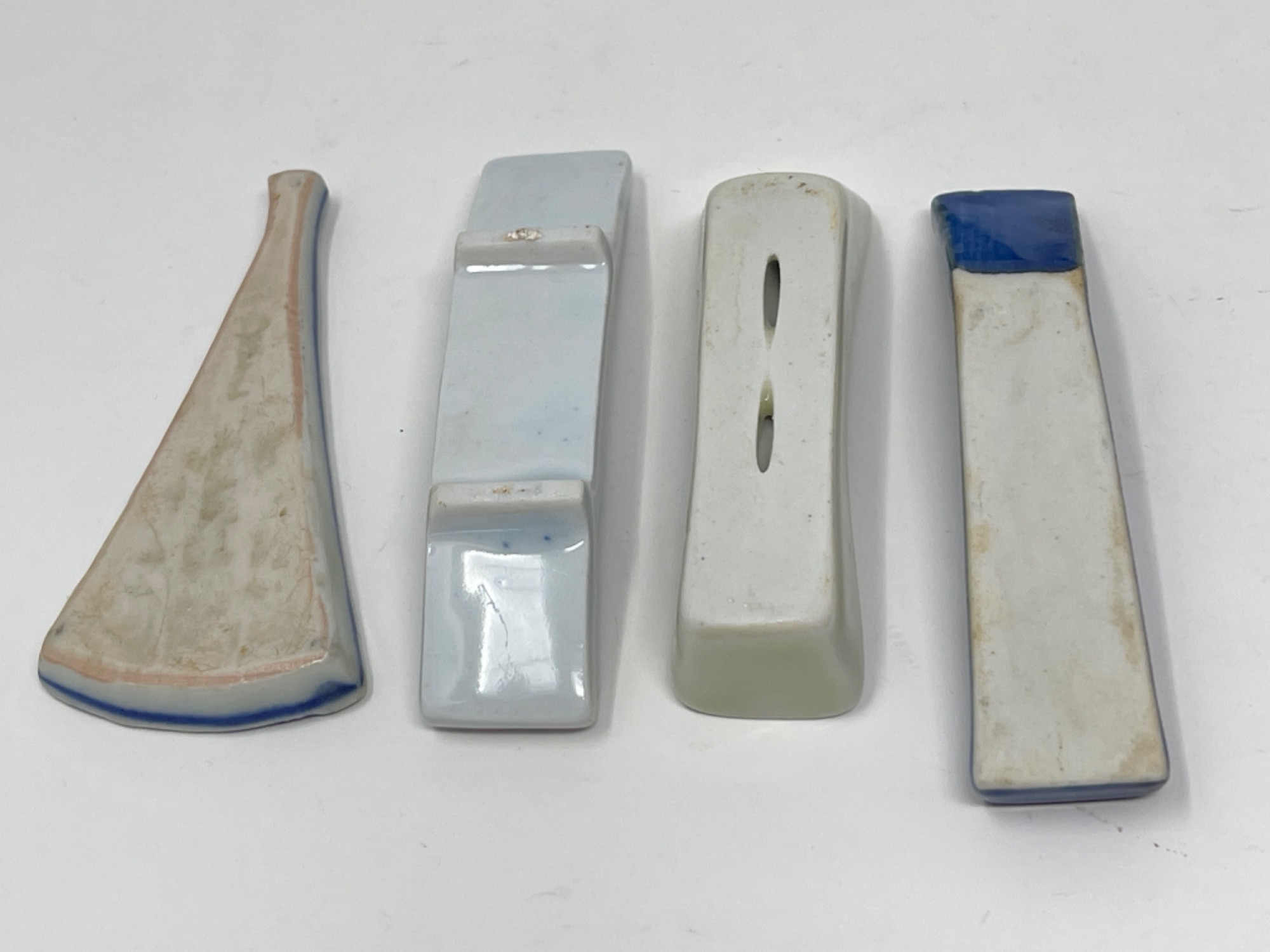 Vintage Hand-Painted Japanese Chopstick Rests – Assorted Designs This beautiful collection of vintage hand-painted Japanese chopstick rests showcases an array of traditional blue and white porcelain designs, each with its own unique artistic charm. Purchased in Japan, these one-of-a-kind rests feature intricate patterns, delicate brushwork, and a variety of shapes, including animals, abstract forms, and classic Japanese motifs. Condition: A couple of small chips and stains consistent with age and use. Largest: 3” L