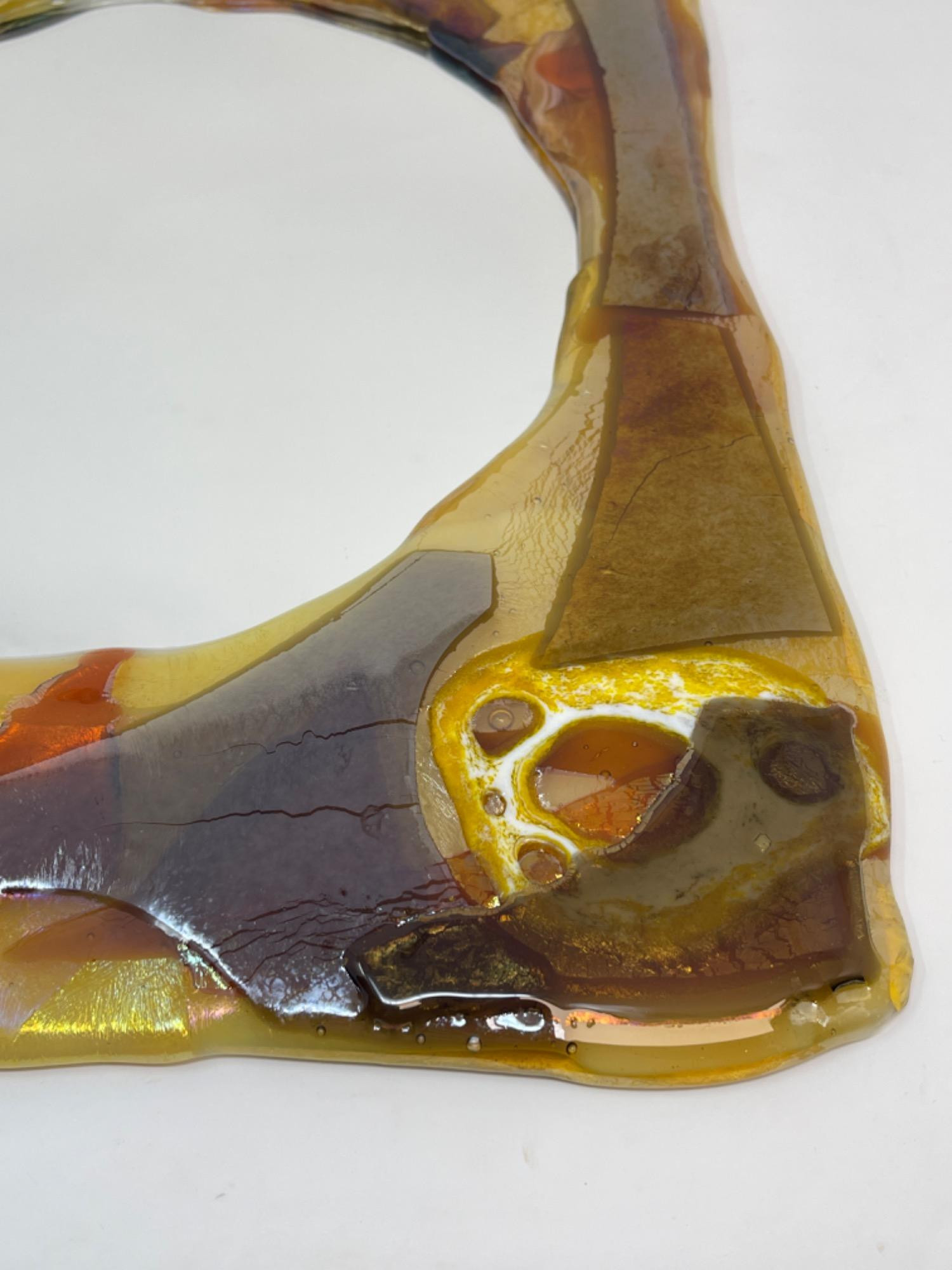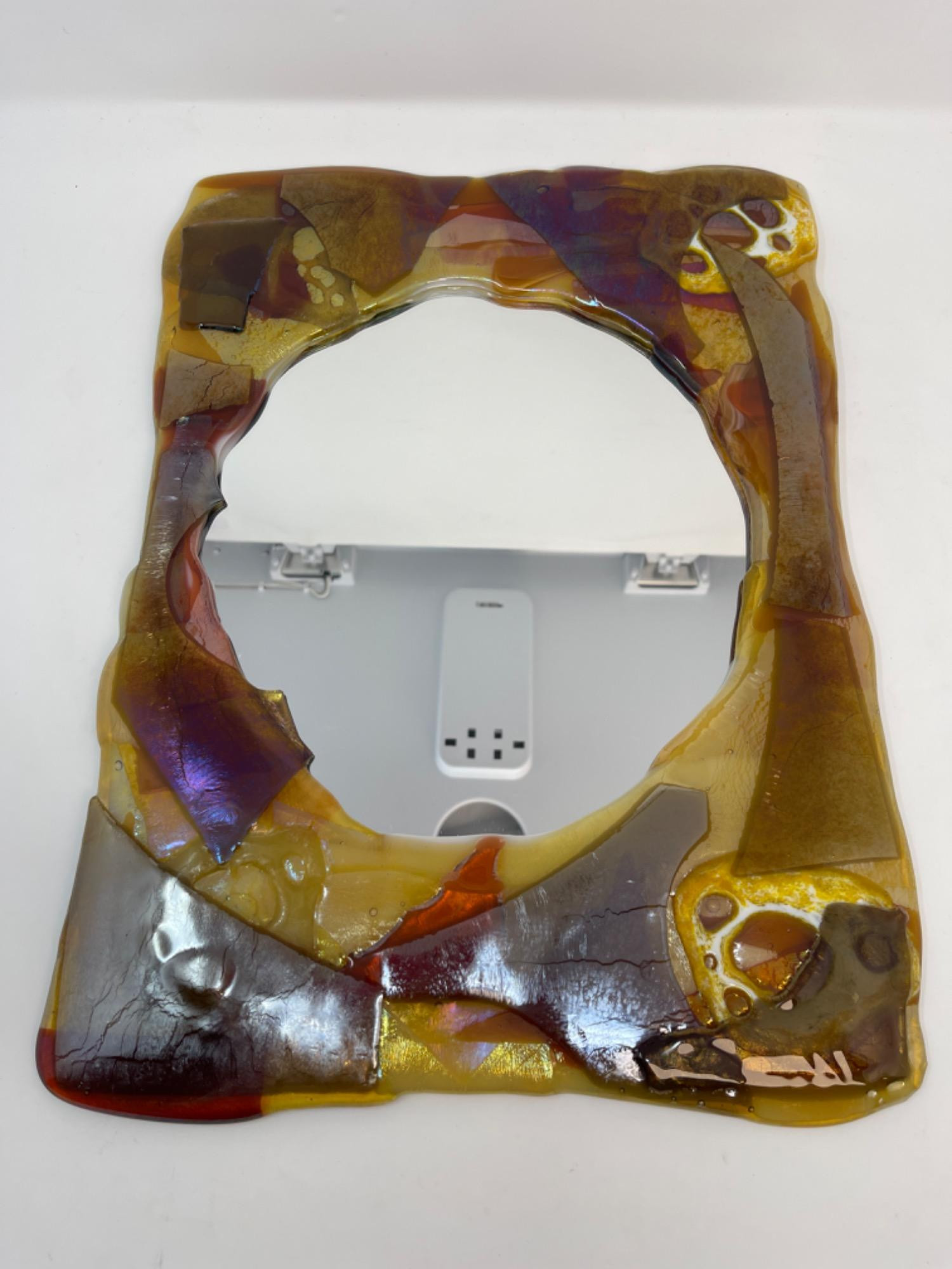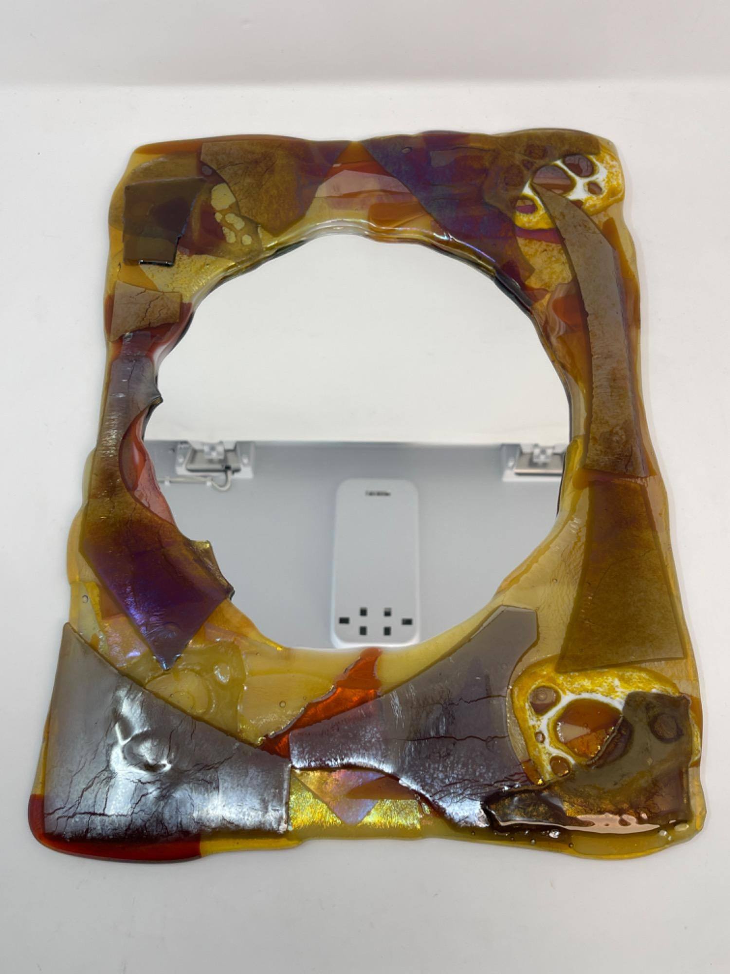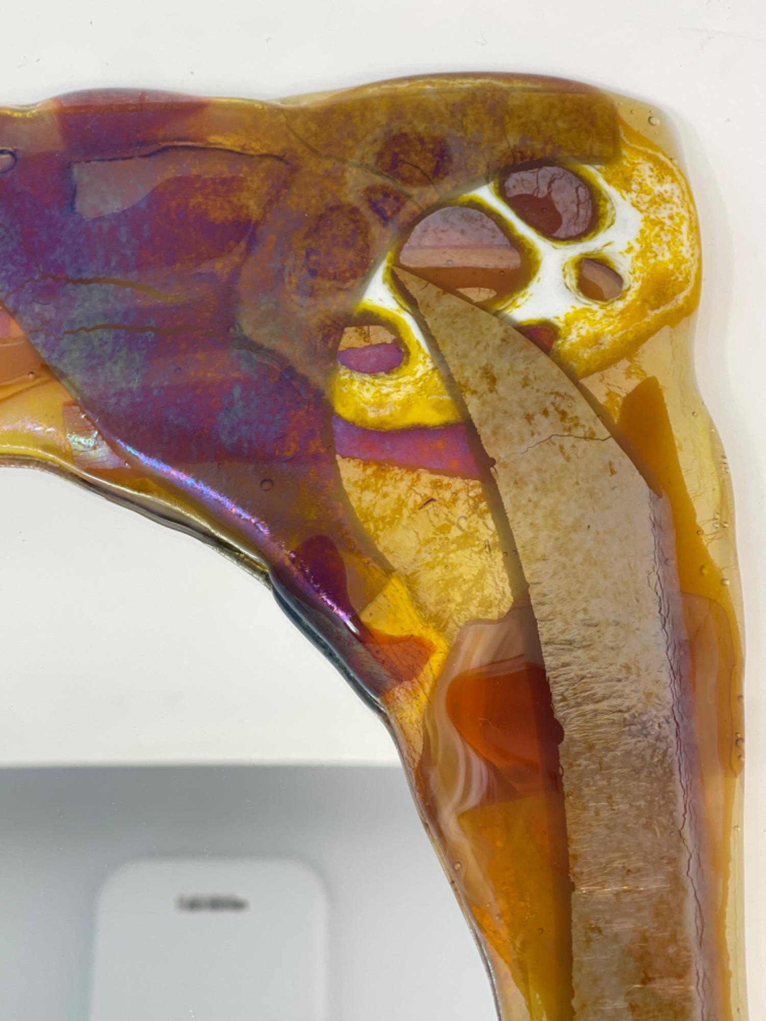 Handcrafted Art Glass Bordered Wall Mirror – Iridescent Amber and Metallic Accents This stunning handcrafted art glass wall mirror features a uniquely textured fused glass border in rich amber tones with striking metallic and iridescent accents. The organic, freeform design blends warm golden hues with deep bronze, hints of red, and shimmering silver, creating a visually captivating and modern statement piece. Great condition.
