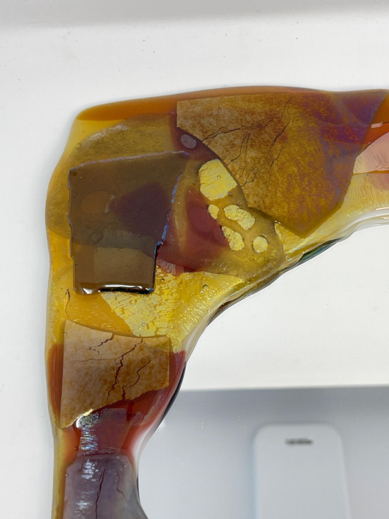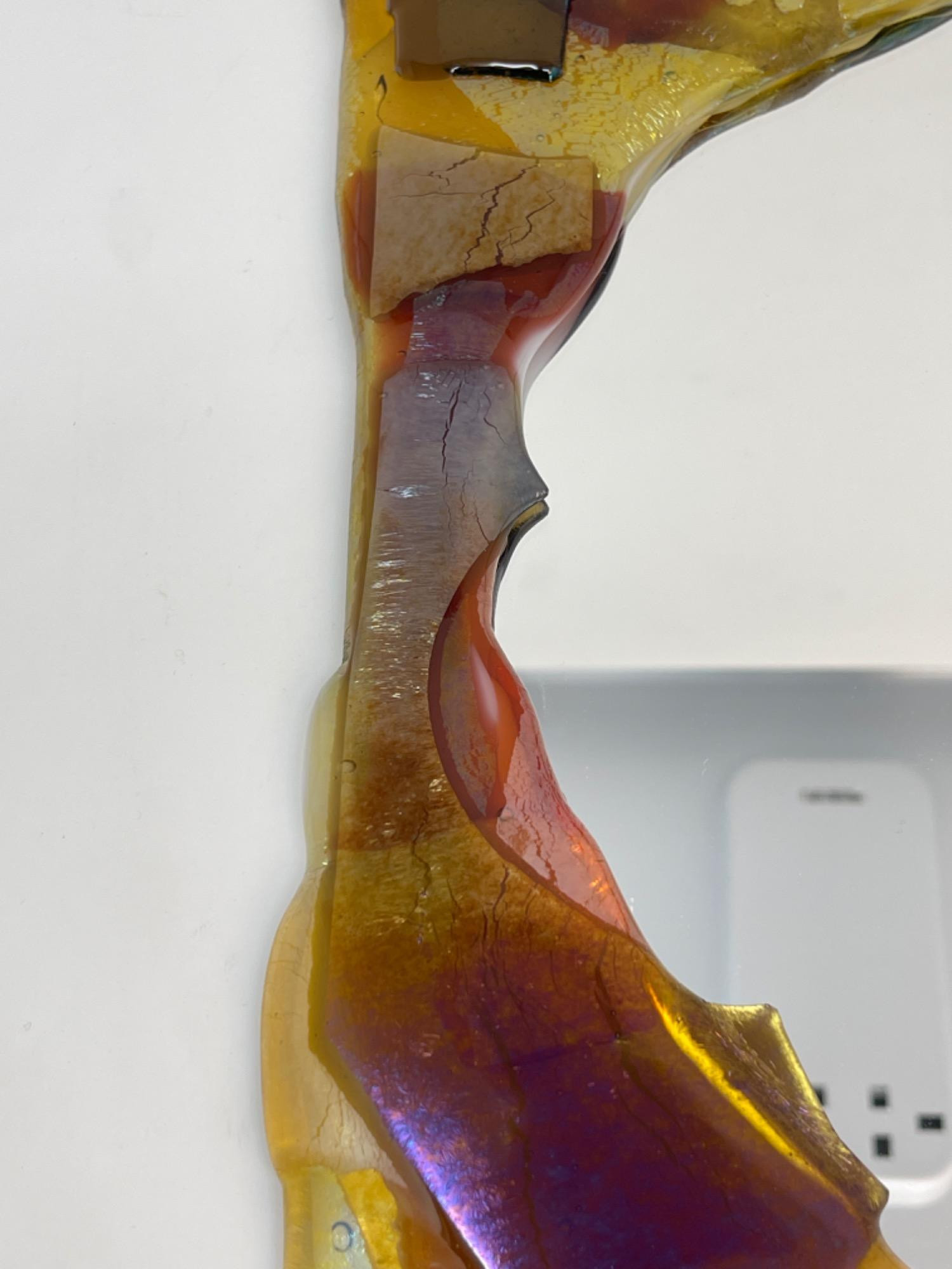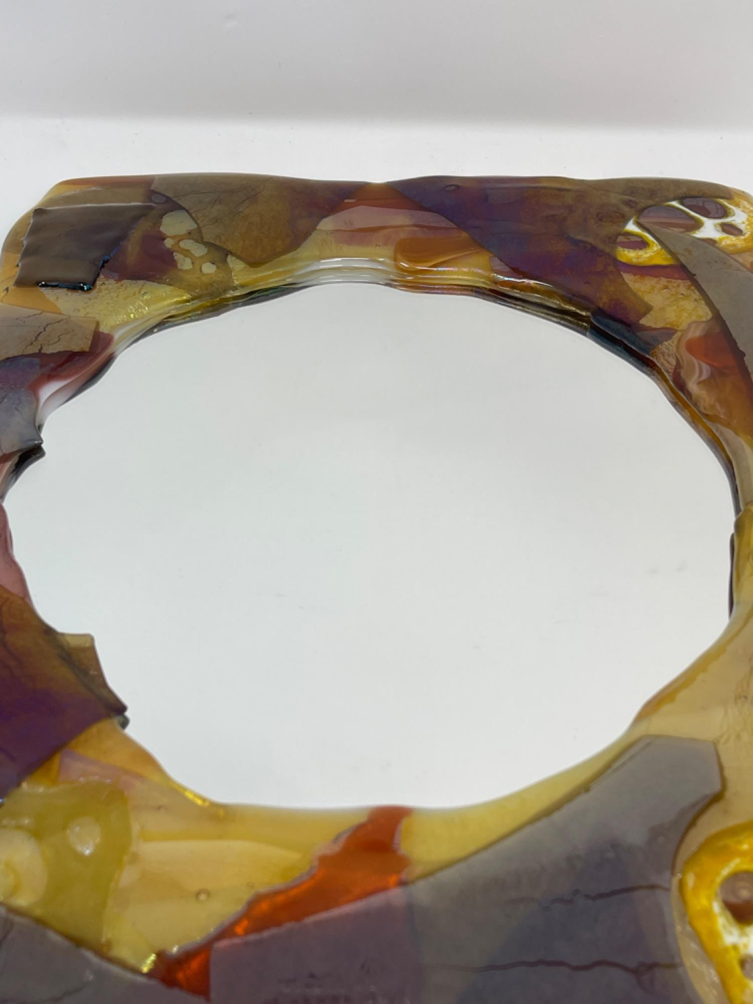 Handcrafted Art Glass Bordered Wall Mirror – Iridescent Amber and Metallic Accents This stunning handcrafted art glass wall mirror features a uniquely textured fused glass border in rich amber tones with striking metallic and iridescent accents. The organic, freeform design blends warm golden hues with deep bronze, hints of red, and shimmering silver, creating a visually captivating and modern statement piece. Great condition.