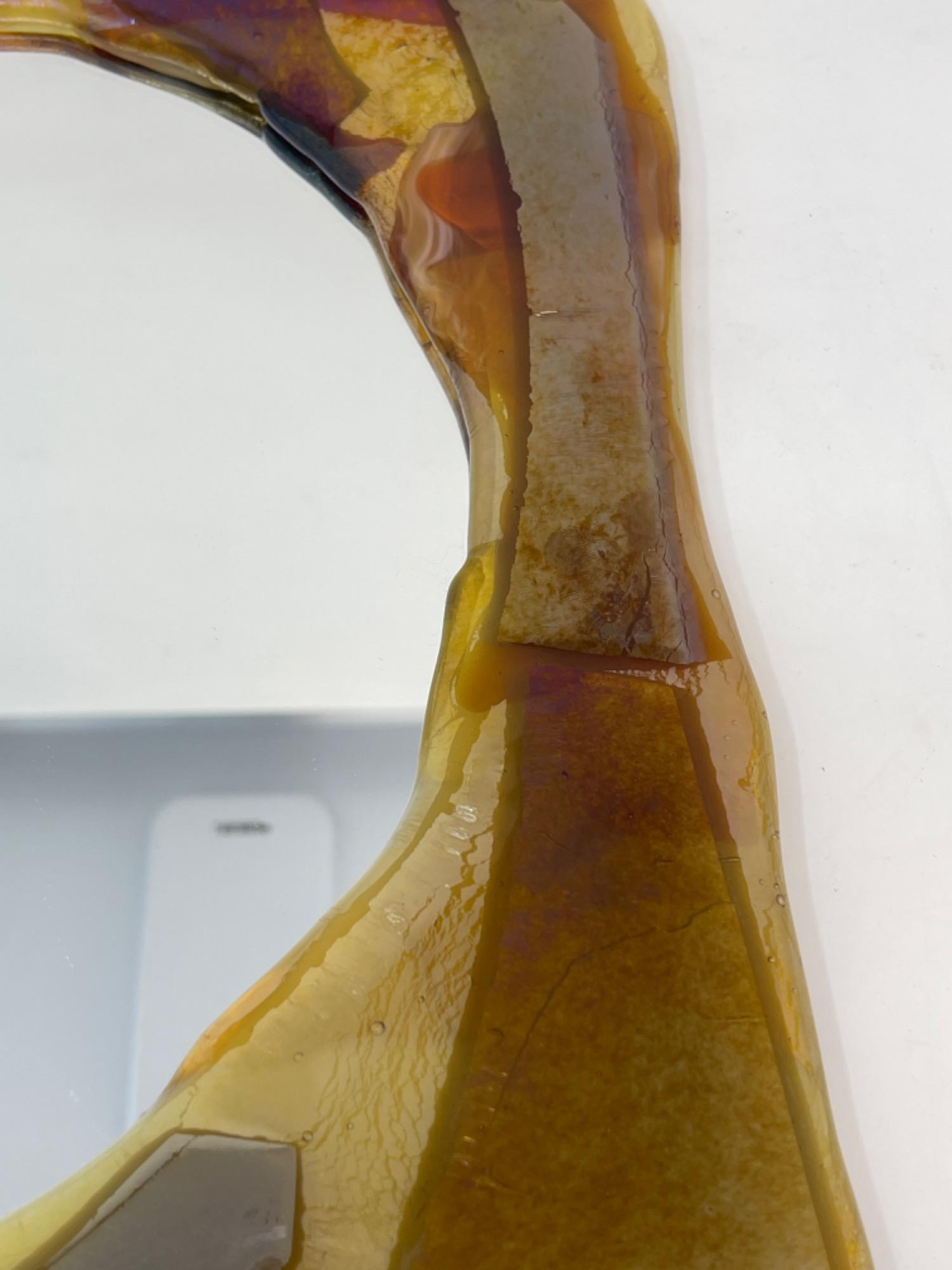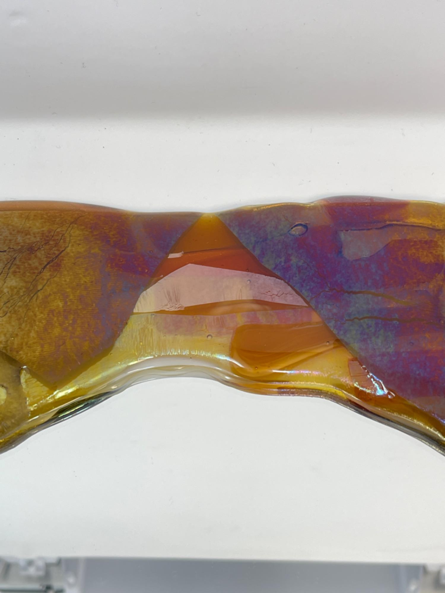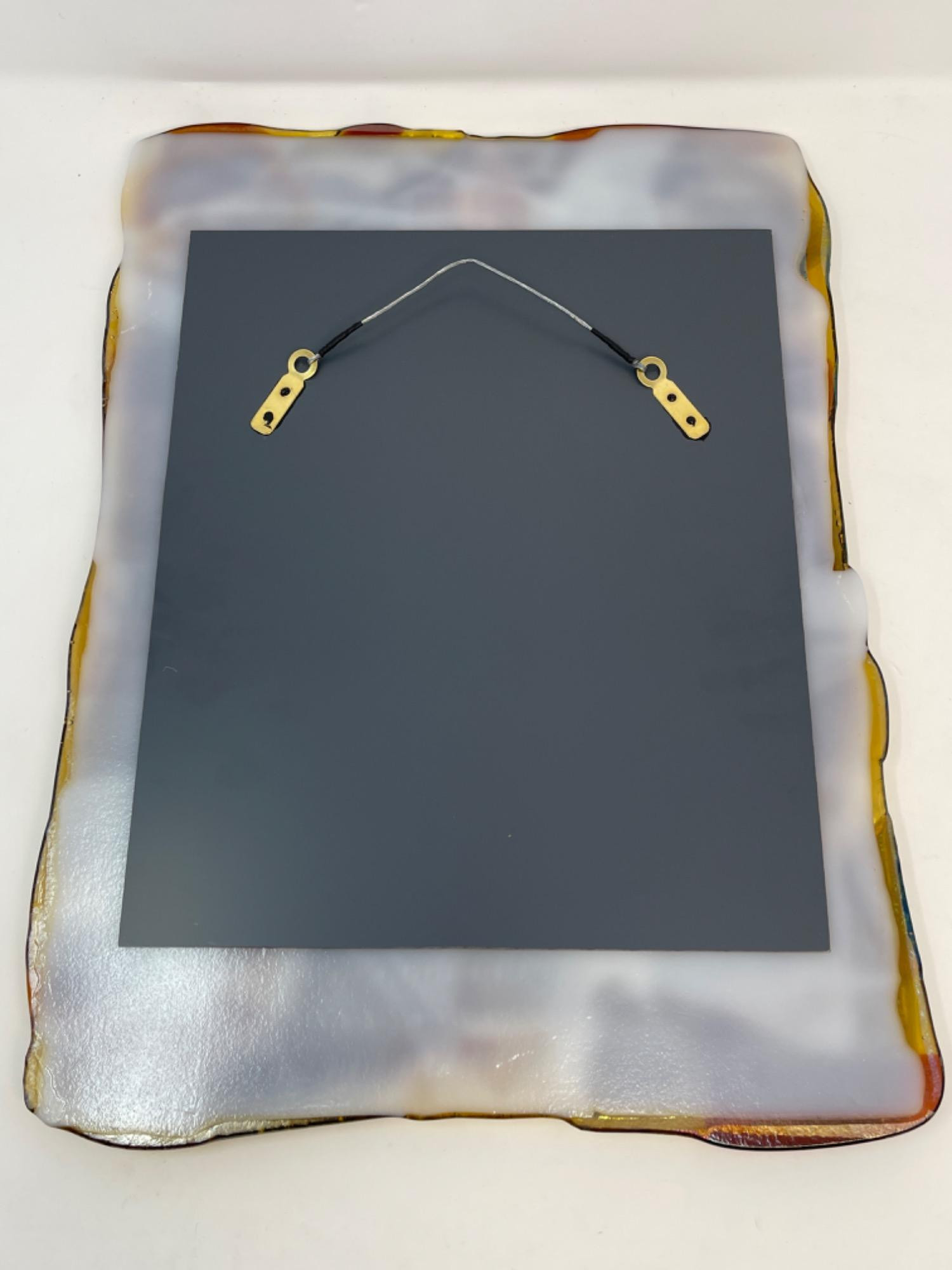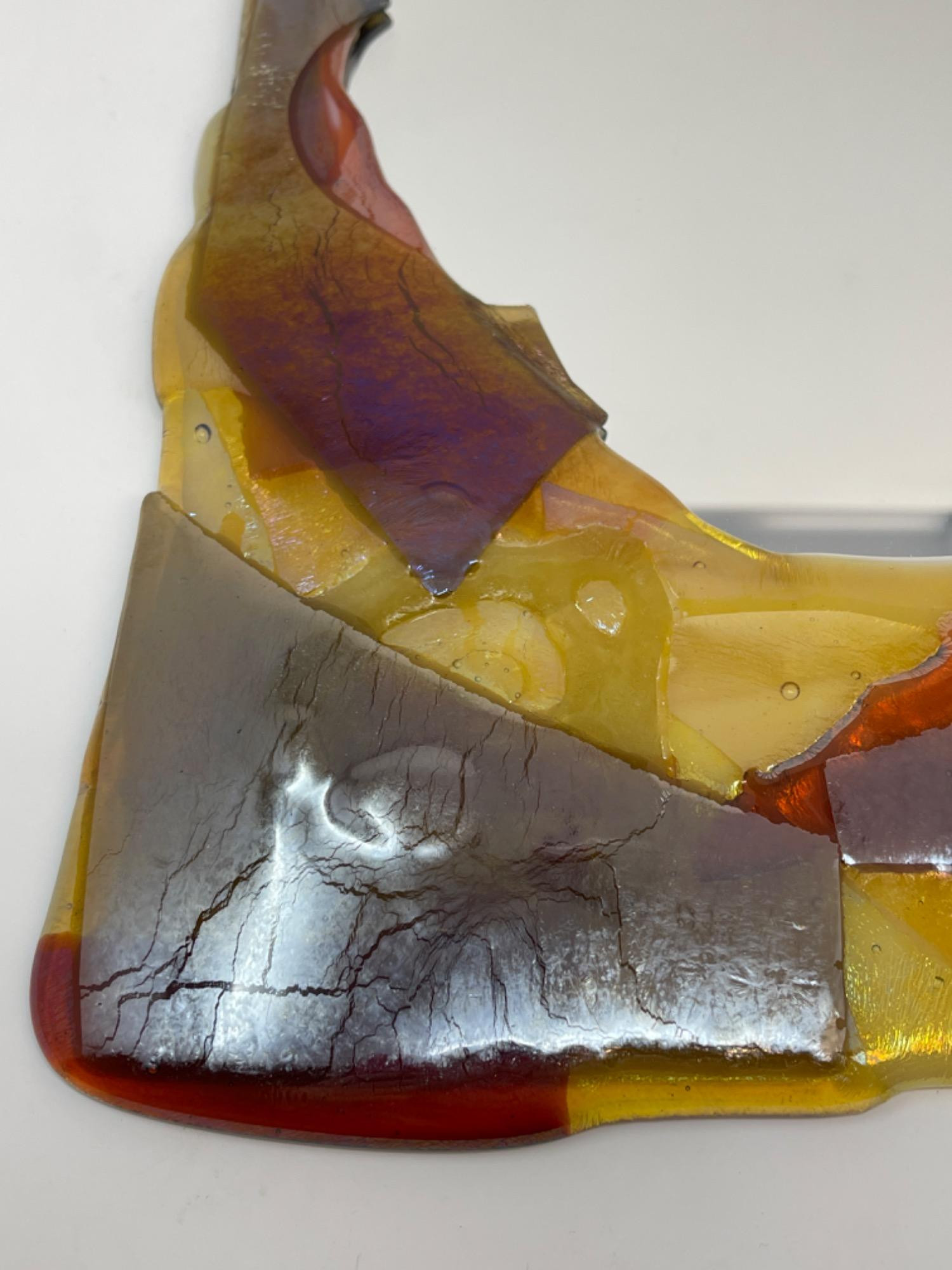 Handcrafted Art Glass Bordered Wall Mirror – Iridescent Amber and Metallic Accents This stunning handcrafted art glass wall mirror features a uniquely textured fused glass border in rich amber tones with striking metallic and iridescent accents. The organic, freeform design blends warm golden hues with deep bronze, hints of red, and shimmering silver, creating a visually captivating and modern statement piece. Great condition.