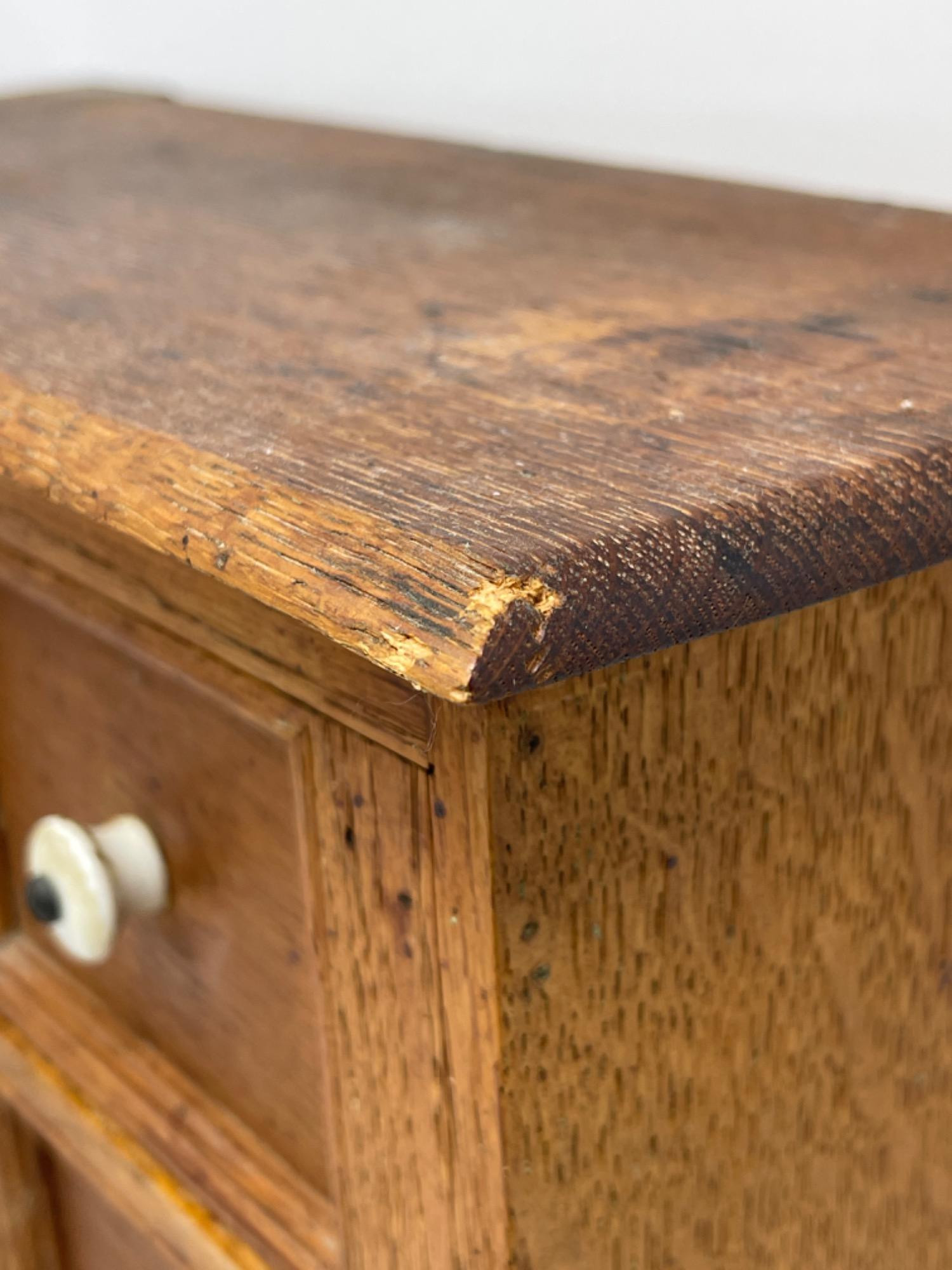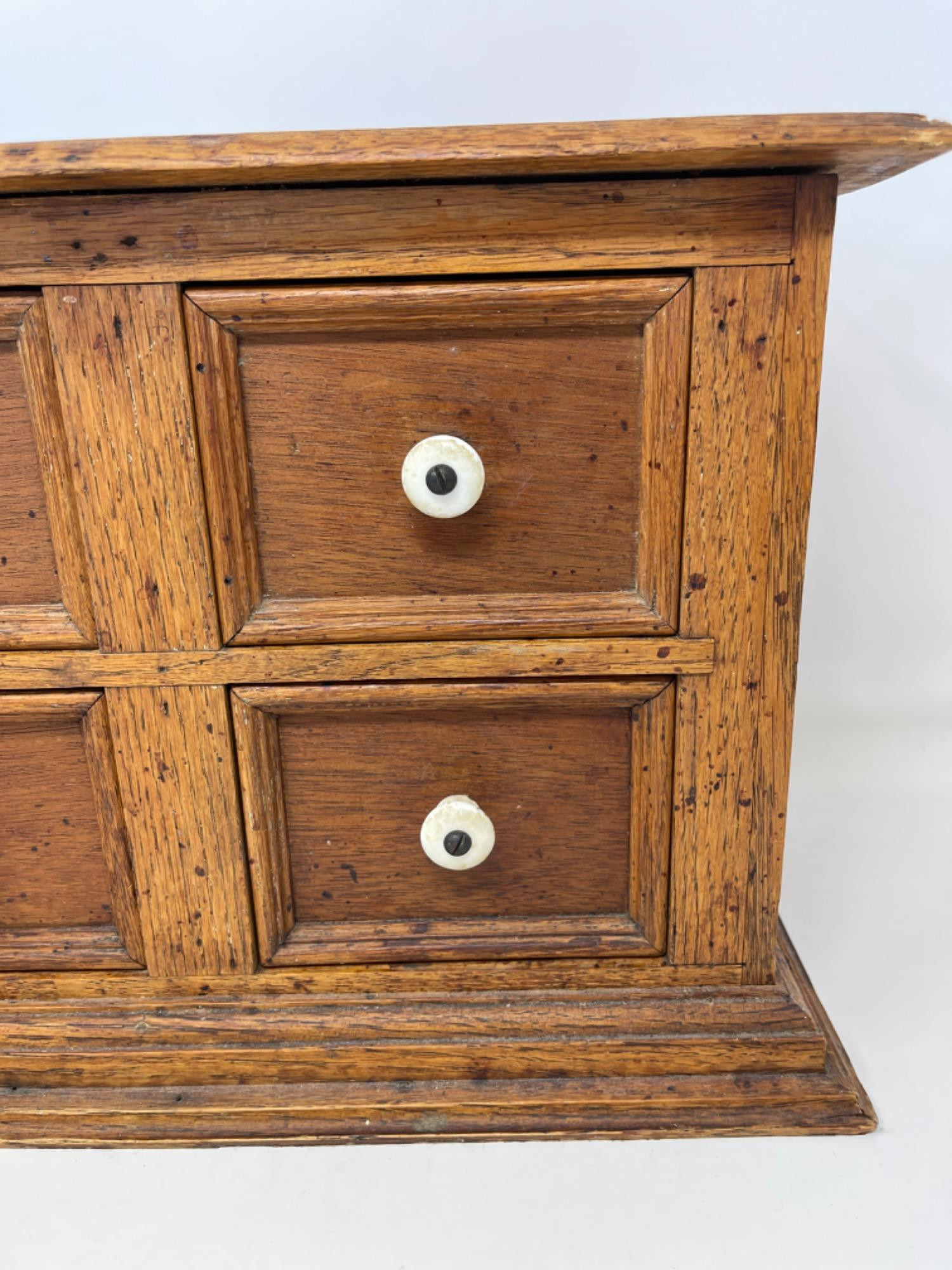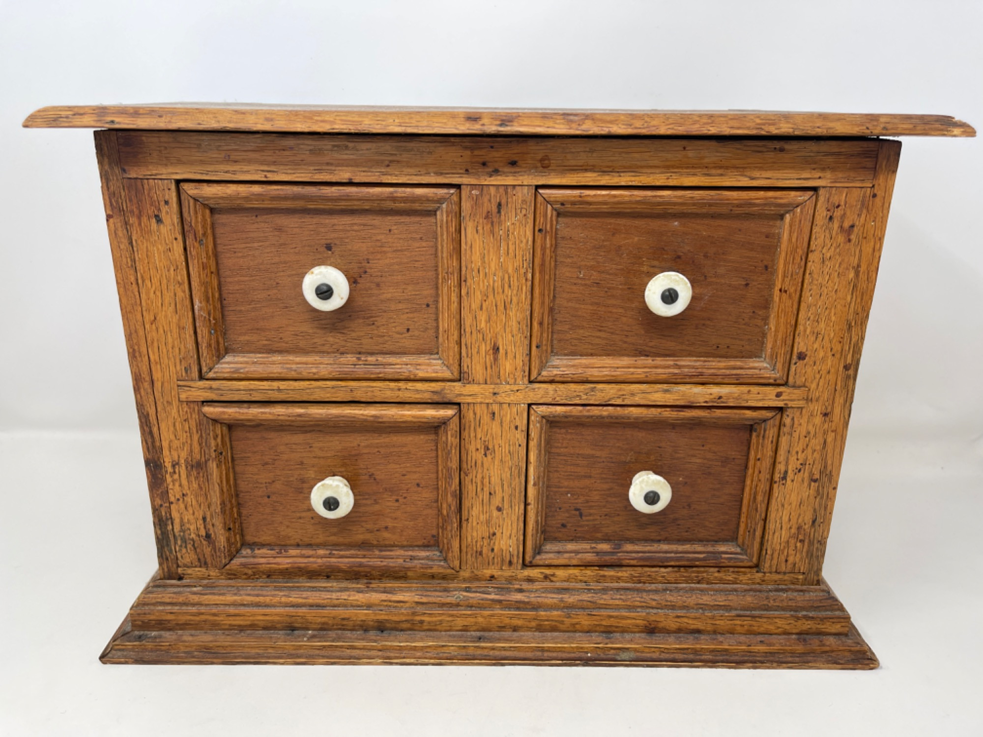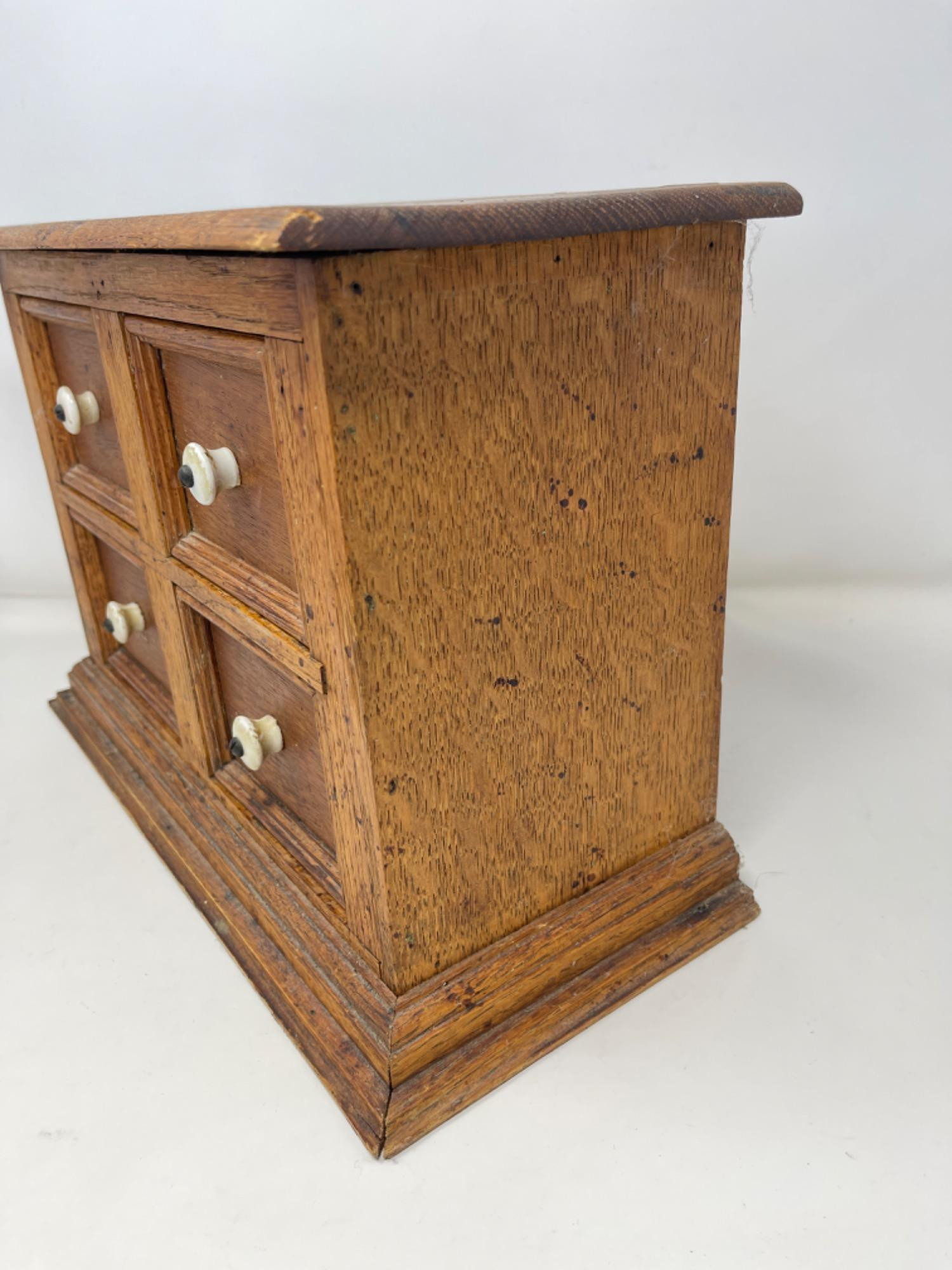 Antique Wooden Jewelry or Sewing Box This charming antique wooden box features four small drawers, making it ideal for storing jewelry, sewing notions, or keepsakes. With its warm aged patina, hand-crafted details, and delicate cream knobs, this piece exudes vintage character and timeless appeal. Condition: - Well-worn antique condition with visible scuffs, scratches, and age-related imperfections, adding to its charm. - Drawers function properly, making it both a decorative and practical piece.