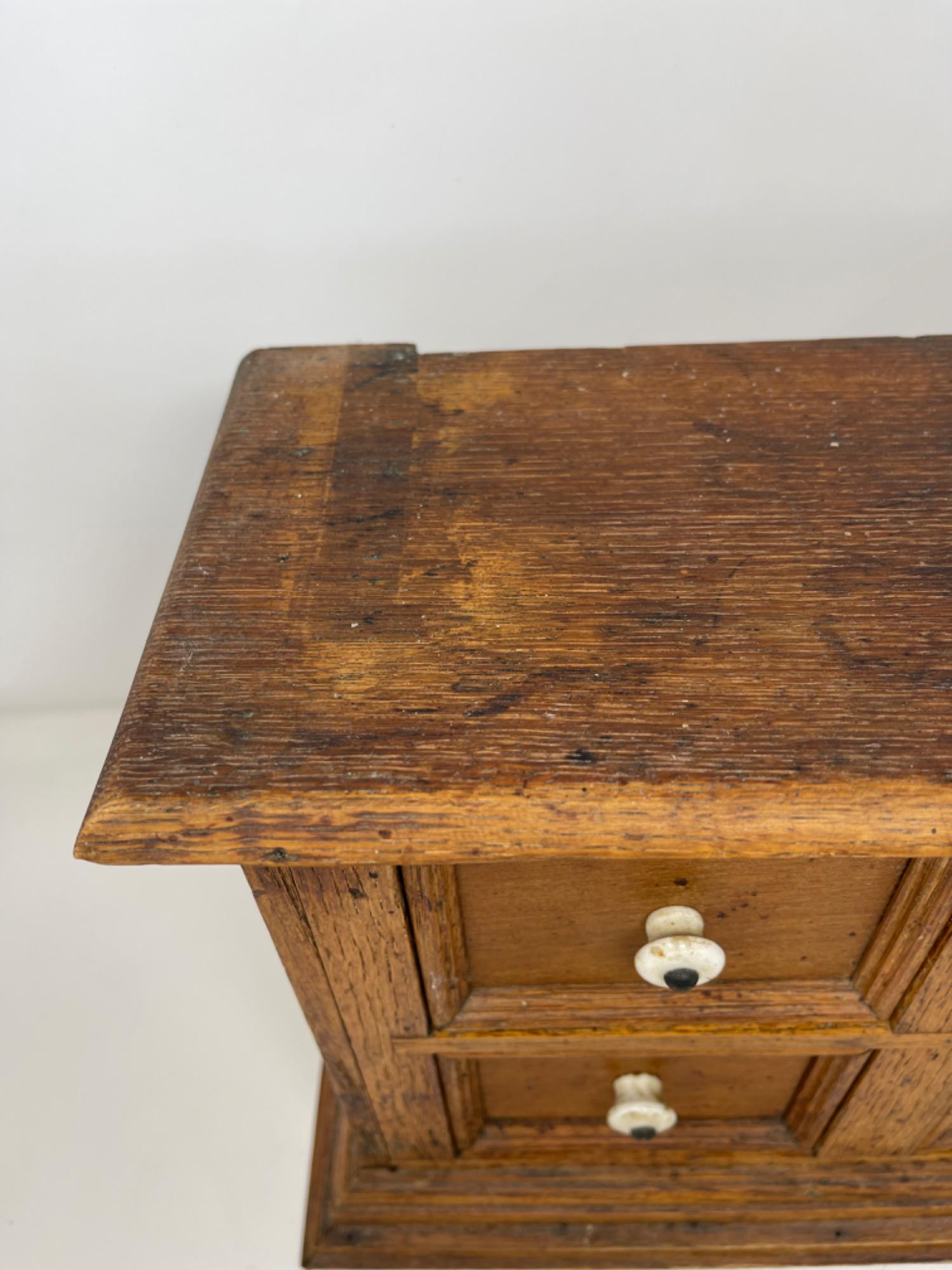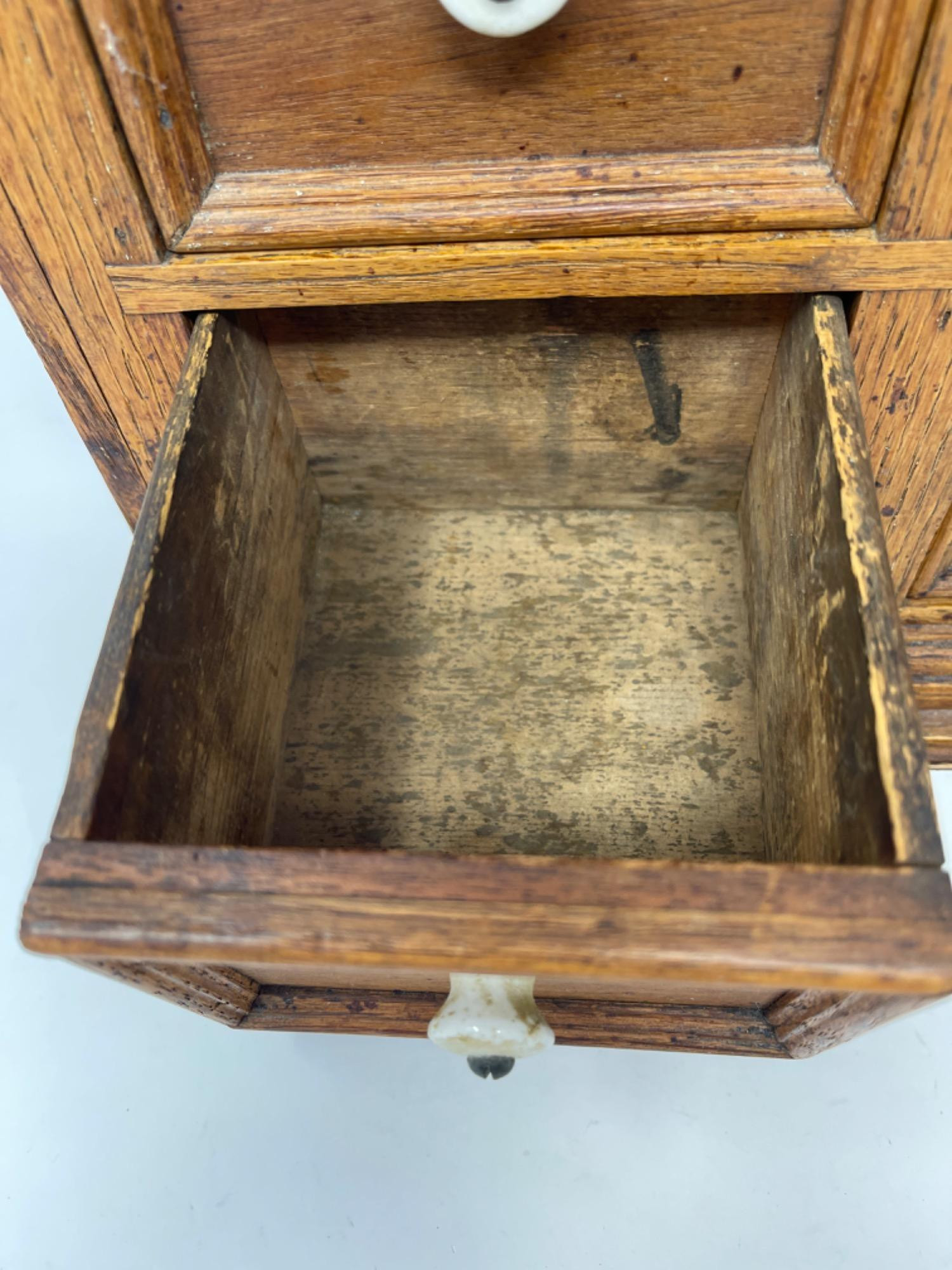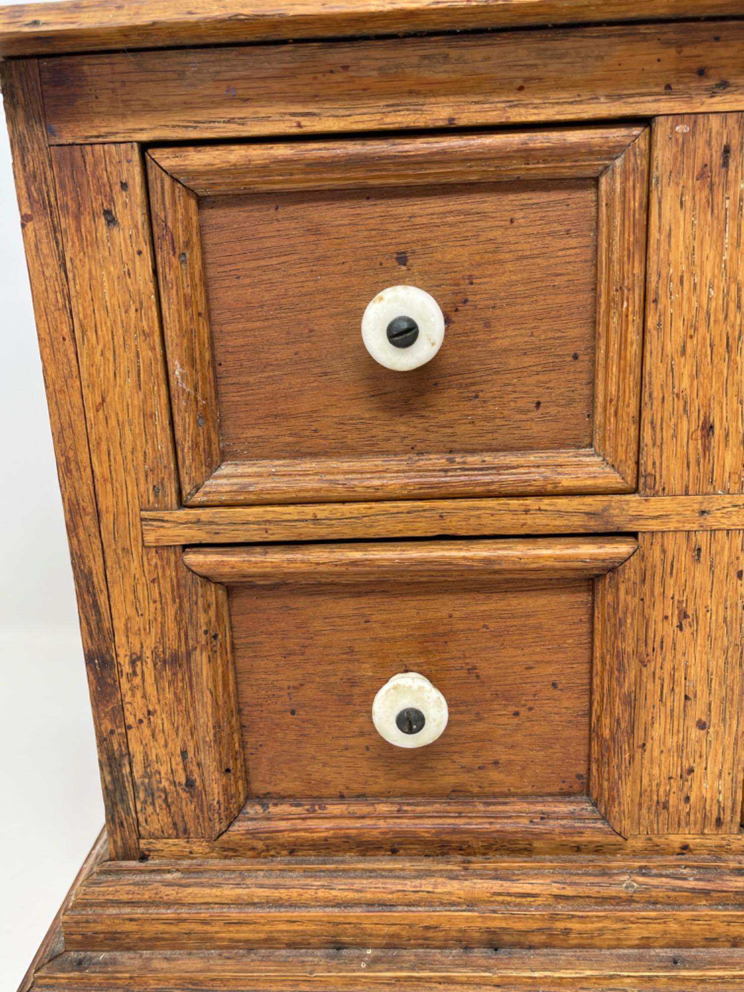 Antique Wooden Jewelry or Sewing Box This charming antique wooden box features four small drawers, making it ideal for storing jewelry, sewing notions, or keepsakes. With its warm aged patina, hand-crafted details, and delicate cream knobs, this piece exudes vintage character and timeless appeal. Condition: - Well-worn antique condition with visible scuffs, scratches, and age-related imperfections, adding to its charm. - Drawers function properly, making it both a decorative and practical piece.