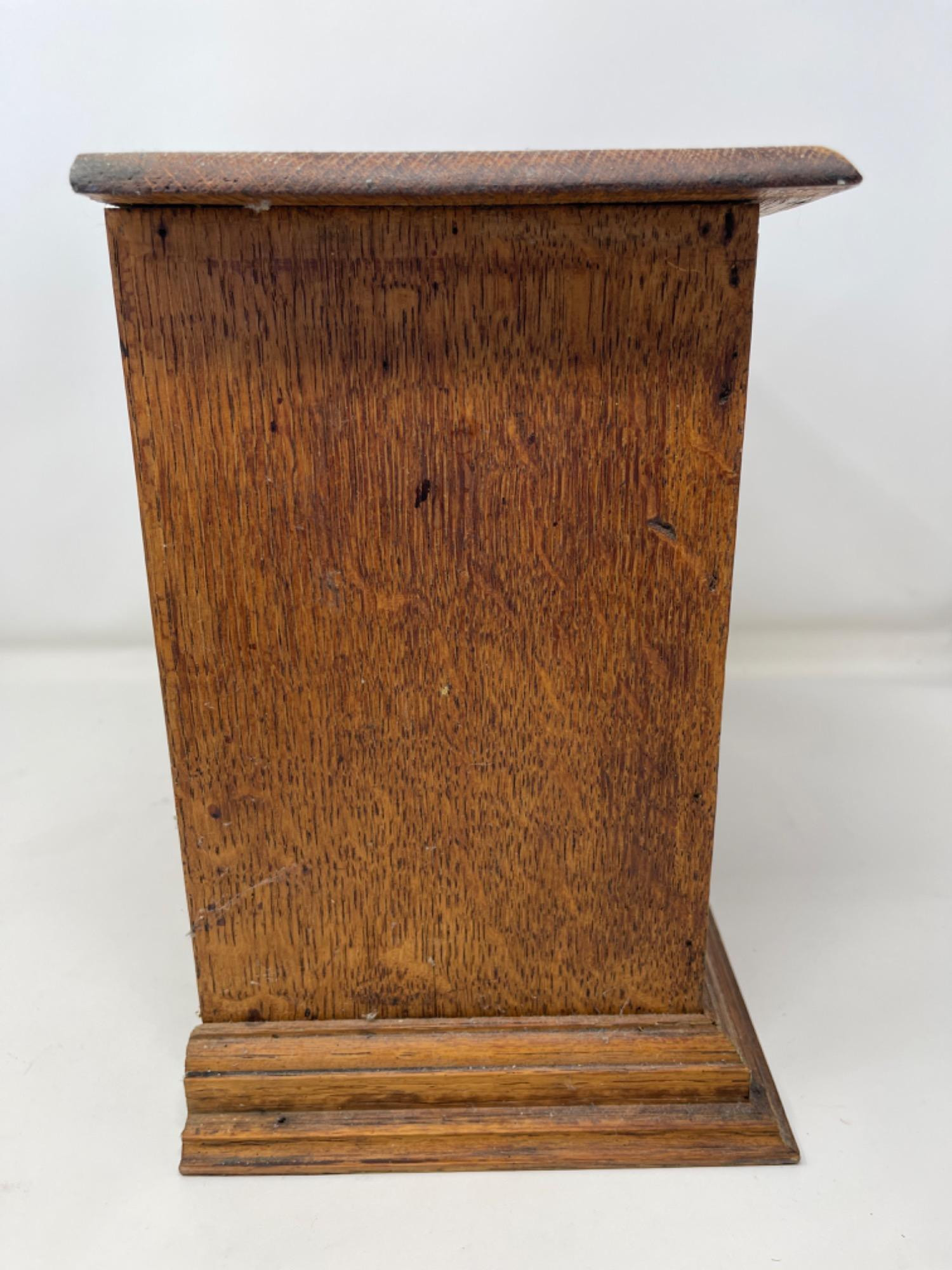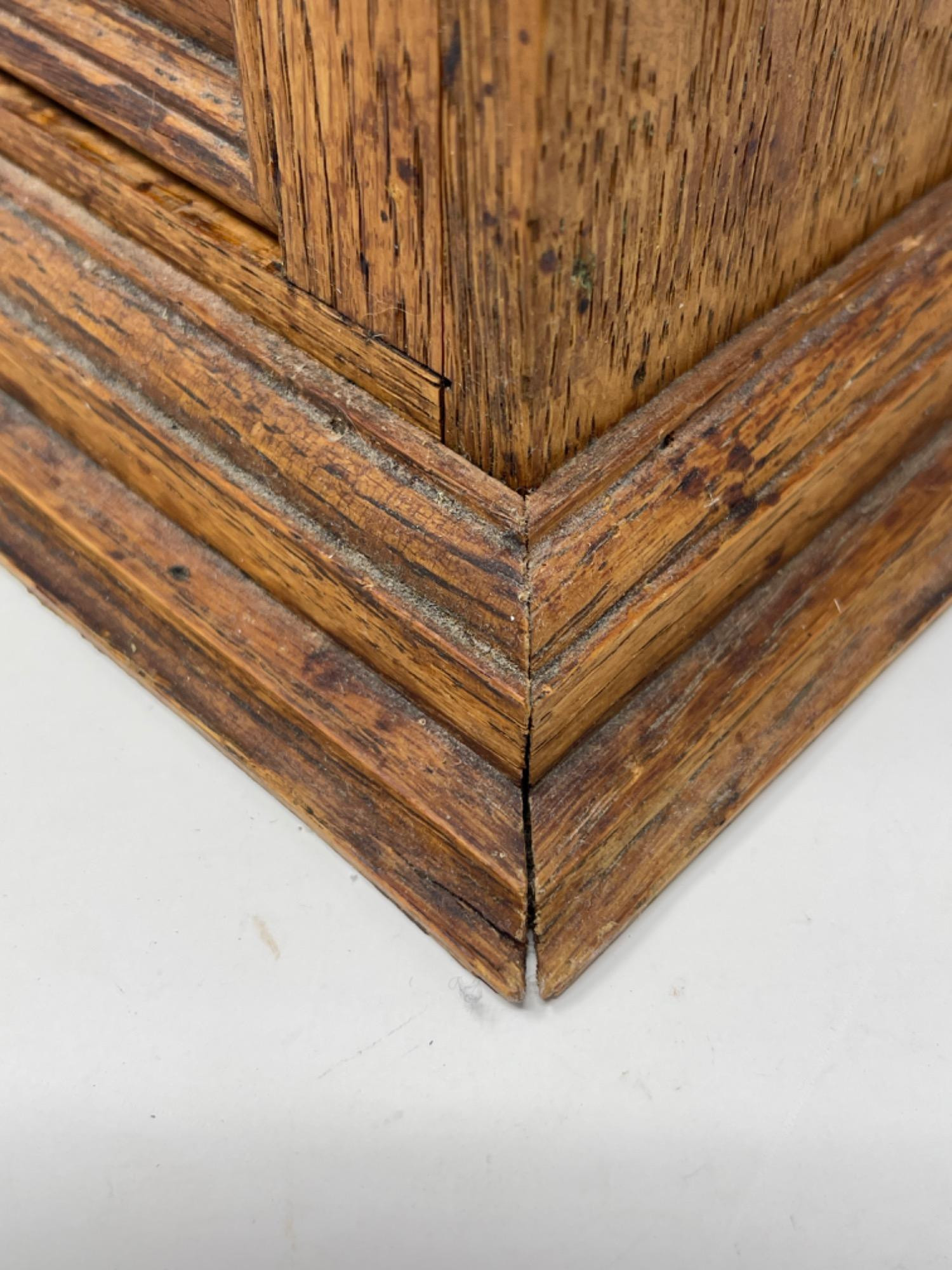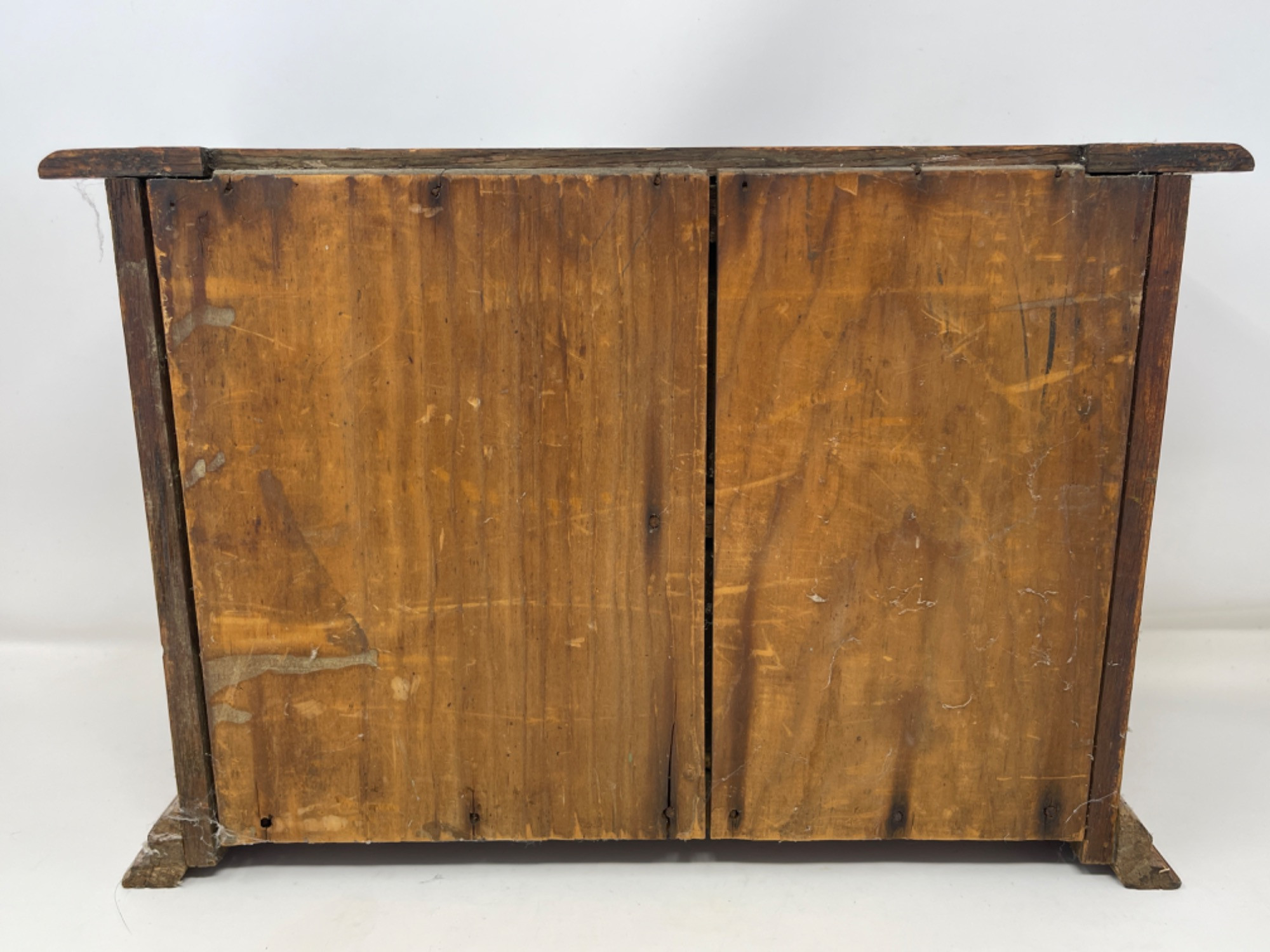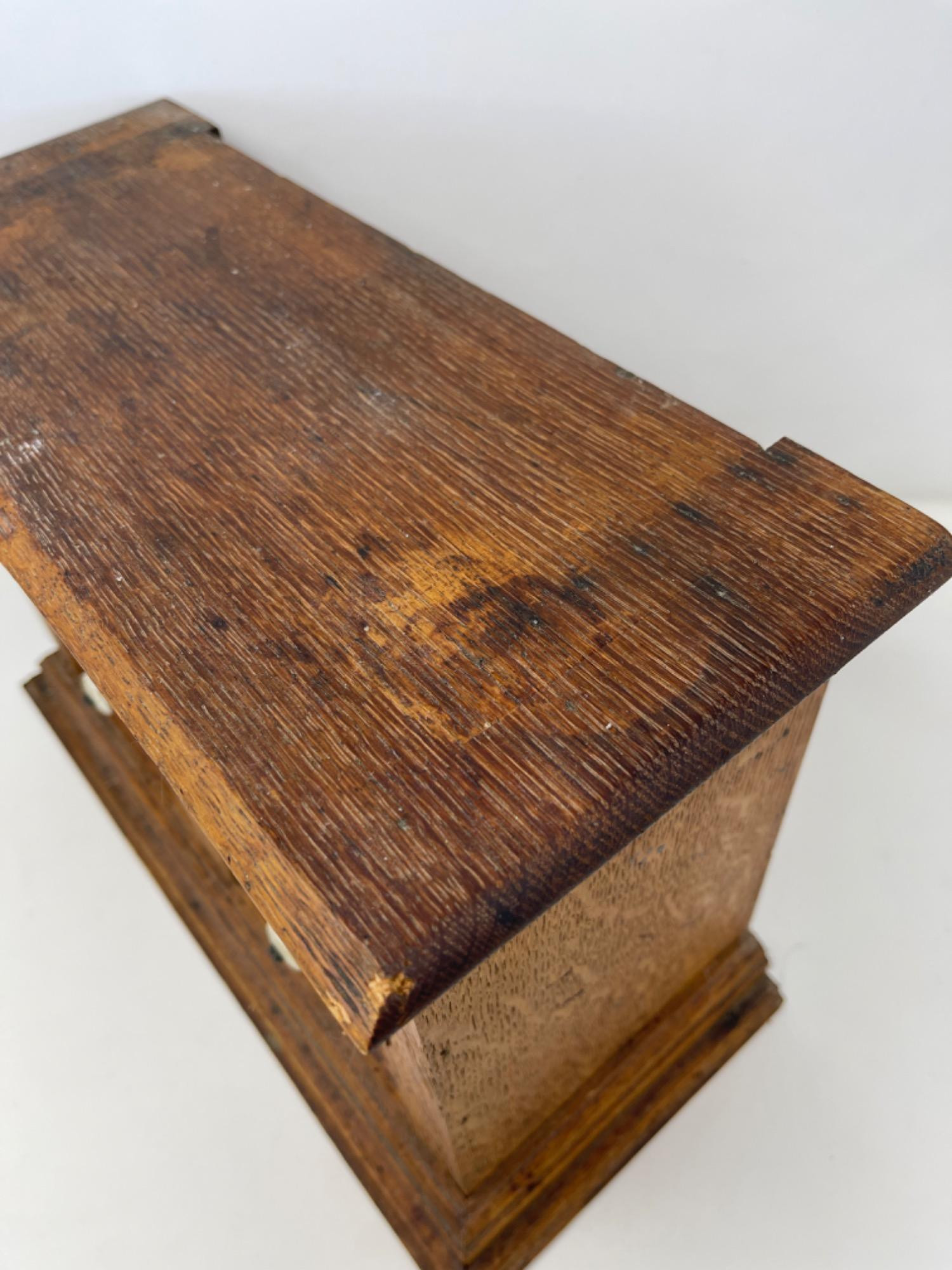 Antique Wooden Jewelry or Sewing Box This charming antique wooden box features four small drawers, making it ideal for storing jewelry, sewing notions, or keepsakes. With its warm aged patina, hand-crafted details, and delicate cream knobs, this piece exudes vintage character and timeless appeal. Condition: - Well-worn antique condition with visible scuffs, scratches, and age-related imperfections, adding to its charm. - Drawers function properly, making it both a decorative and practical piece.