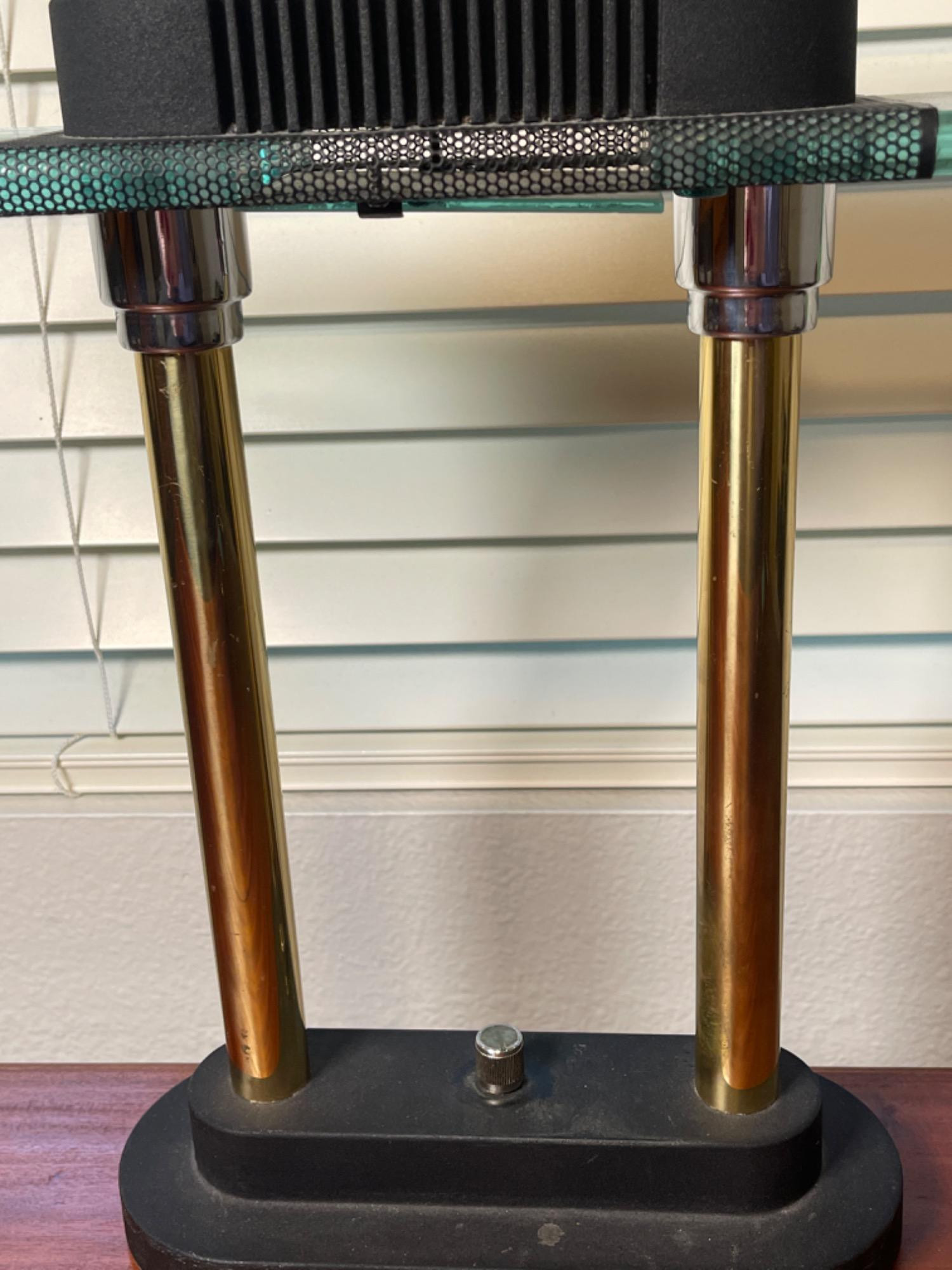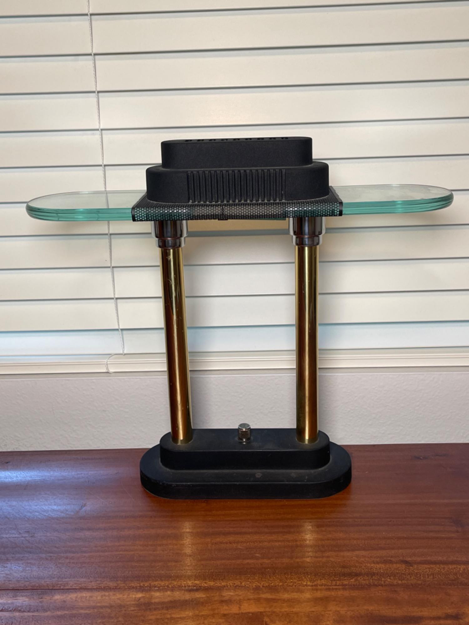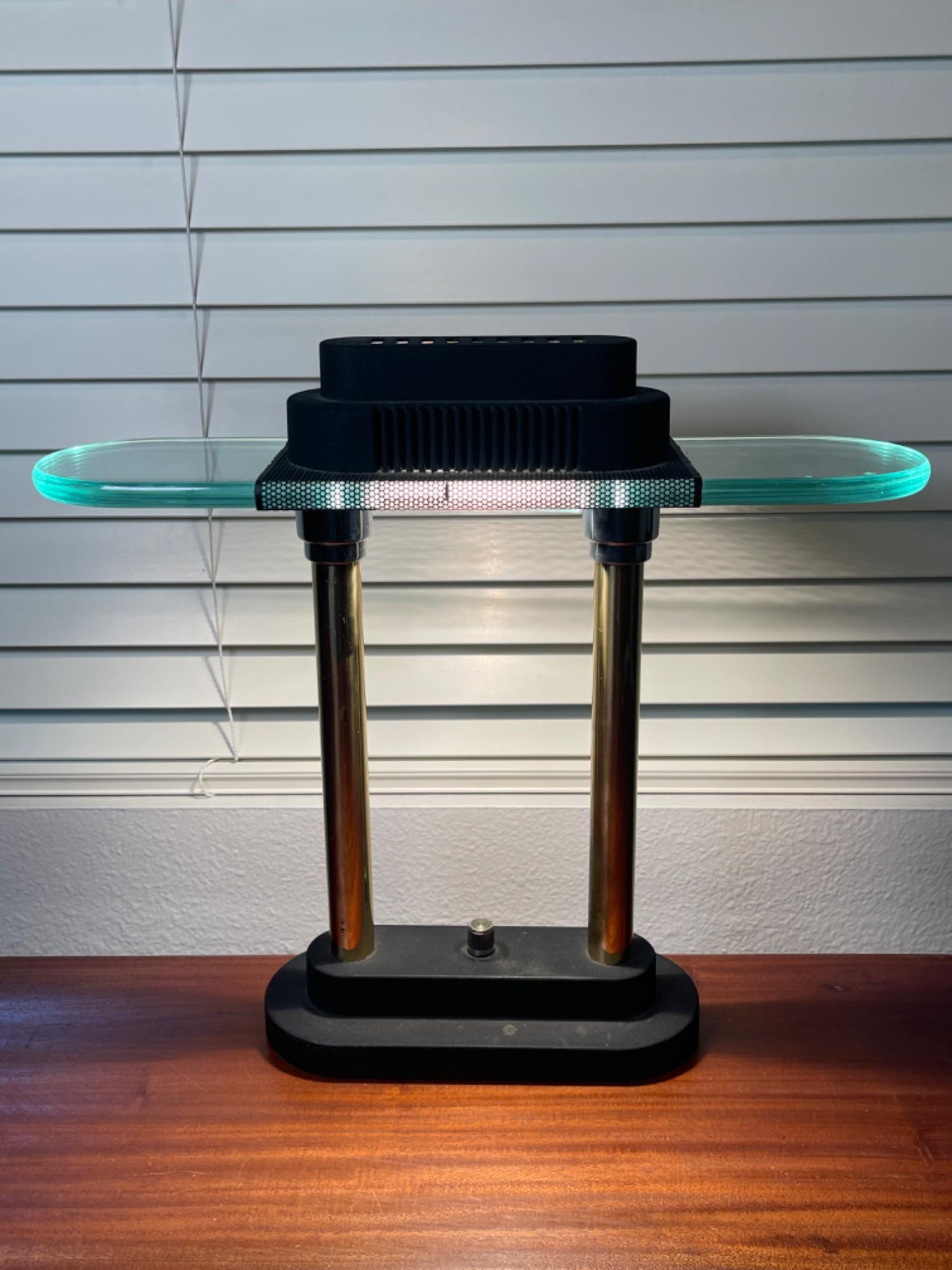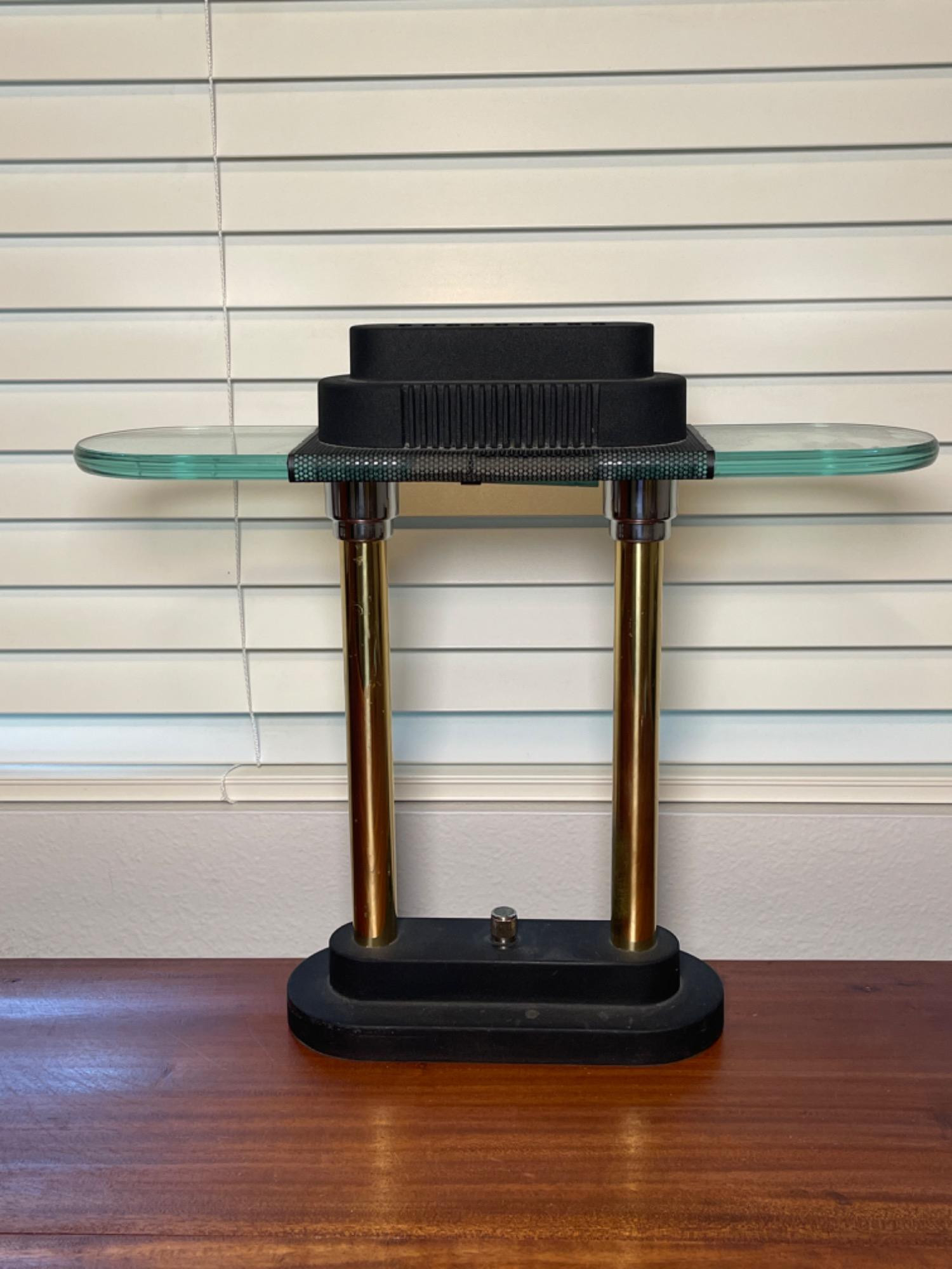 Vintage Art Deco-Inspired Glass & Brass Table Lamp This striking vintage table lamp blends Art Deco and Mid-Century Modern influences, featuring a sleek glass top, brass columns, and a bold black base. Its unique geometric design makes it a statement piece for any modern or vintage-inspired space. Condition: - Good vintage condition with minor wear consistent with age. - Great working condition.