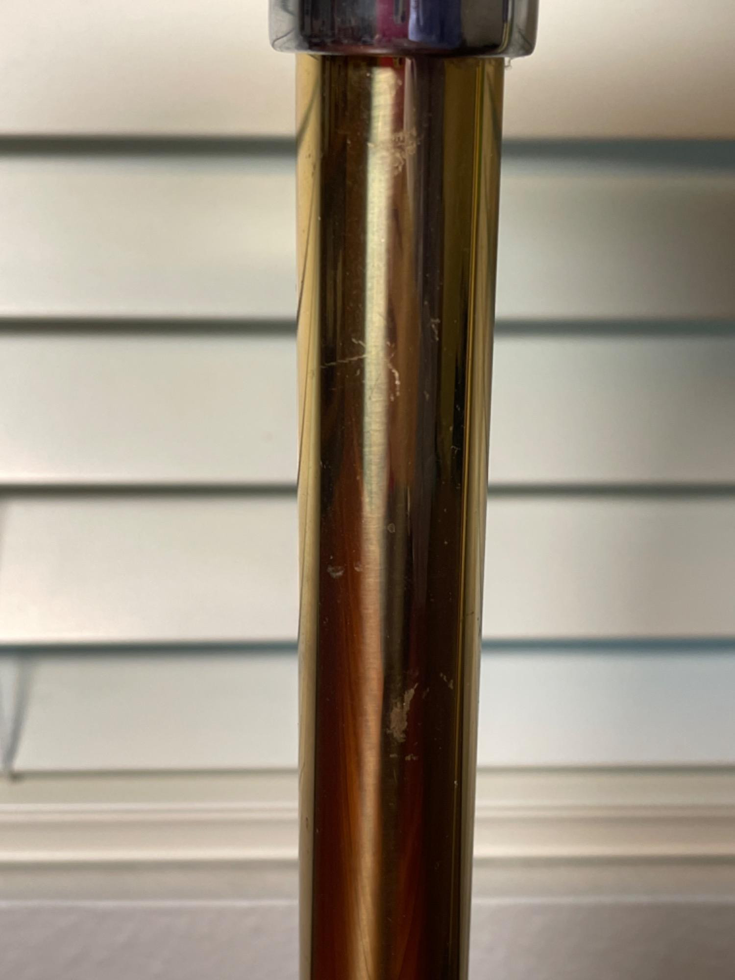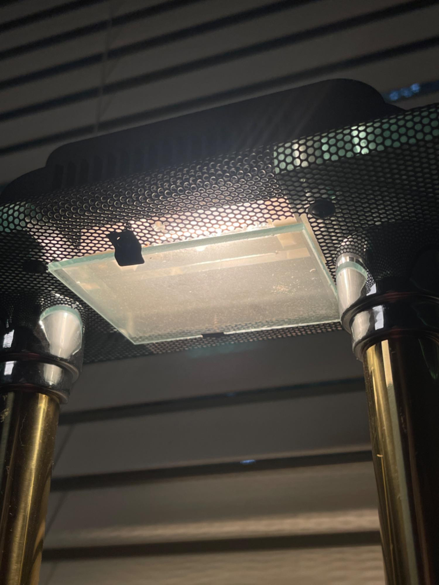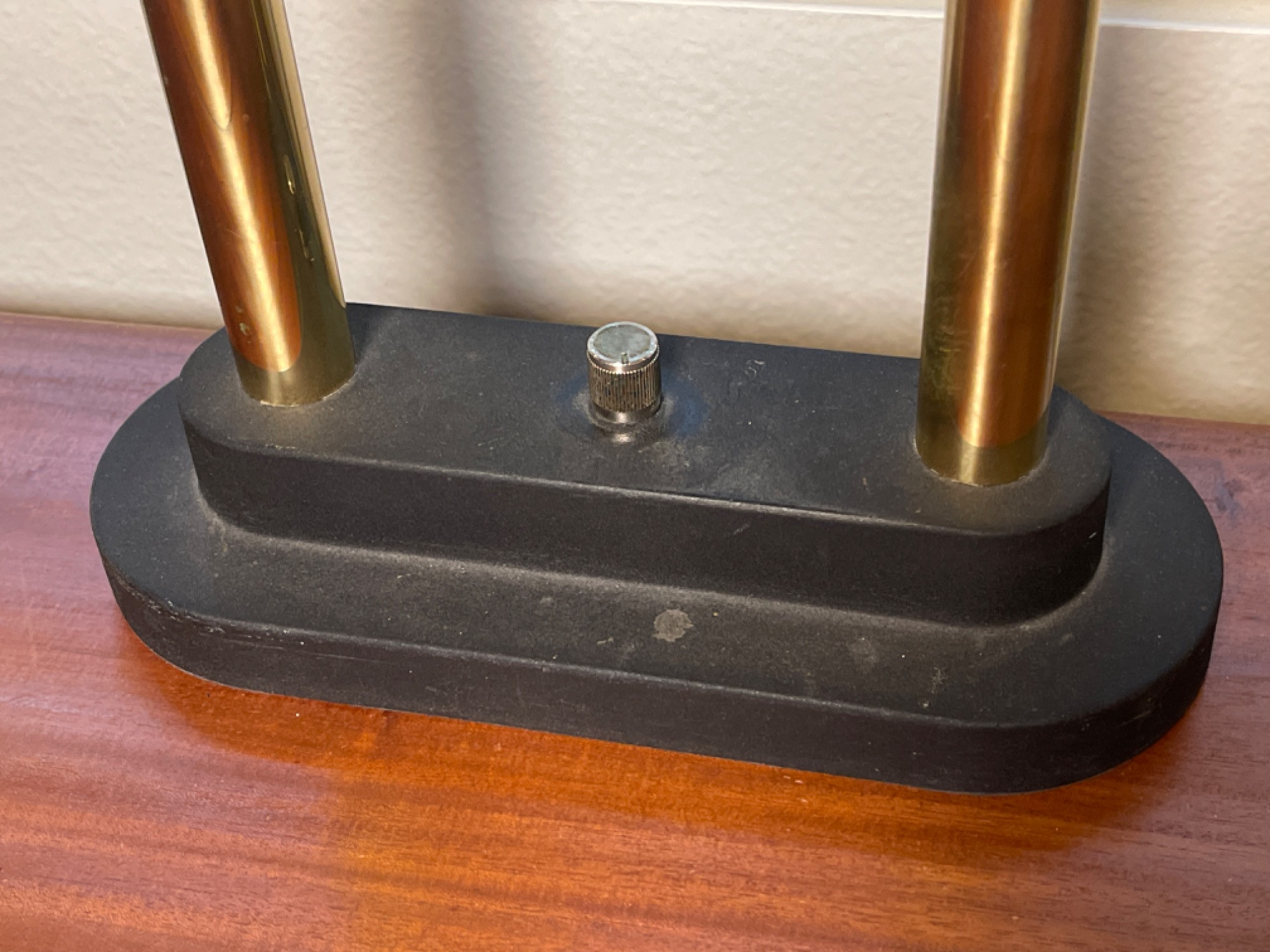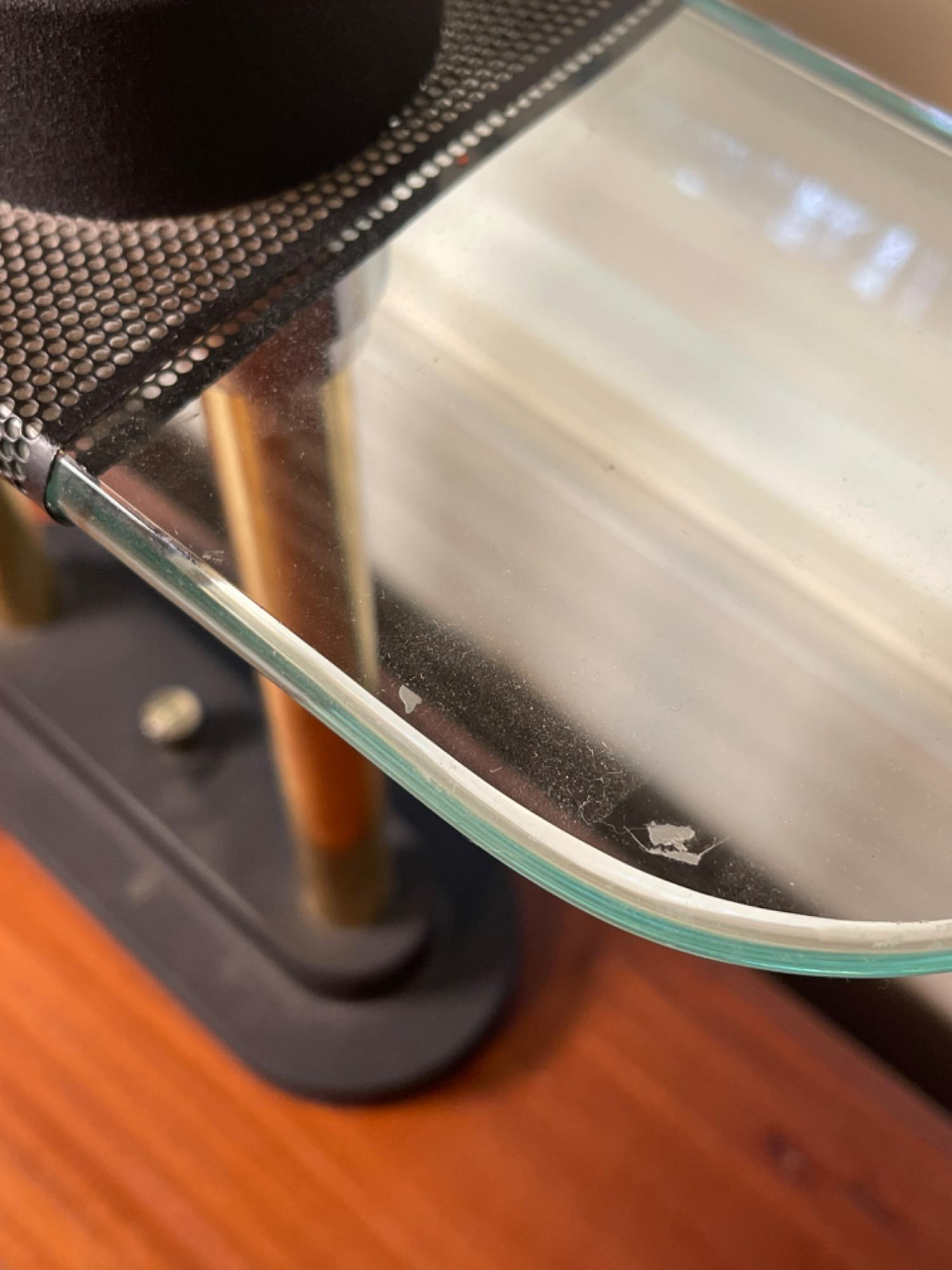 Vintage Art Deco-Inspired Glass & Brass Table Lamp This striking vintage table lamp blends Art Deco and Mid-Century Modern influences, featuring a sleek glass top, brass columns, and a bold black base. Its unique geometric design makes it a statement piece for any modern or vintage-inspired space. Condition: - Good vintage condition with minor wear consistent with age. - Great working condition.