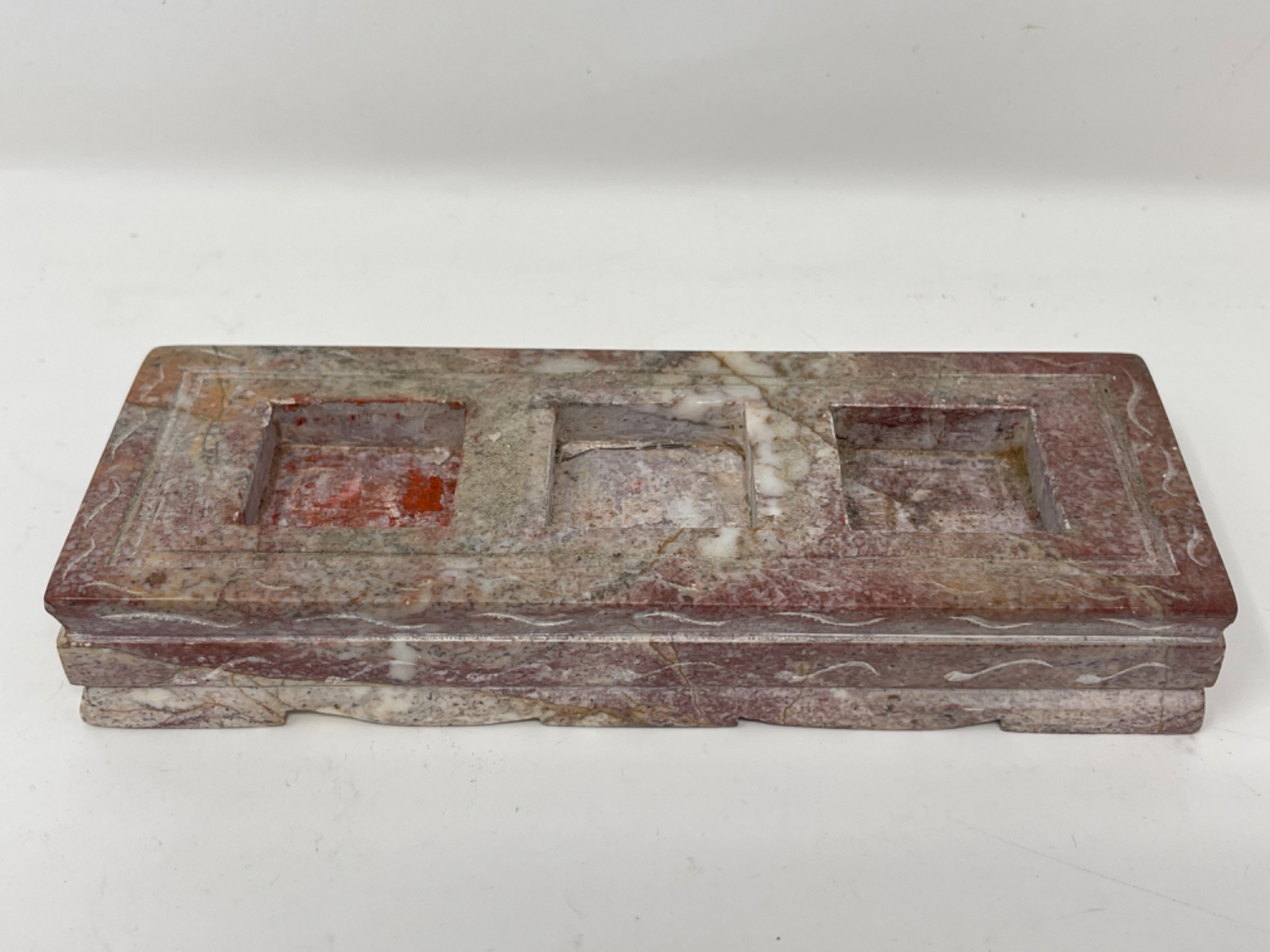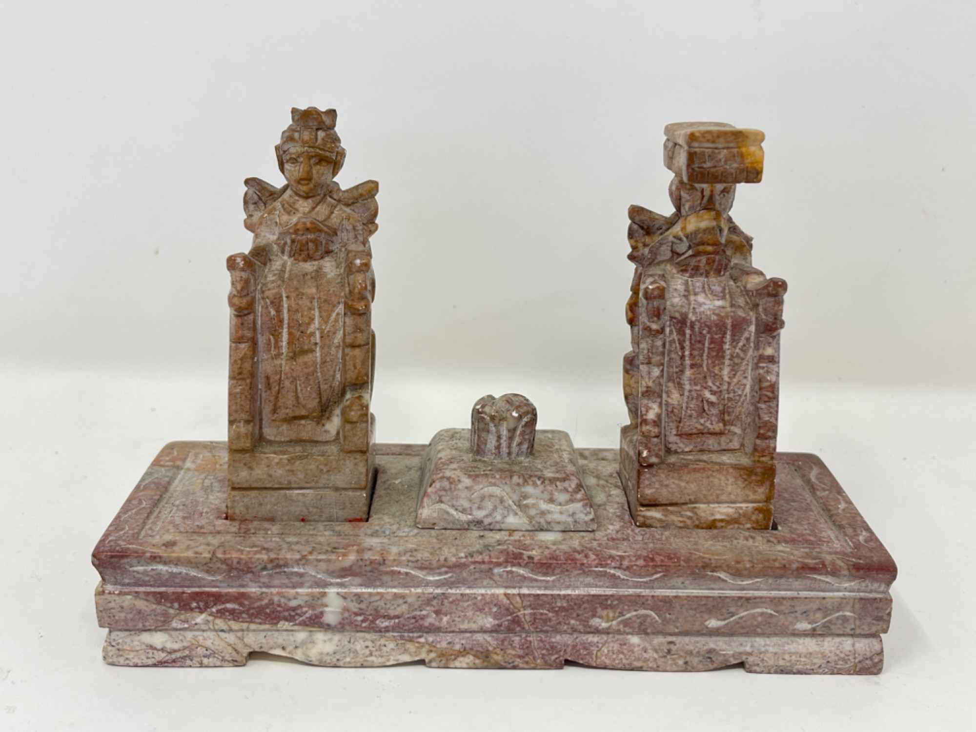 Vintage Chinese Stone Seals – Hand-Carved Figures & Traditional Design This unique set of hand-carved Chinese stone seals features intricately sculpted figures and symbolic motifs, making them a beautiful and collectible representation of traditional Chinese craftsmanship. These seals were historically used for stamping documents, artwork, or calligraphy, and remain highly valued as decorative and functional artifacts. Condition: - Good vintage condition with some natural wear and minor chipping, consistent with age and handcrafted nature. Tallest: 3.5” H