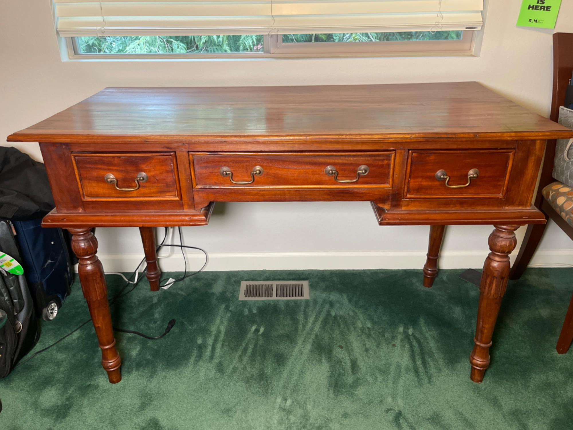 Vintage Solid Wood Desk with Carved Legs – Classic Charm & Character This vintage solid wood desk is a timeless piece that brings elegance and craftsmanship to any space. Featuring three spacious drawers with brass-finished handles and beautifully turned and carved legs, this desk showcases traditional charm with a warm, rich wood finish. Condition: - Well-loved vintage condition with visible scuffs, scratches, and surface stains from age and use.