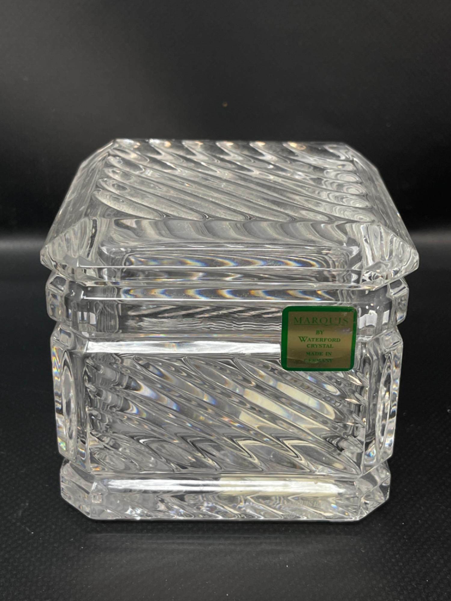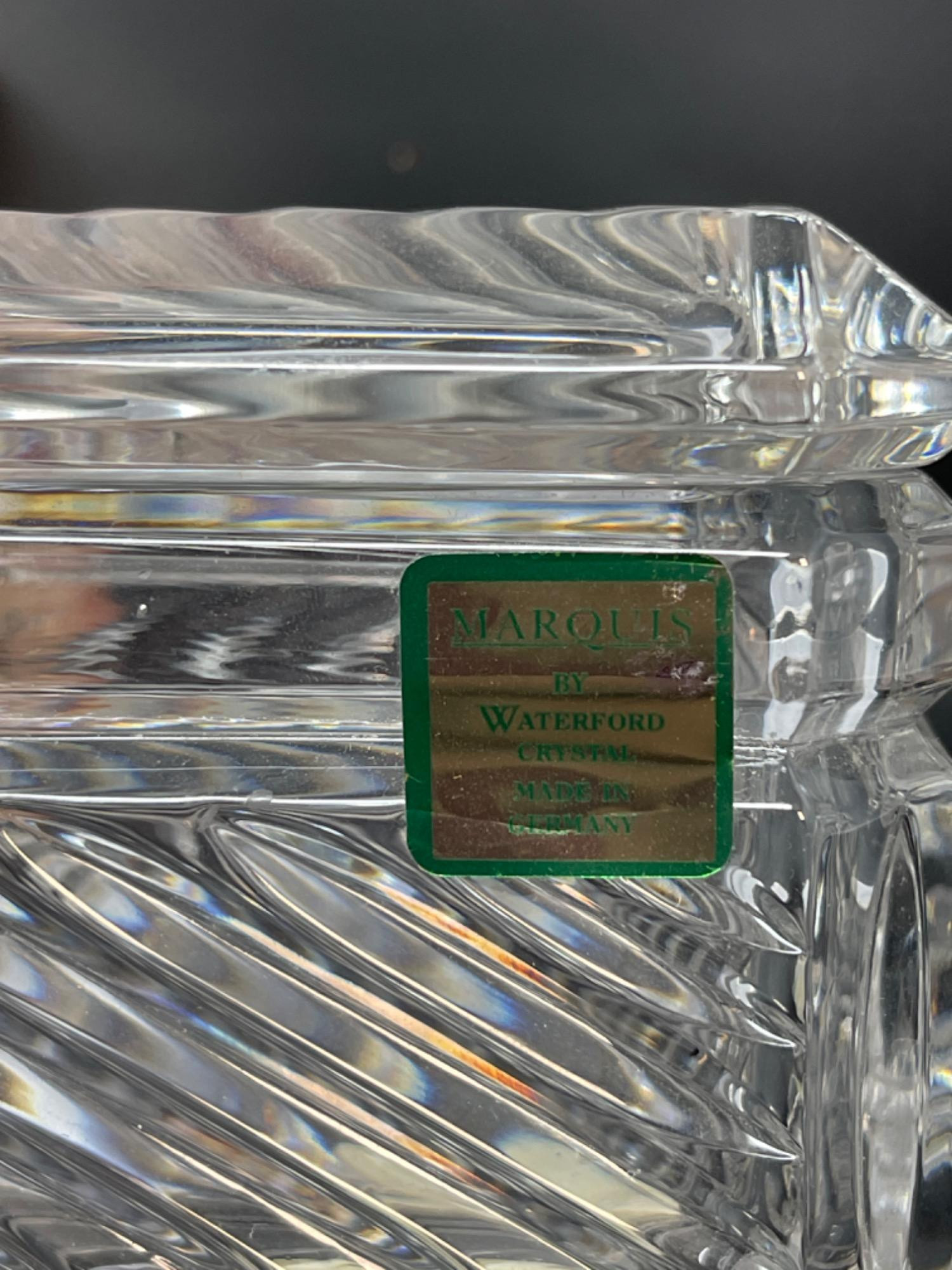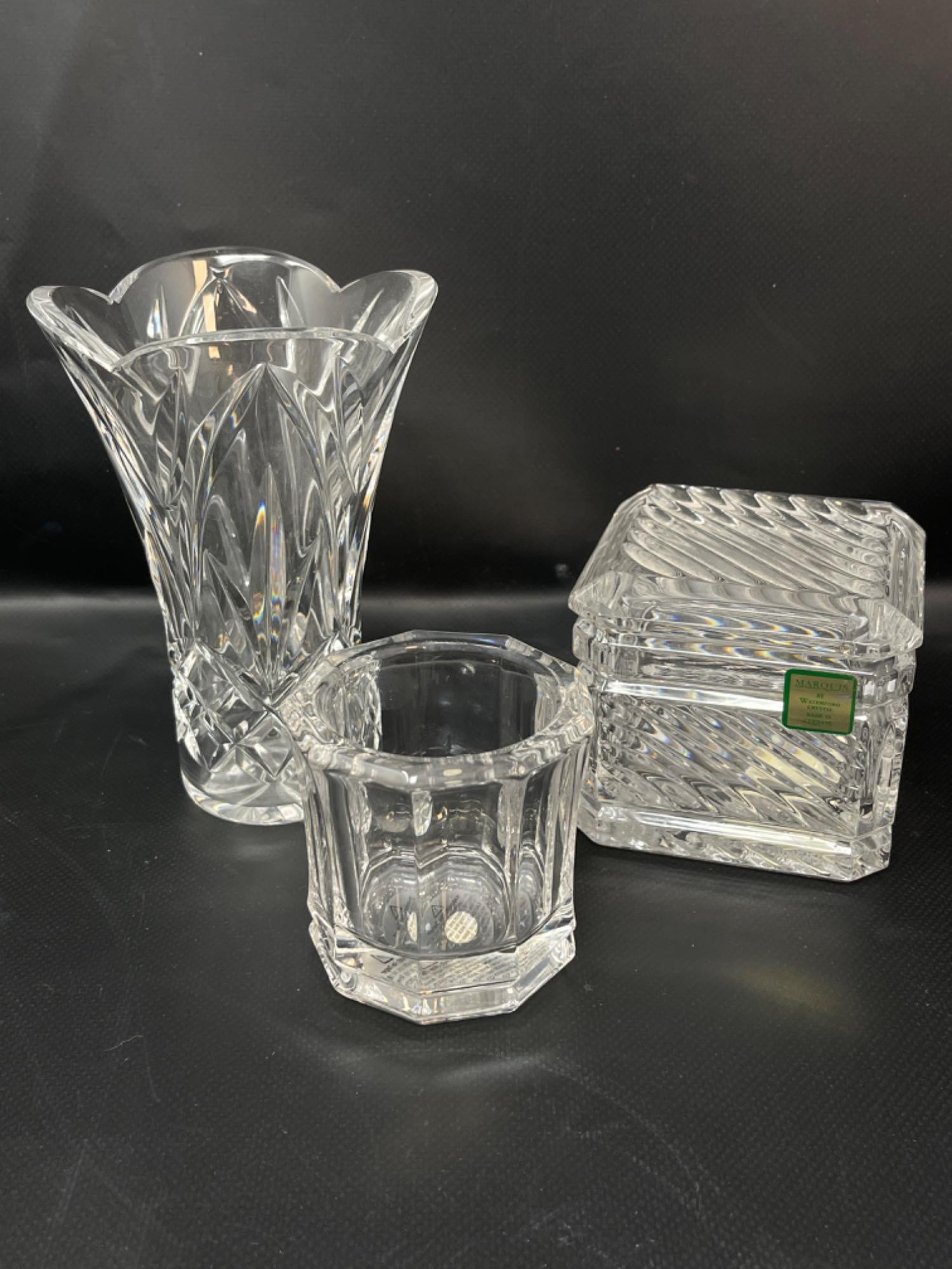 Assorted Crystal Collection – Waterford, Marquis by Waterford, and Tiffany & Co. This elegant assortment of fine crystal pieces includes a Waterford vase, a Marquis by Waterford lidded jar, and a Tiffany & Co. votive candle holder, making it a stunning addition to any collection or display. Crafted with exceptional clarity and intricate cuts, each piece embodies timeless craftsmanship and luxury. Condition: - All pieces are in excellent pre-owned condition with no visible chips or cracks. Waterford Vase: 6” H Marquis By Waterford Lidded Jar: 3.5” H Tiffany & Co. Votive Holder: 2.75” H