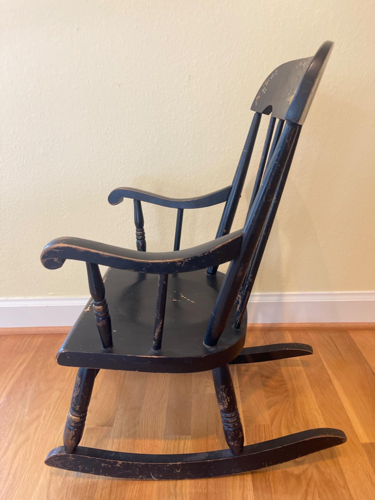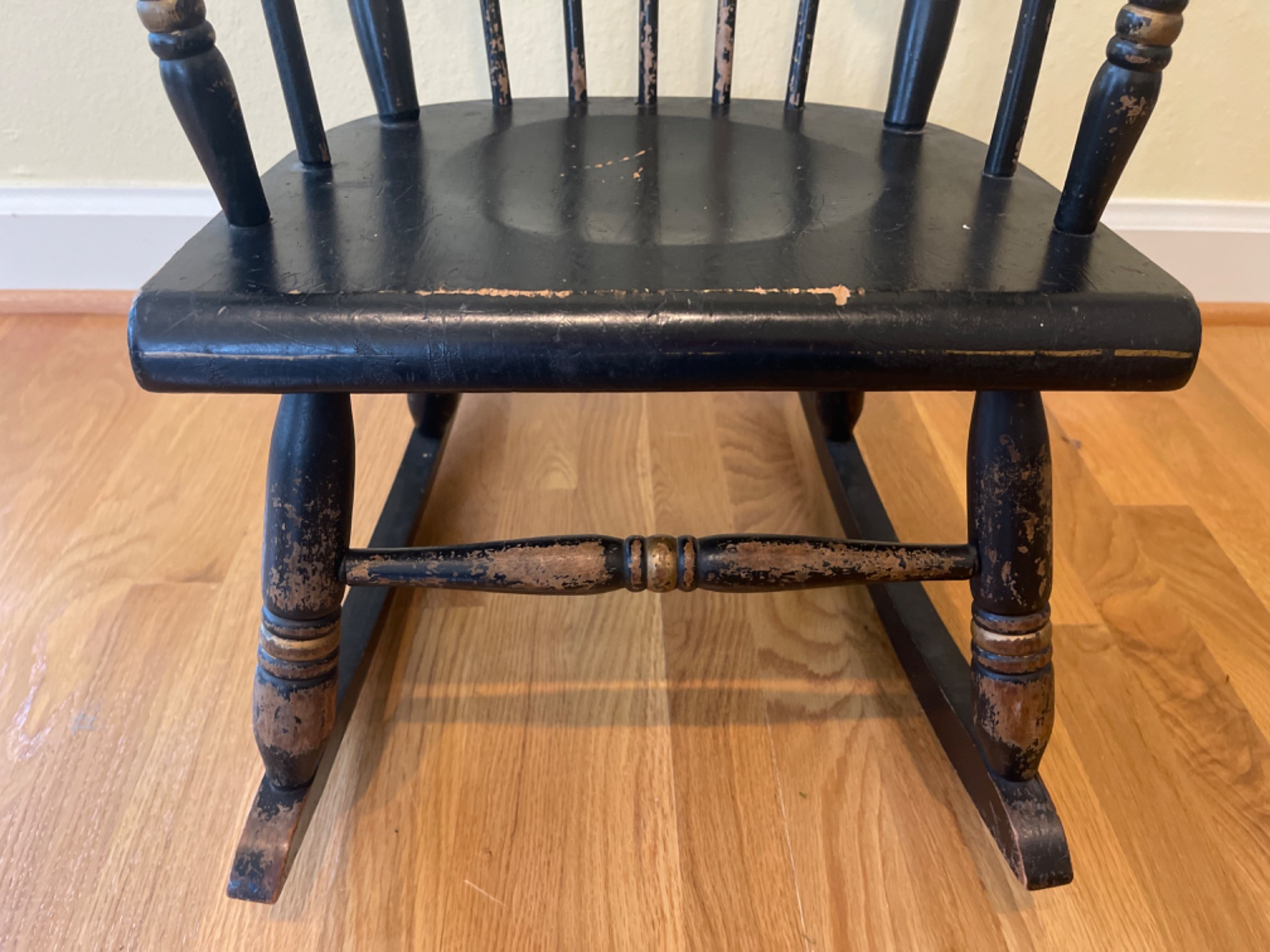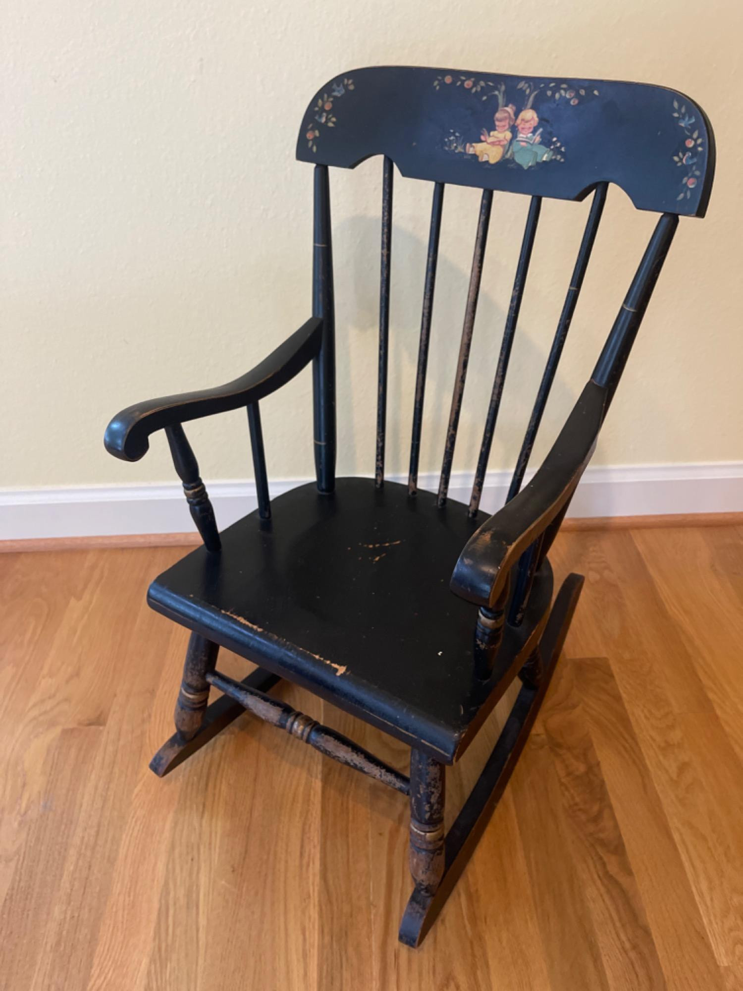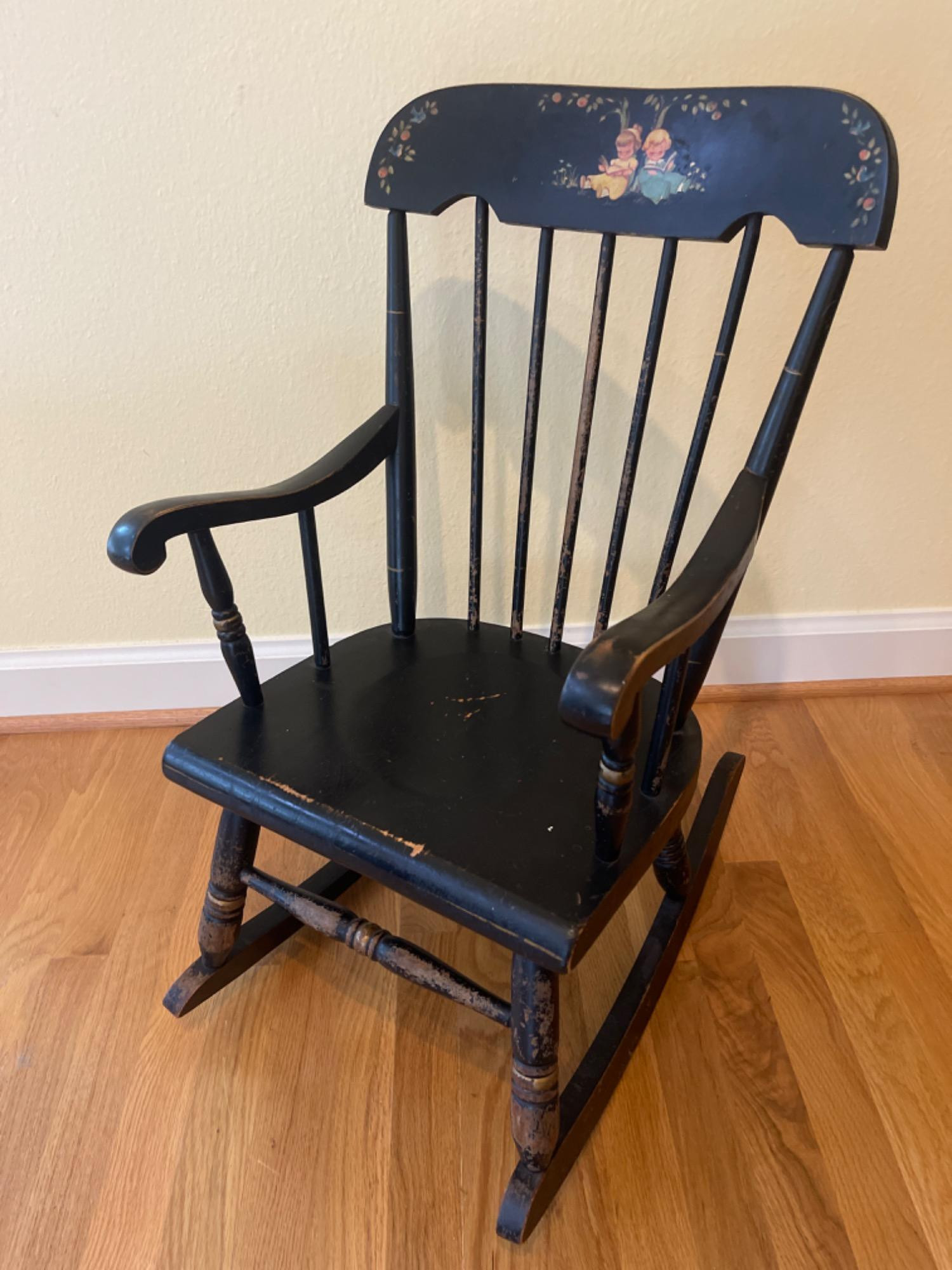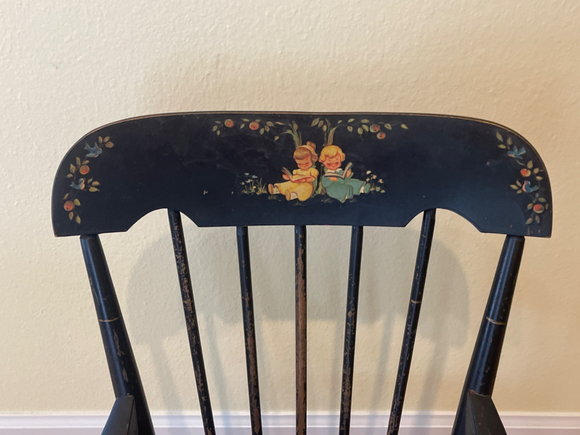 Vintage Hand-Painted Child’s Wooden Rocking Chair This charming vintage child’s wooden rocking chair features a classic spindle-back design with a beautifully aged black finish. Perfectly sized for a little one, this sturdy and well-crafted rocker exudes a nostalgic, heirloom-quality appeal. The top rail is adorned with a hand-painted pastoral scene of two children sitting among flowers, framed by delicate floral accents, adding a whimsical and folk-art touch. The gently curved rockers and armrests provide comfort, while the distressed patina showcases its vintage character, making it a unique and timeless piece. Condition: Multiple scuffs, scratches and wearing off of paint. Please see photos.