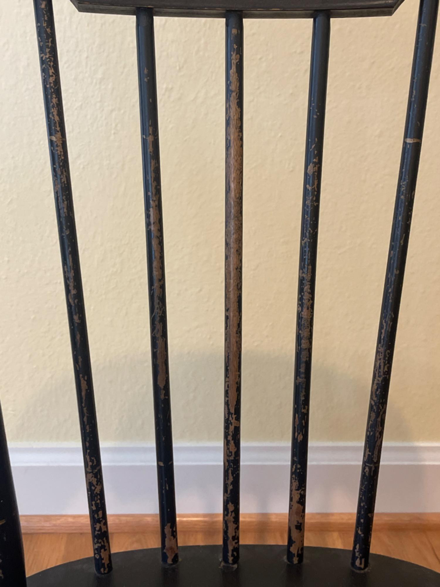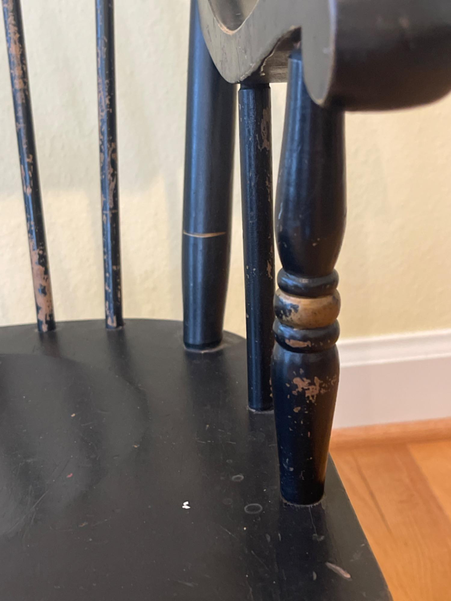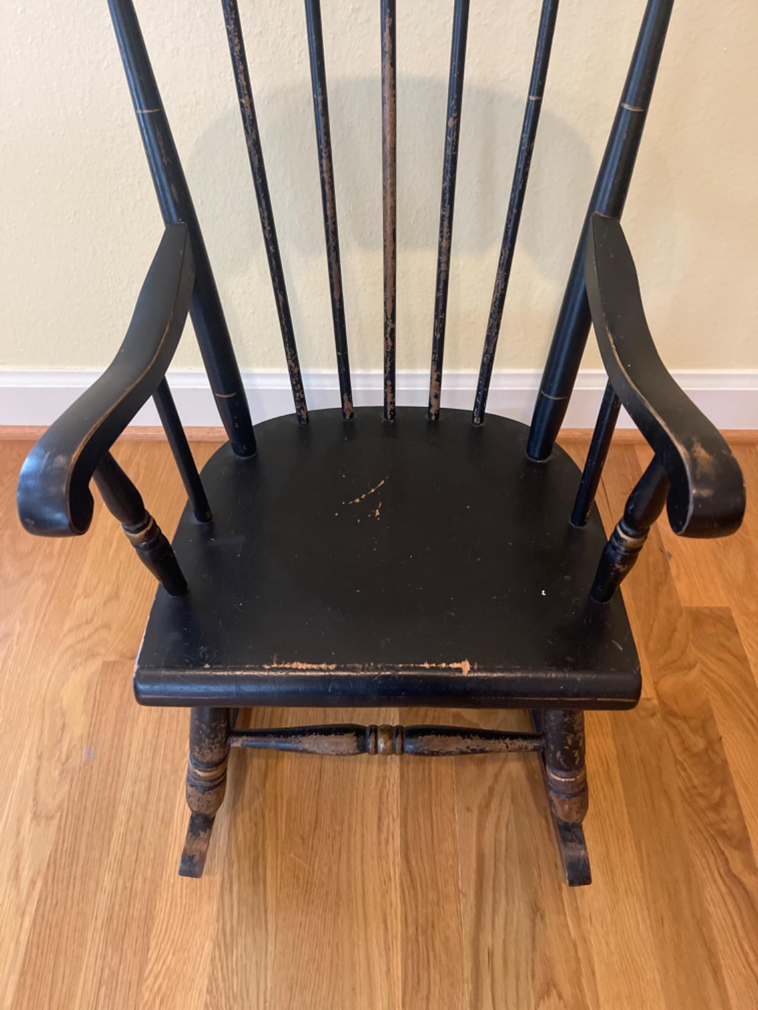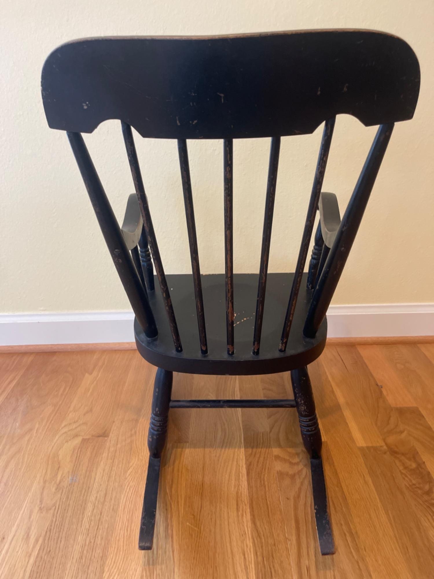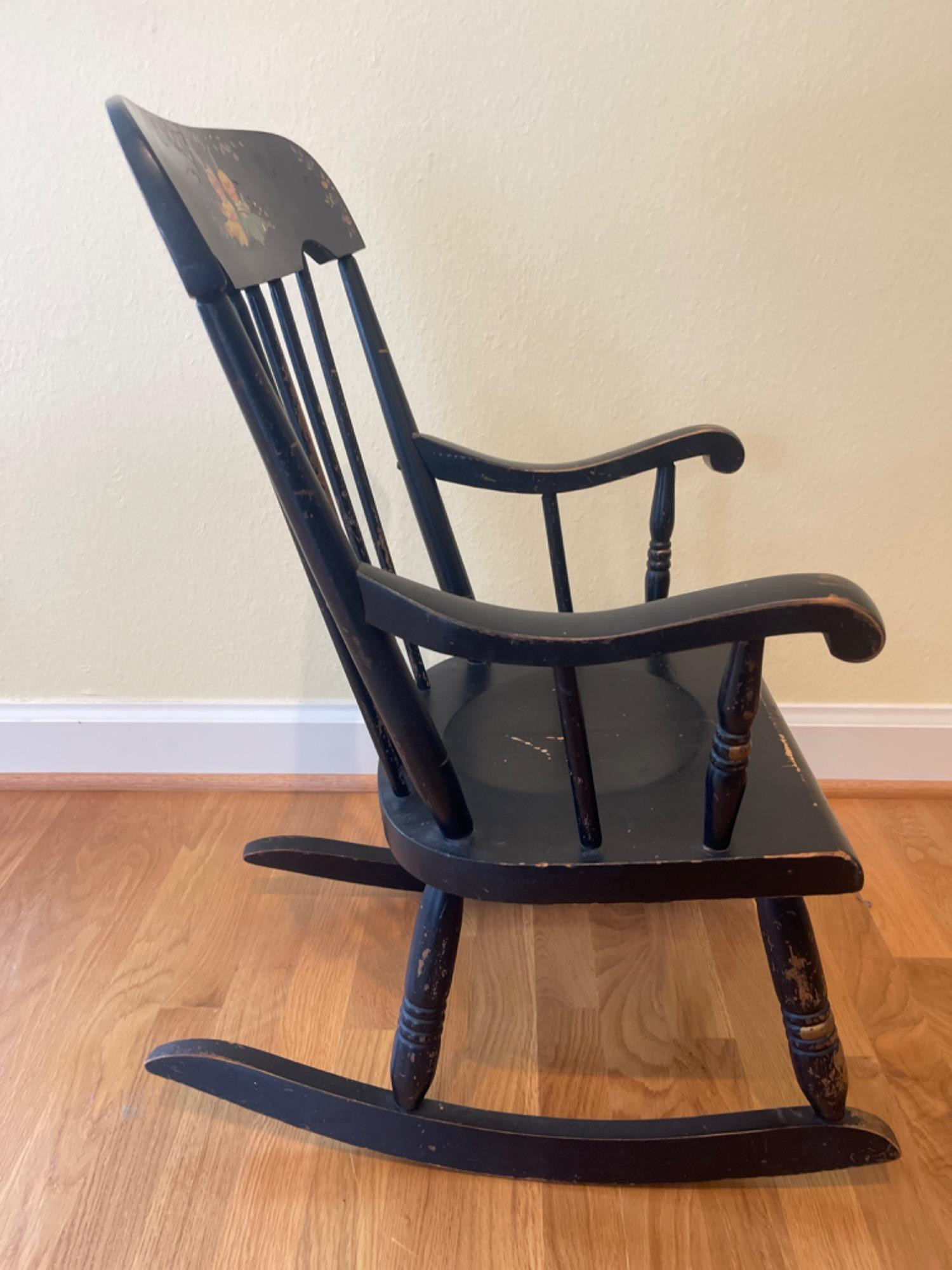 Vintage Hand-Painted Child’s Wooden Rocking Chair This charming vintage child’s wooden rocking chair features a classic spindle-back design with a beautifully aged black finish. Perfectly sized for a little one, this sturdy and well-crafted rocker exudes a nostalgic, heirloom-quality appeal. The top rail is adorned with a hand-painted pastoral scene of two children sitting among flowers, framed by delicate floral accents, adding a whimsical and folk-art touch. The gently curved rockers and armrests provide comfort, while the distressed patina showcases its vintage character, making it a unique and timeless piece. Condition: Multiple scuffs, scratches and wearing off of paint. Please see photos.