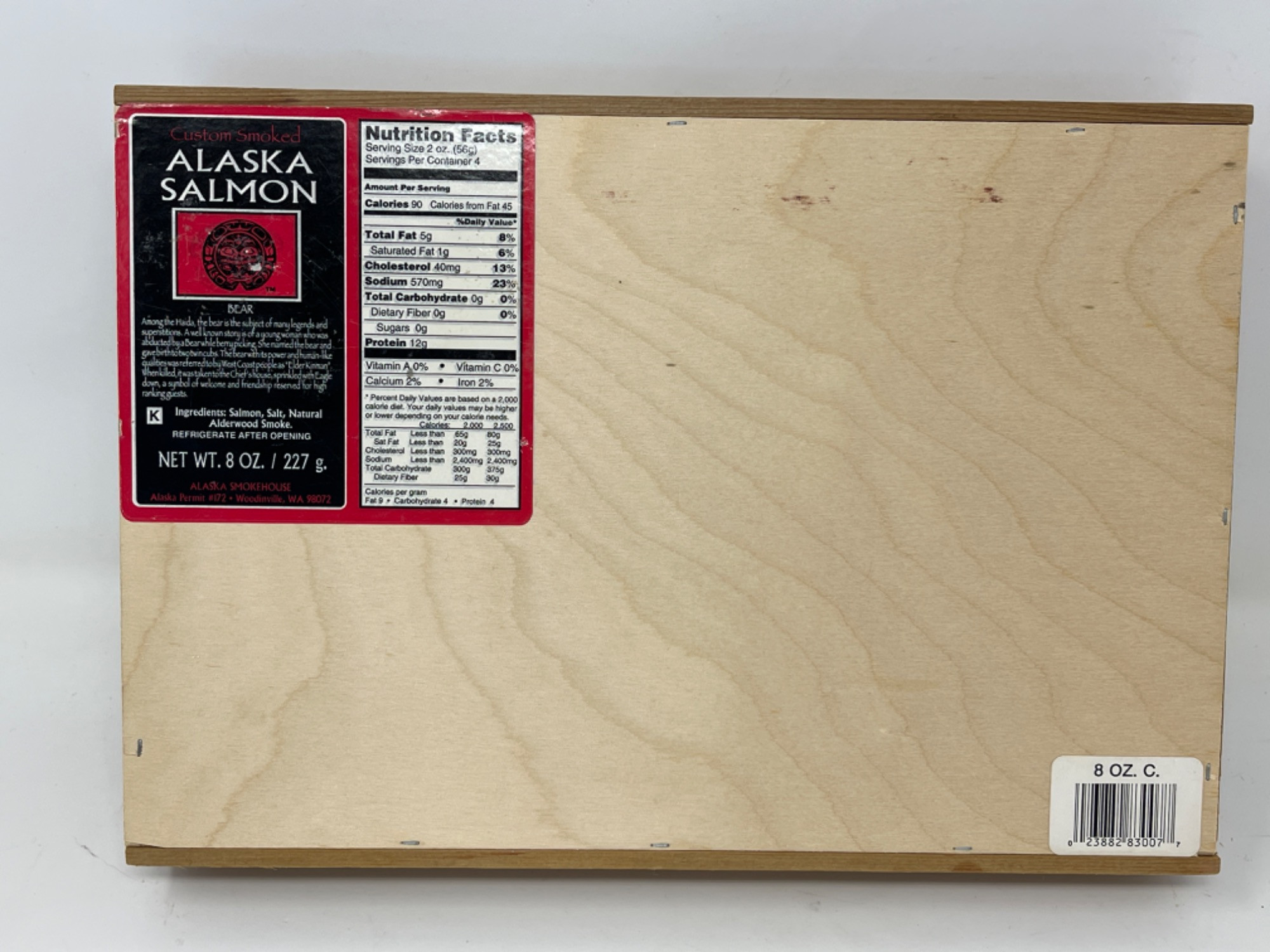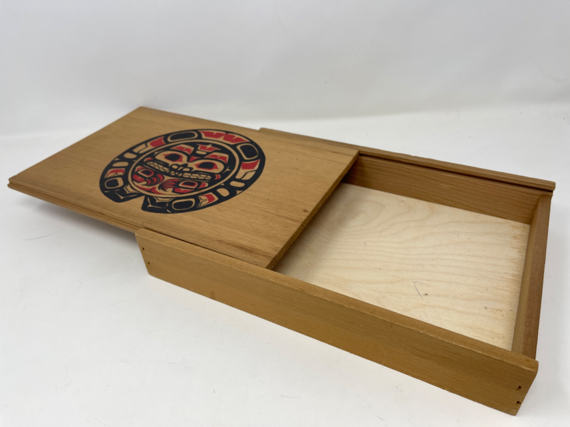 Alaska Salmon Box with Indigenous Artwork - 10.75" L x 7.5" W x 1.75" H - A wooden Alaska salmon box featuring a traditional Northwest Coast Indigenous design on the lid.