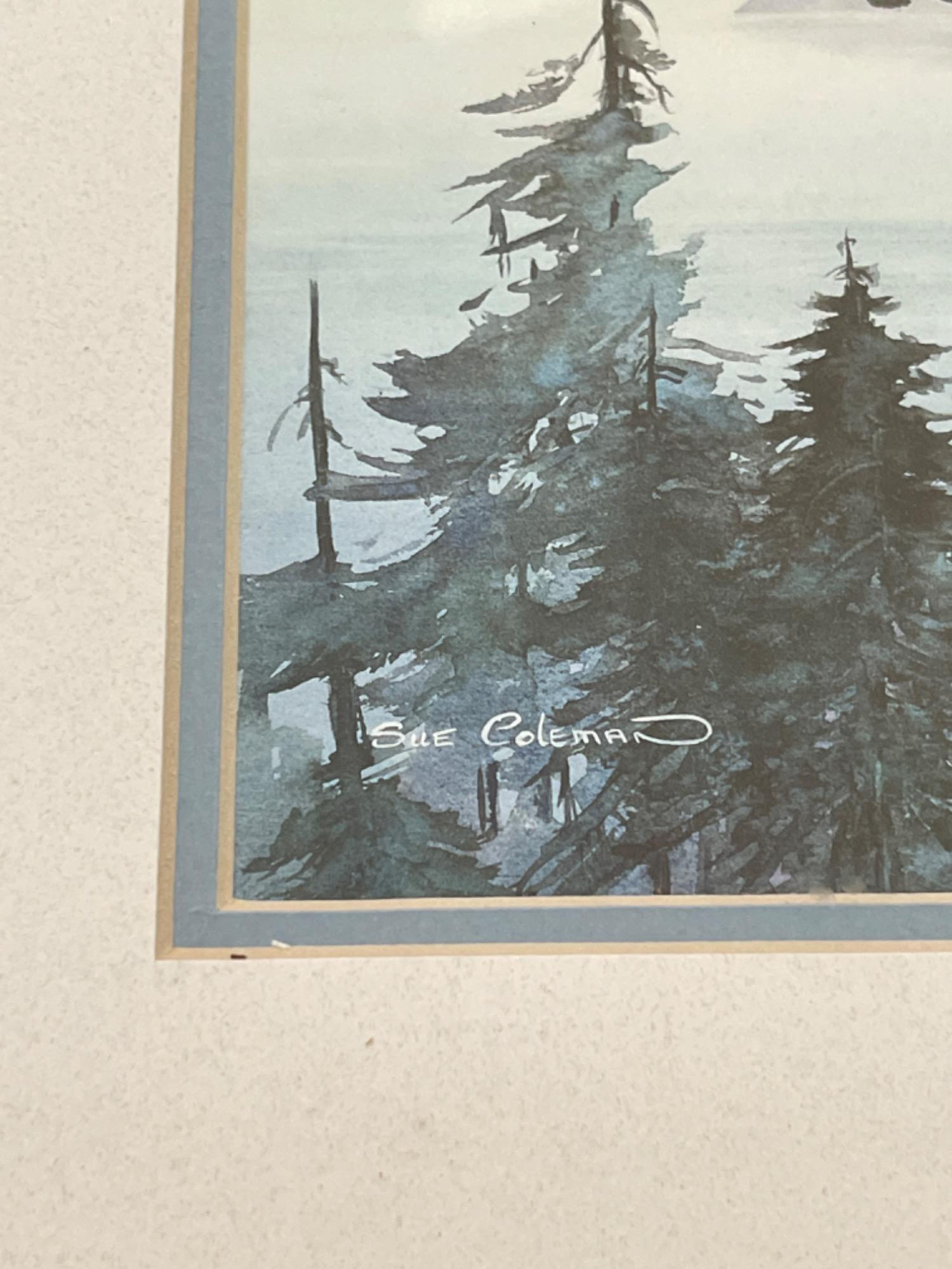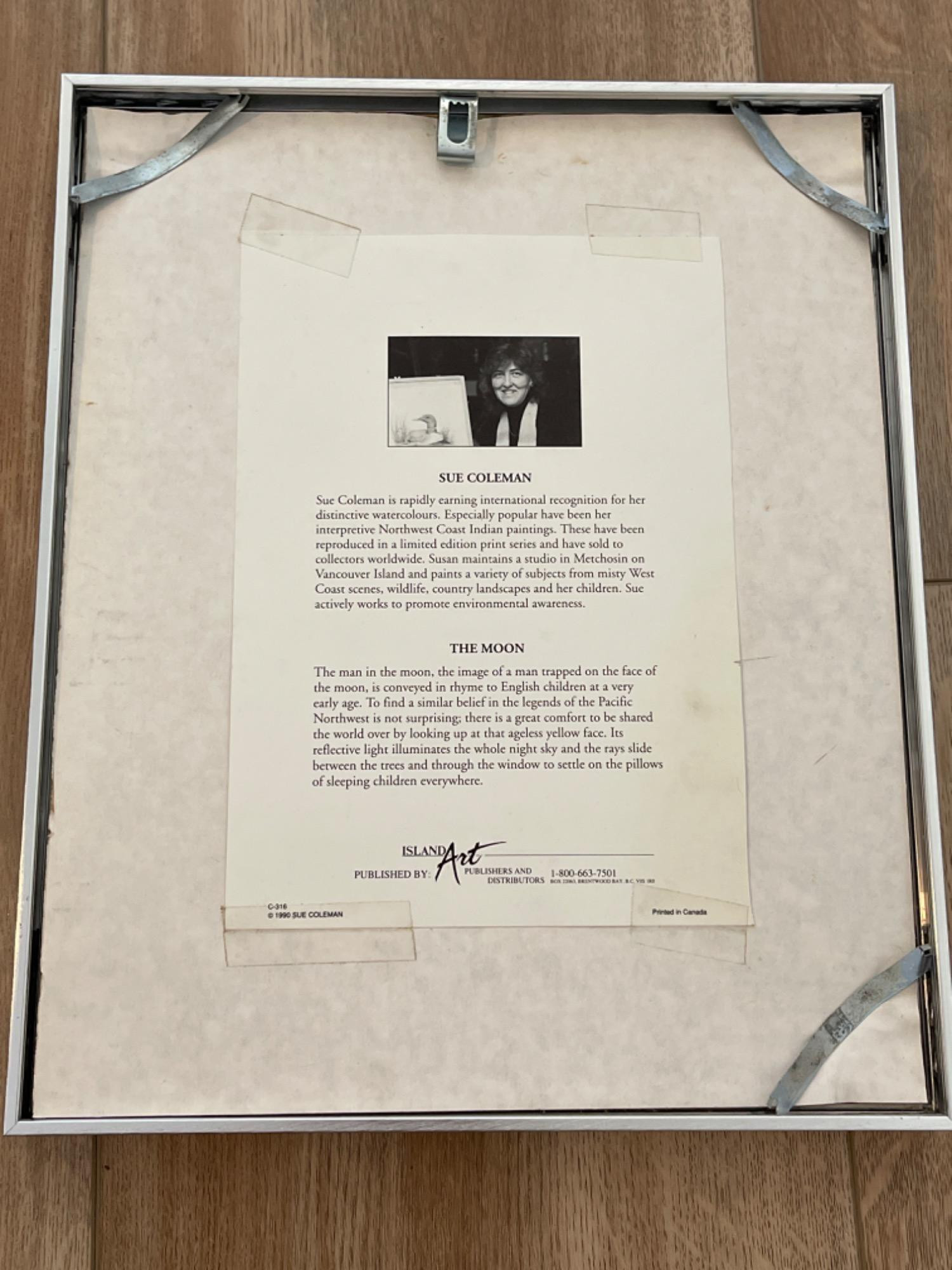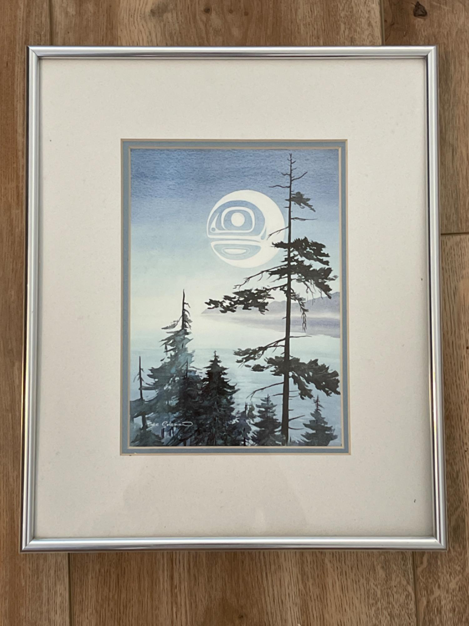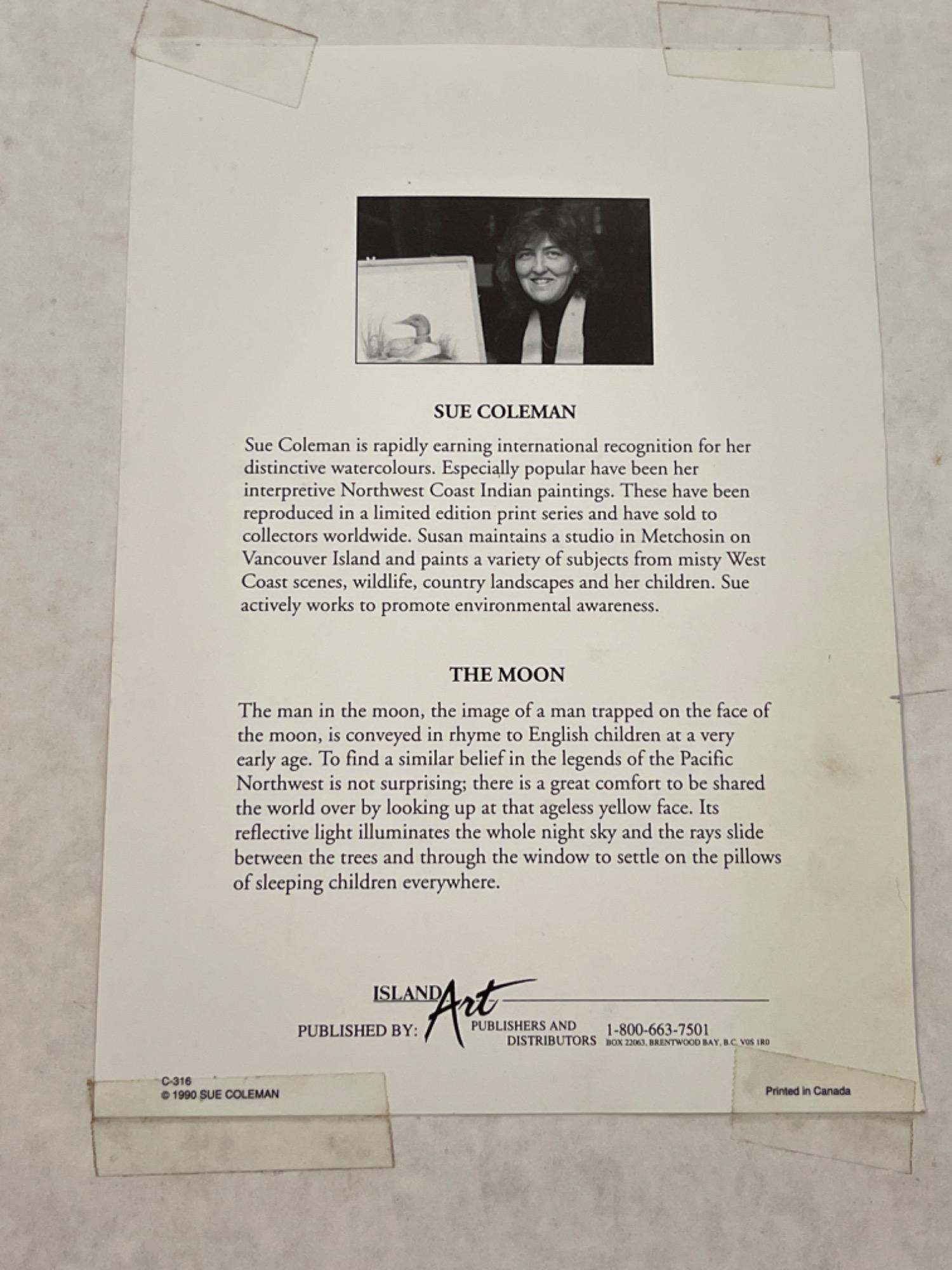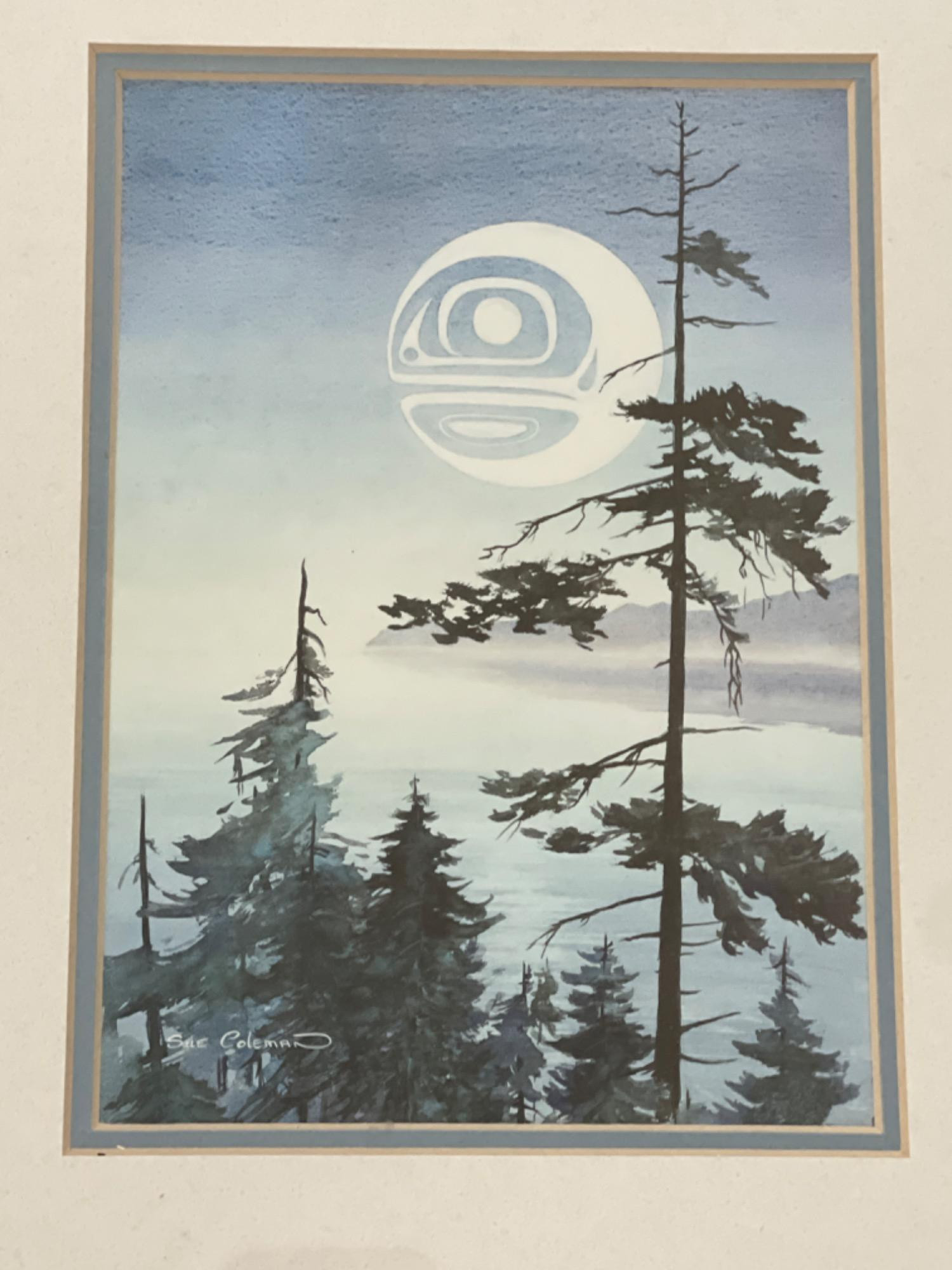 A beautifully framed print by renowned artist Sue Coleman, known for her interpretive Northwest Coast Indian paintings and distinctive watercolors.