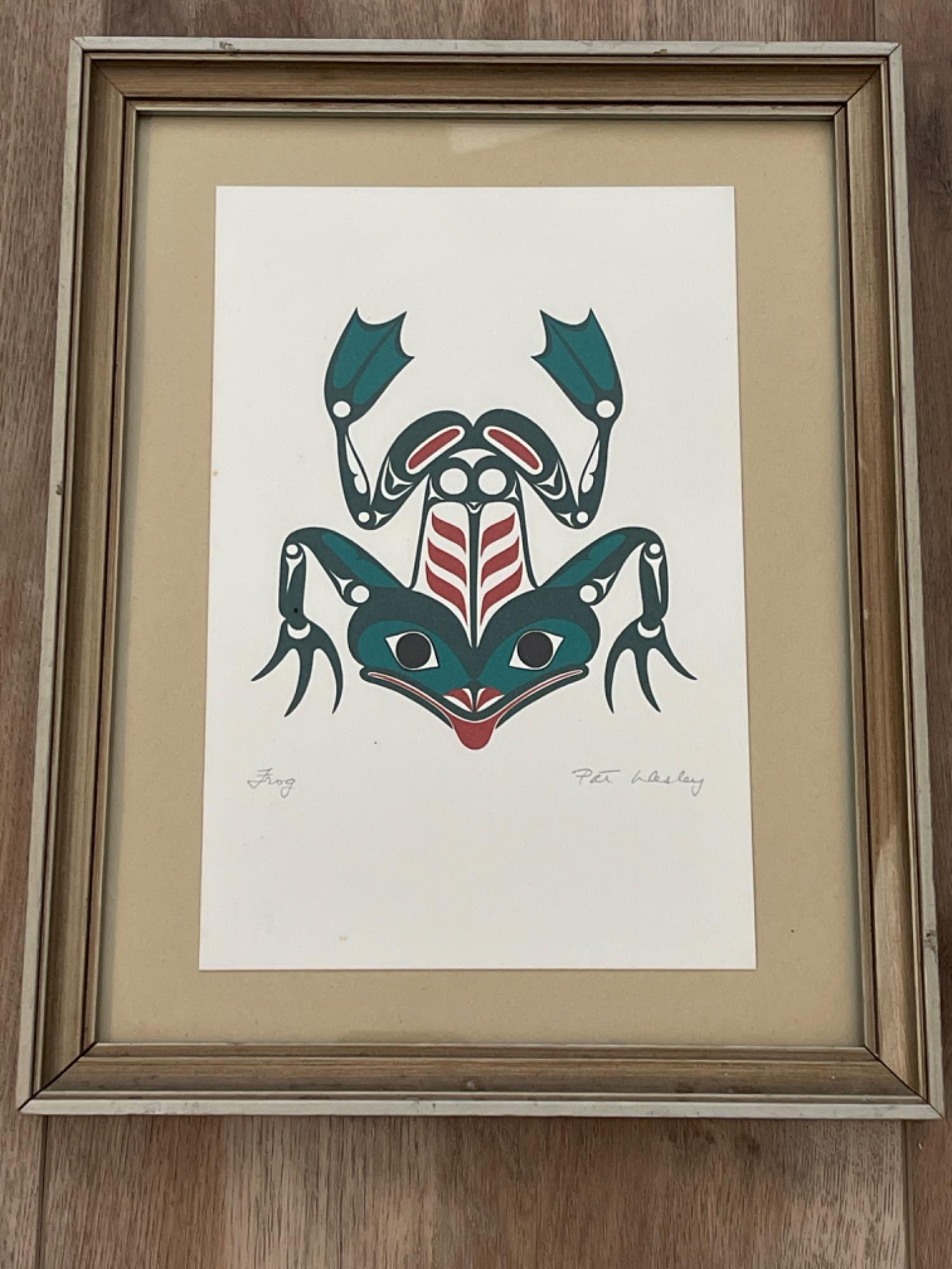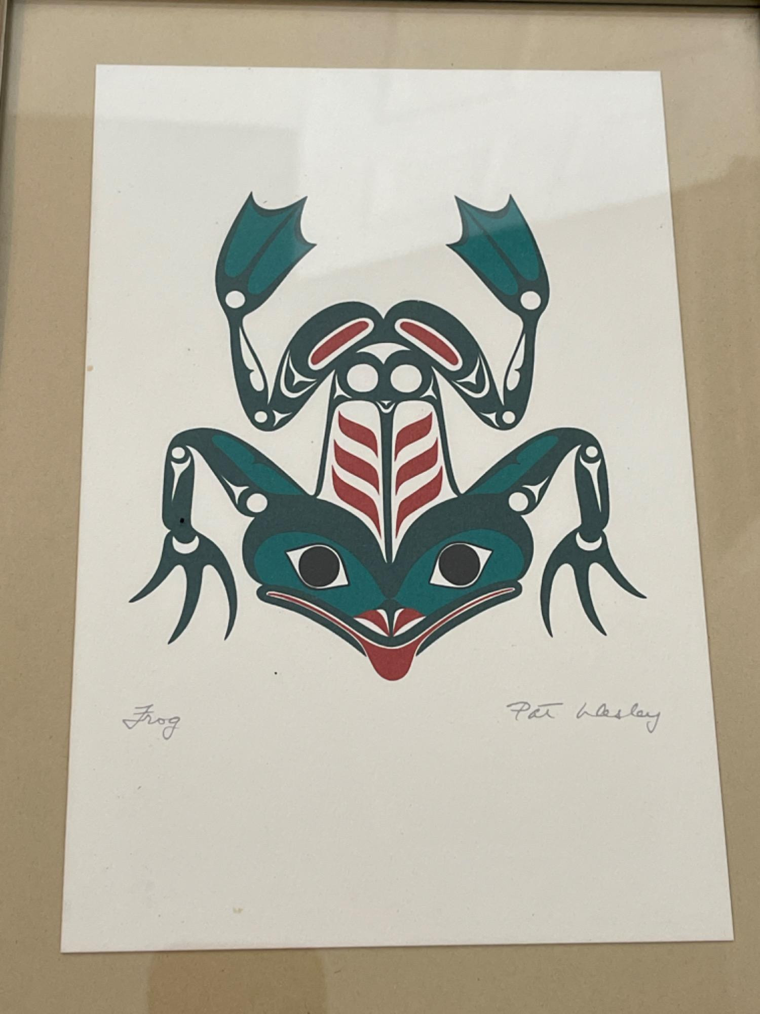 "Frog" by Pat Wesley (Framed Print) - 9.5" W x 12" H - A striking Indigenous Northwest Coast-style frog print by Pat Wesley, an artist known for their vibrant and traditional designs.