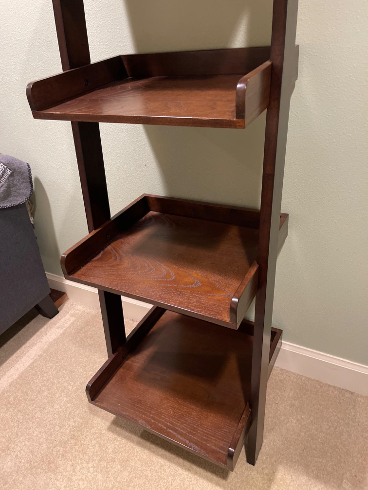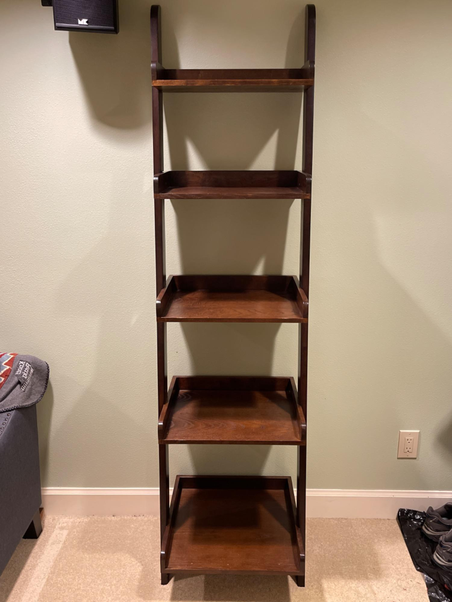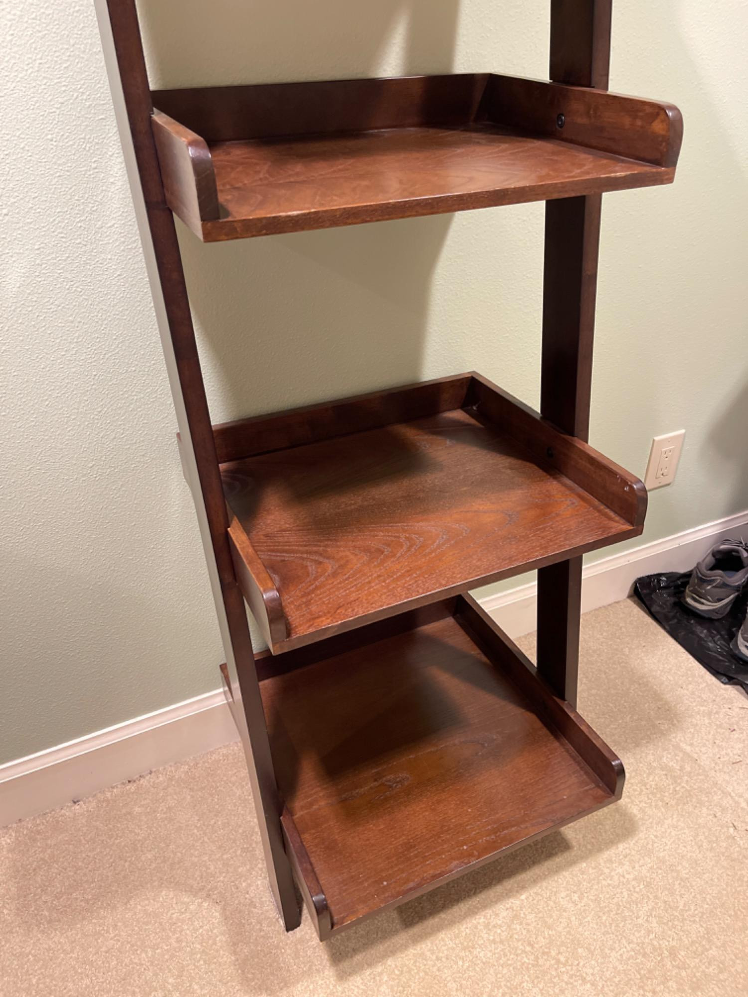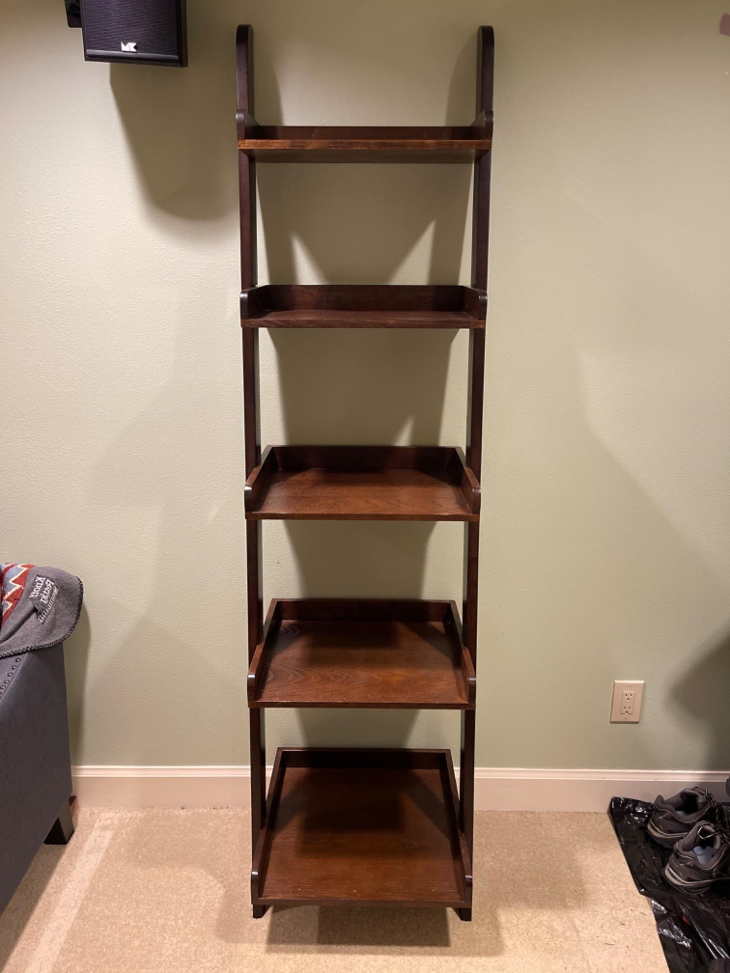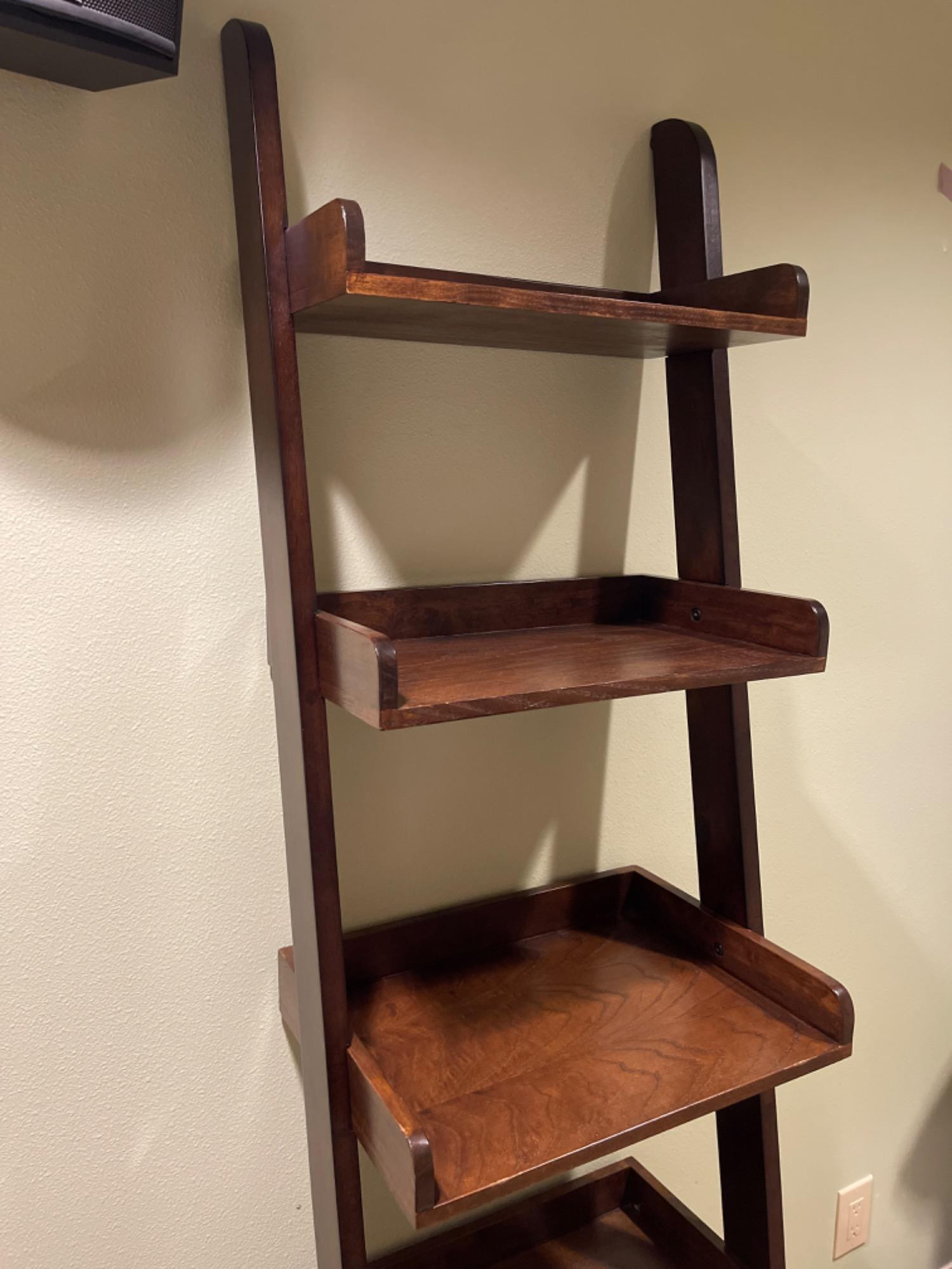 Wooden Leaning Ladder Shelf – 5-Tier Storage & Display Unit Elevate your space with this stylish and functional leaning ladder shelf, perfect for adding a touch of rustic charm and practical storage to any room. Condition: Good used condition. Minor scratches and scuffs from use.