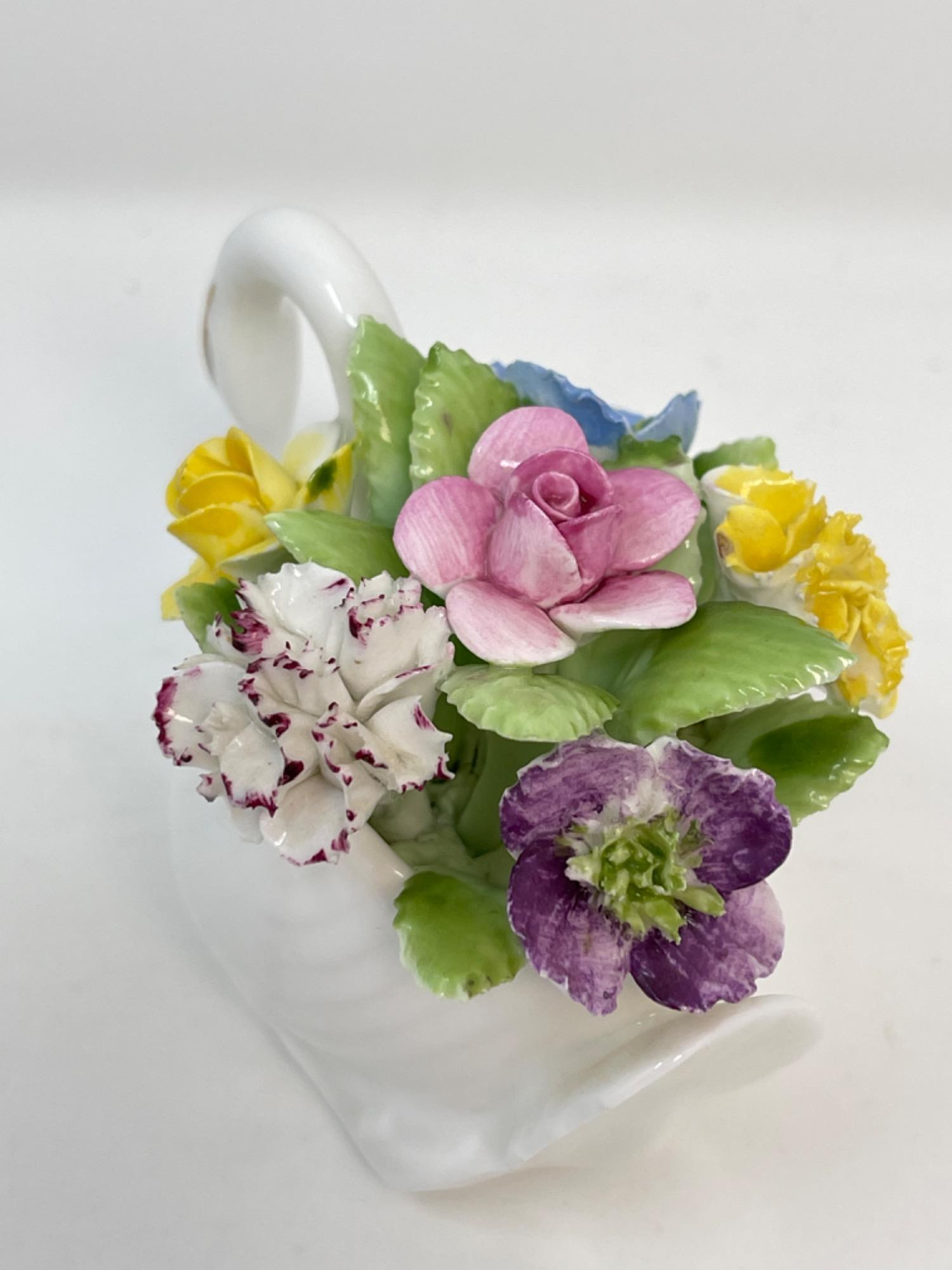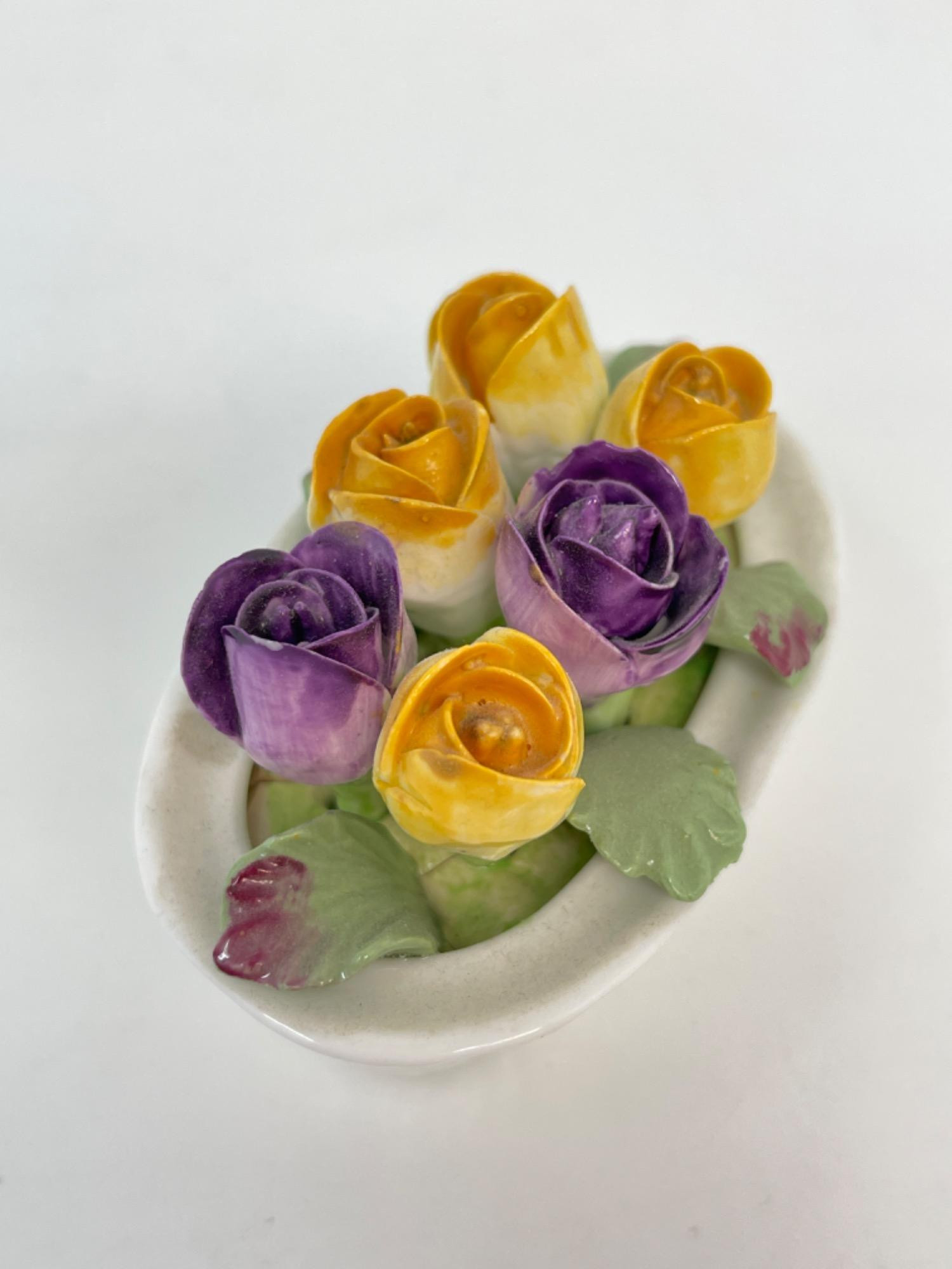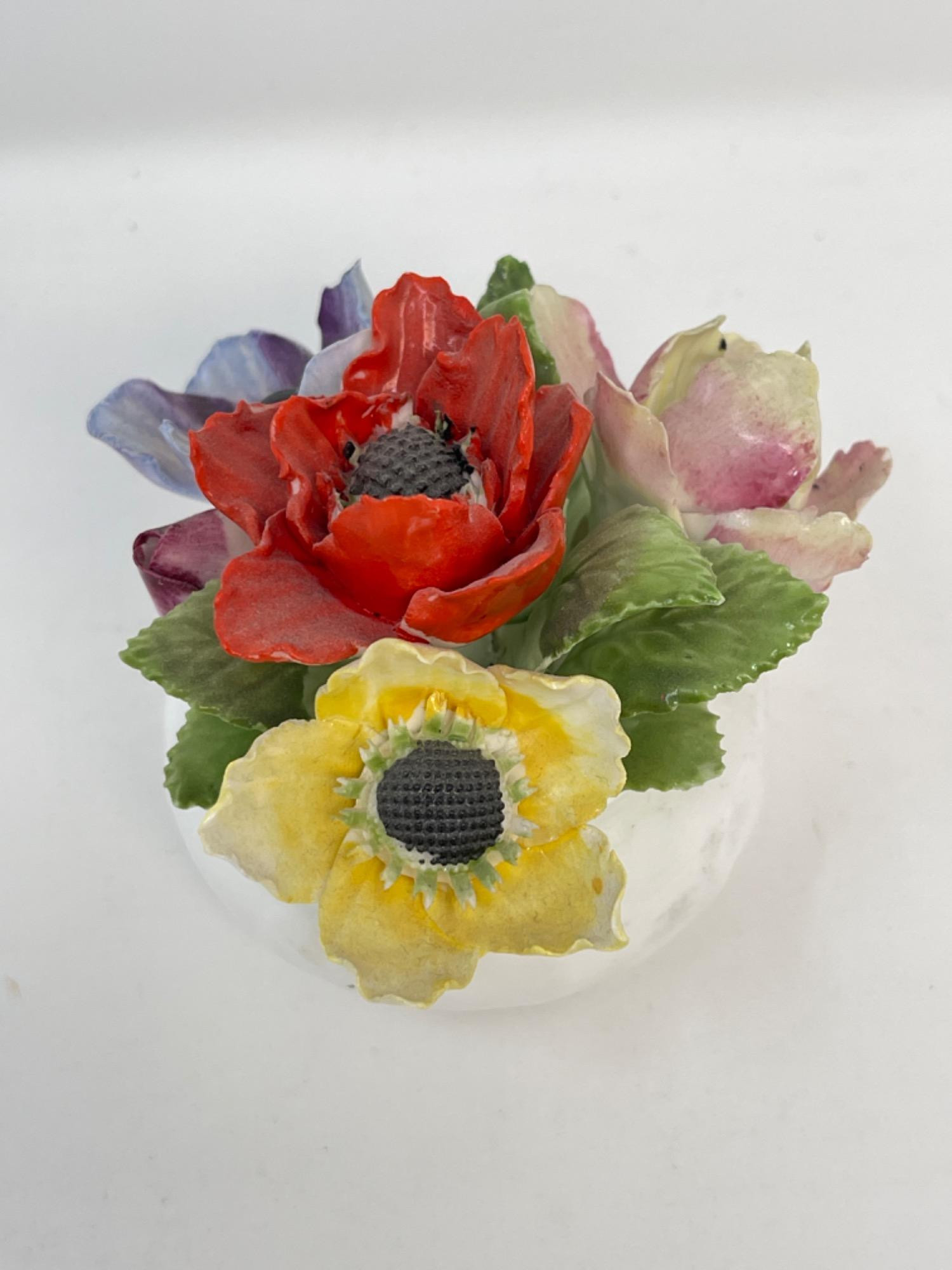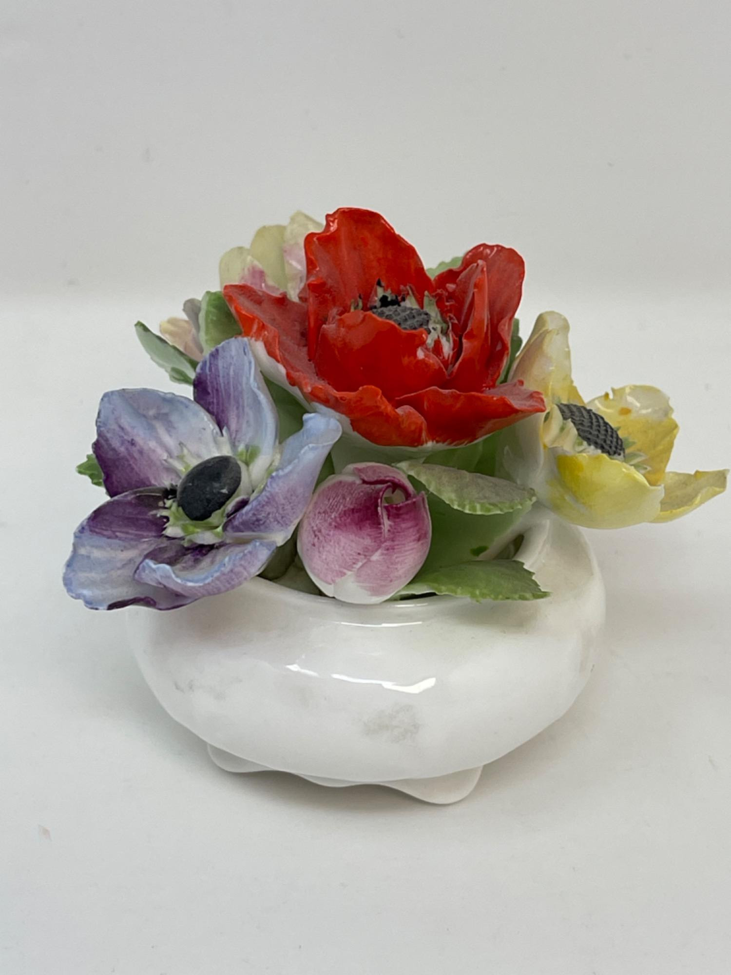 This exquisite collection of vintage hand-crafted porcelain floral arrangements includes pieces from renowned English makers Royal Adderley, Aynsley, and Coalport. Each delicate piece showcases the fine artistry and attention to detail that these brands are known for, featuring intricate flowers in vibrant hues, beautifully arranged in elegant white ceramic bases. Condition: - A few minor chips and staining. Good used condition. Tallest: 2.75” H