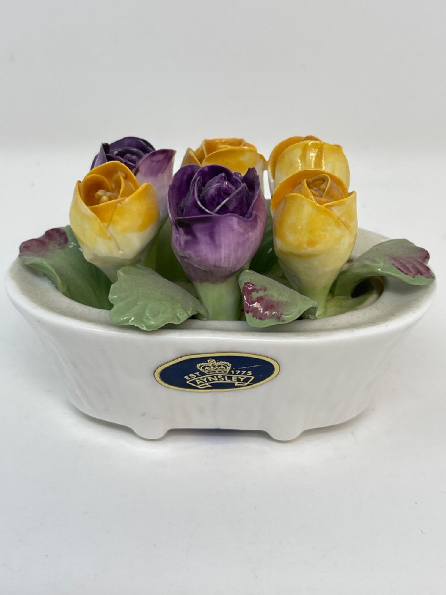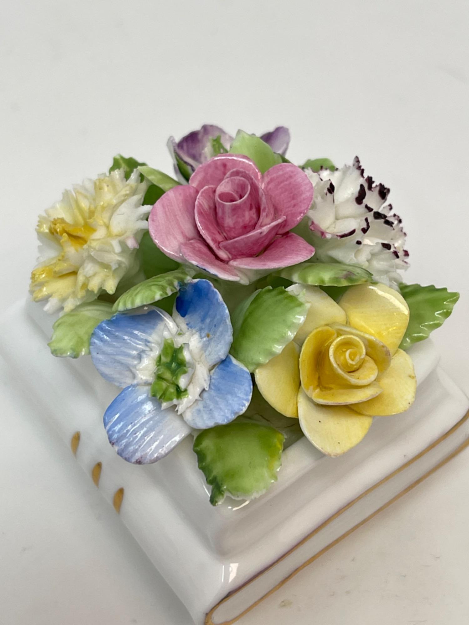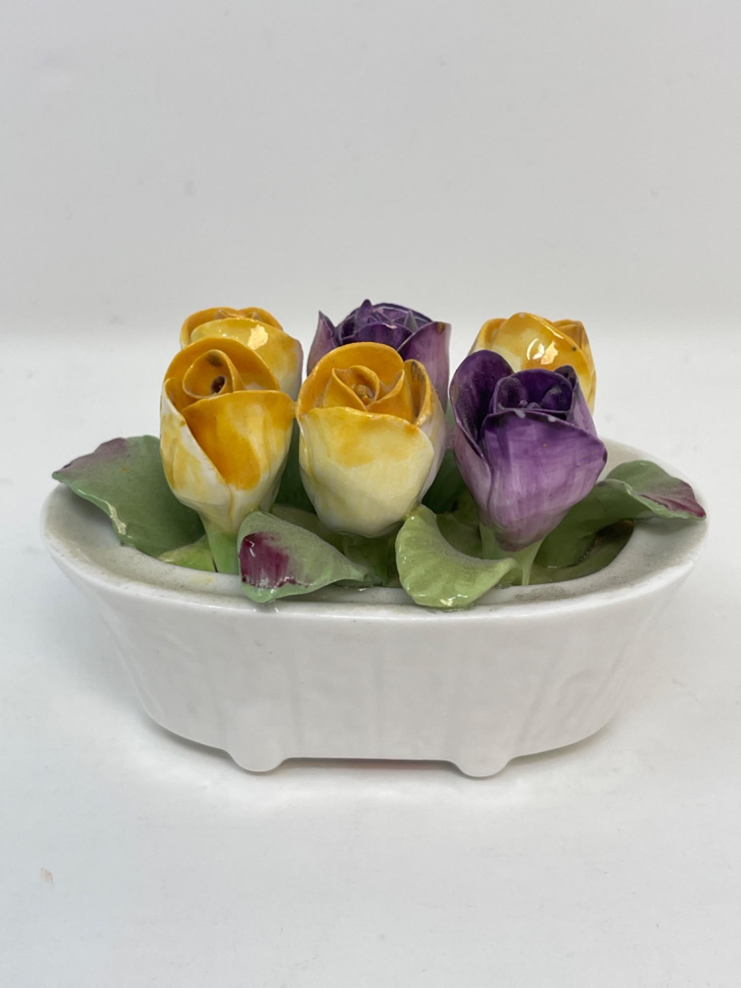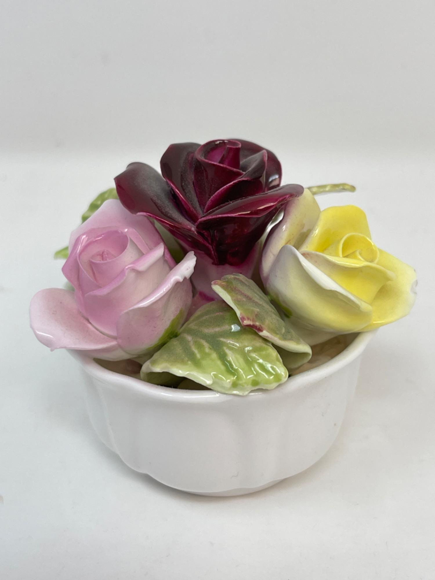 This exquisite collection of vintage hand-crafted porcelain floral arrangements includes pieces from renowned English makers Royal Adderley, Aynsley, and Coalport. Each delicate piece showcases the fine artistry and attention to detail that these brands are known for, featuring intricate flowers in vibrant hues, beautifully arranged in elegant white ceramic bases. Condition: - A few minor chips and staining. Good used condition. Tallest: 2.75” H