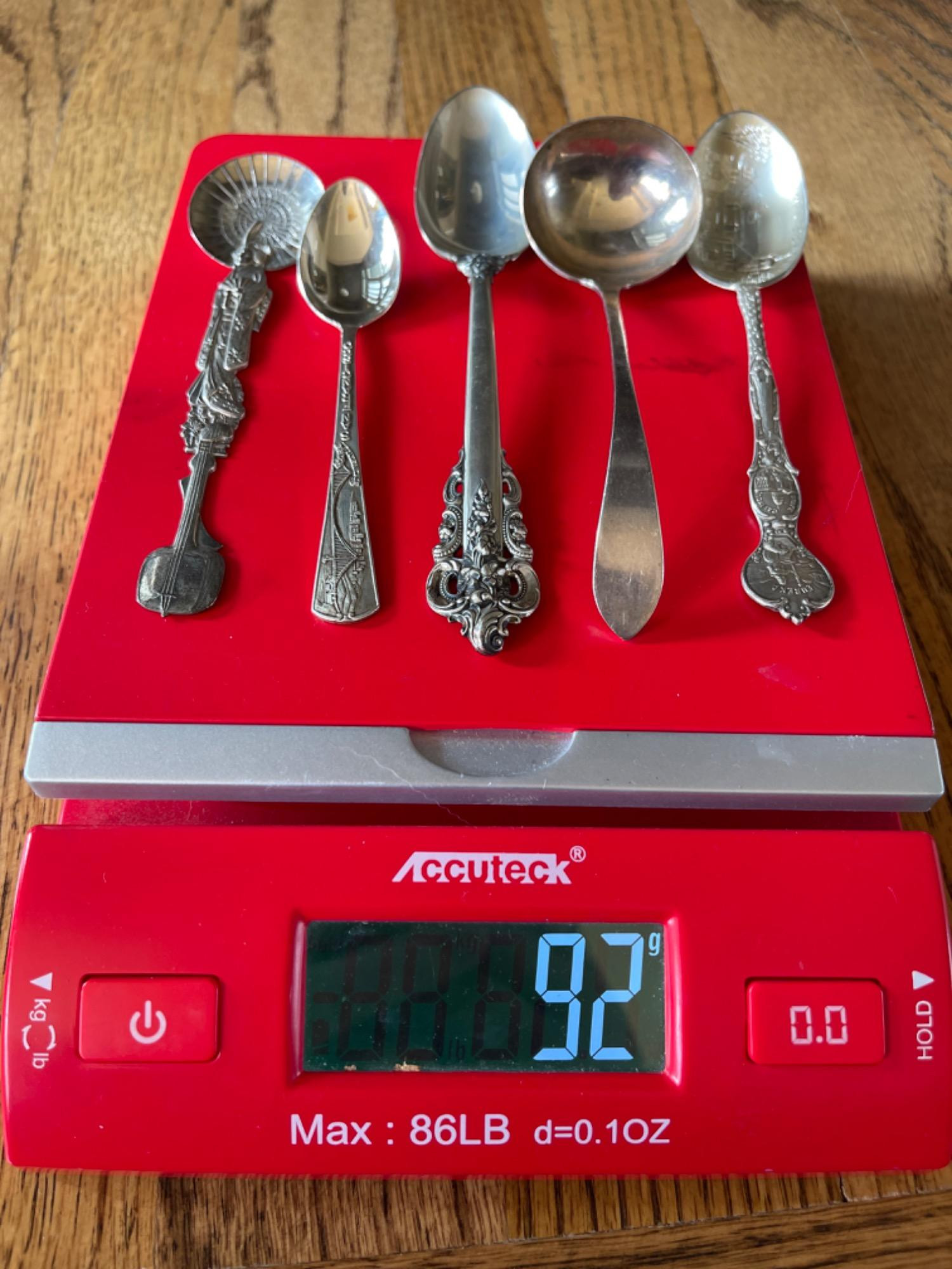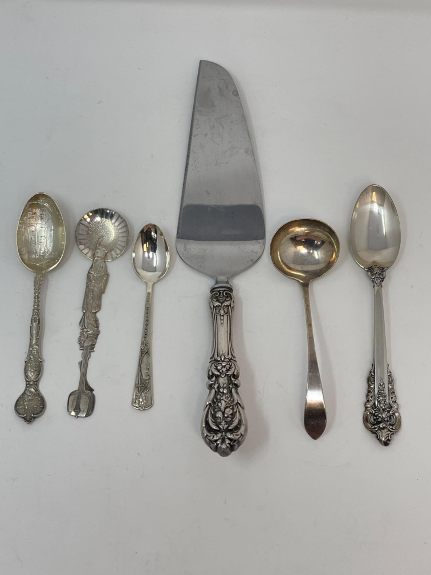 Vintage Sterling Silver Flatware & Serving Assortment This vintage sterling silver assortment features an elegant mix of collectible spoons and serving utensils, showcasing intricate craftsmanship and timeless appeal. The collection includes five fully sterling silver pieces and one sterling-handled serving spatula, each with unique designs that make them perfect for display, use, or as an addition to any silver collection. Condition: All have staining and tarnishing. Please see photos. Spoons Collective Weight: 92g Serving Spatula (Sterling Handle ONLY): 106g