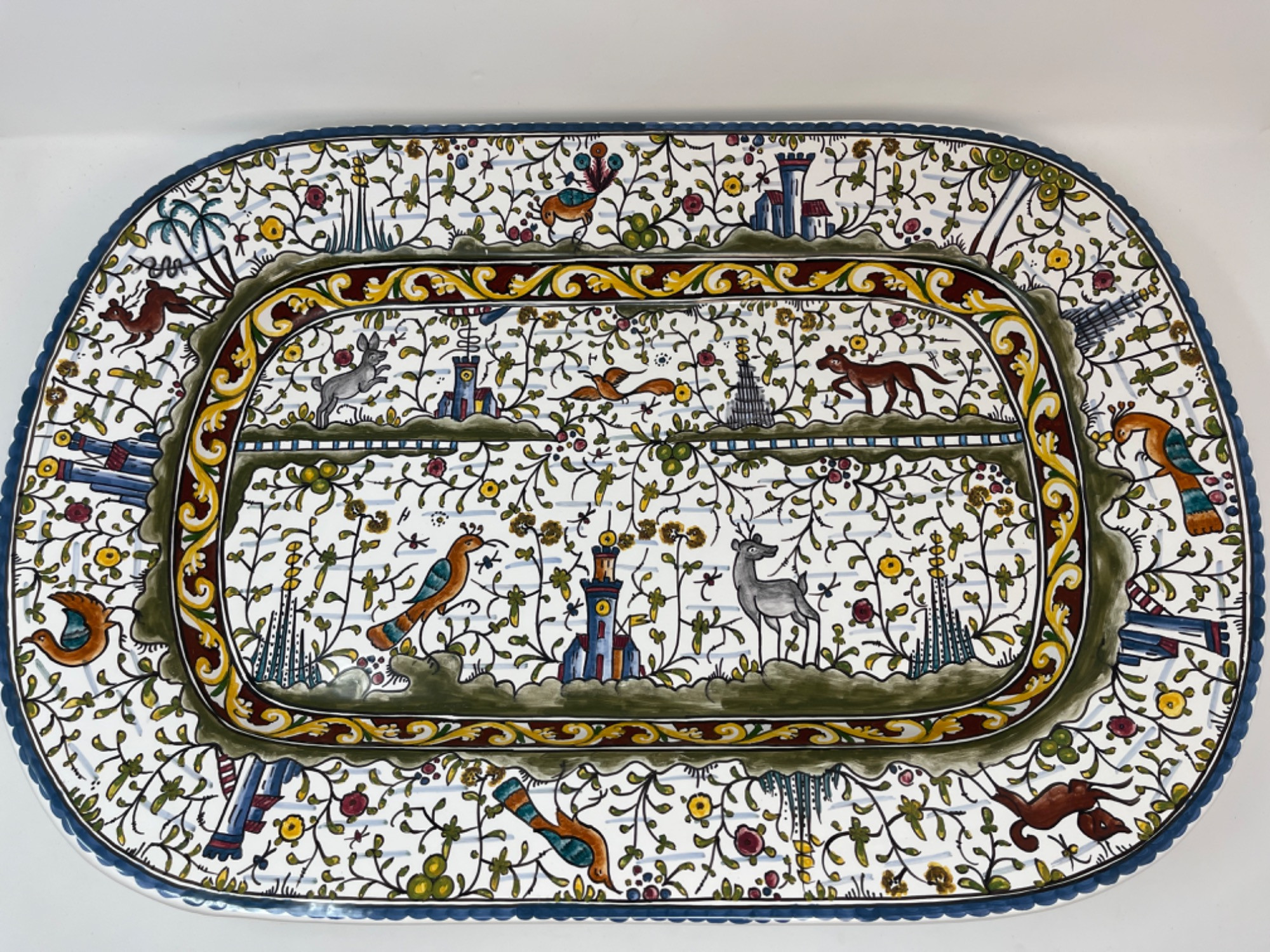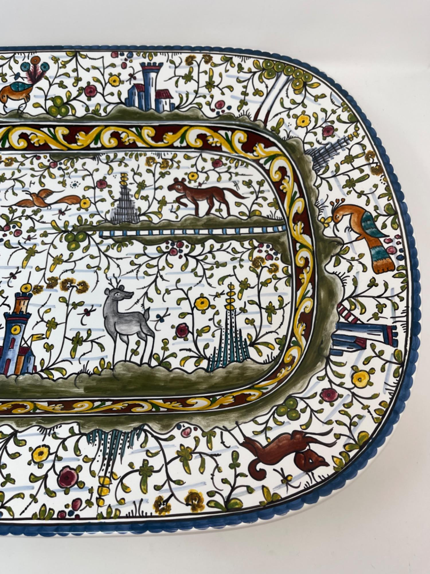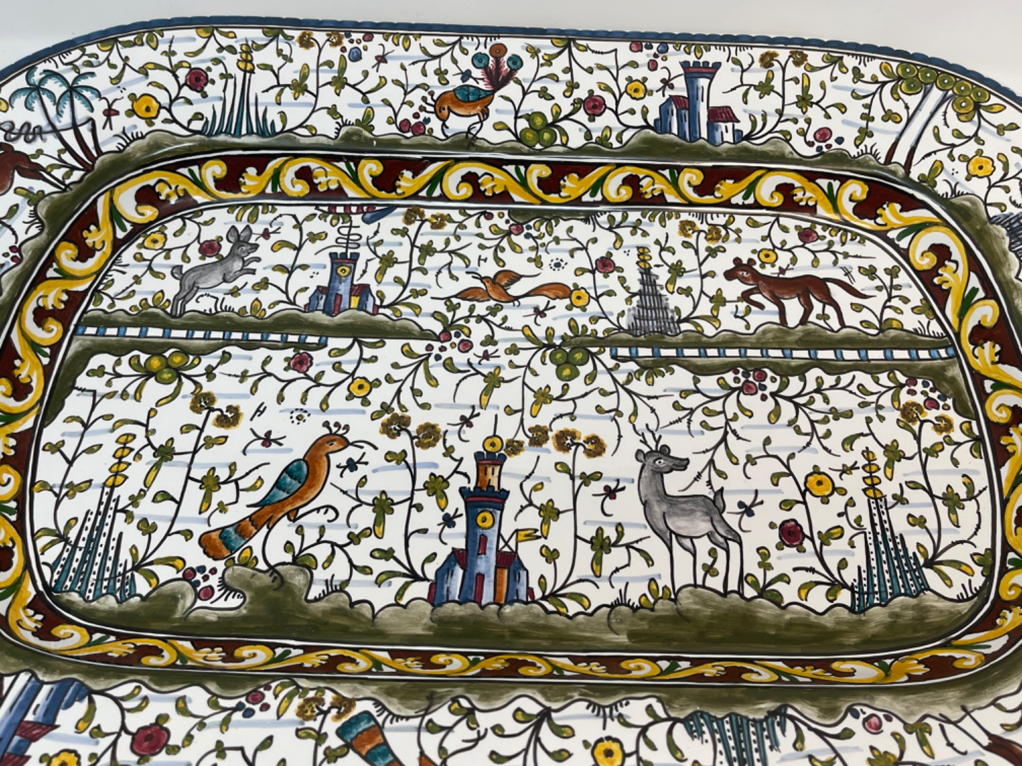 This stunning hand-painted ceramic platter is a beautifully detailed piece from Estrela de Conimbriga, made in Portugal exclusively for Williams Sonoma. Inspired by traditional 17th-century Portuguese ceramics (Sec. XVII), this exquisite serving platter features an intricate floral and wildlife motif, depicting birds, deer, rabbits, castles, and lush greenery in vibrant colors. The detailed border showcases elegant scrollwork, enhancing its old-world charm.