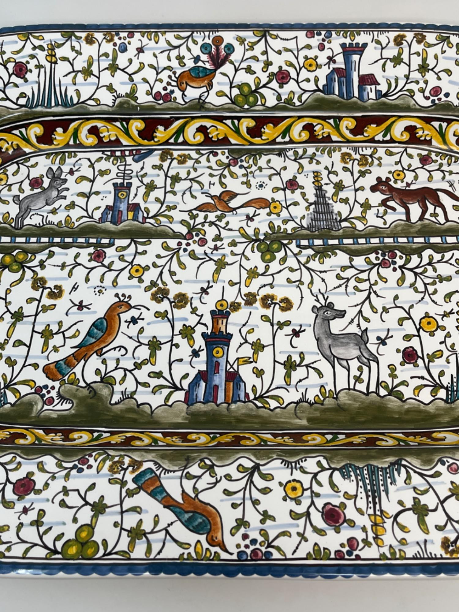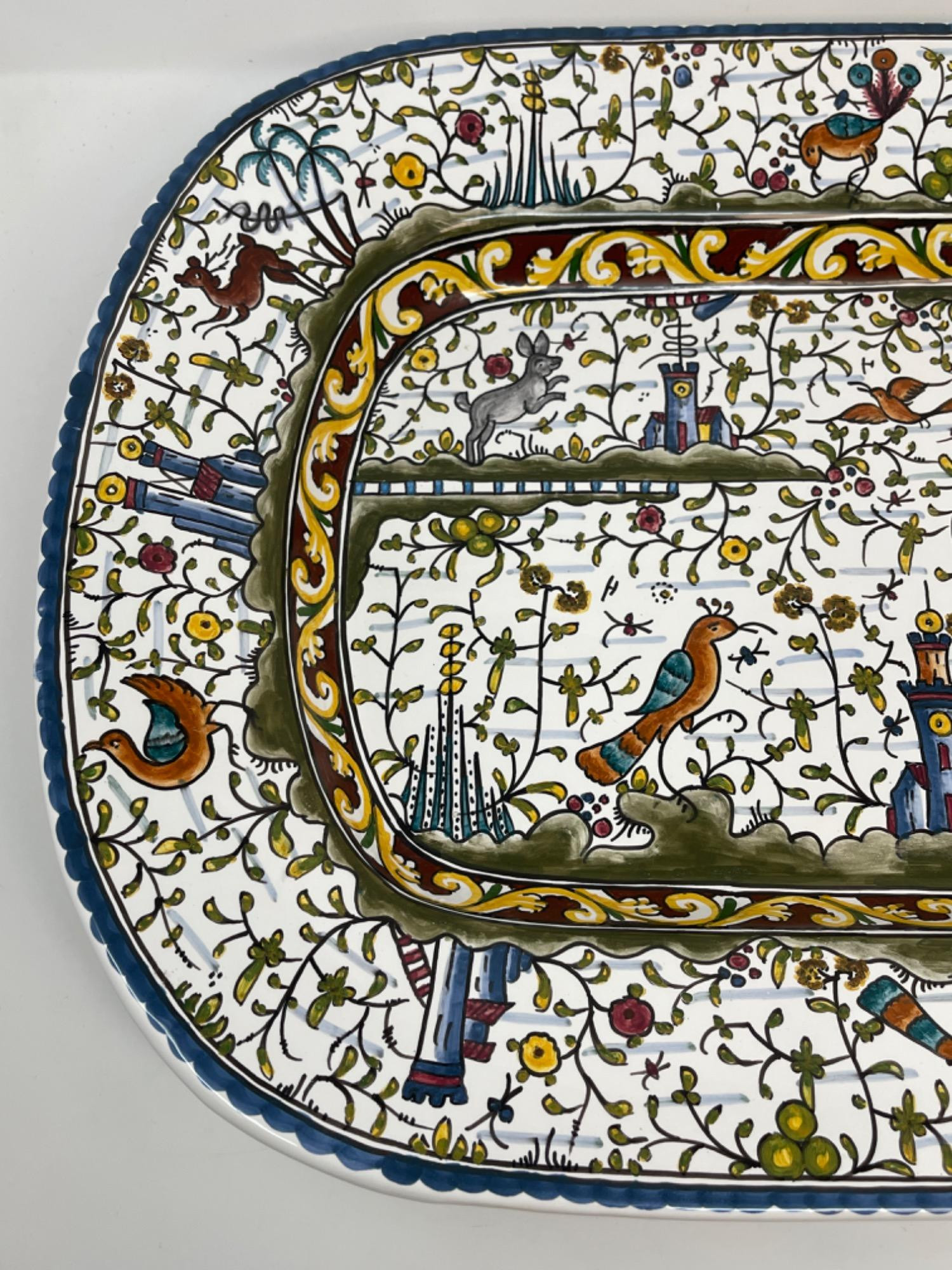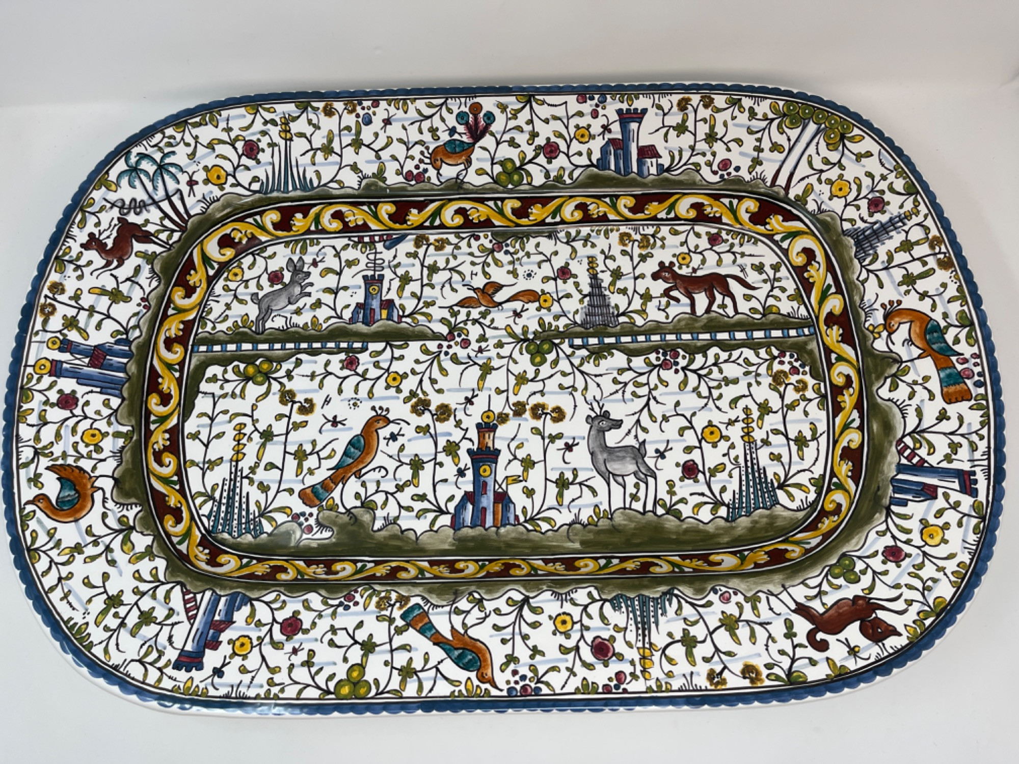 This stunning hand-painted ceramic platter is a beautifully detailed piece from Estrela de Conimbriga, made in Portugal exclusively for Williams Sonoma. Inspired by traditional 17th-century Portuguese ceramics (Sec. XVII), this exquisite serving platter features an intricate floral and wildlife motif, depicting birds, deer, rabbits, castles, and lush greenery in vibrant colors. The detailed border showcases elegant scrollwork, enhancing its old-world charm.