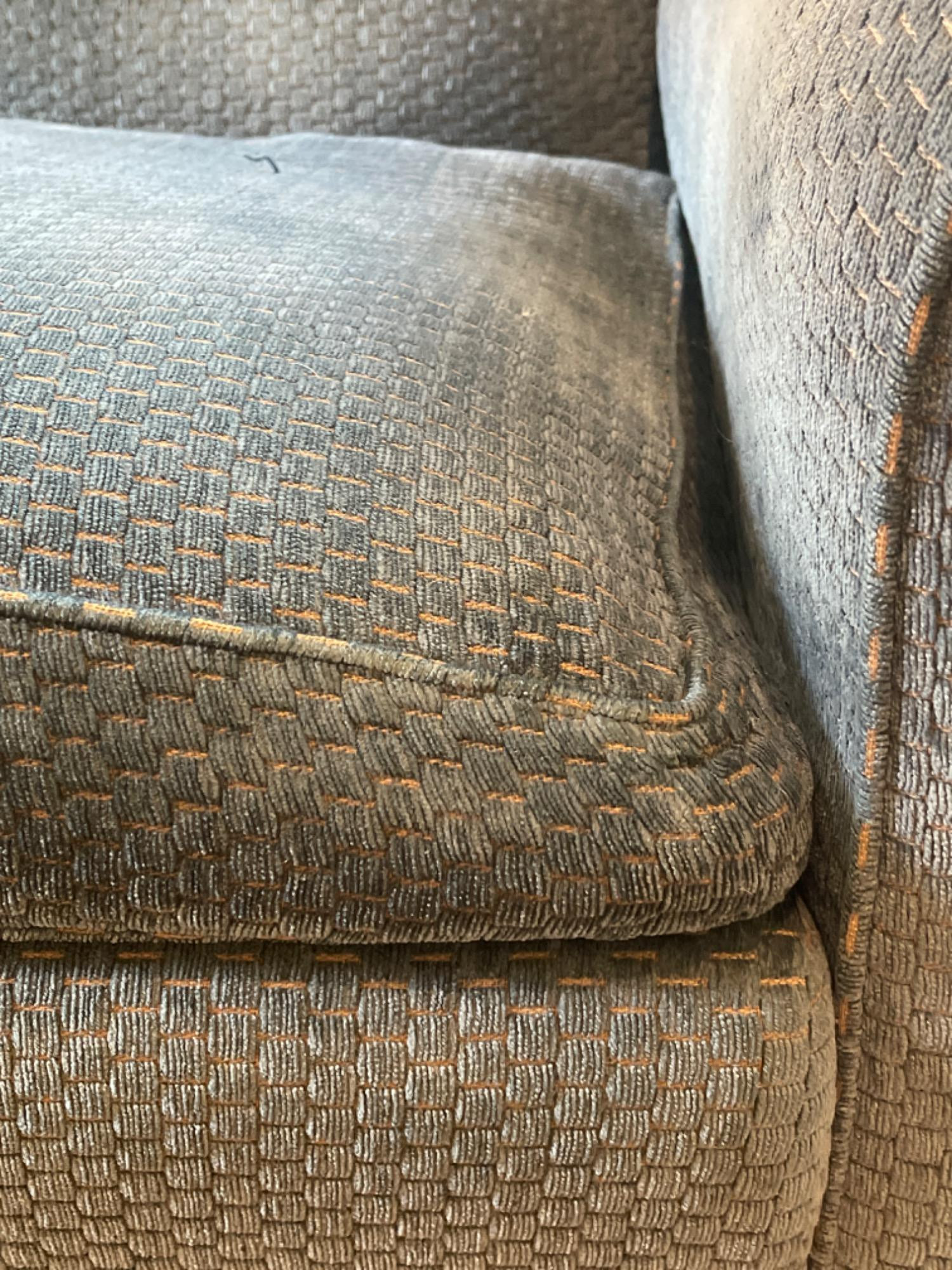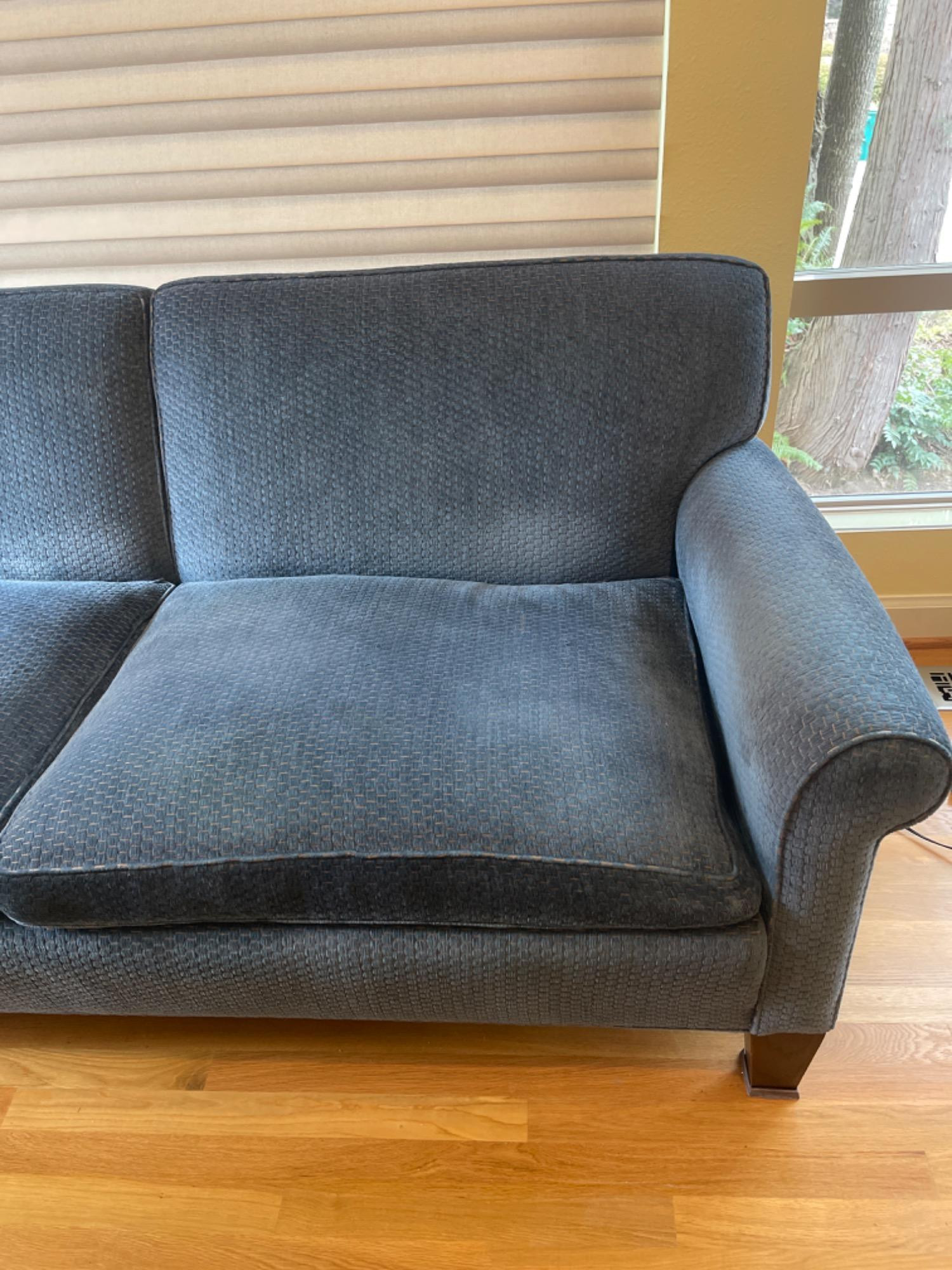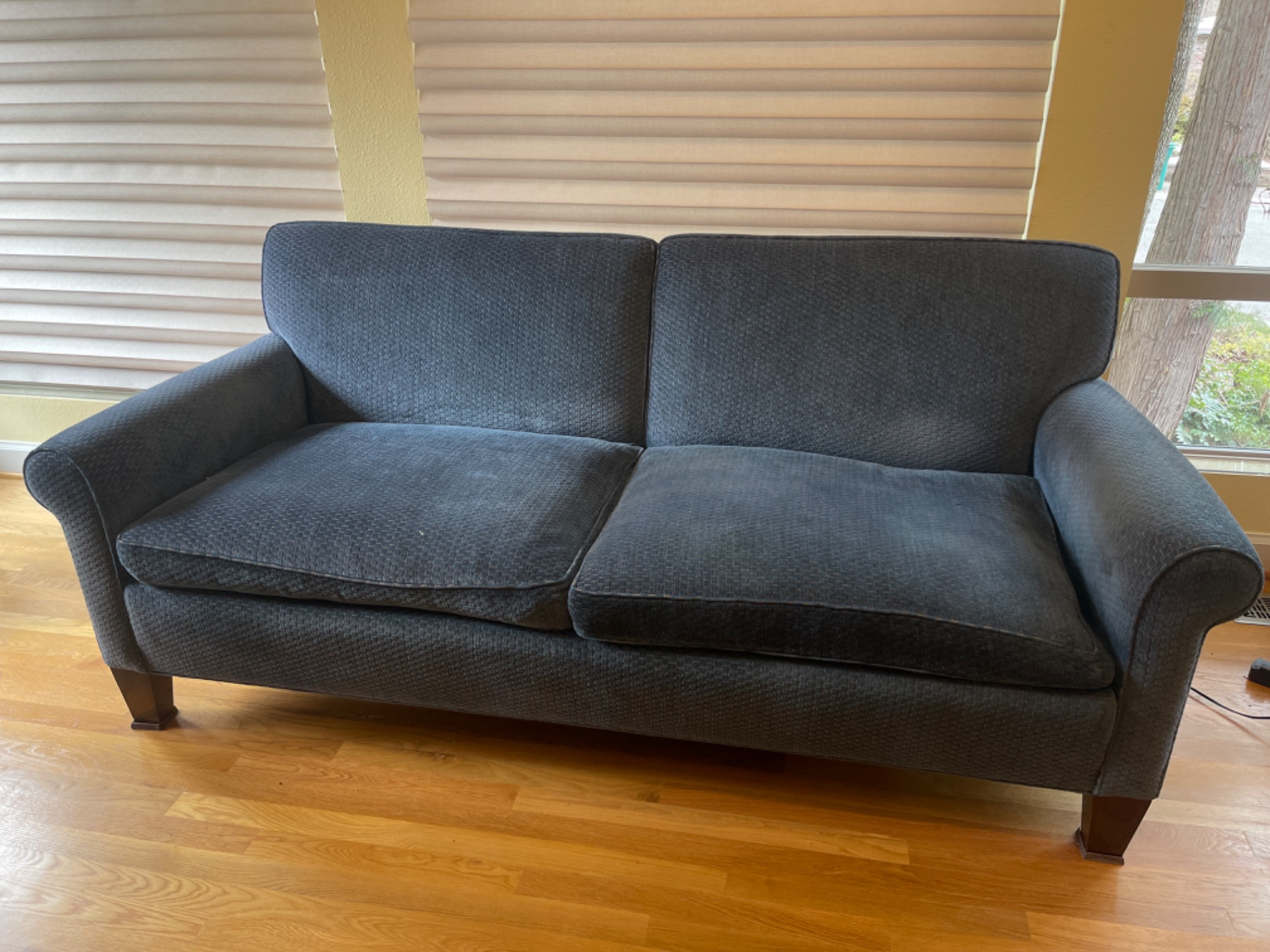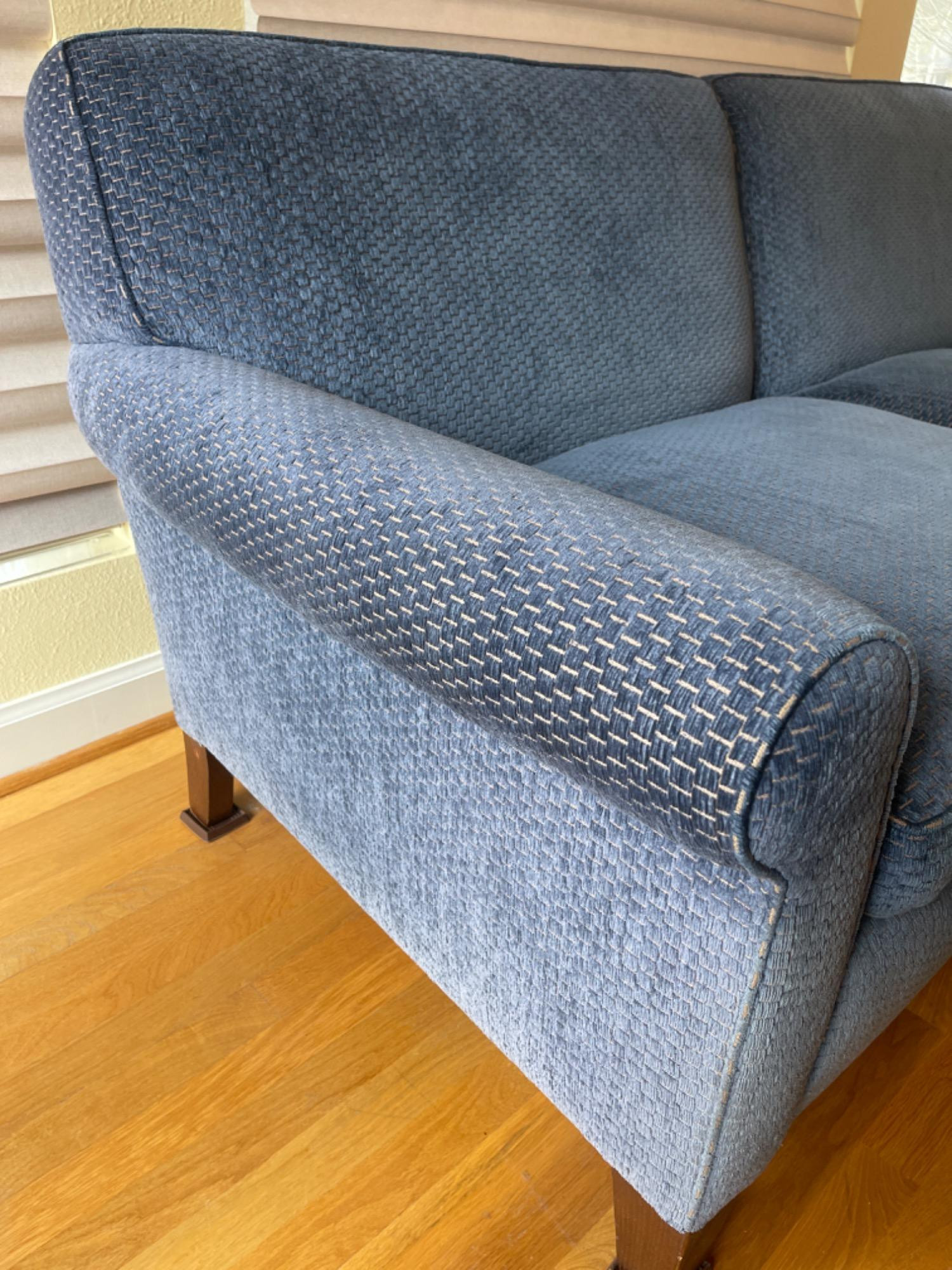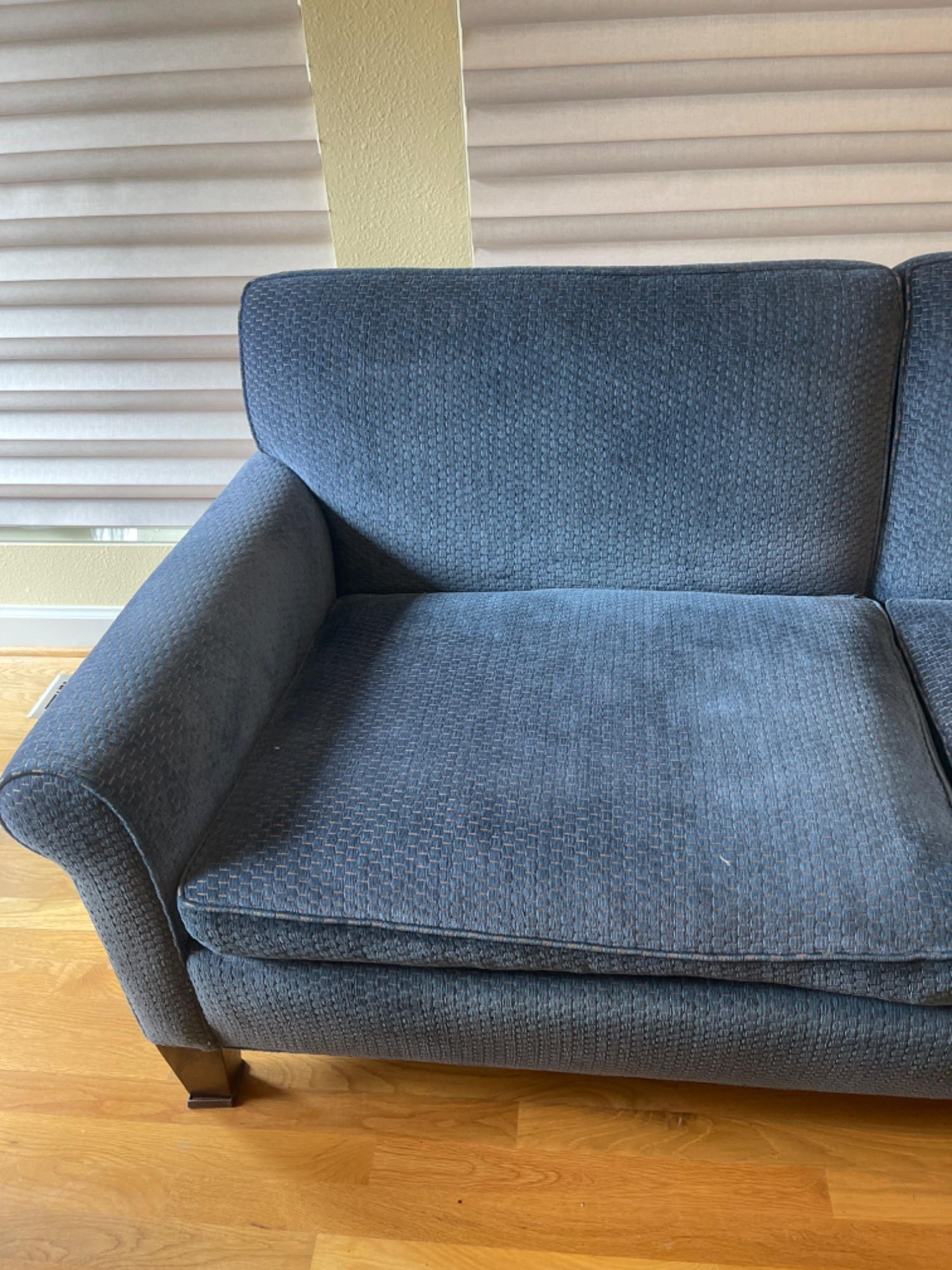 Classic Dark Blue Upholstered Sofa – Comfortable & Stylish Upgrade your living space with this classic dark blue upholstered sofa, featuring a woven textured fabric with subtle contrast stitching. Designed for both style and comfort, this two-seat sofa offers plush, removable seat and back cushions, gently rolled arms, and sturdy wooden legs for timeless appeal Condition: Pre-owned with some visible wear, including minor fabric wear and slight cushion indentations (see photos for details)