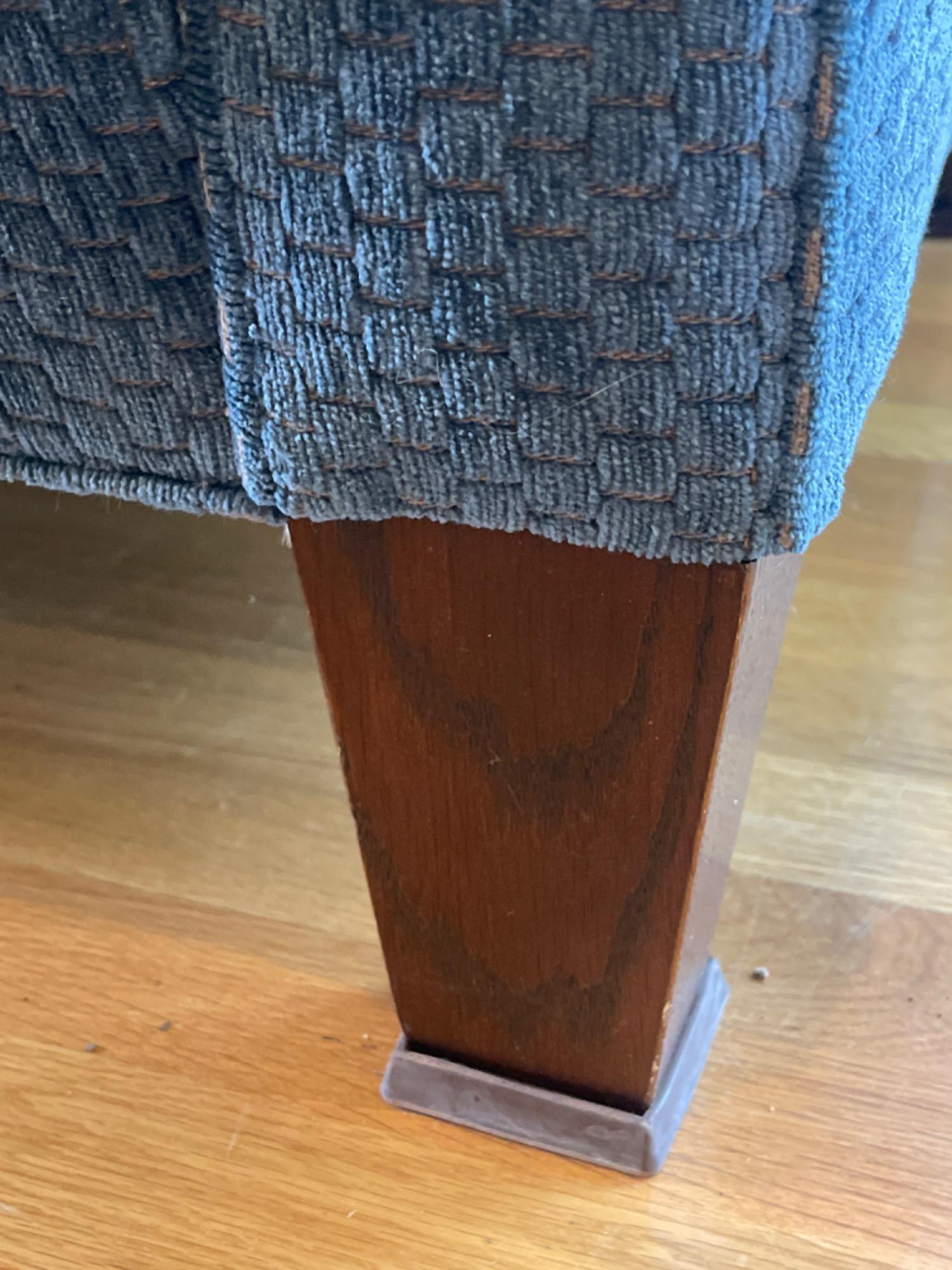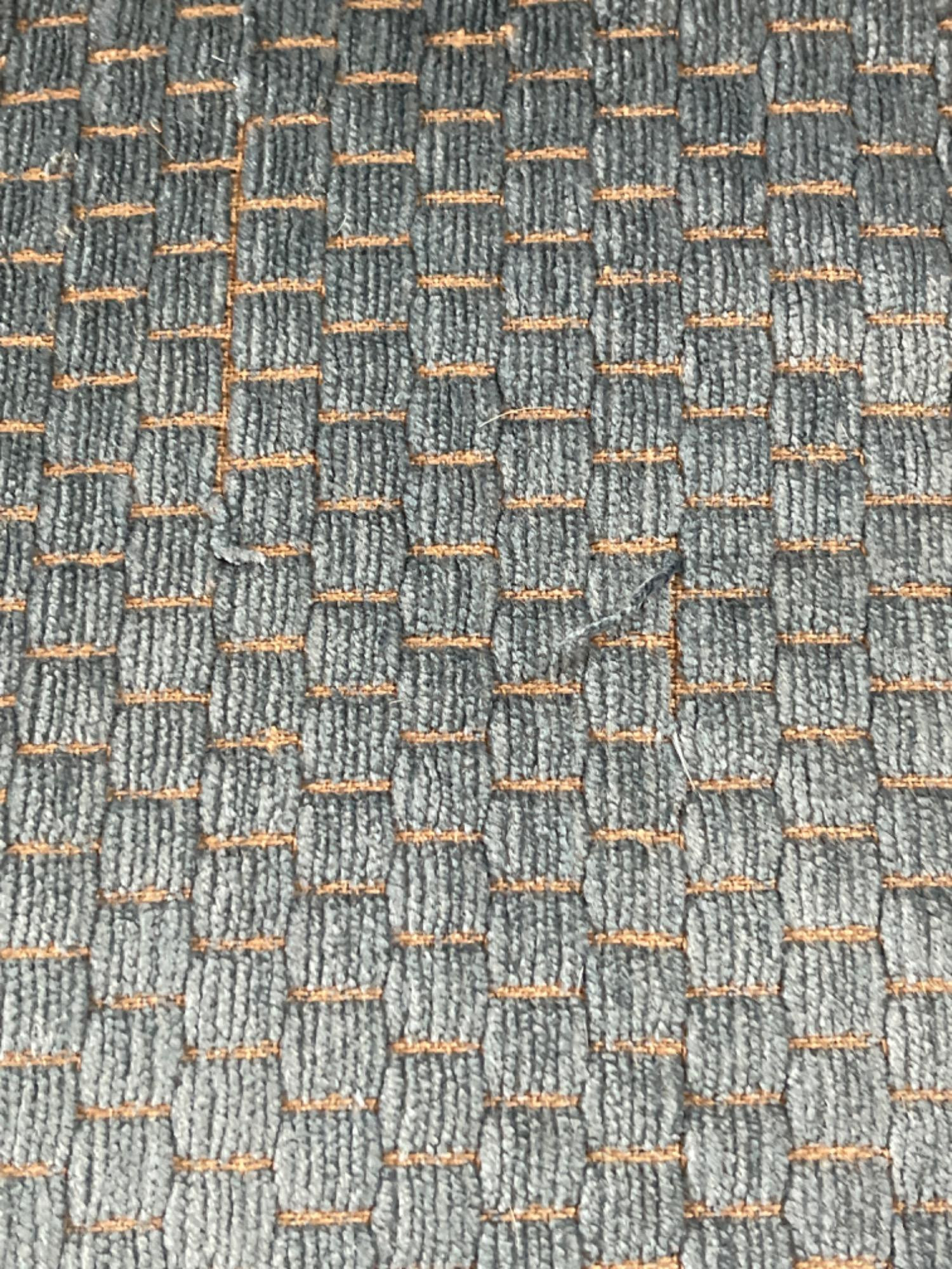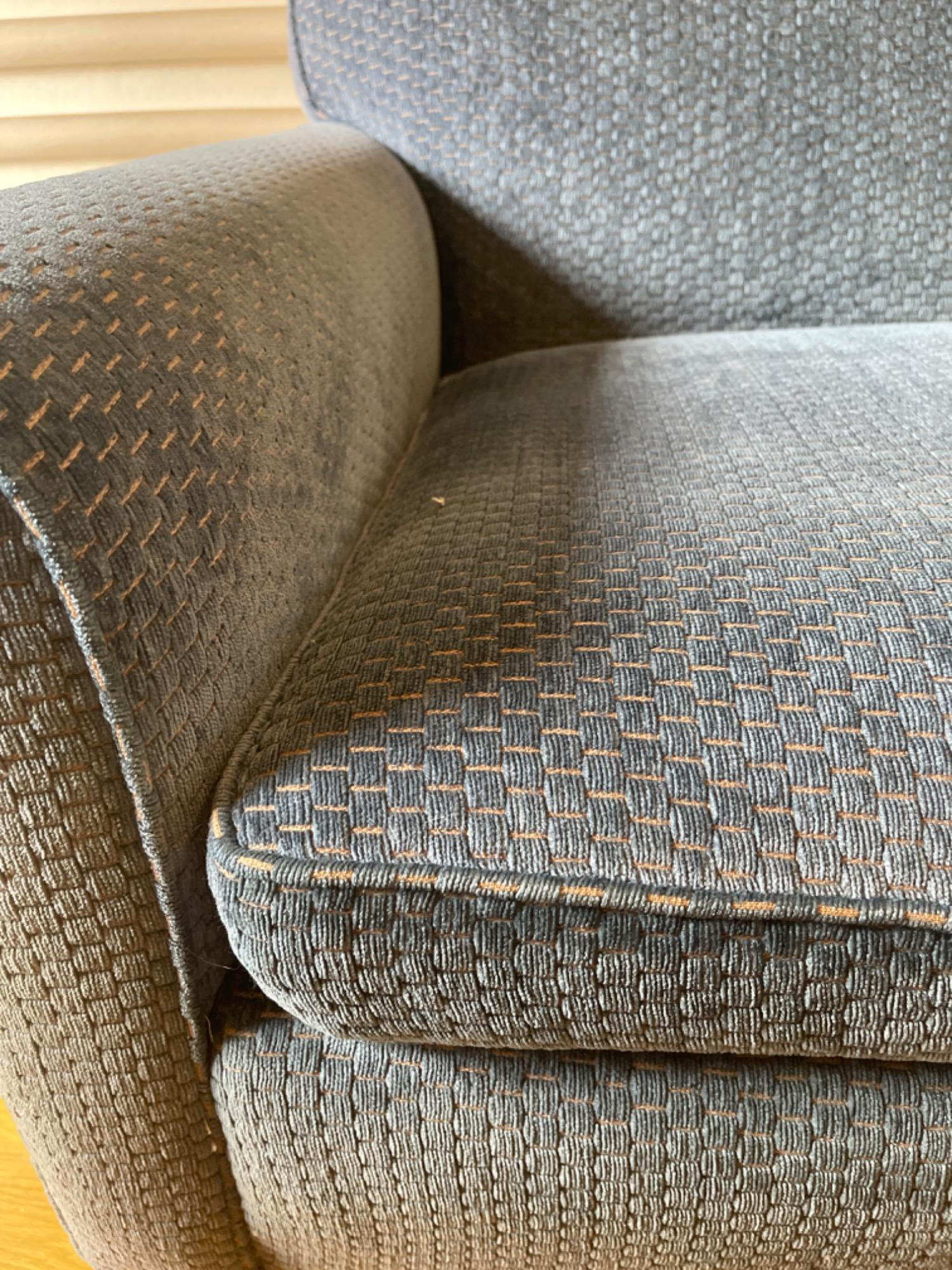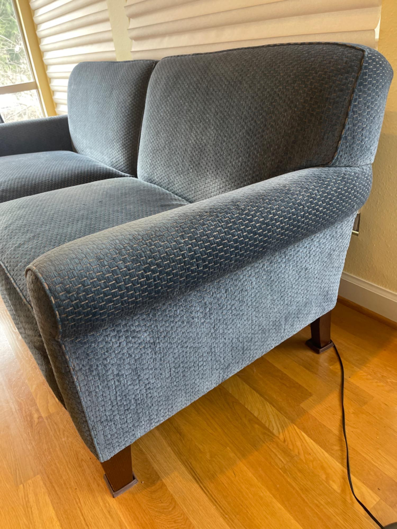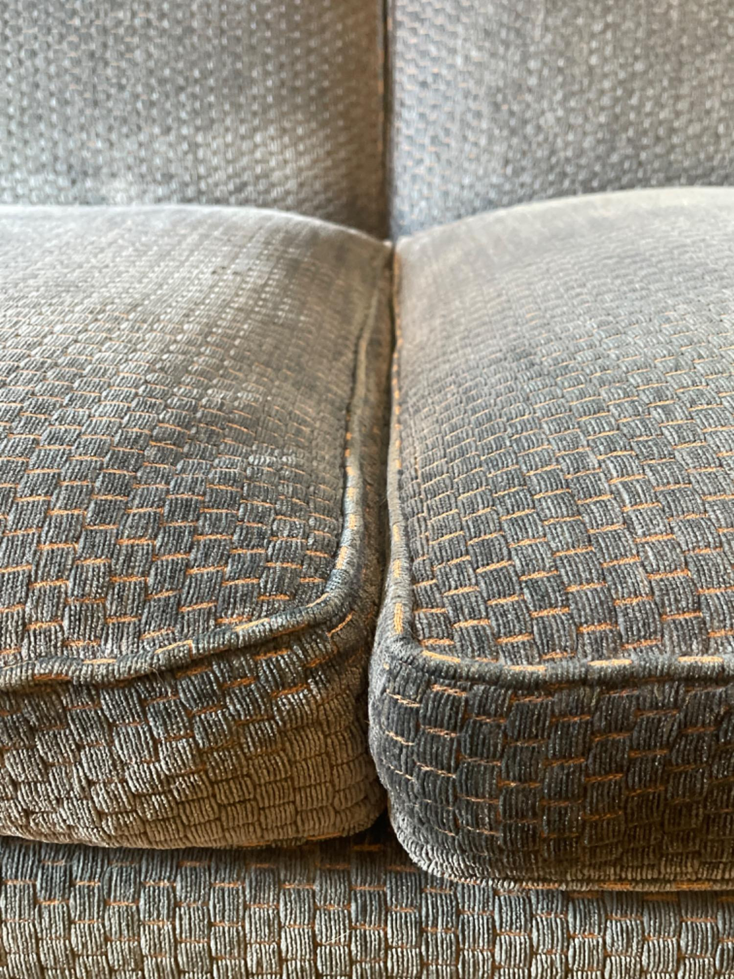 Classic Dark Blue Upholstered Sofa – Comfortable & Stylish Upgrade your living space with this classic dark blue upholstered sofa, featuring a woven textured fabric with subtle contrast stitching. Designed for both style and comfort, this two-seat sofa offers plush, removable seat and back cushions, gently rolled arms, and sturdy wooden legs for timeless appeal Condition: Pre-owned with some visible wear, including minor fabric wear and slight cushion indentations (see photos for details)