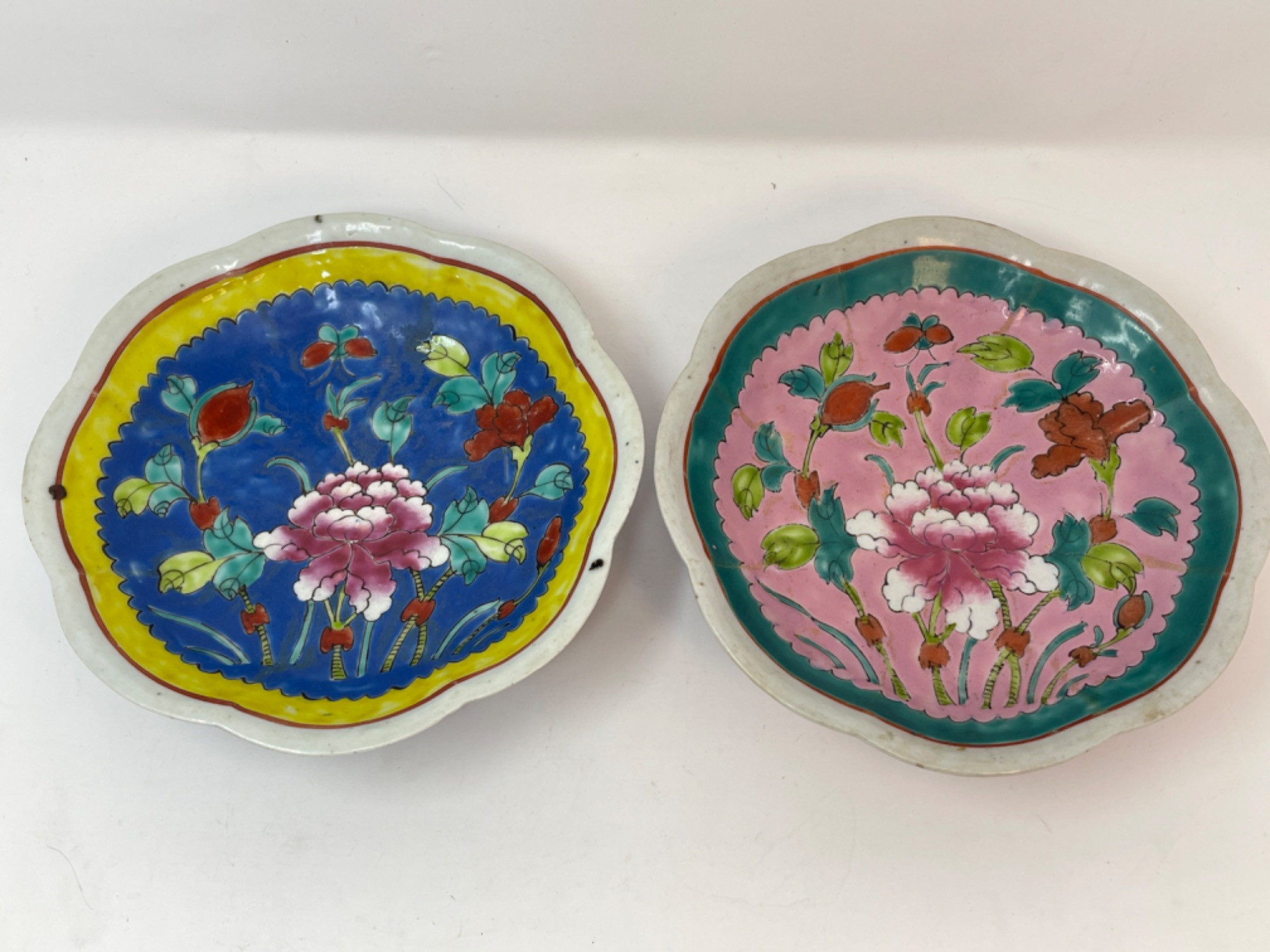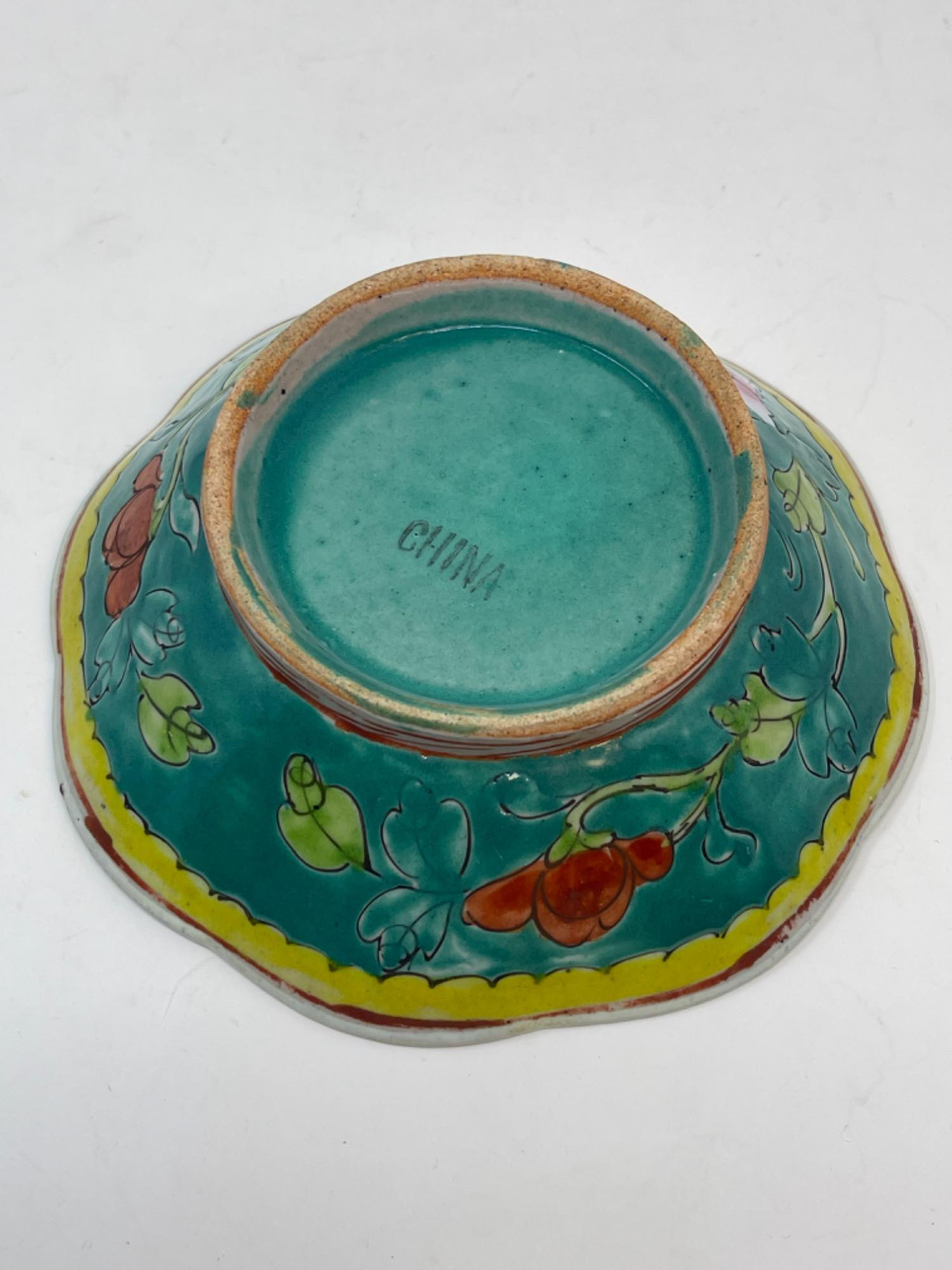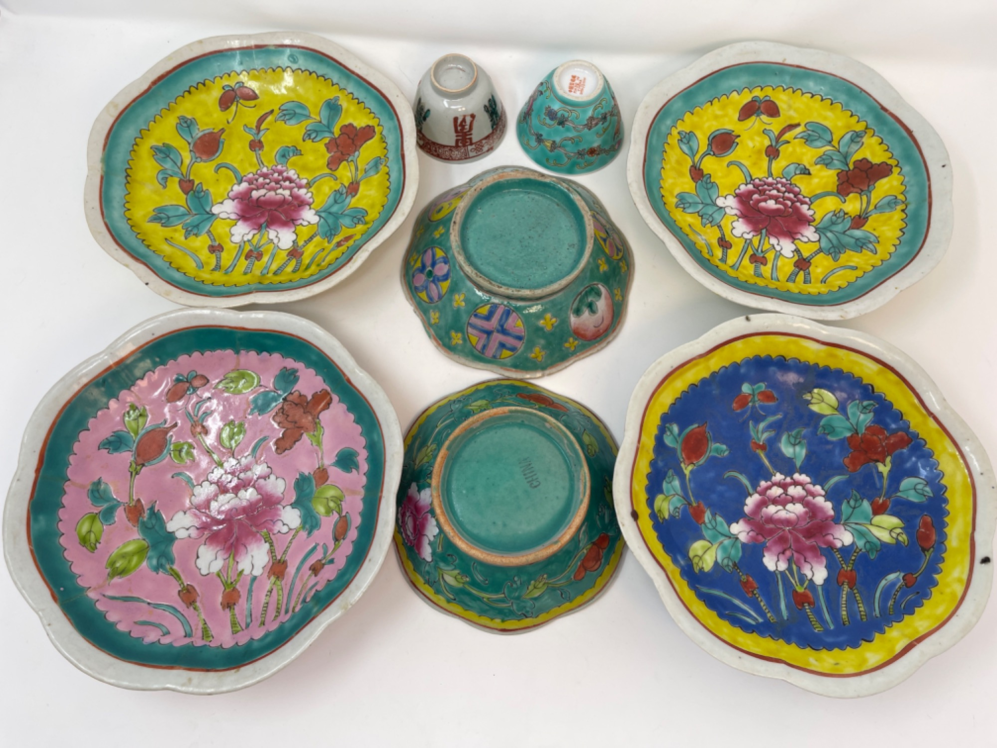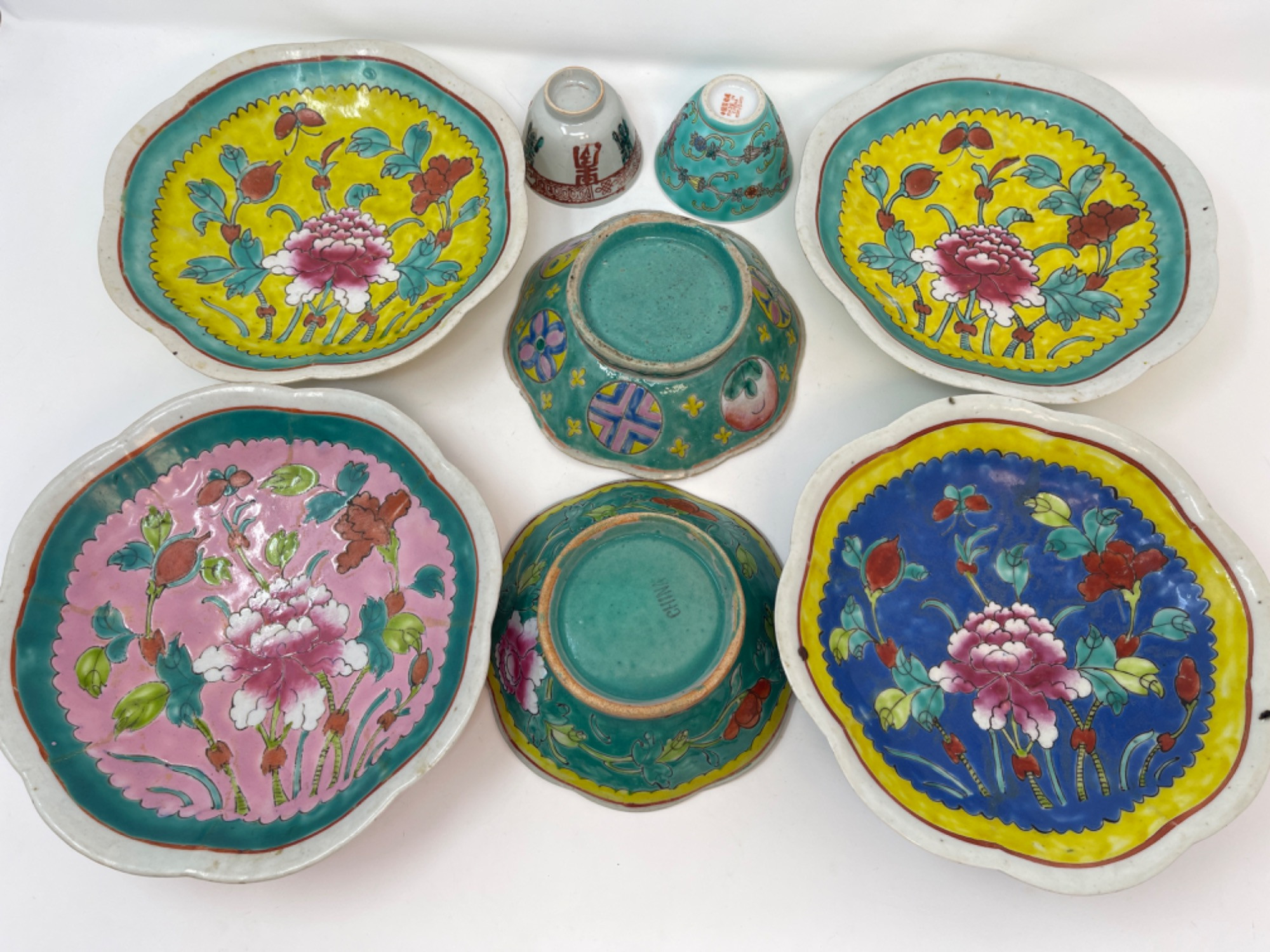 This vibrant assortment of vintage Chinese enameled porcelain bowls showcases intricate hand-painted floral motifs in bold, vivid colors. Each piece features a scalloped edge design with intricate detailing, combining hues of yellow, pink, blue, and green. Condition: All pieces have some staining and scratches. A couple have a few small chips (please see photos for details) Large Bowls: 8.25" W x 2" H Small Bowls: 6" W x 1.75" H Small Cups: 2” H