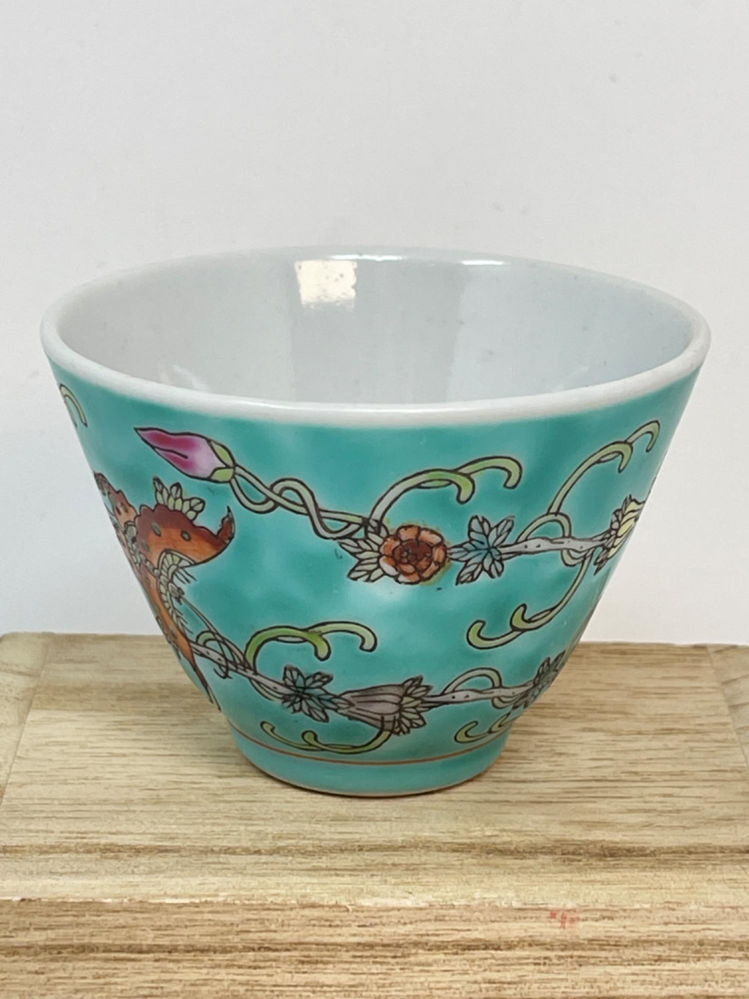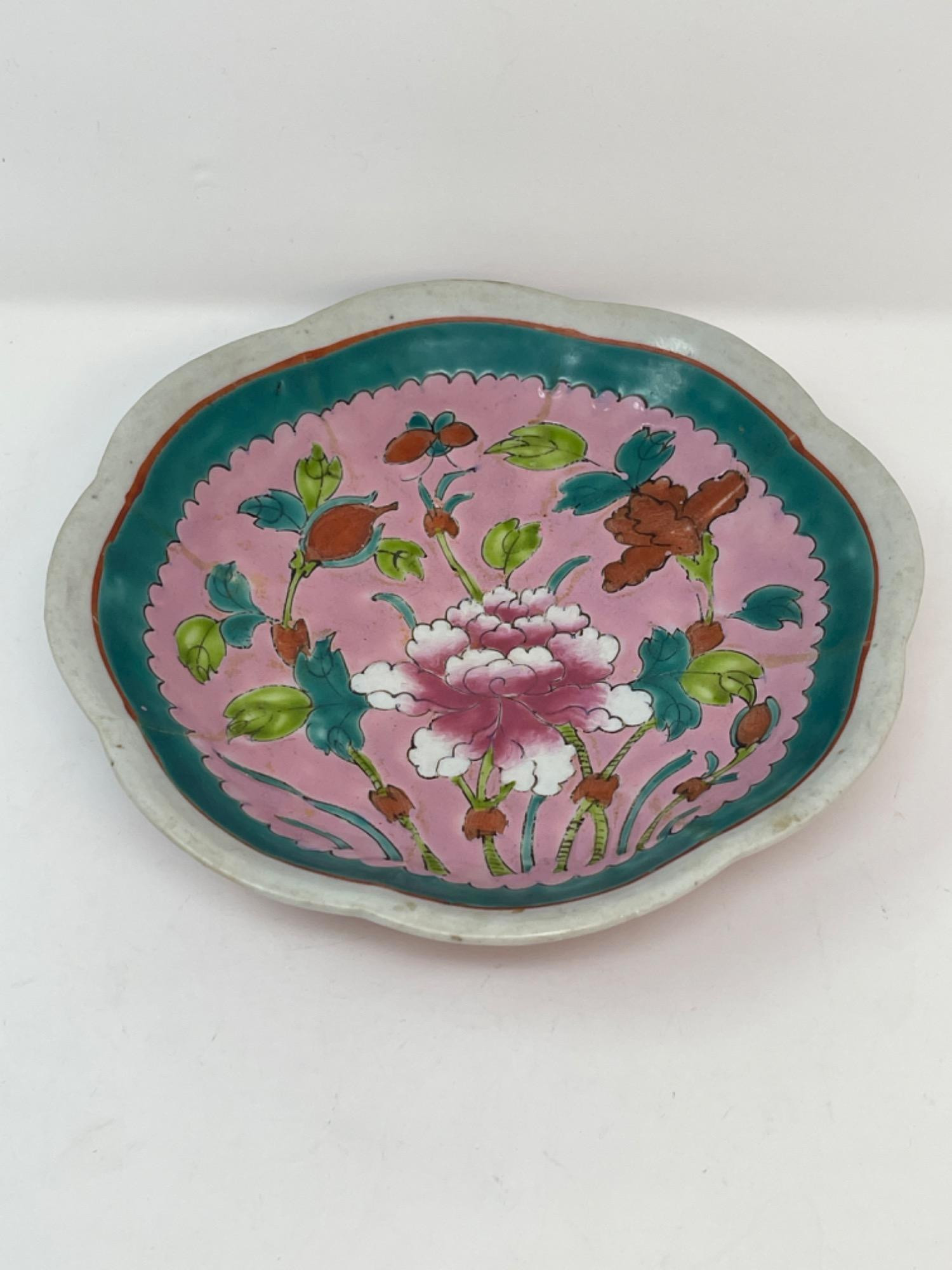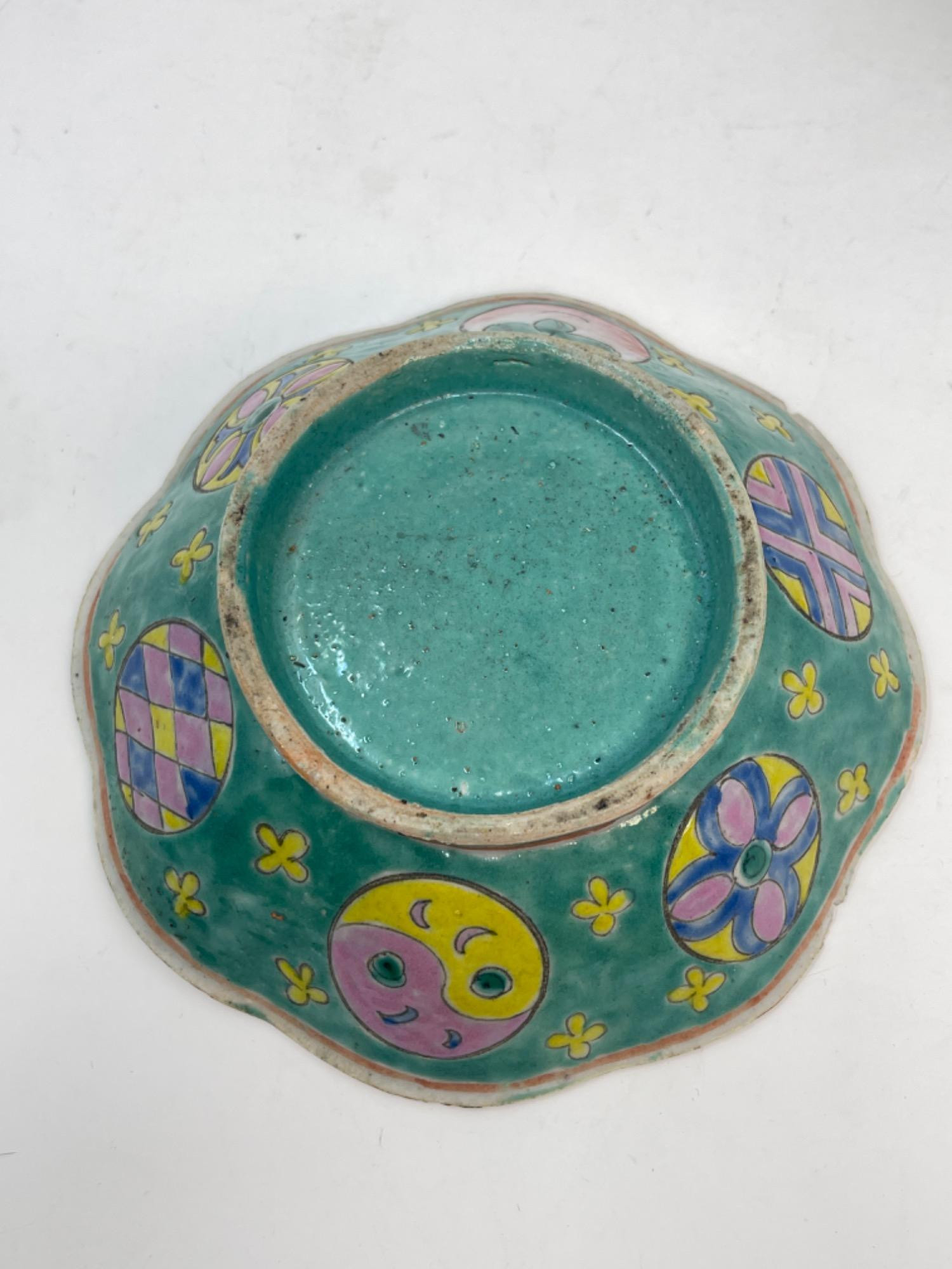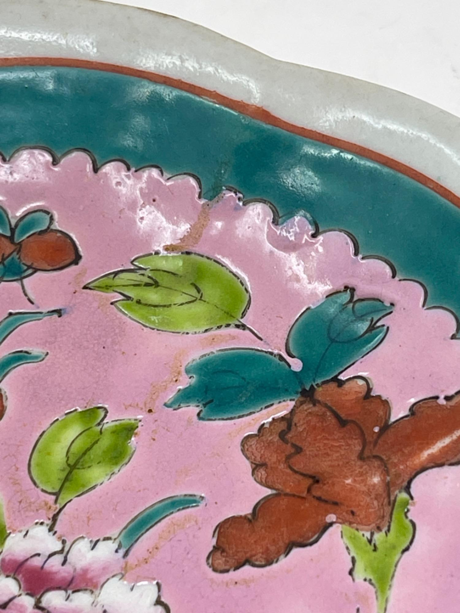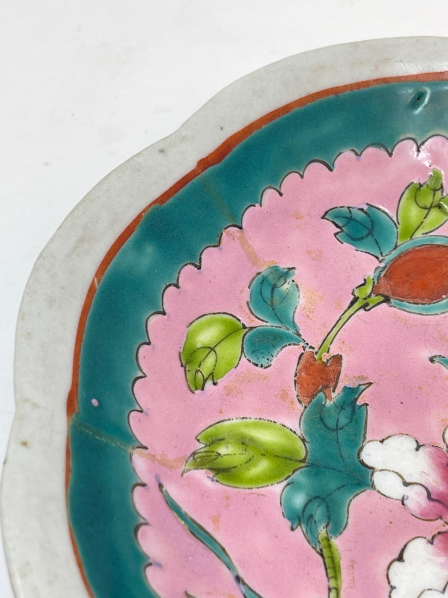 This vibrant assortment of vintage Chinese enameled porcelain bowls showcases intricate hand-painted floral motifs in bold, vivid colors. Each piece features a scalloped edge design with intricate detailing, combining hues of yellow, pink, blue, and green. Condition: All pieces have some staining and scratches. A couple have a few small chips (please see photos for details) Large Bowls: 8.25" W x 2" H Small Bowls: 6" W x 1.75" H Small Cups: 2” H