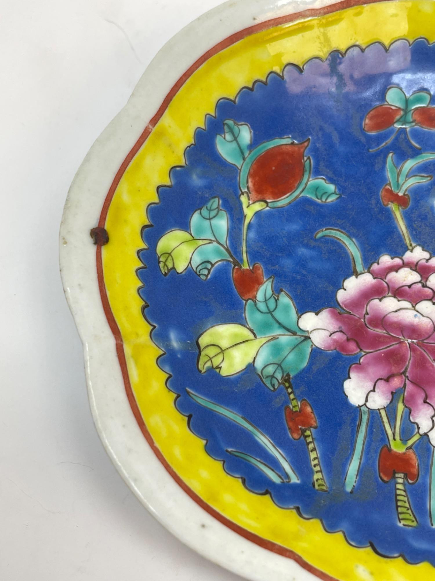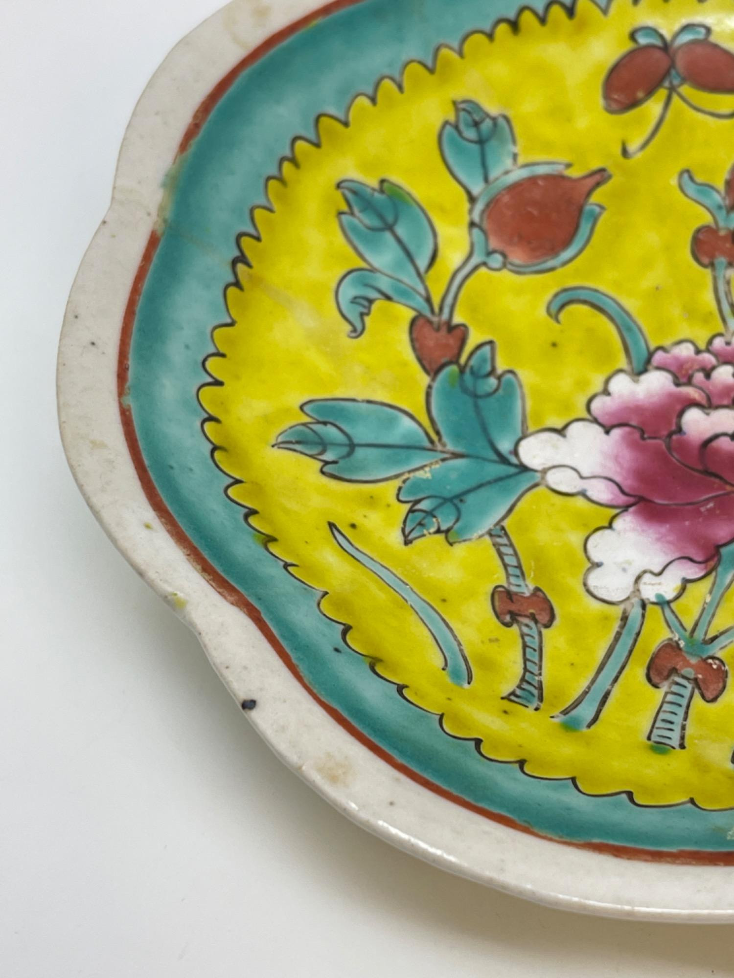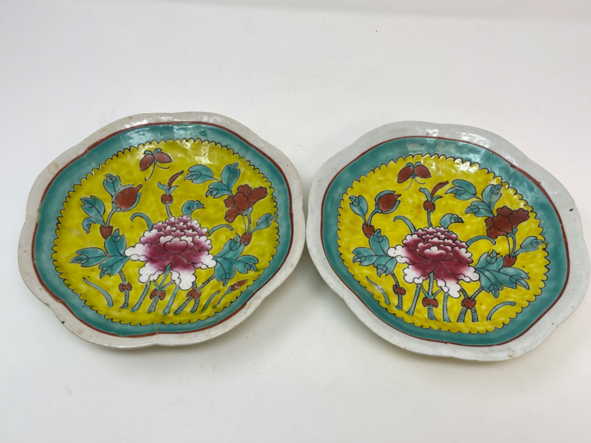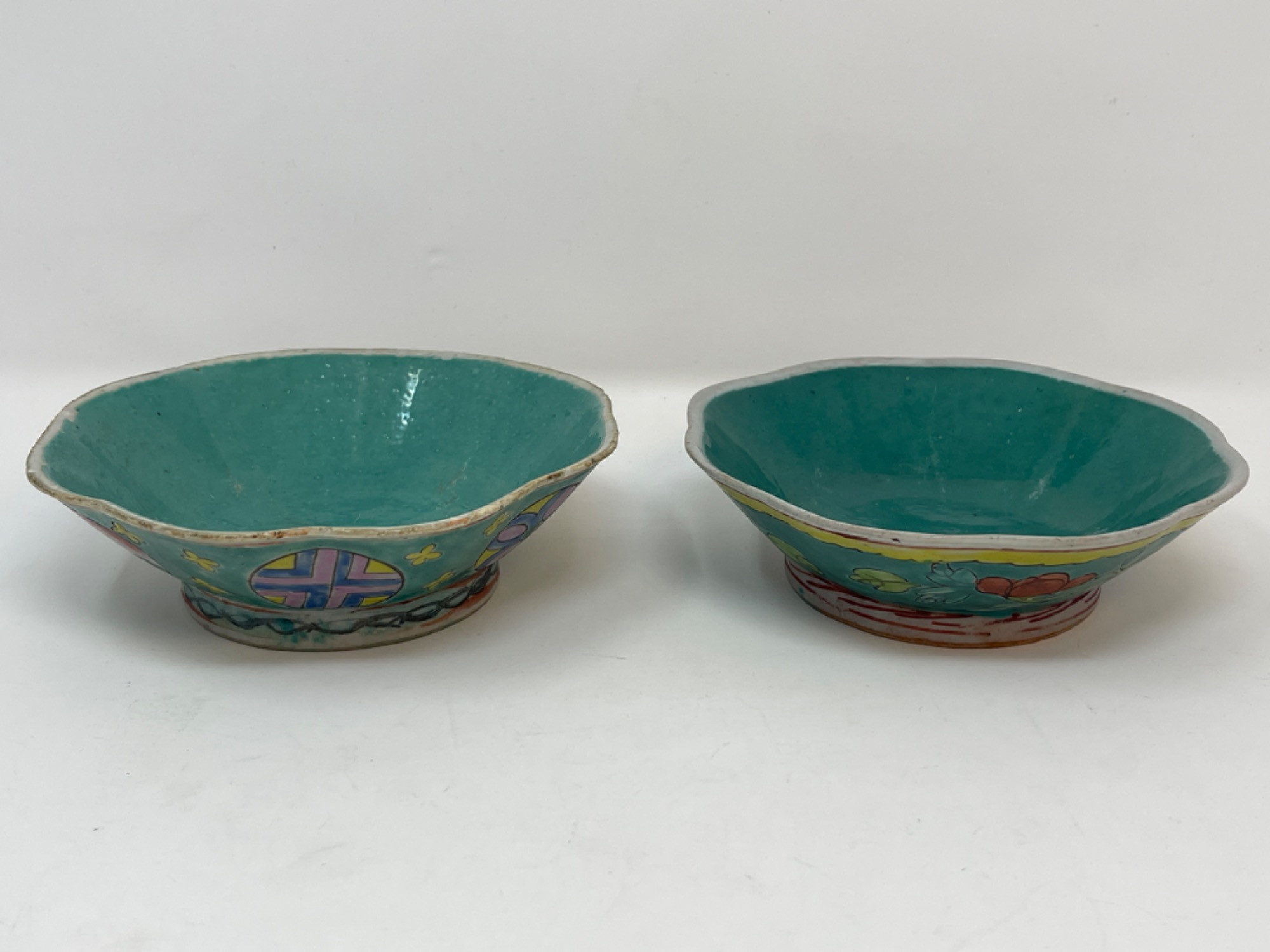 This vibrant assortment of vintage Chinese enameled porcelain bowls showcases intricate hand-painted floral motifs in bold, vivid colors. Each piece features a scalloped edge design with intricate detailing, combining hues of yellow, pink, blue, and green. Condition: All pieces have some staining and scratches. A couple have a few small chips (please see photos for details) Large Bowls: 8.25" W x 2" H Small Bowls: 6" W x 1.75" H Small Cups: 2” H