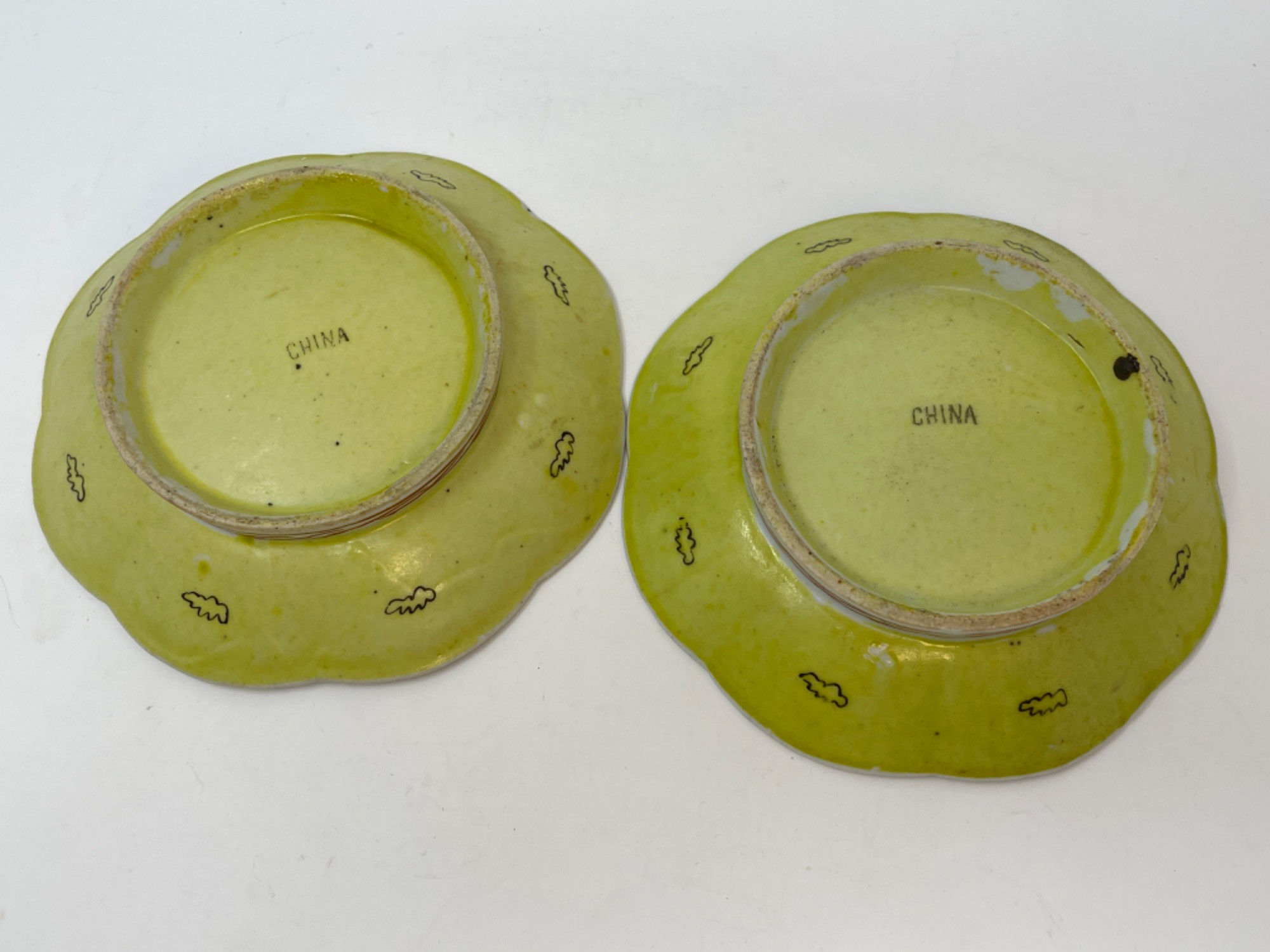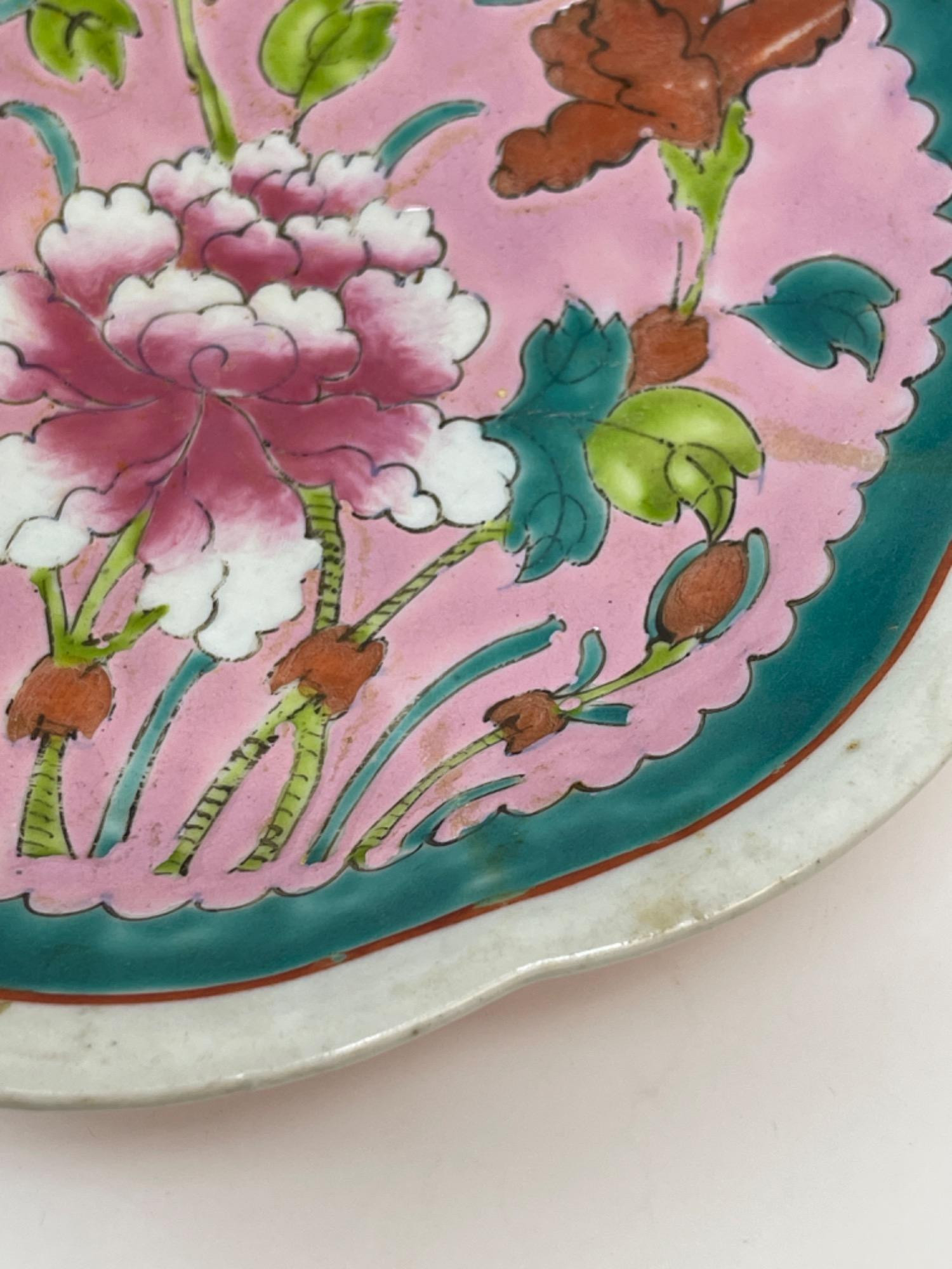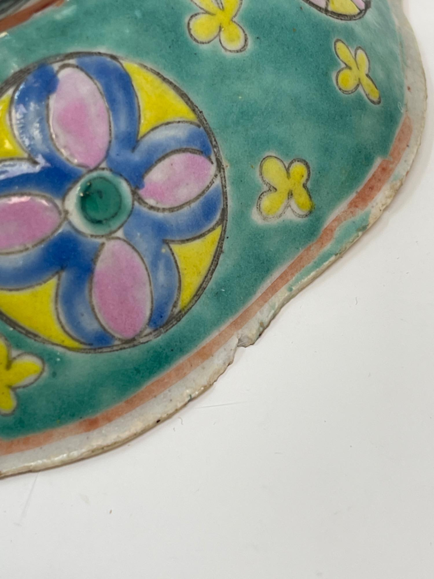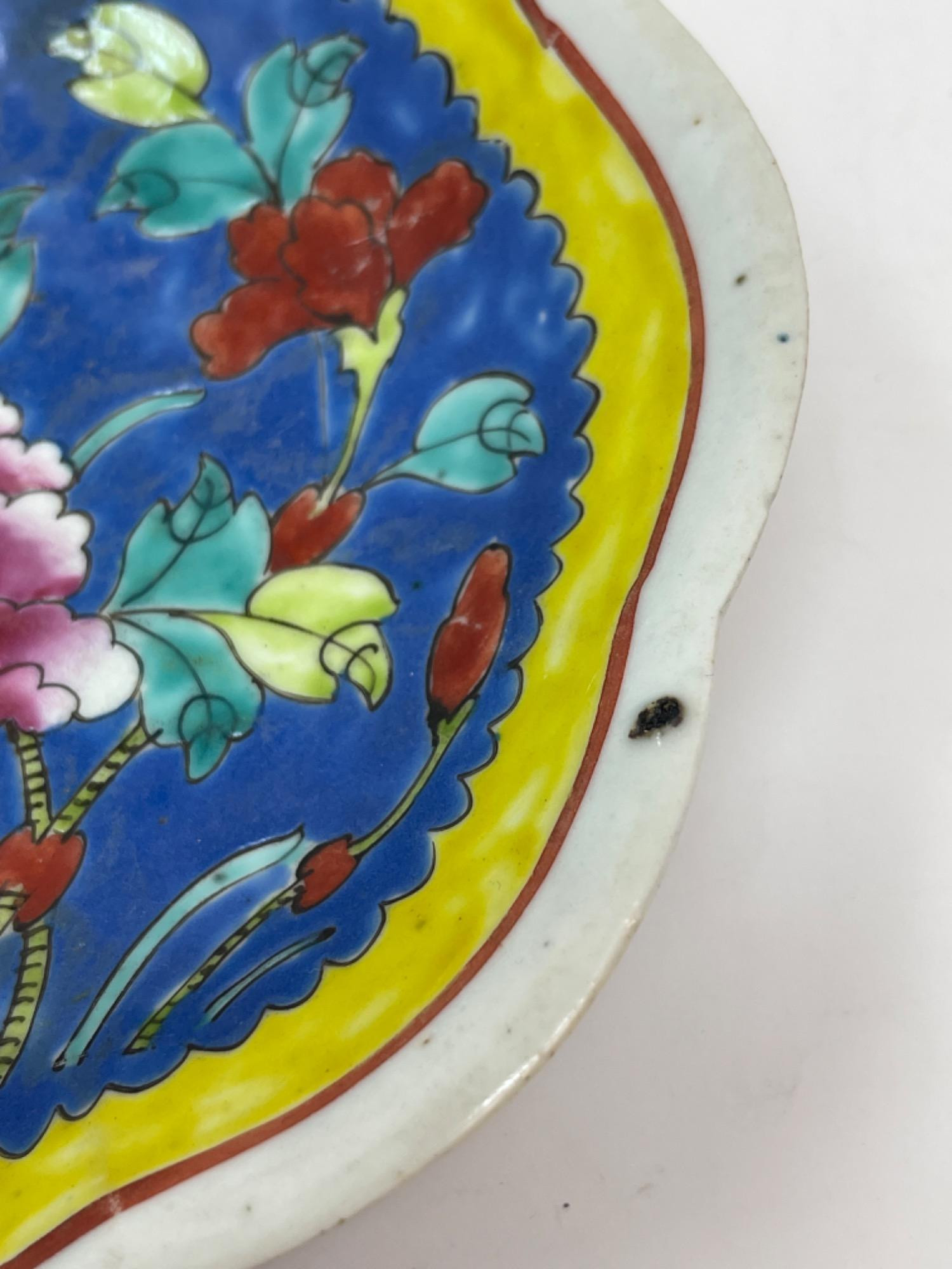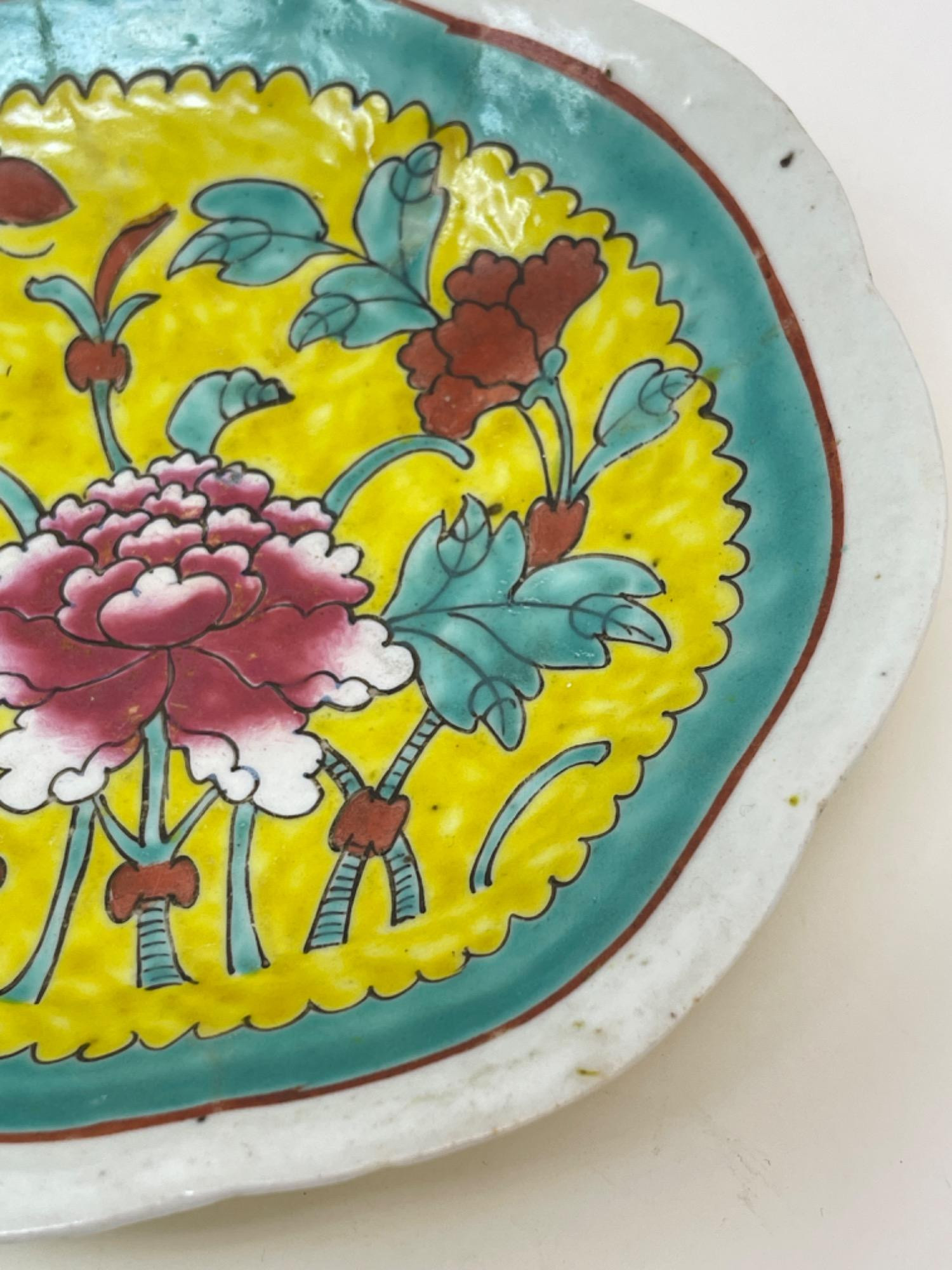This vibrant assortment of vintage Chinese enameled porcelain bowls showcases intricate hand-painted floral motifs in bold, vivid colors. Each piece features a scalloped edge design with intricate detailing, combining hues of yellow, pink, blue, and green. Condition: All pieces have some staining and scratches. A couple have a few small chips (please see photos for details) Large Bowls: 8.25" W x 2" H Small Bowls: 6" W x 1.75" H Small Cups: 2” H