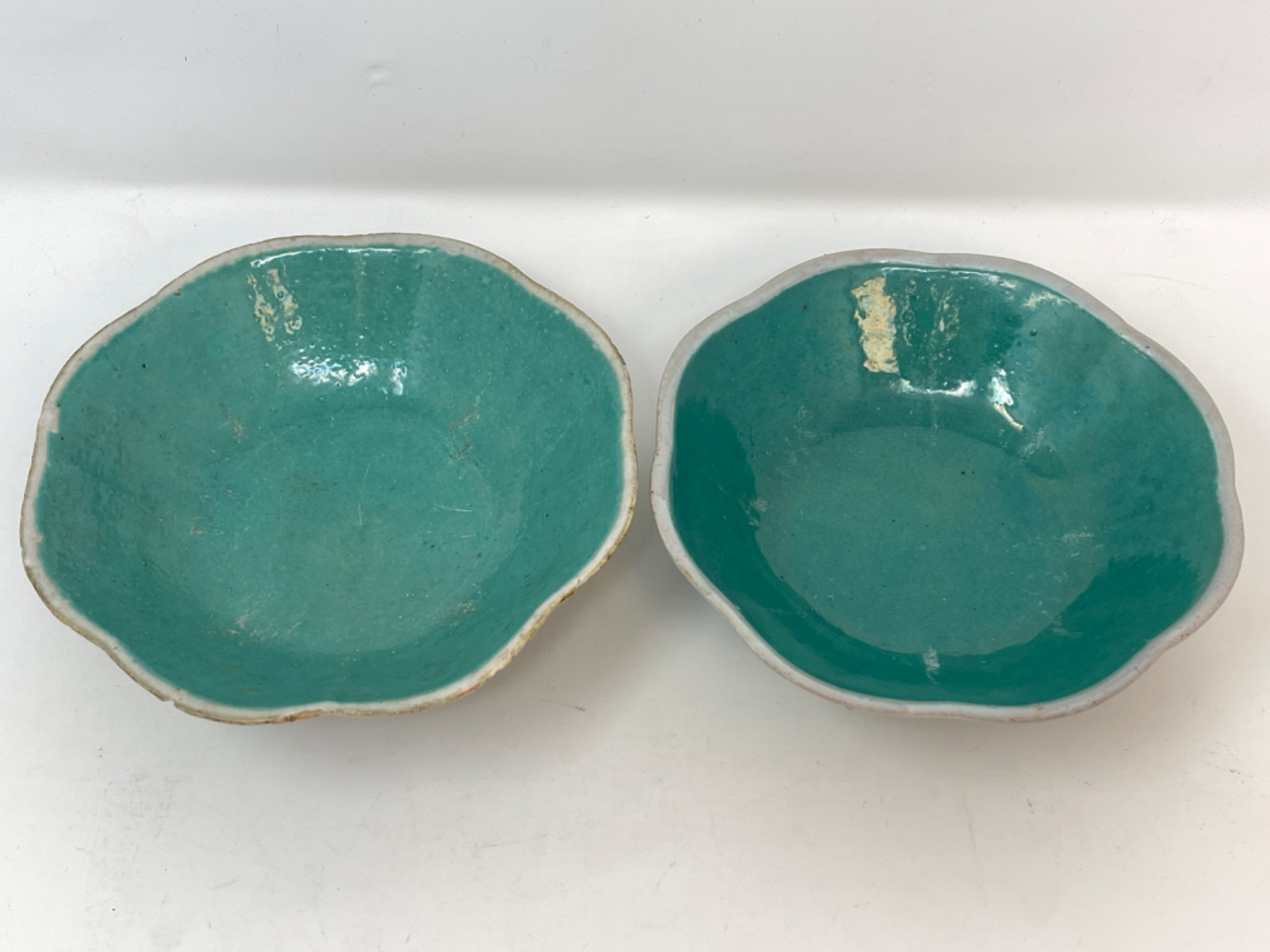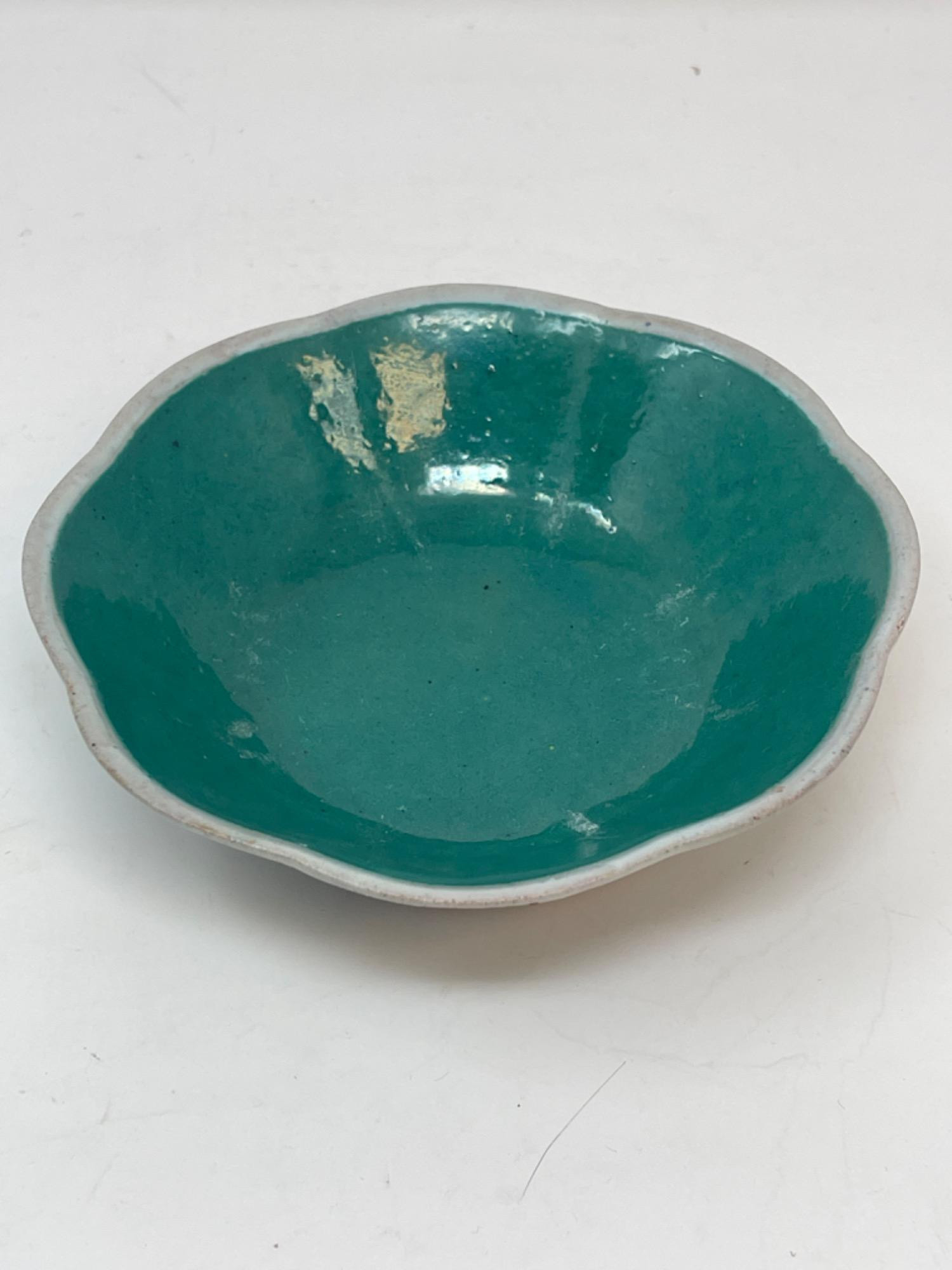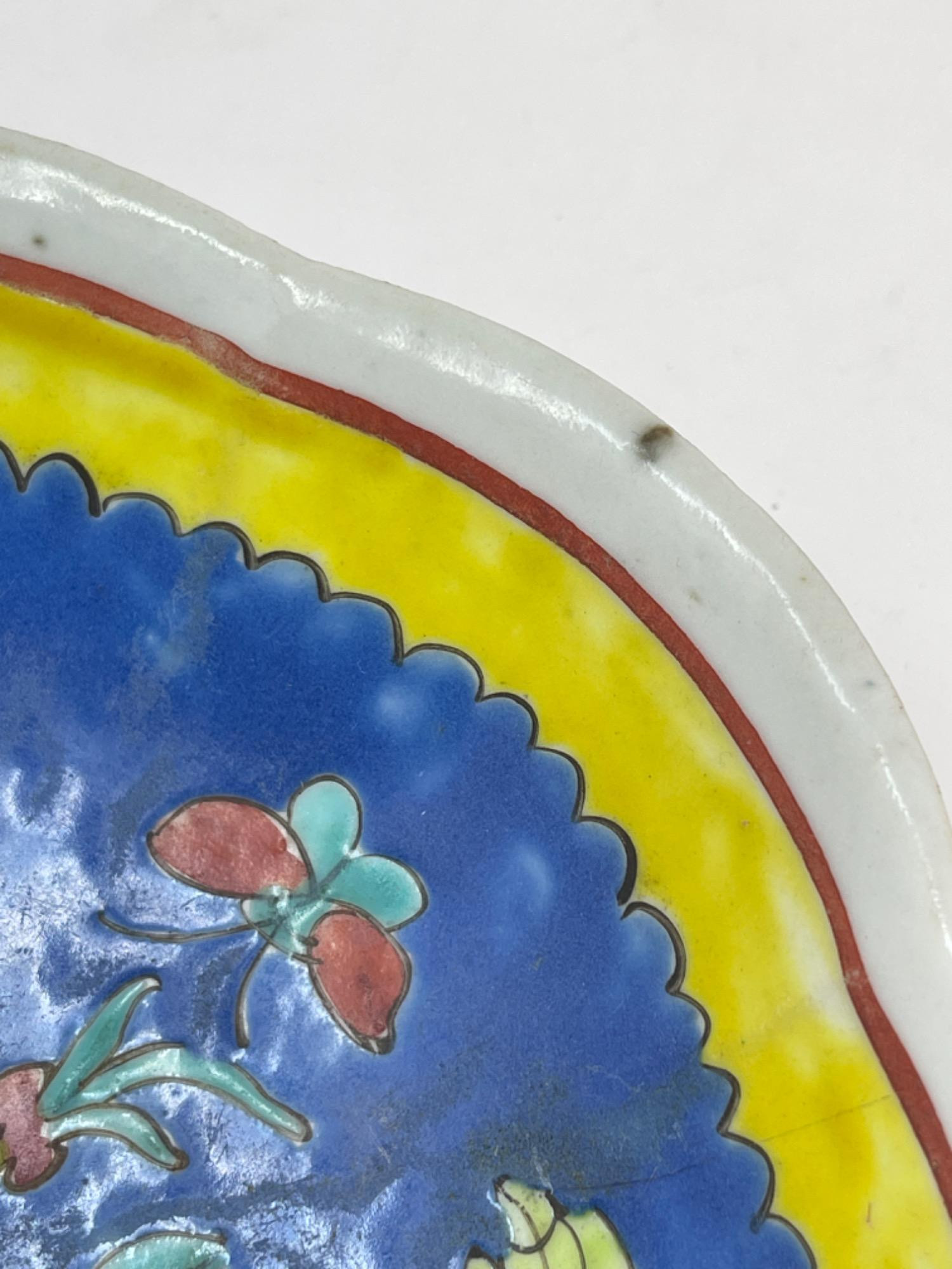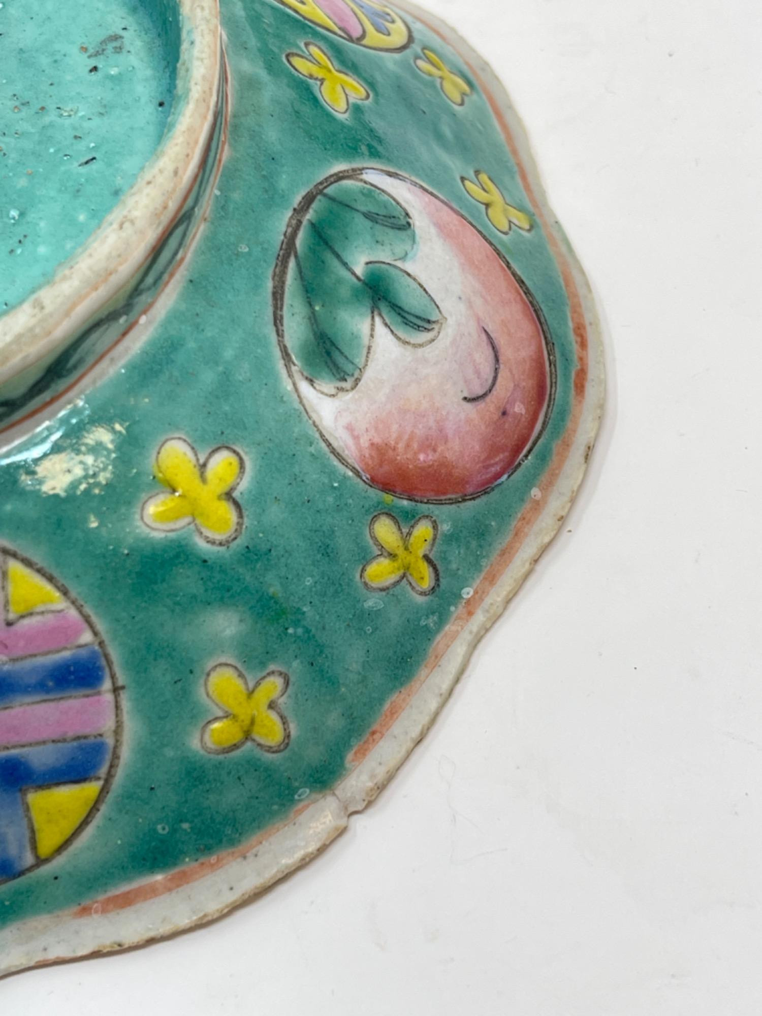This vibrant assortment of vintage Chinese enameled porcelain bowls showcases intricate hand-painted floral motifs in bold, vivid colors. Each piece features a scalloped edge design with intricate detailing, combining hues of yellow, pink, blue, and green. Condition: All pieces have some staining and scratches. A couple have a few small chips (please see photos for details) Large Bowls: 8.25" W x 2" H Small Bowls: 6" W x 1.75" H Small Cups: 2” H