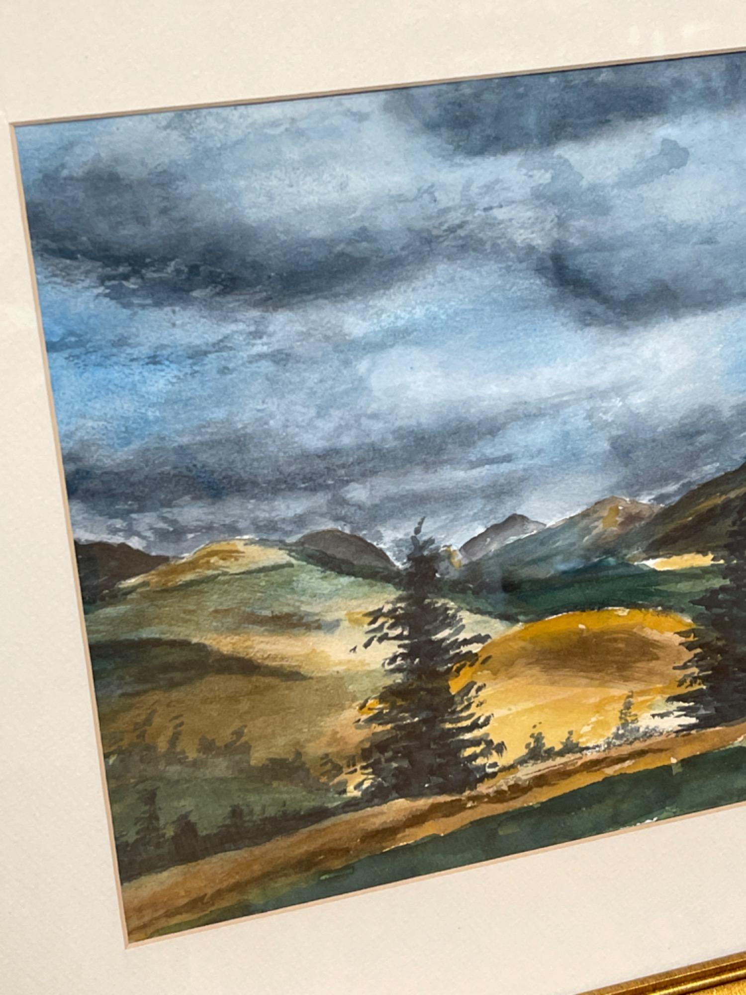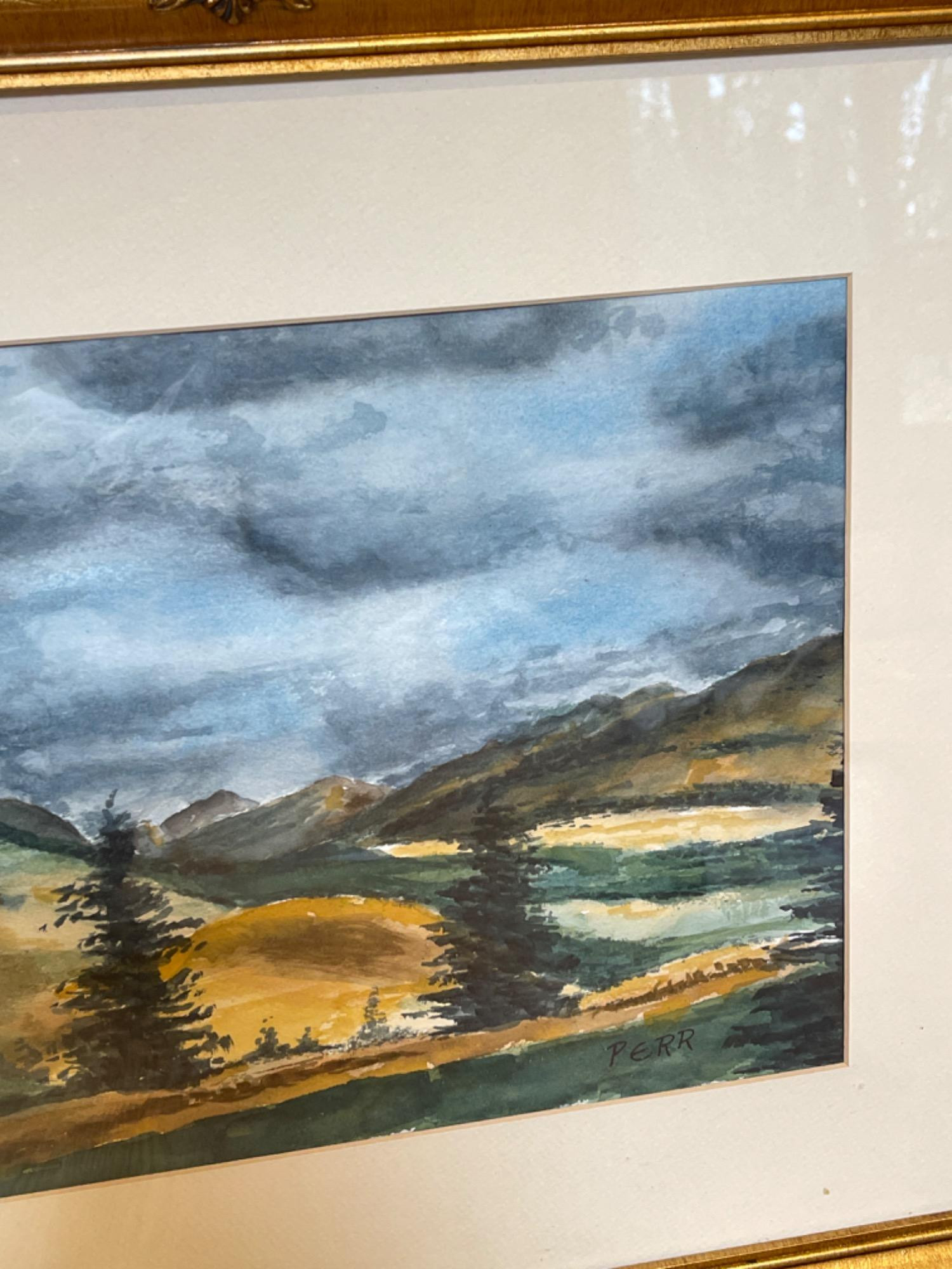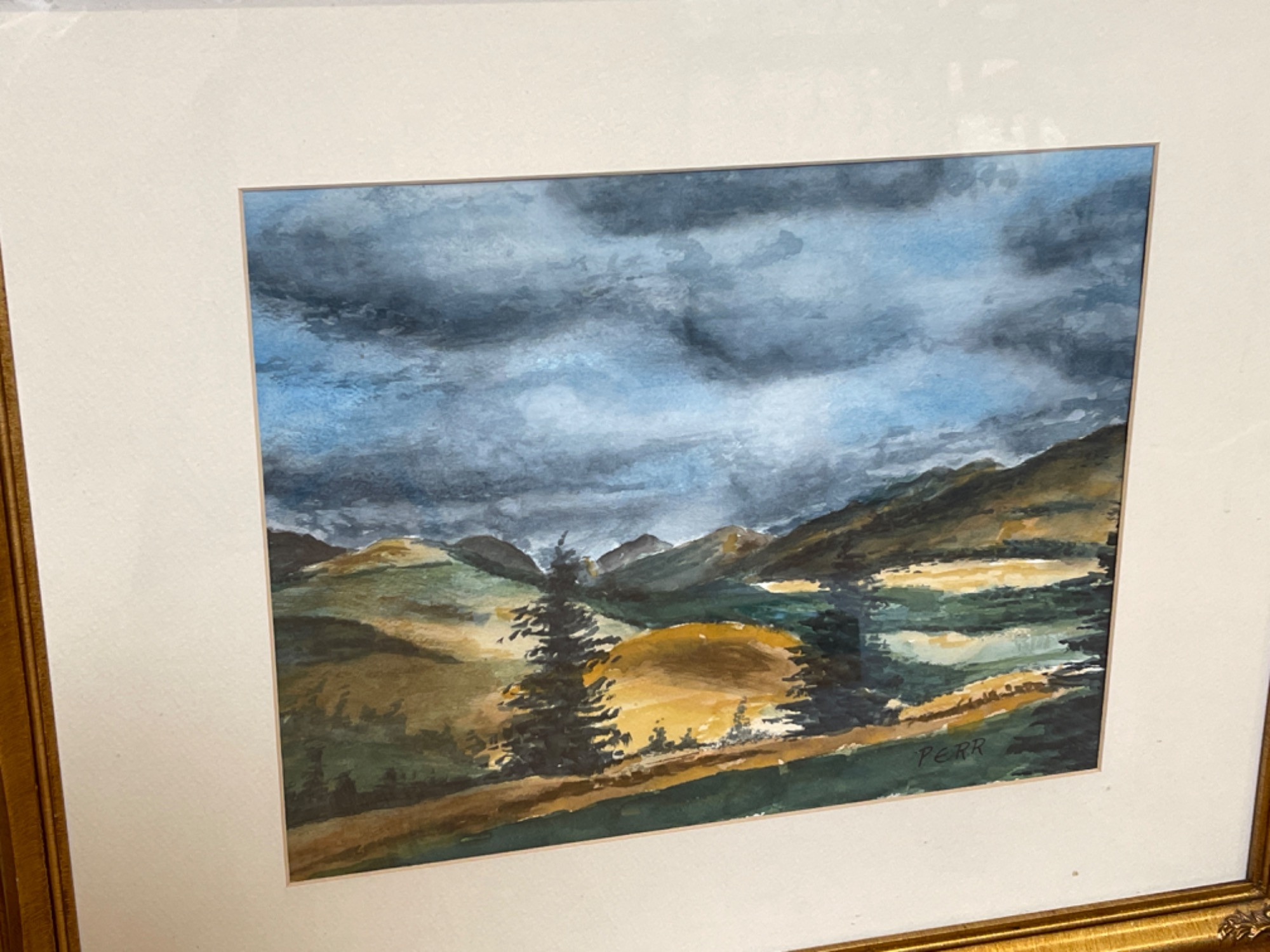 This beautifully framed and signed watercolor painting captures a serene rolling hillside landscape, featuring dark, moody clouds contrasted with golden fields and lush greenery. The artist, signed "Perr", uses expressive brushstrokes and rich tones to create depth and movement, evoking the beauty of nature in a timeless style. Condition: Vintage condition with some signs of wear on the frame (see photos for details)
