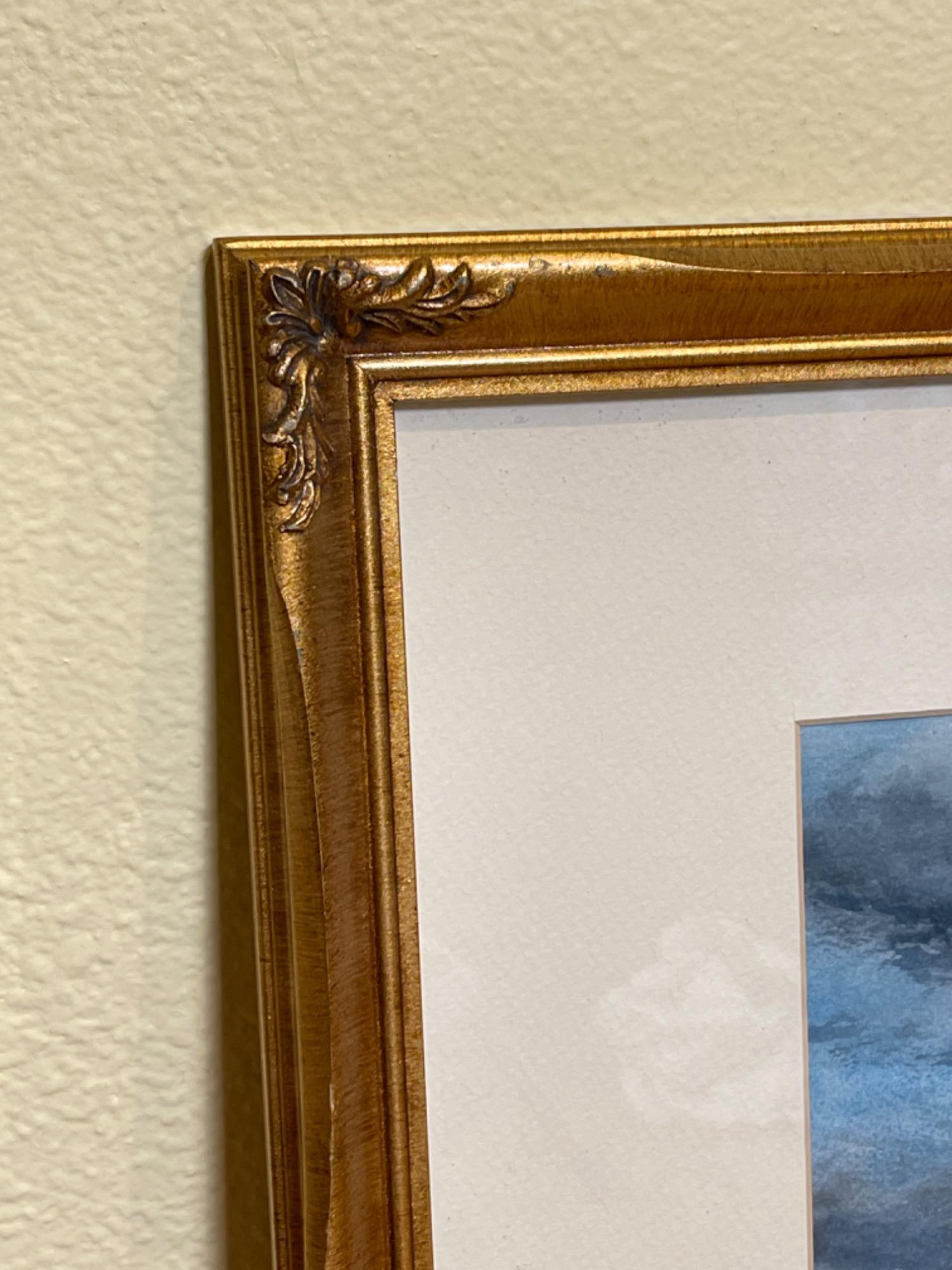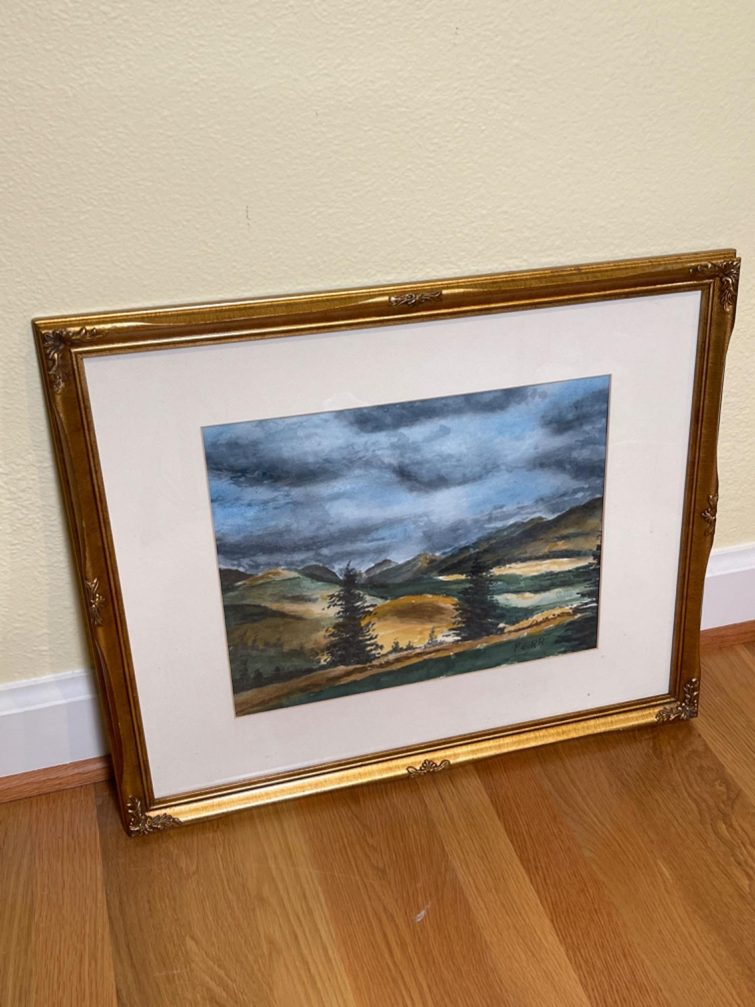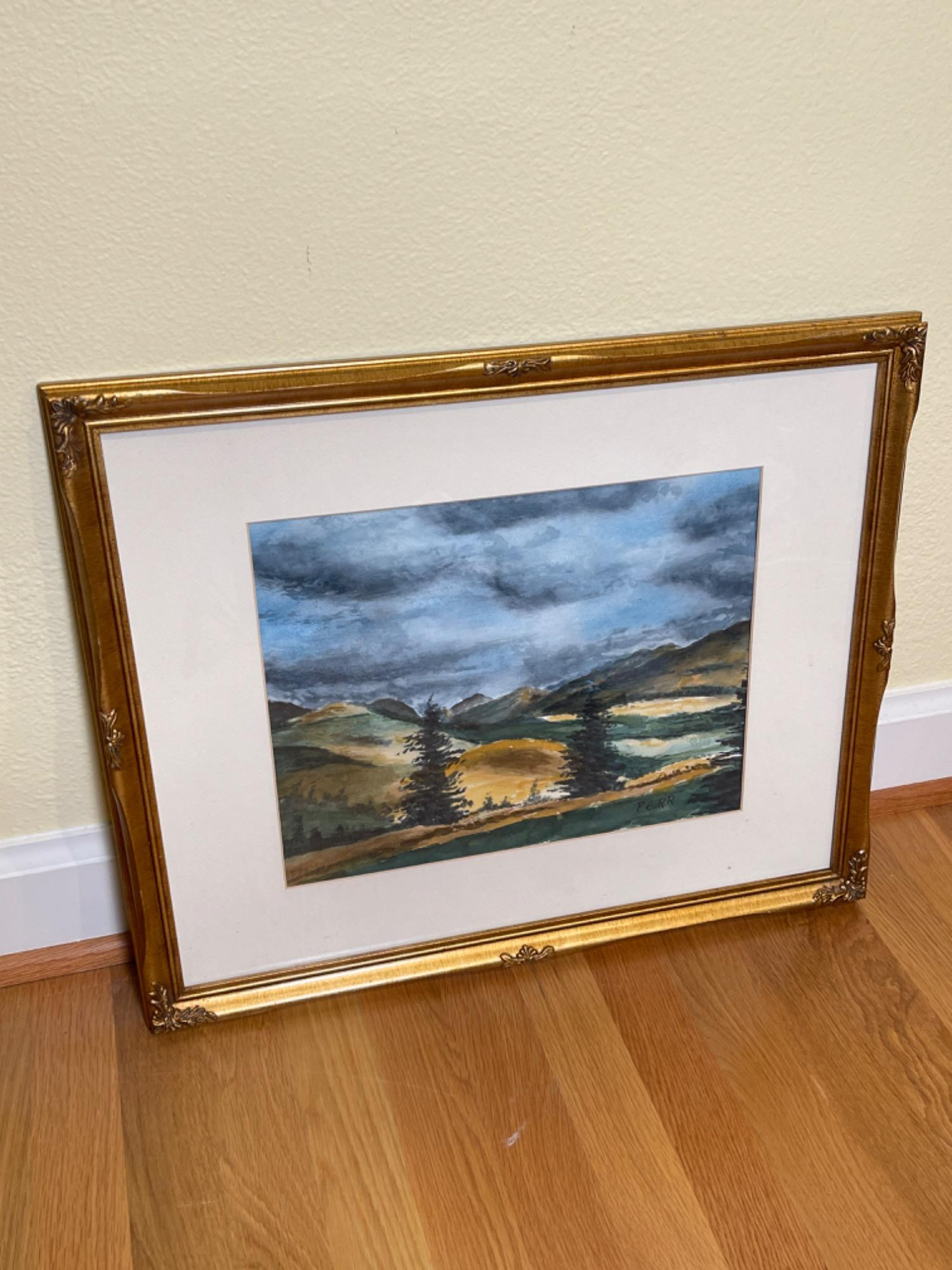 This beautifully framed and signed watercolor painting captures a serene rolling hillside landscape, featuring dark, moody clouds contrasted with golden fields and lush greenery. The artist, signed "Perr", uses expressive brushstrokes and rich tones to create depth and movement, evoking the beauty of nature in a timeless style. Condition: Vintage condition with some signs of wear on the frame (see photos for details)