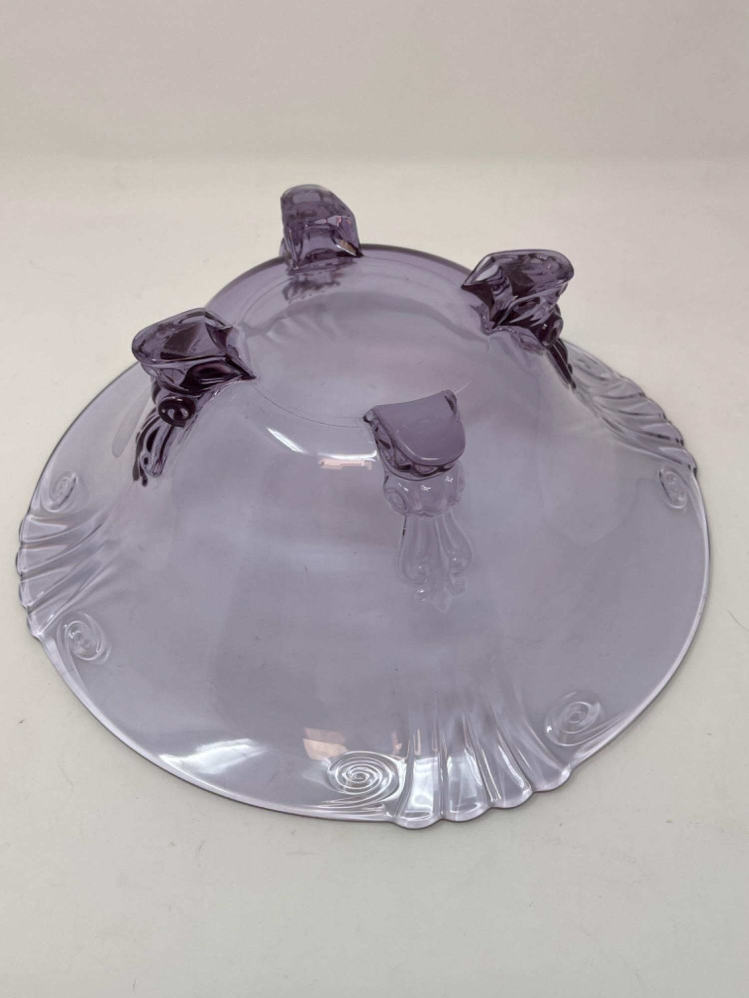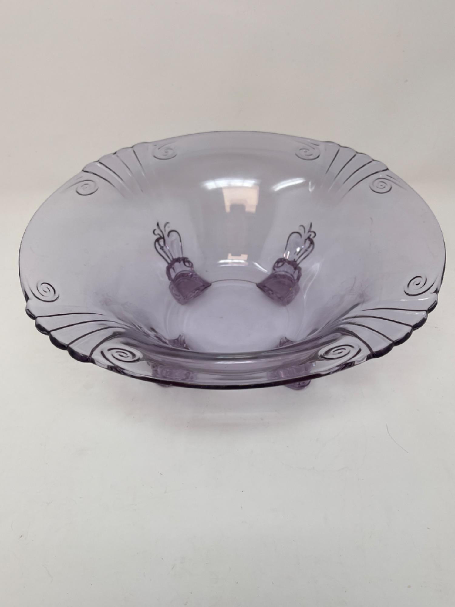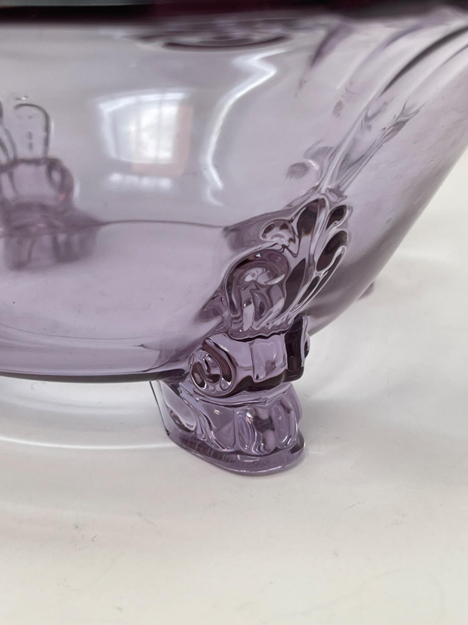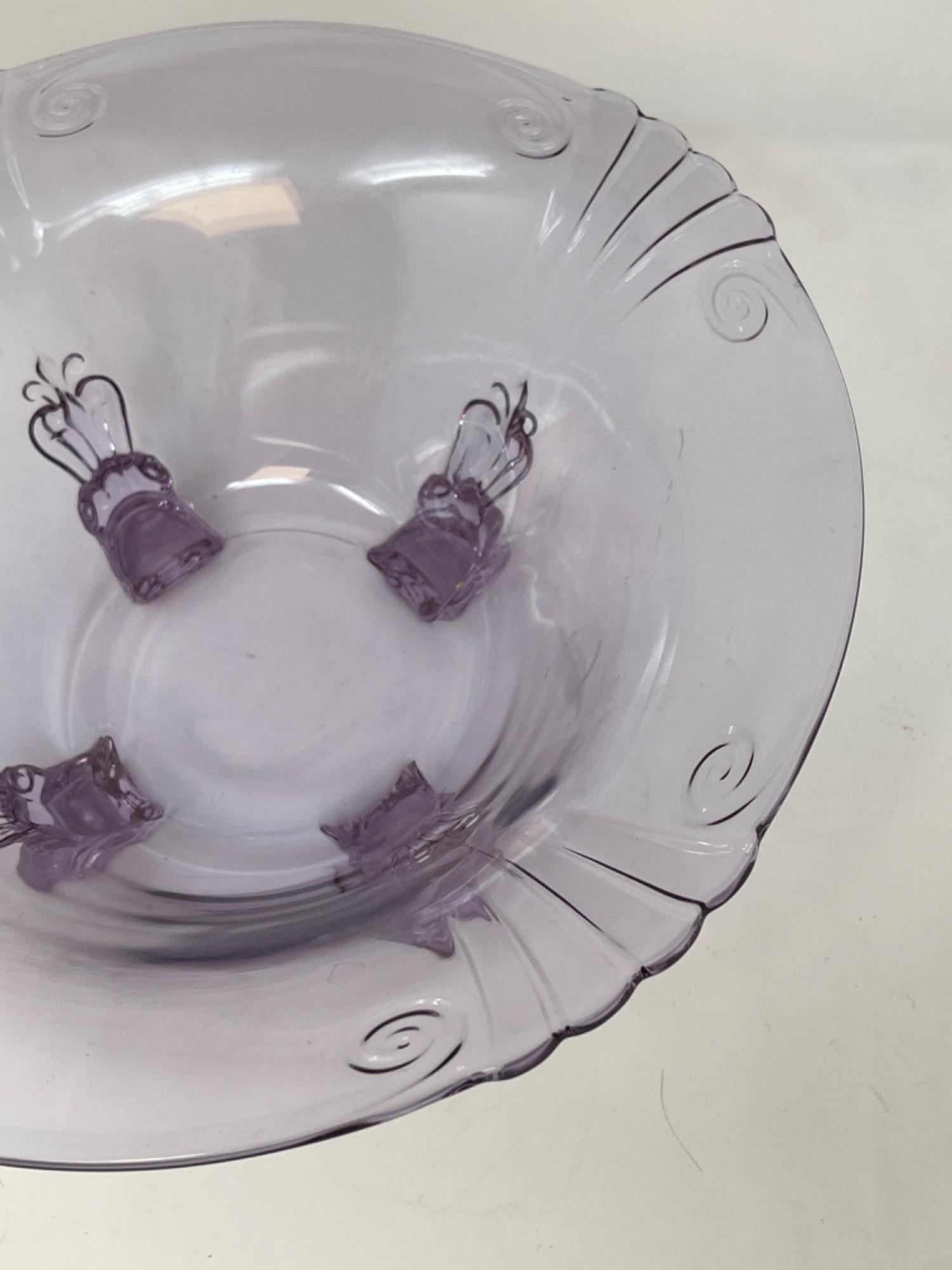 This vintage elegant glass bowl is a stunning example of classic Heisey-style glassware, featuring a soft lavender hue and an ornate footed base. The gently flared rim is adorned with intricate scroll and fan motifs, adding to its timeless beauty and refined craftsmanship. Condition: Good vintage condition with minor signs of wear consistent with age (see photos for details)