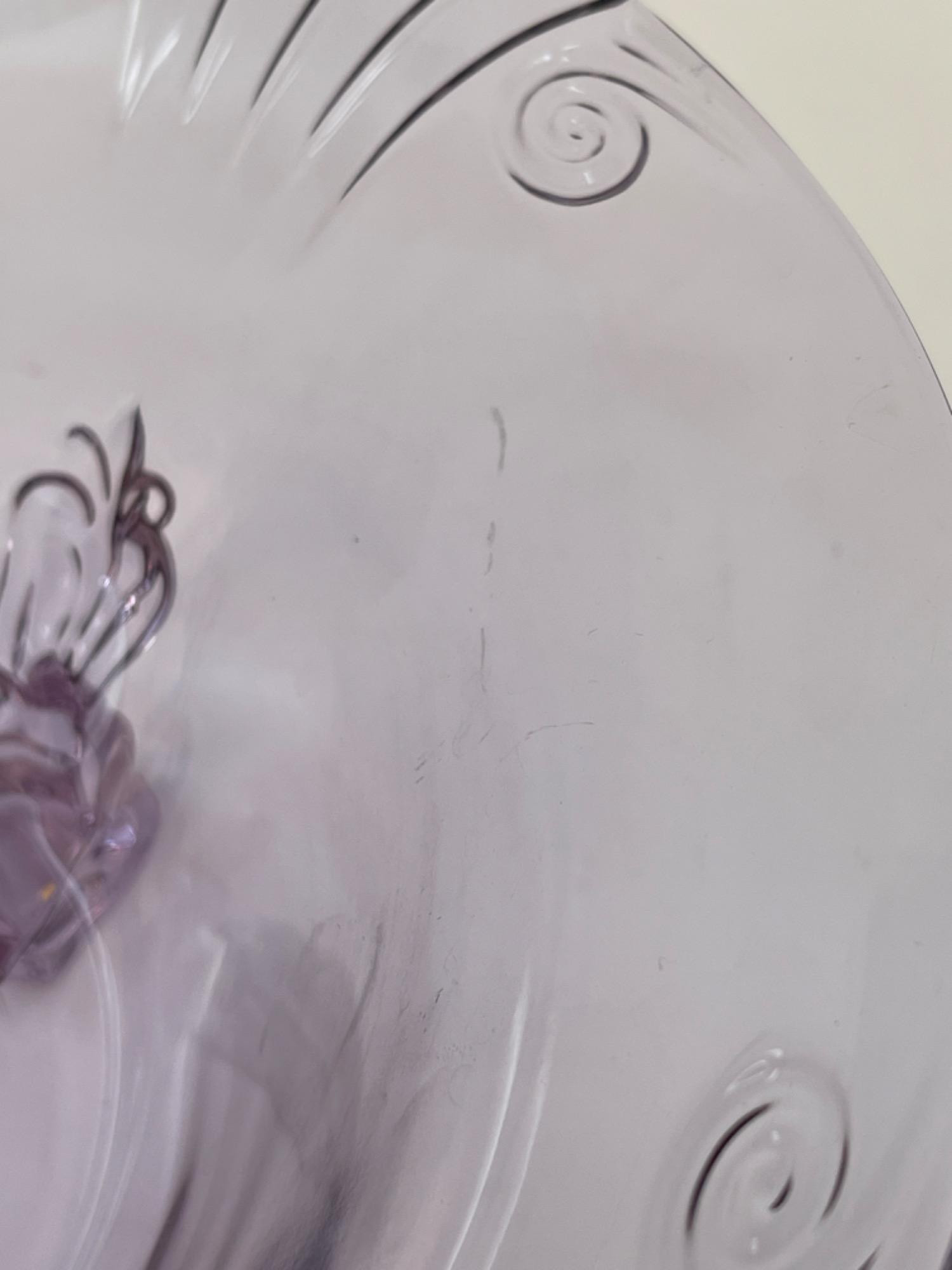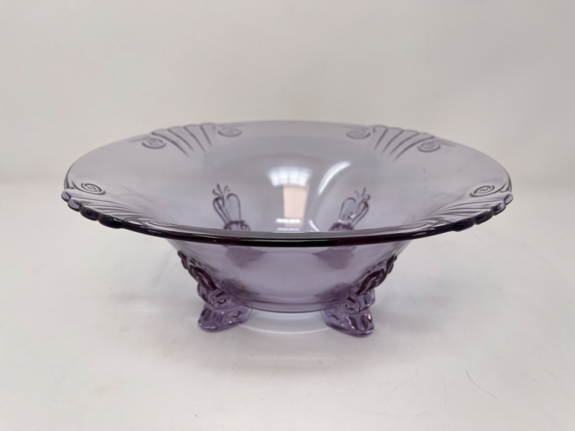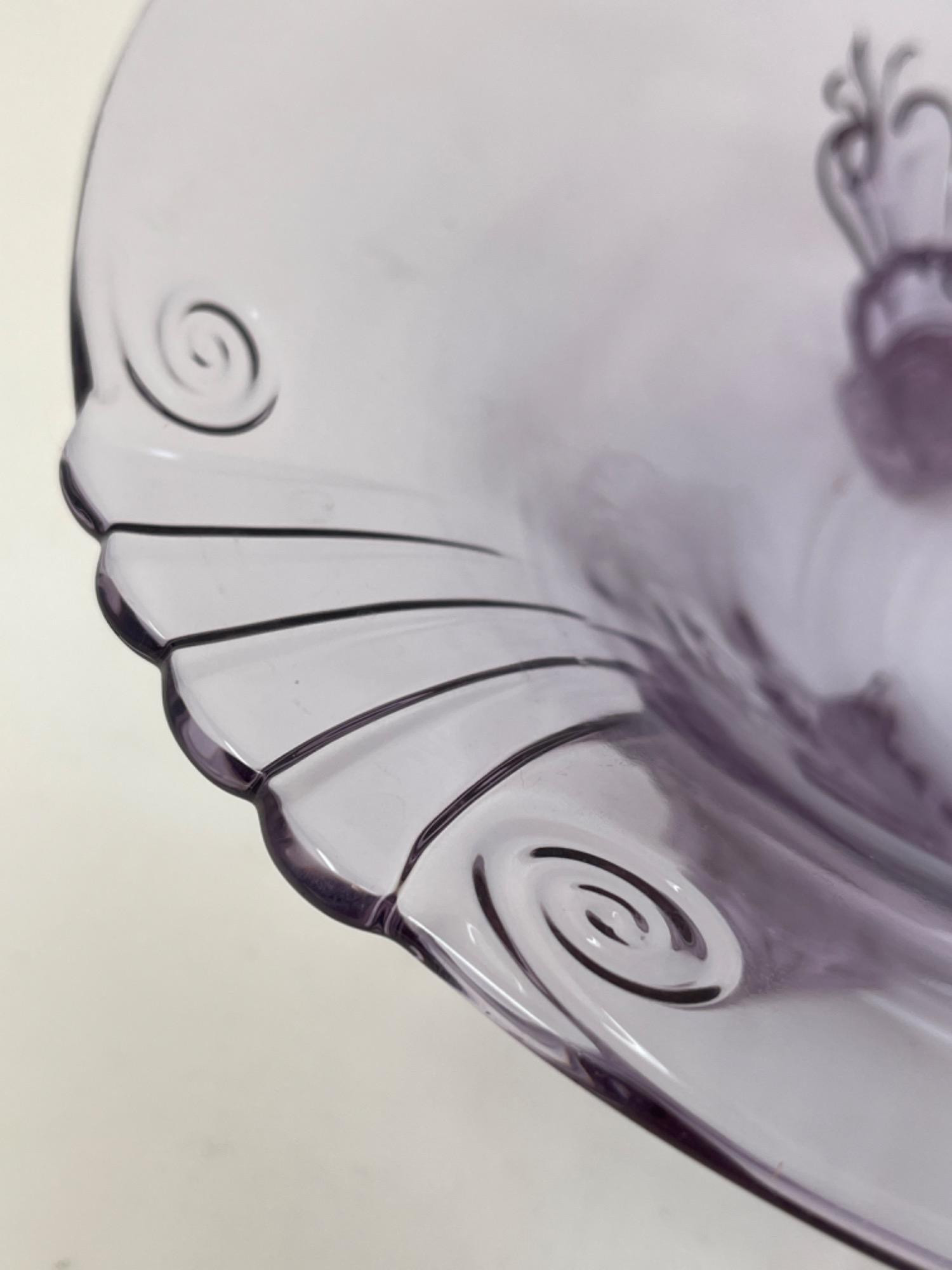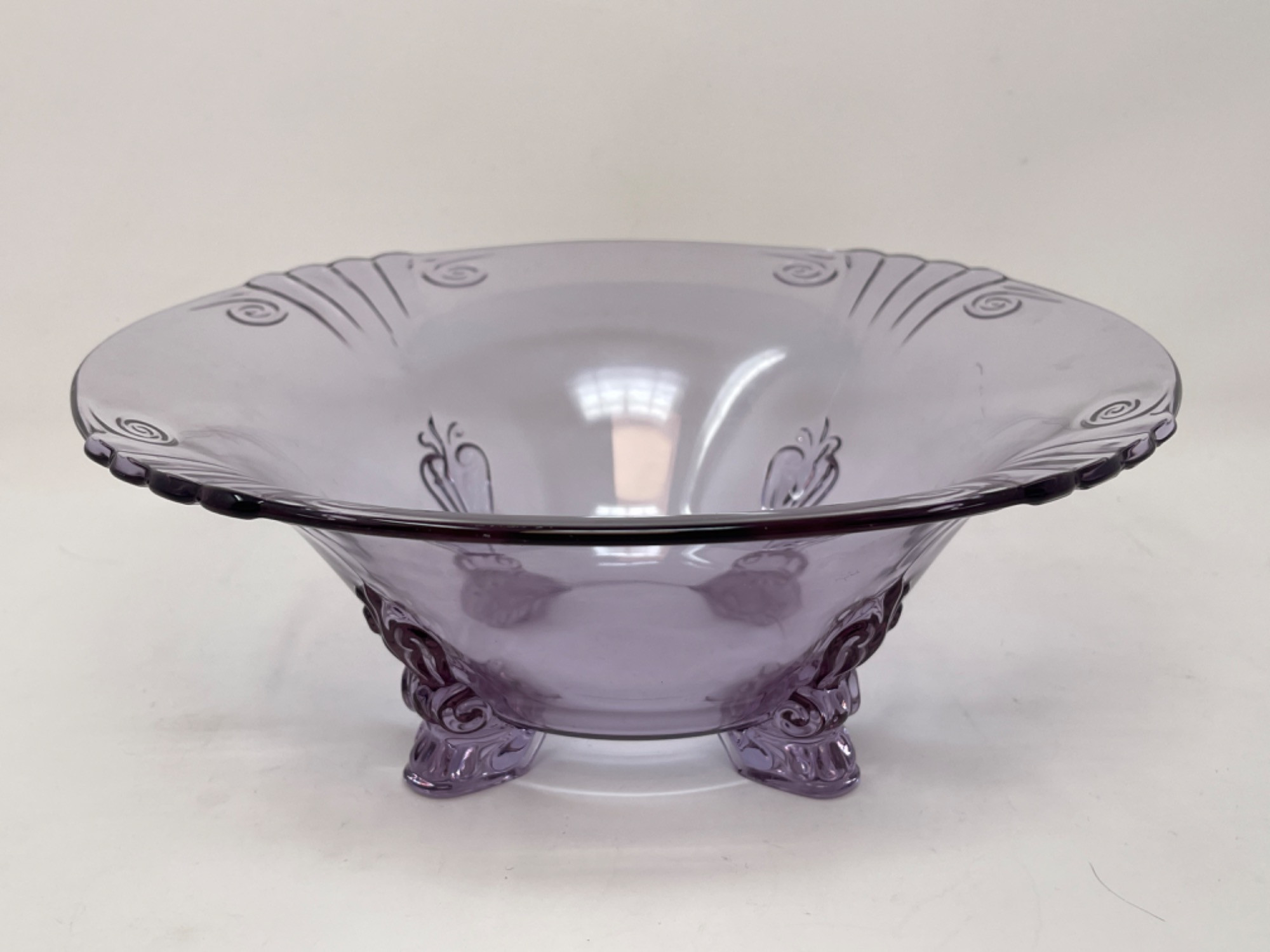 This vintage elegant glass bowl is a stunning example of classic Heisey-style glassware, featuring a soft lavender hue and an ornate footed base. The gently flared rim is adorned with intricate scroll and fan motifs, adding to its timeless beauty and refined craftsmanship. Condition: Good vintage condition with minor signs of wear consistent with age (see photos for details)