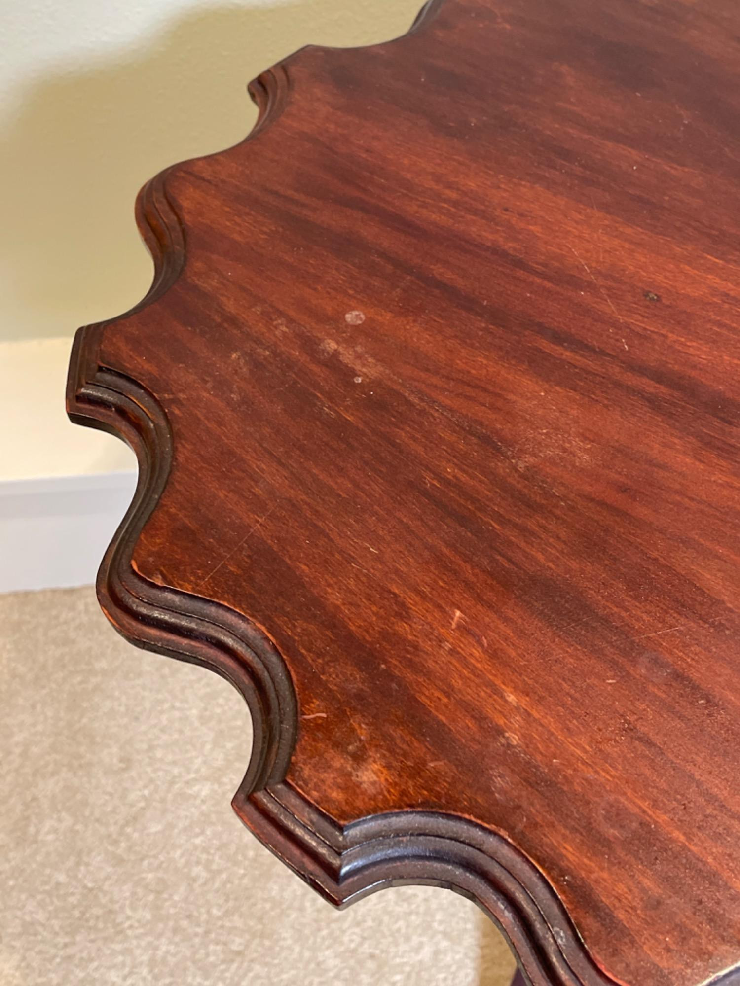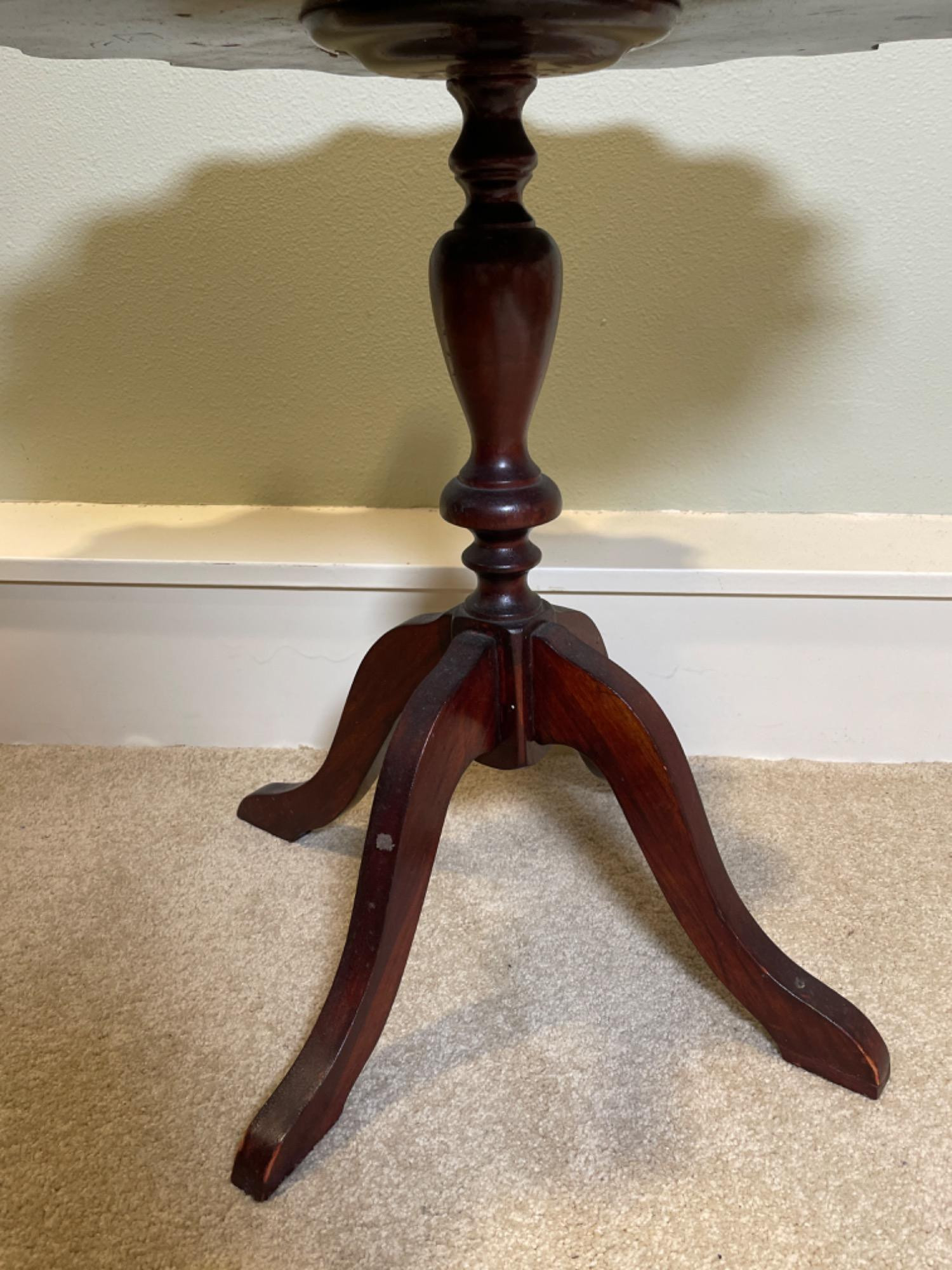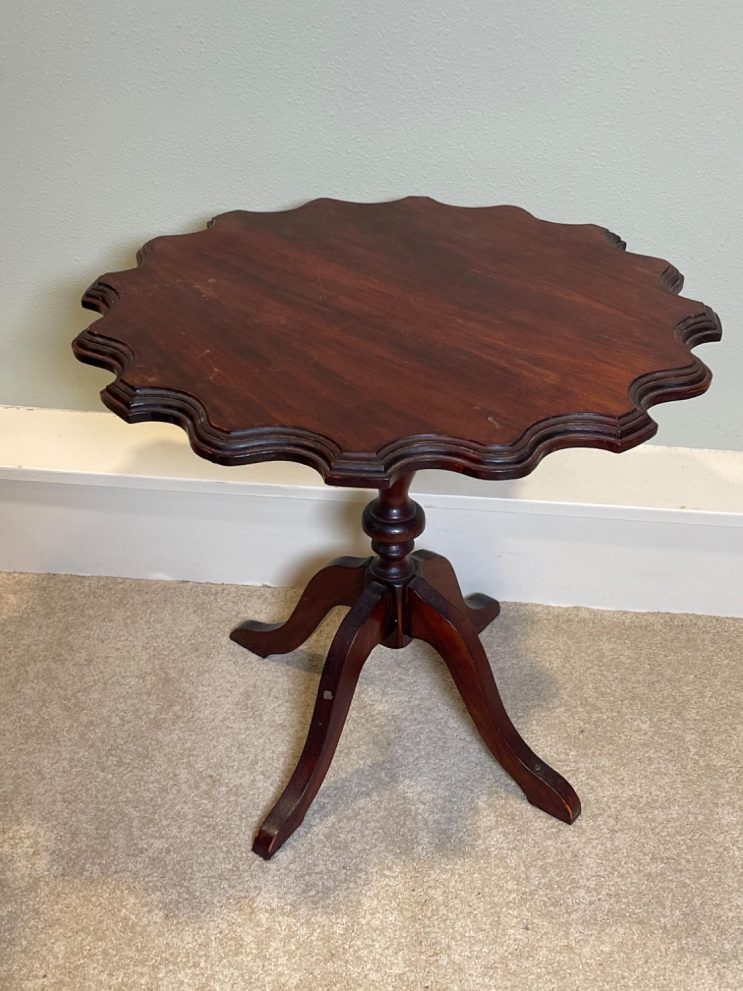 This vintage wooden side table features an elegant scalloped-edge top, supported by a gracefully turned pedestal base with three curved legs. With its rich, dark wood finish and timeless craftsmanship, this piece adds a touch of traditional charm to any space. Condition: Pre-owned with visible wear, including scuffs, scratches, and minor finish imperfections (see photos for details)