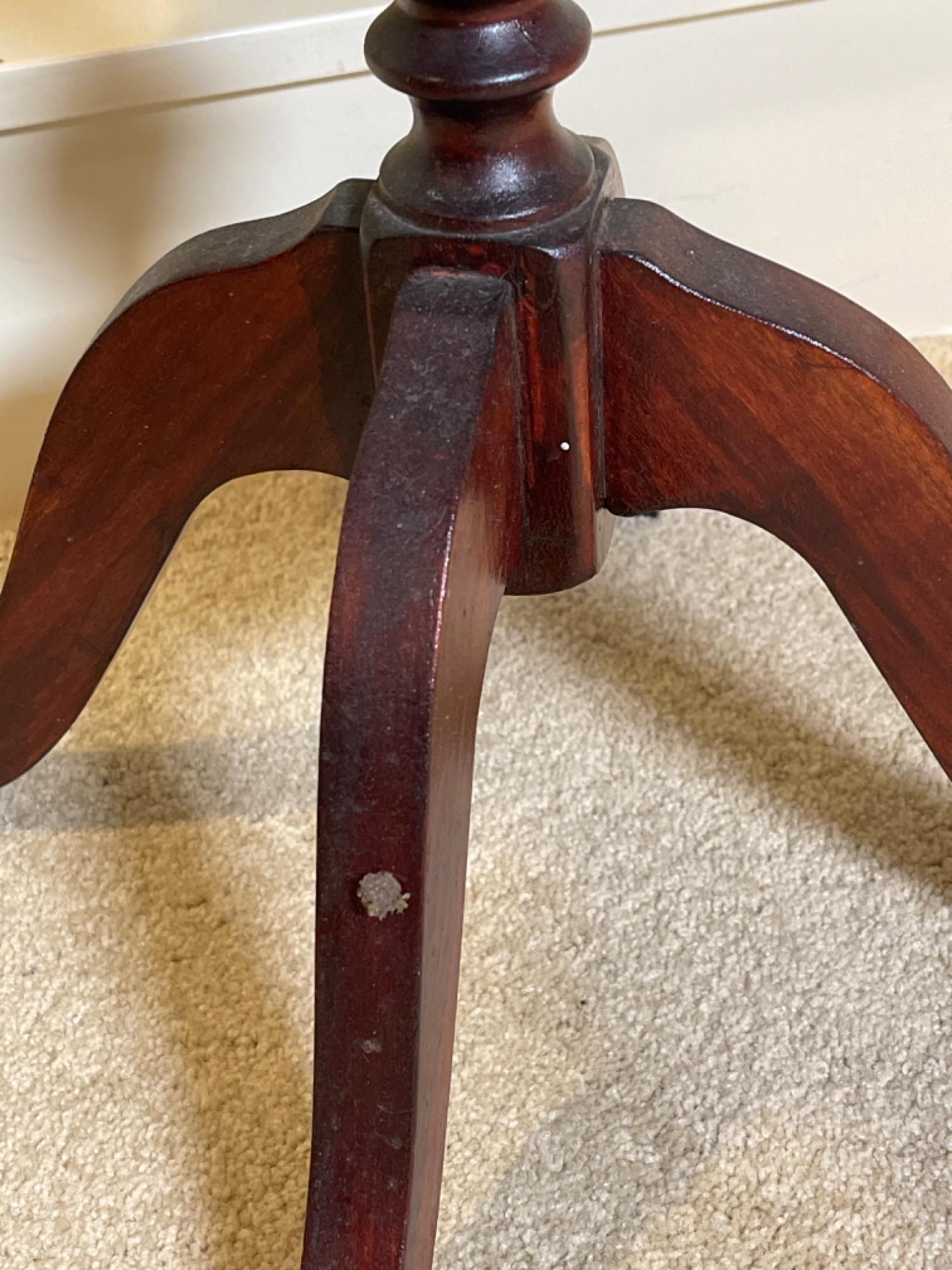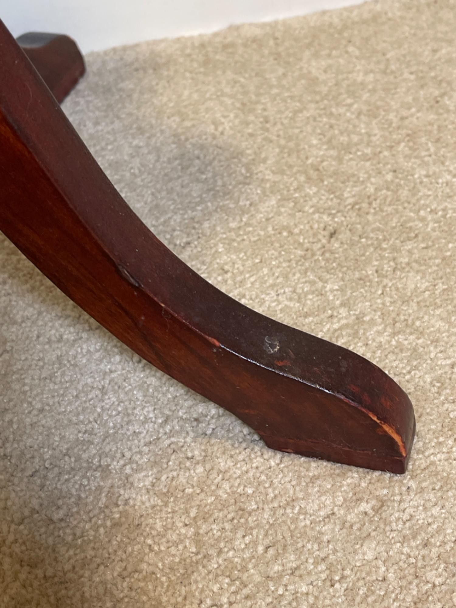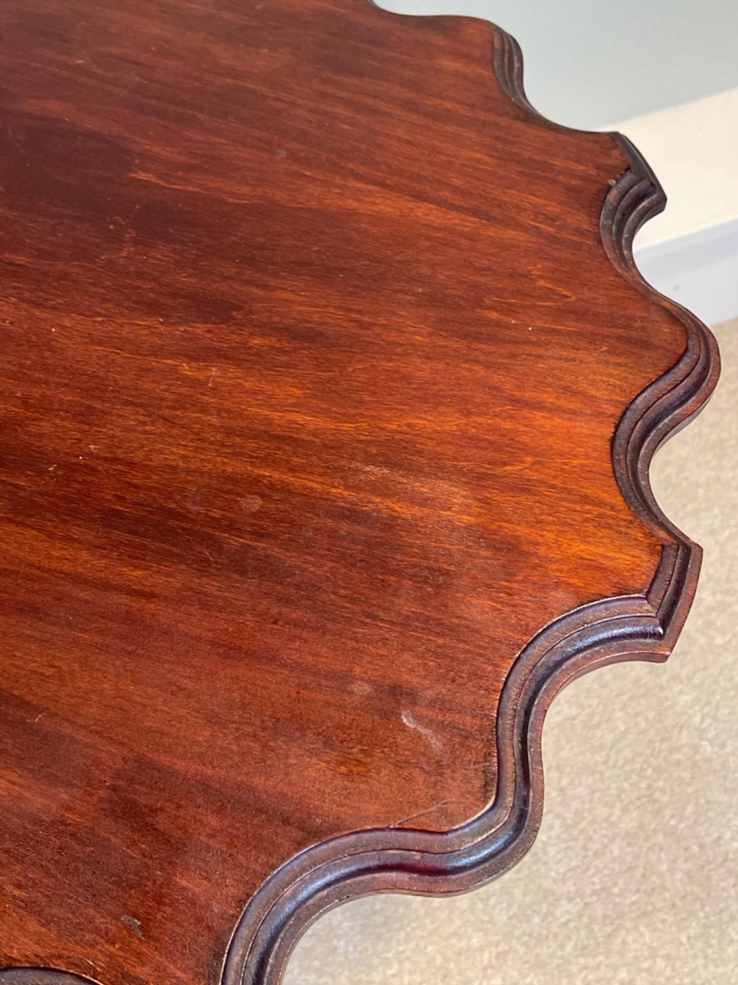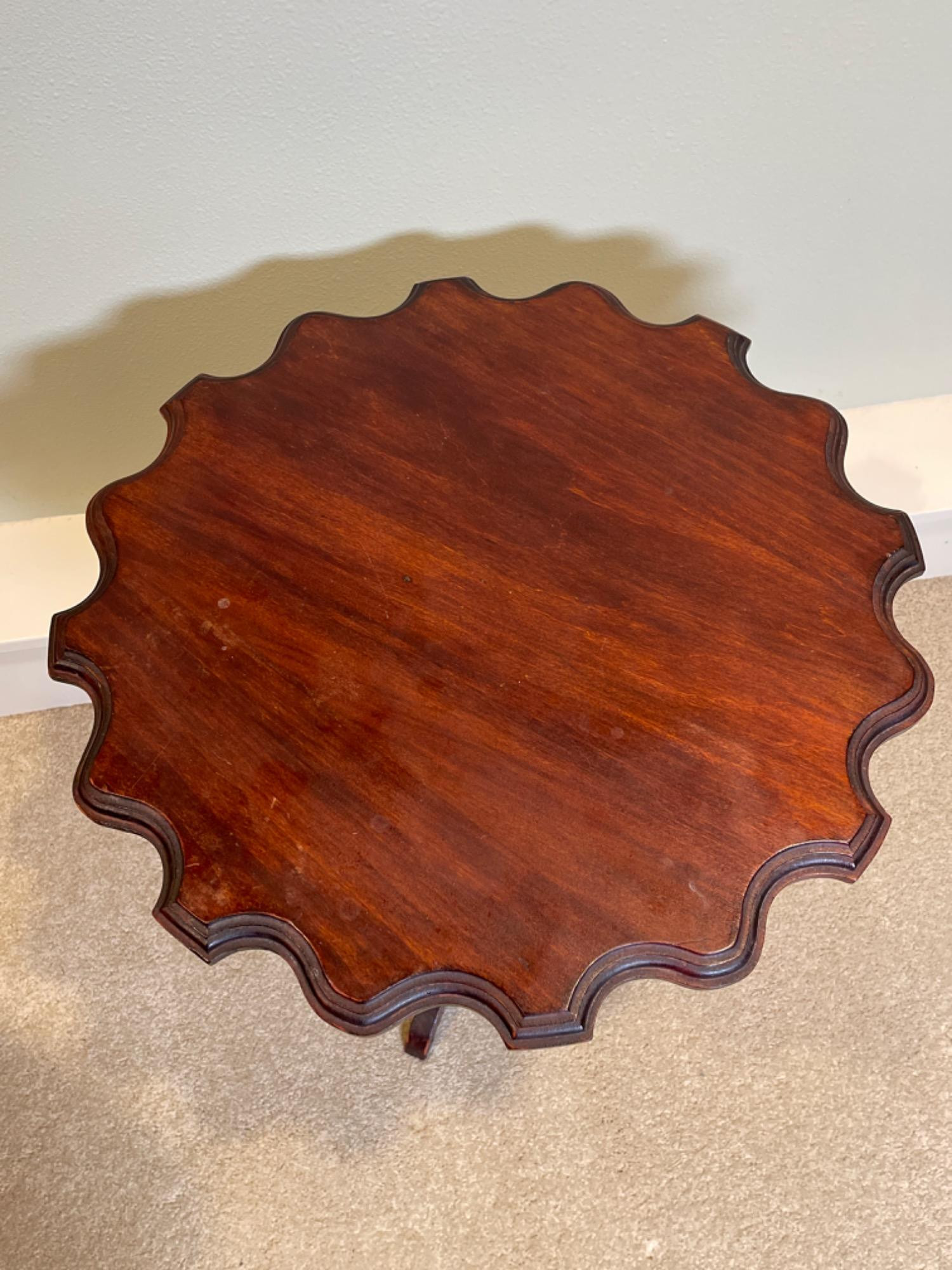 This vintage wooden side table features an elegant scalloped-edge top, supported by a gracefully turned pedestal base with three curved legs. With its rich, dark wood finish and timeless craftsmanship, this piece adds a touch of traditional charm to any space. Condition: Pre-owned with visible wear, including scuffs, scratches, and minor finish imperfections (see photos for details)