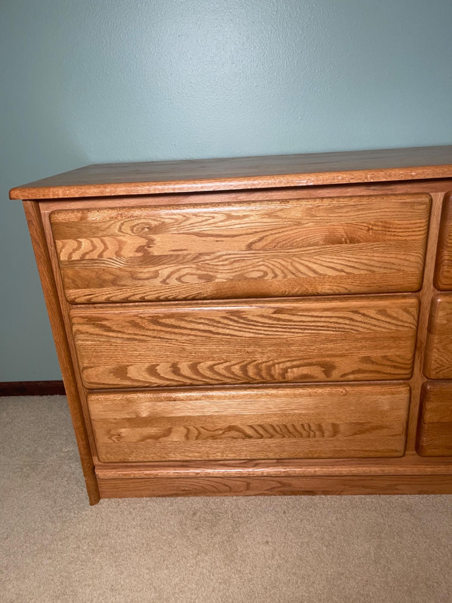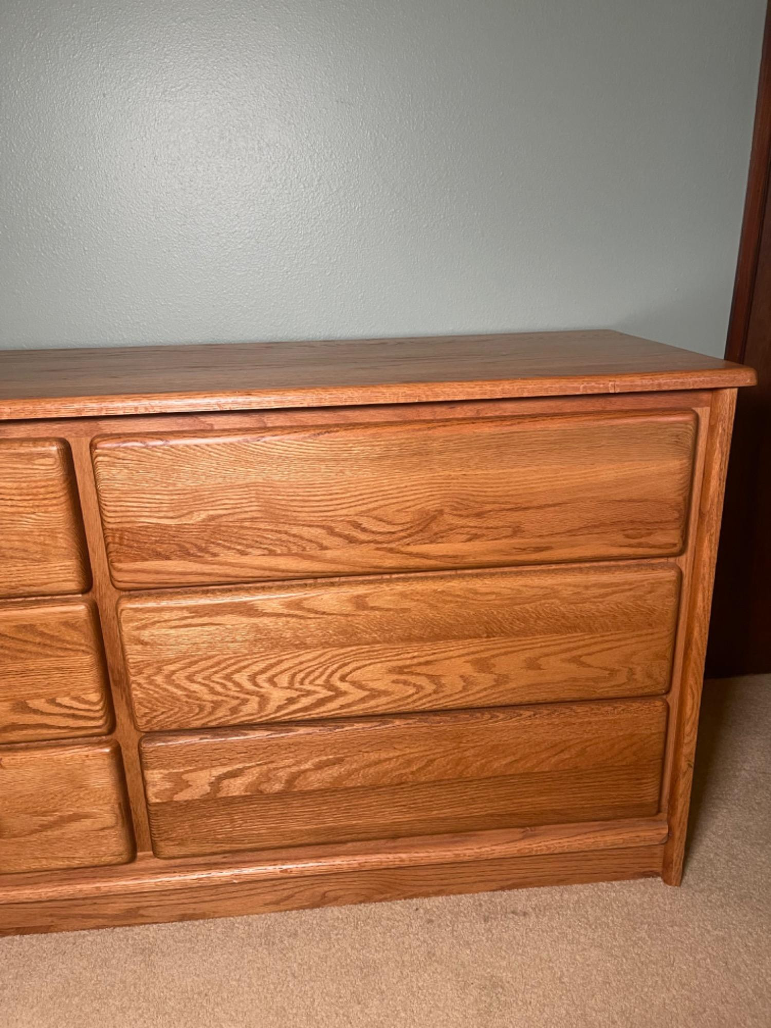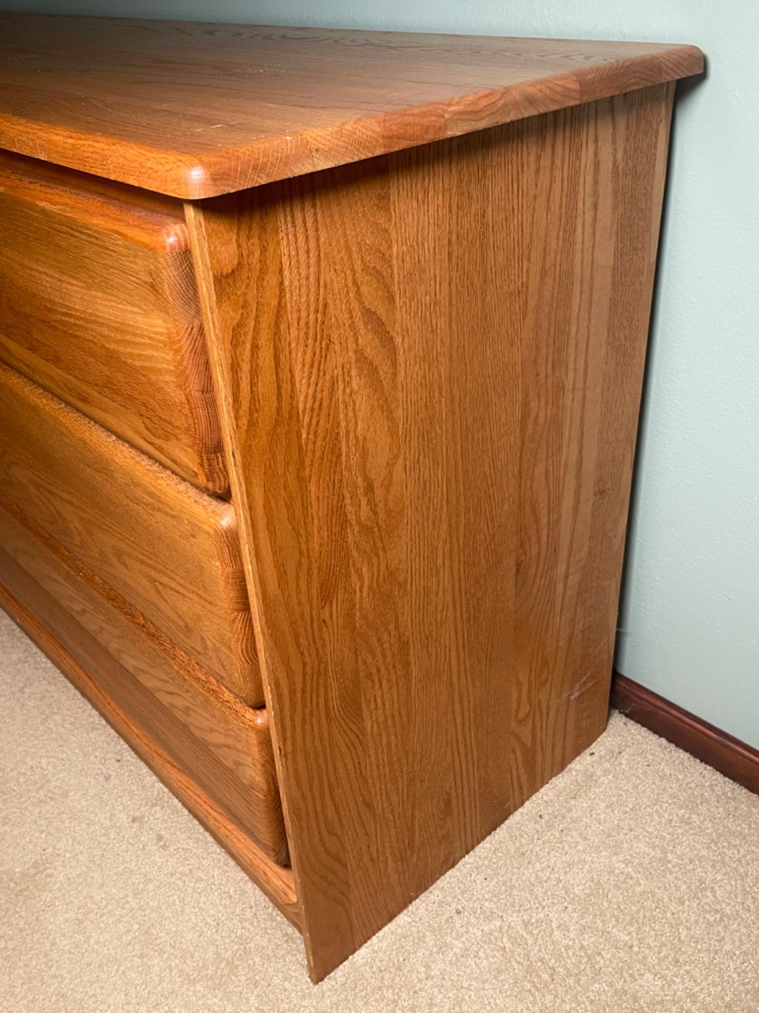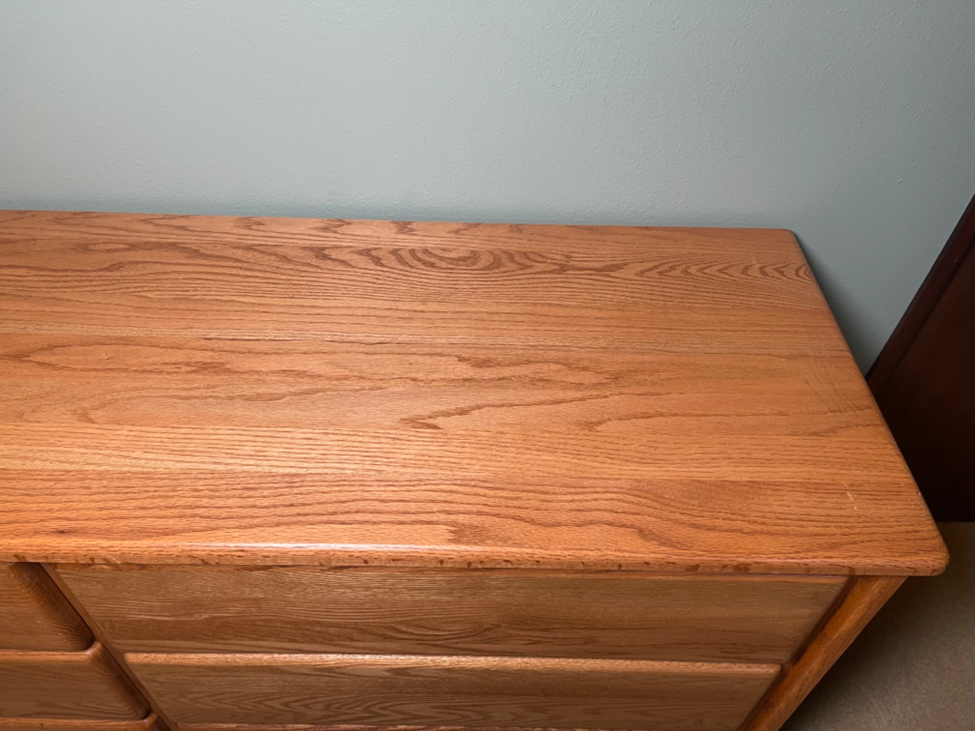 Vintage Solid Oak 6-Drawer Dresser Bring timeless durability and classic craftsmanship to your home with this solid oak 6-drawer dresser. Made in the USA, this piece features a sturdy all-wood construction with a natural oak finish that highlights the rich grain patterns. With a sleek, handle-free drawer design, it offers a clean and modern aesthetic while maintaining a warm, traditional appeal. Condition: - Includes scuffs, scratches, and some stains from use, adding to its character.