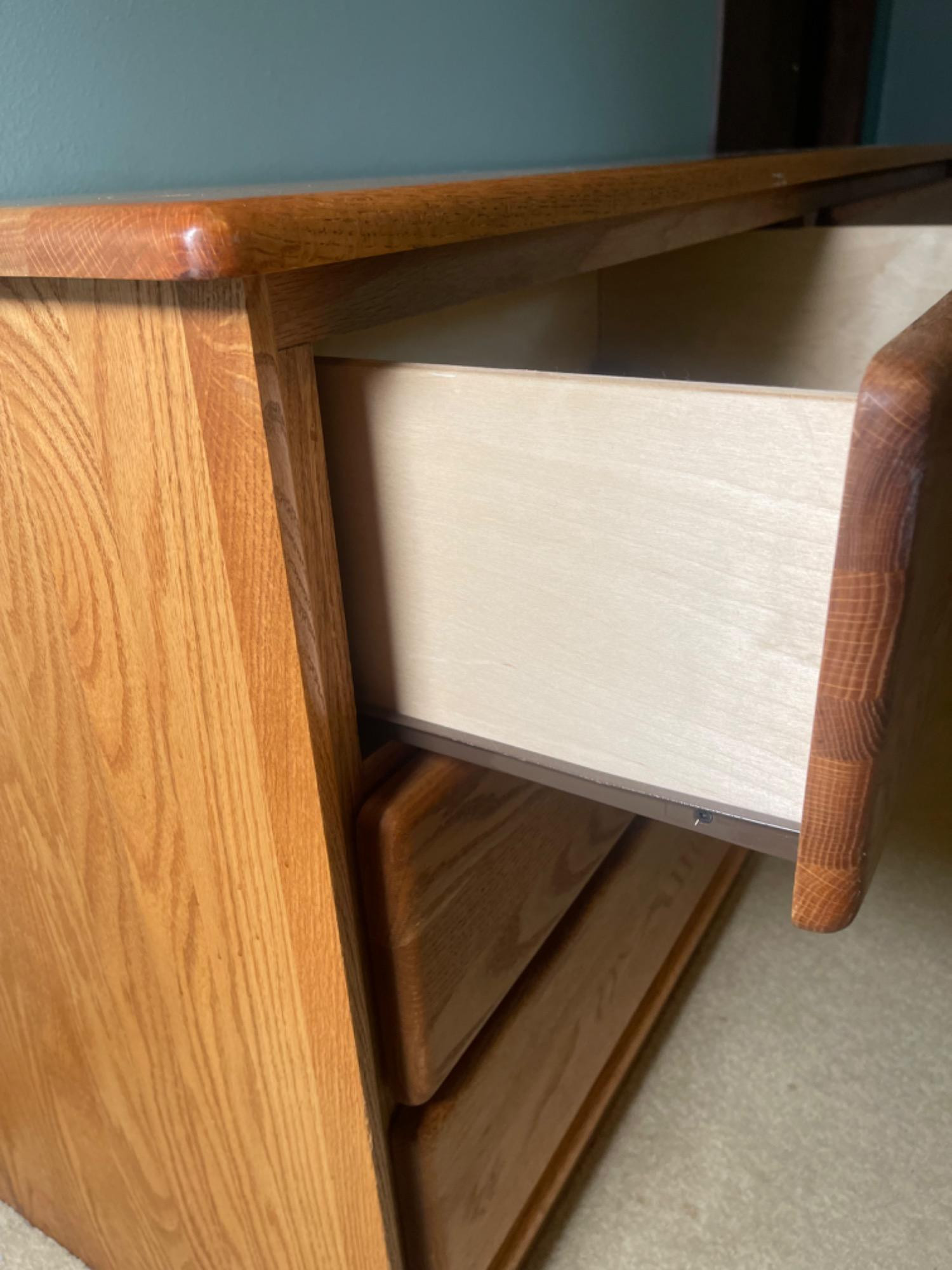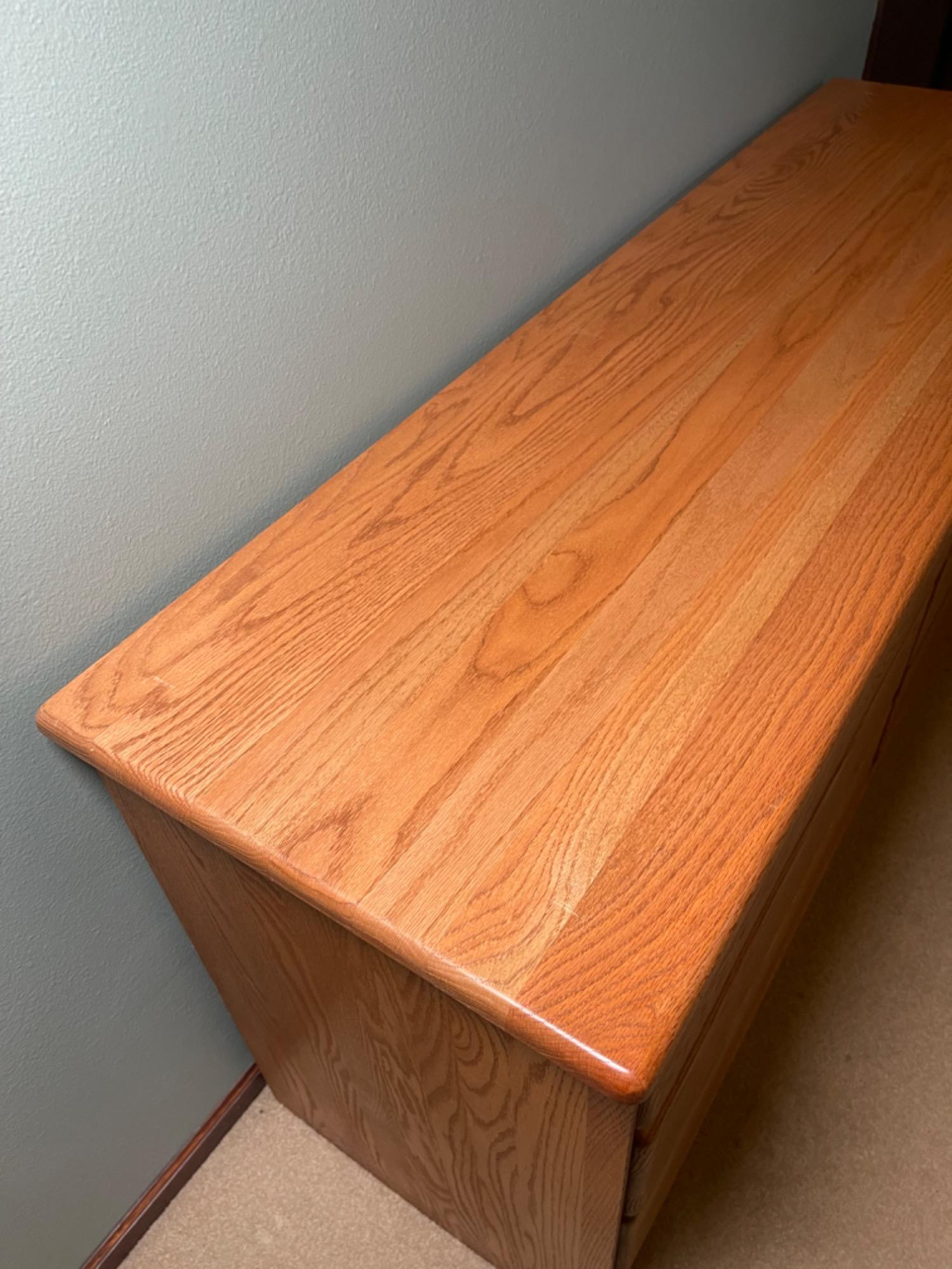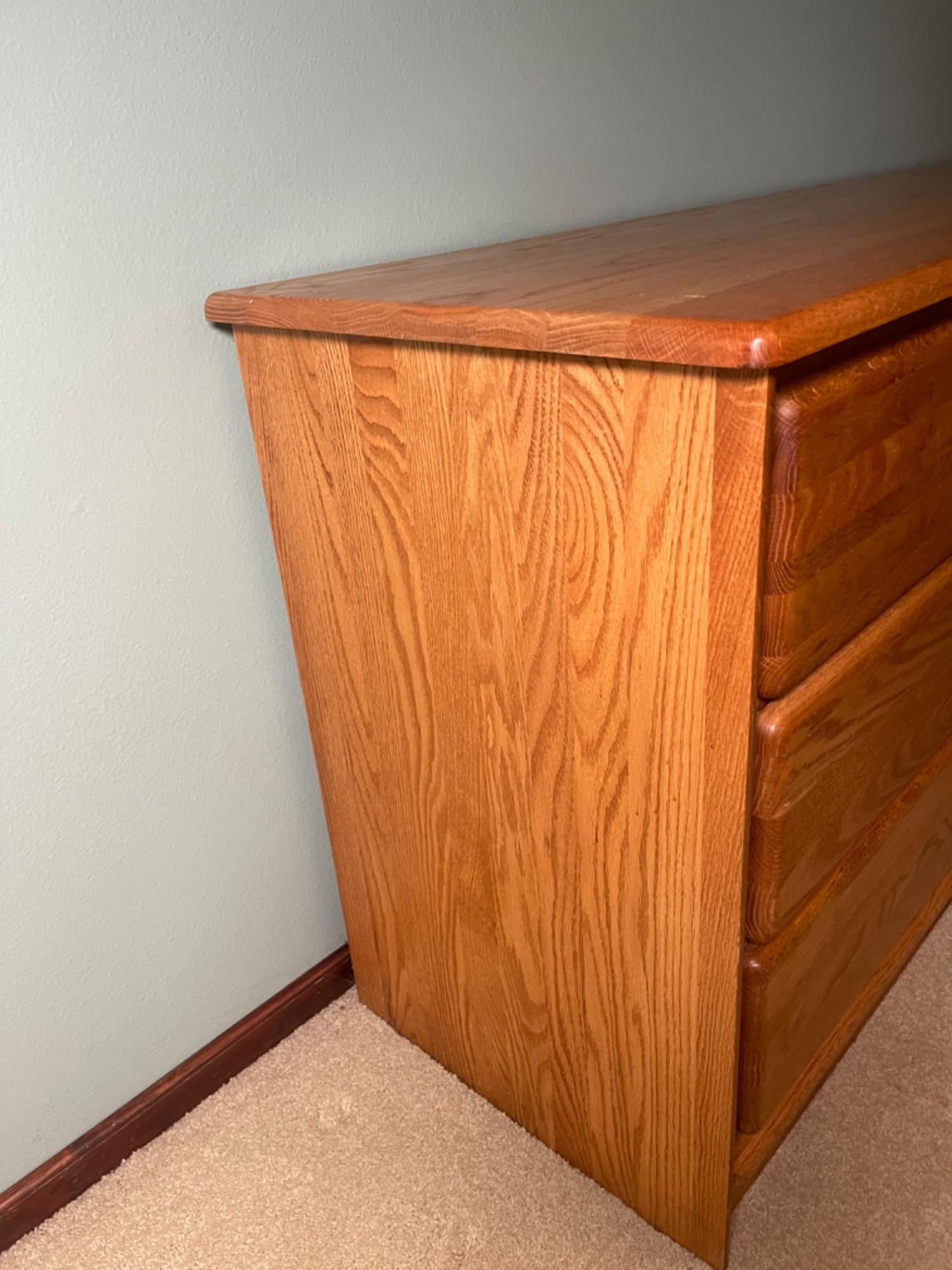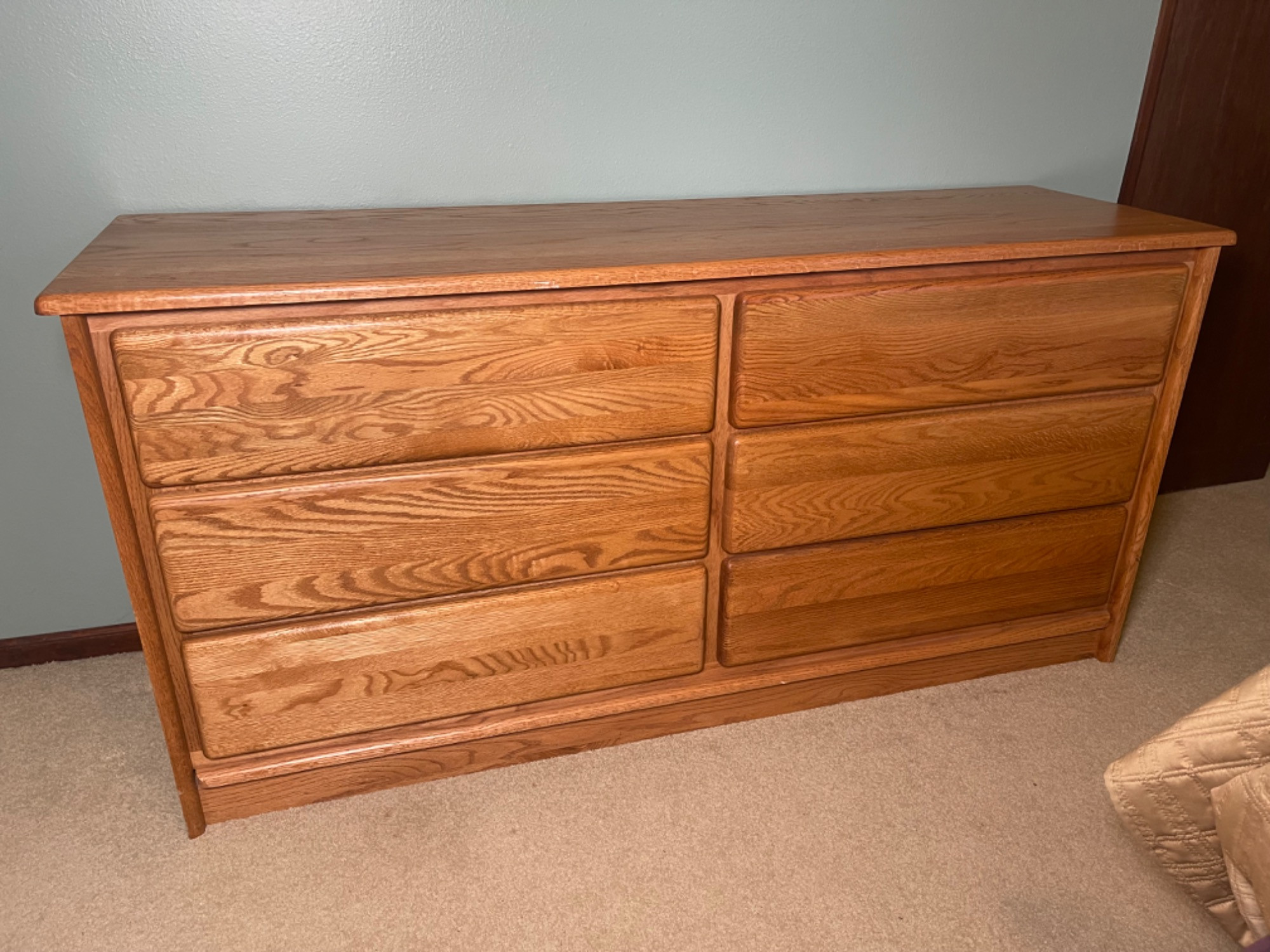 Vintage Solid Oak 6-Drawer Dresser Bring timeless durability and classic craftsmanship to your home with this solid oak 6-drawer dresser. Made in the USA, this piece features a sturdy all-wood construction with a natural oak finish that highlights the rich grain patterns. With a sleek, handle-free drawer design, it offers a clean and modern aesthetic while maintaining a warm, traditional appeal. Condition: - Includes scuffs, scratches, and some stains from use, adding to its character.