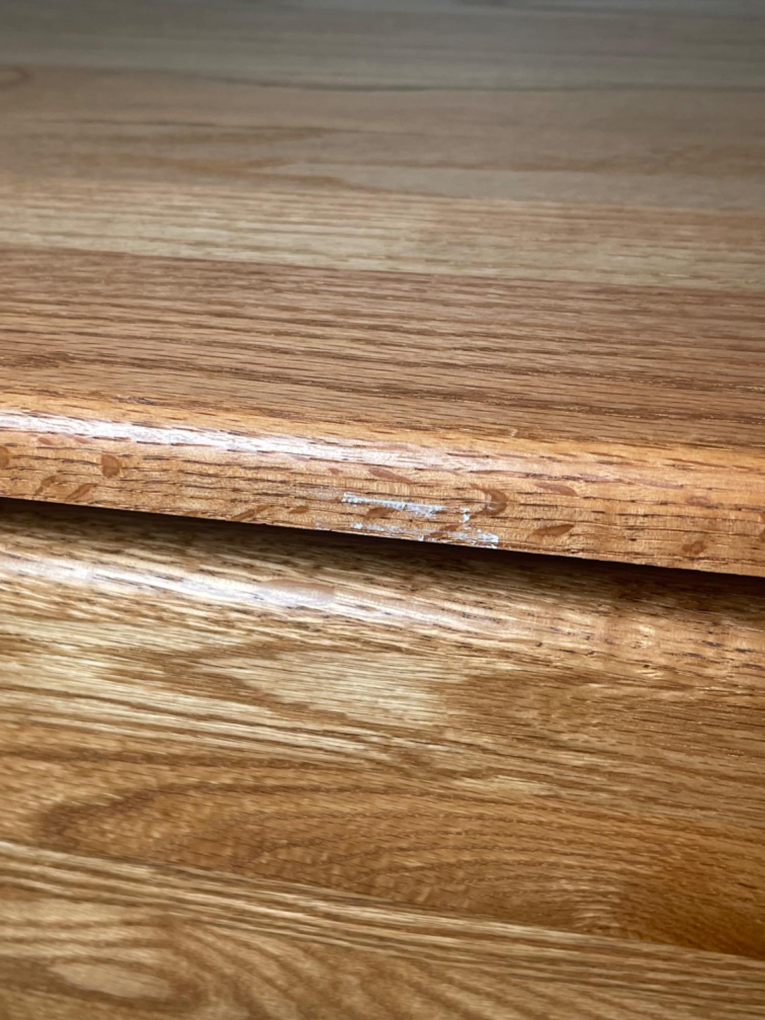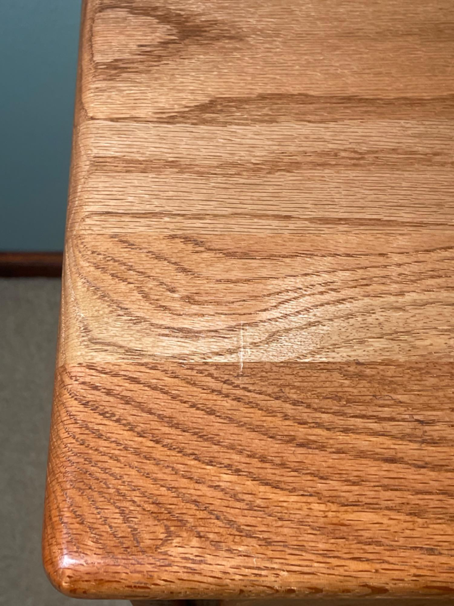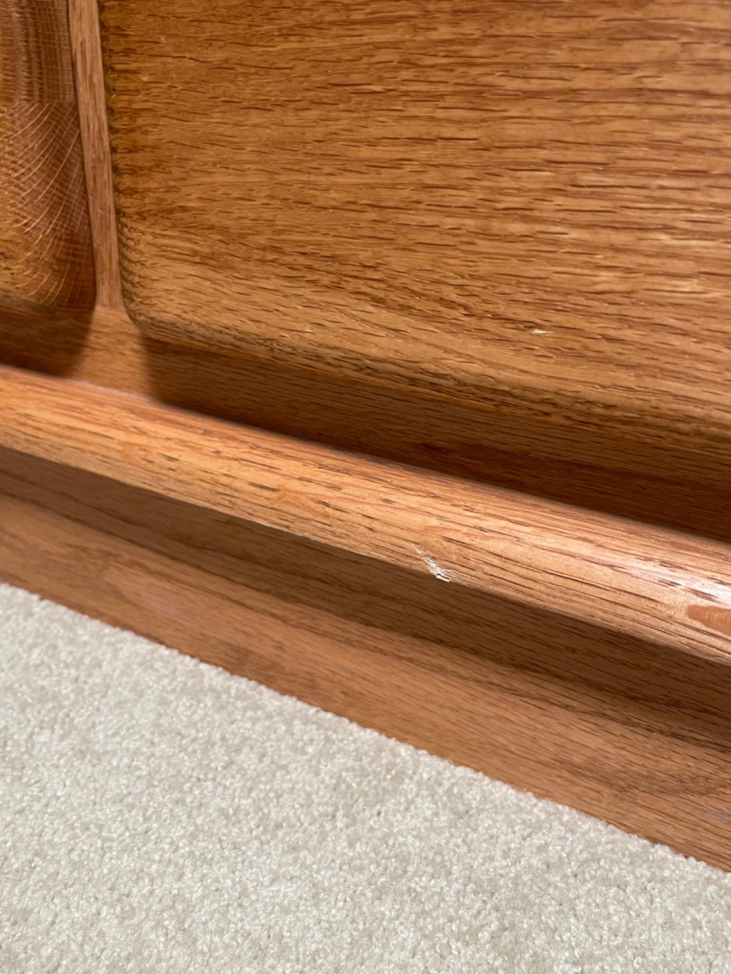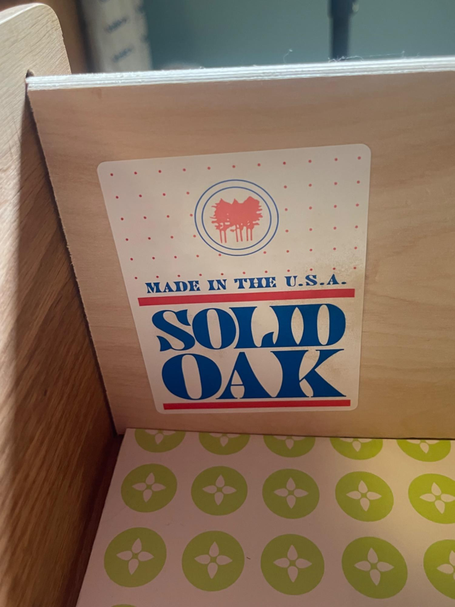 Vintage Solid Oak 6-Drawer Dresser Bring timeless durability and classic craftsmanship to your home with this solid oak 6-drawer dresser. Made in the USA, this piece features a sturdy all-wood construction with a natural oak finish that highlights the rich grain patterns. With a sleek, handle-free drawer design, it offers a clean and modern aesthetic while maintaining a warm, traditional appeal. Condition: - Includes scuffs, scratches, and some stains from use, adding to its character.
