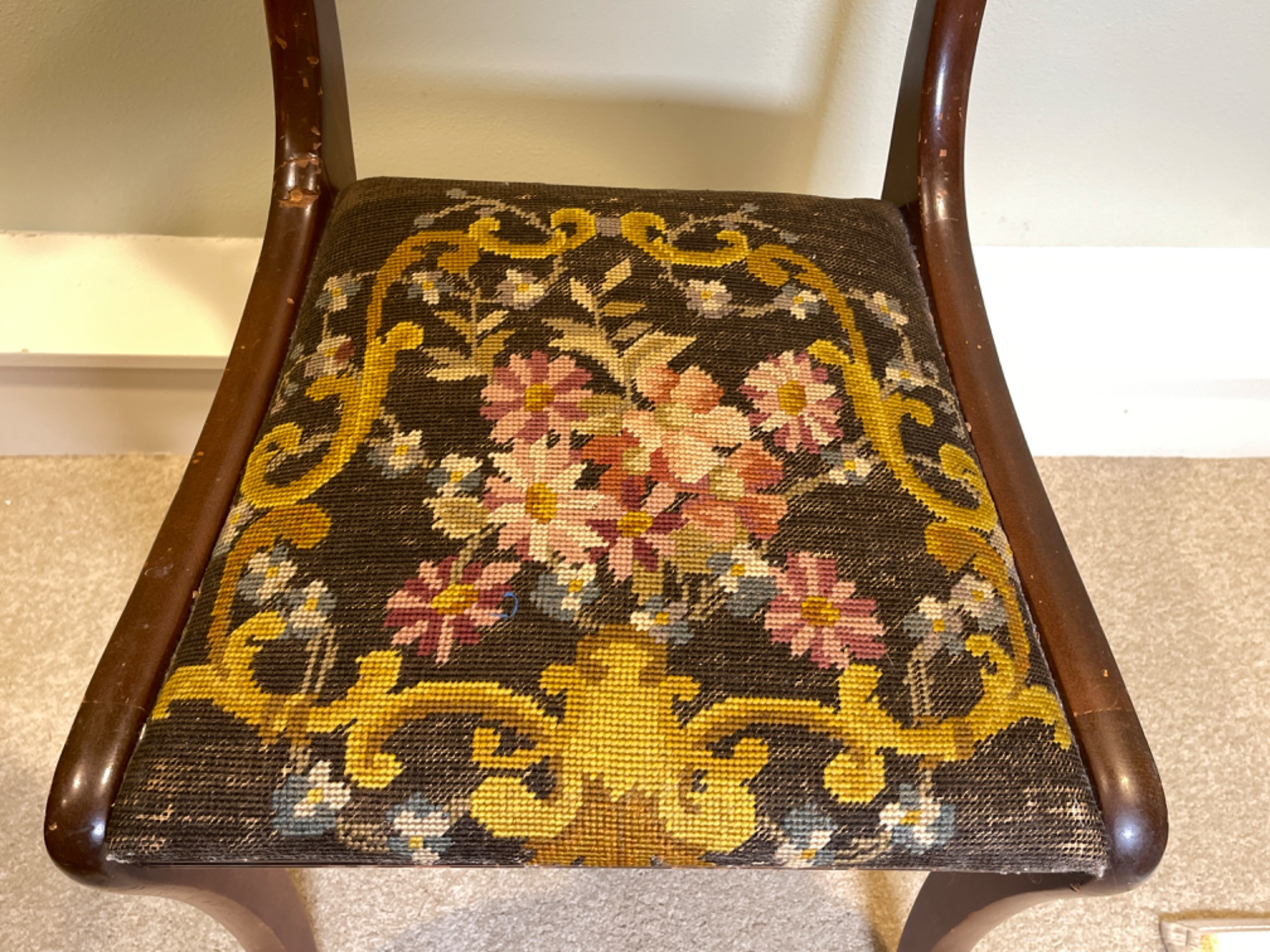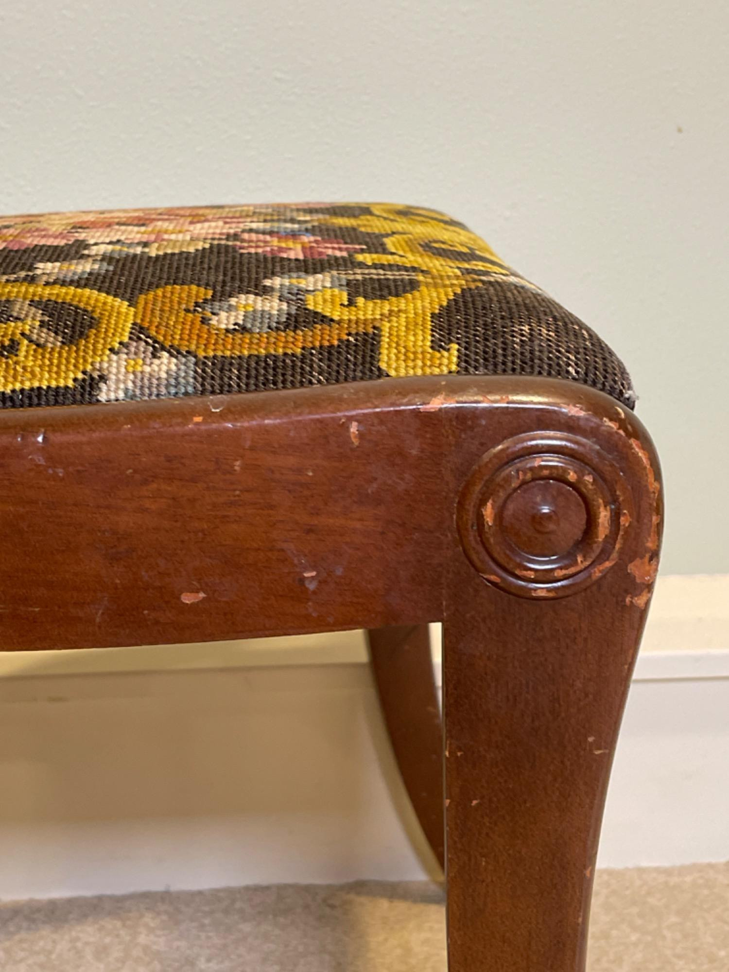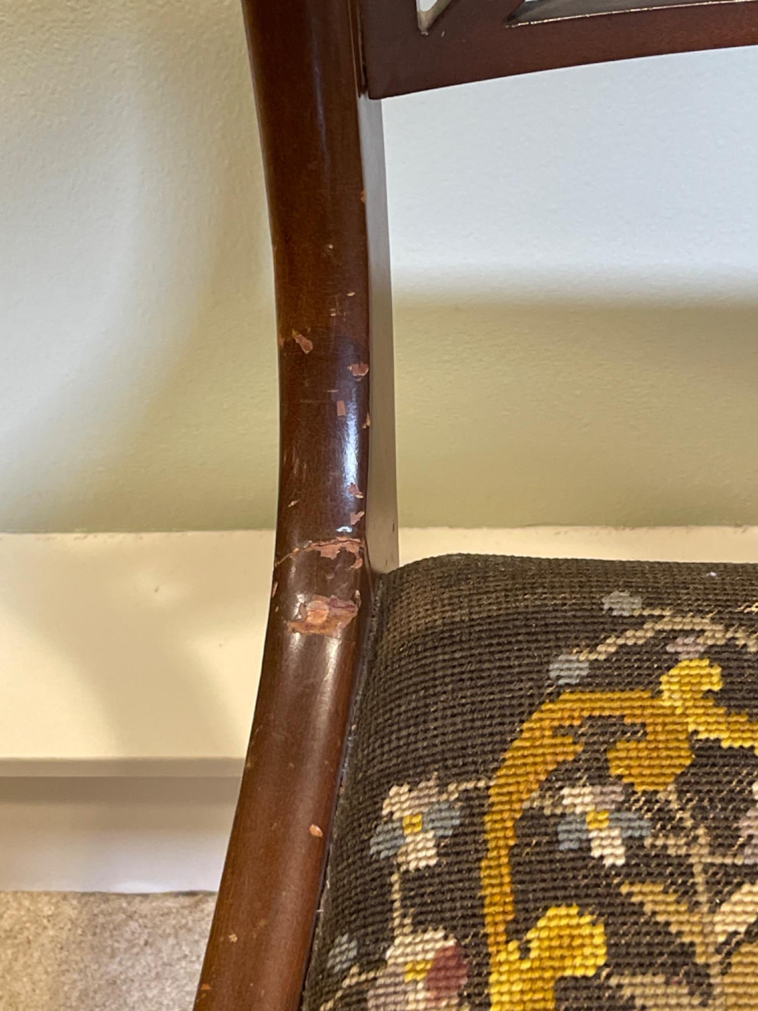 Antique Victorian Needlepoint Upholstered Chair This elegant Antique Victorian Chair features intricate needlepoint upholstery, showcasing the craftsmanship and aesthetic sensibilities of the late 19th century. The chair's frame is constructed from rich, dark-stained wood, complemented by gracefully curved cabriole legs and delicate floral carvings on the backrest. Condition: - Frame: Structurally sound with minor scuffs and scratches consistent with age, enhancing its vintage character. - Upholstery: The needlepoint fabric is well-preserved, with vibrant colors and minimal signs of wear.