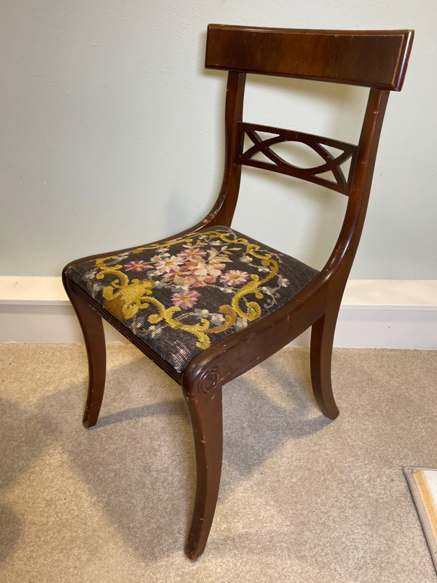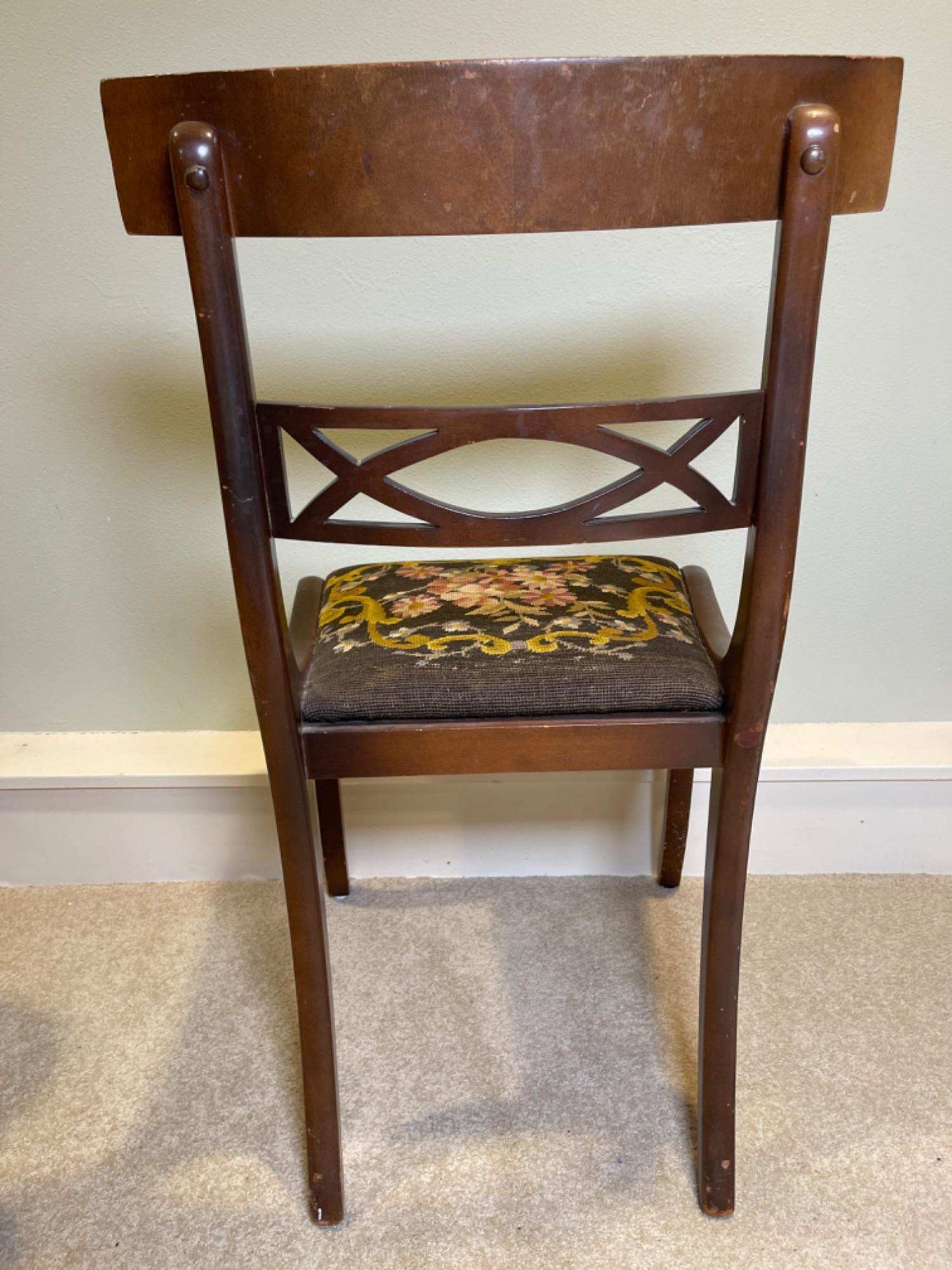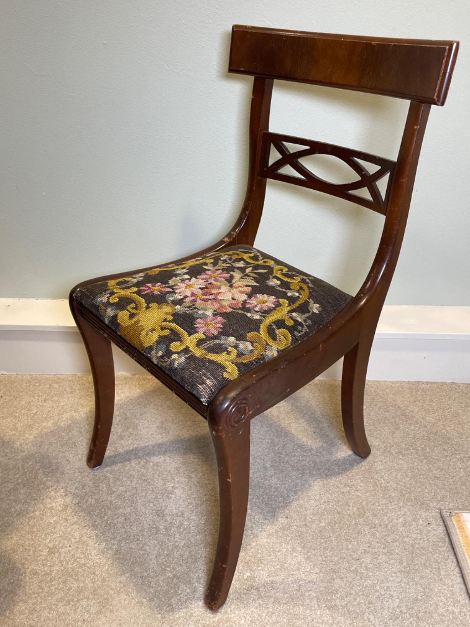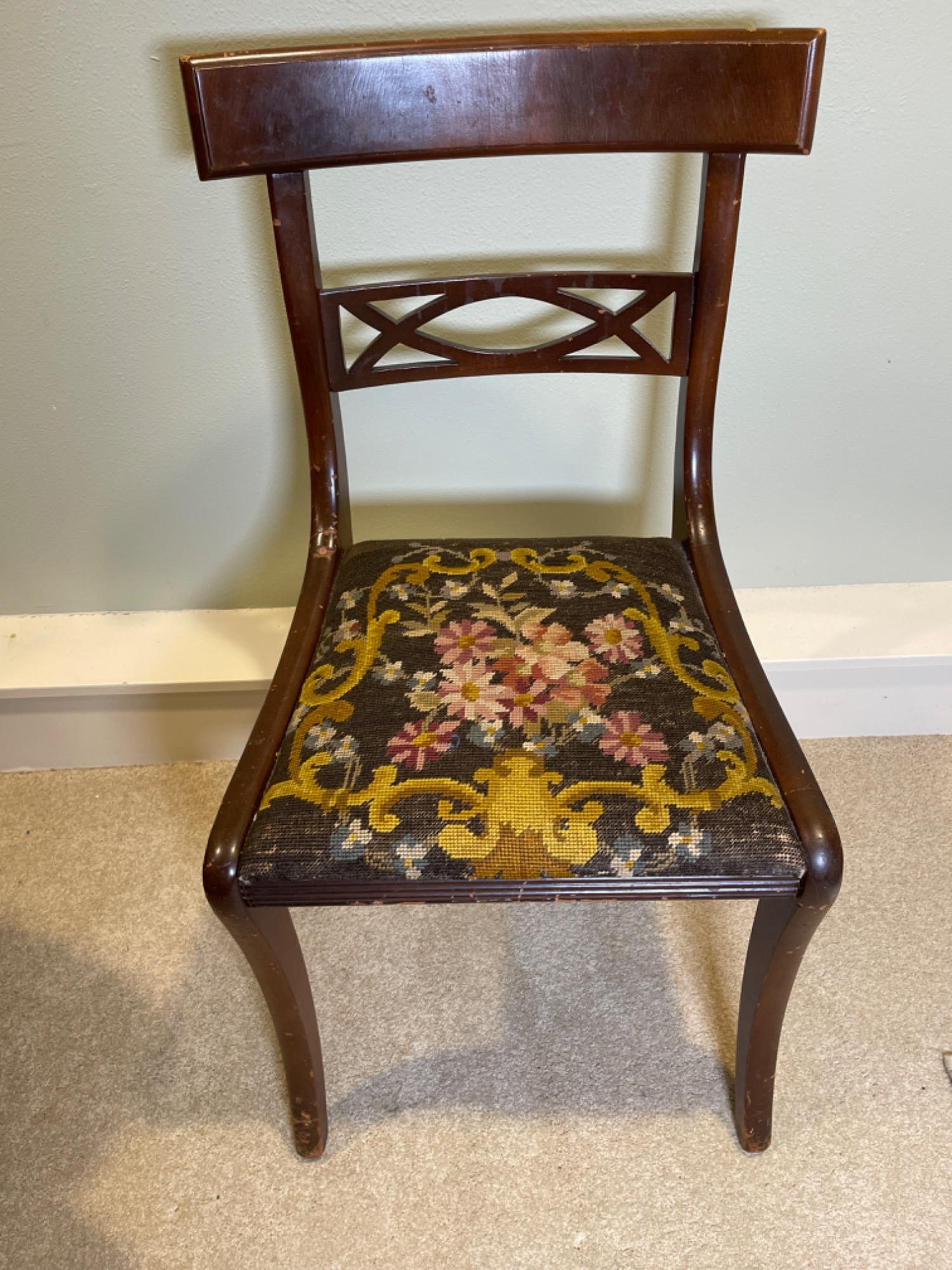 Antique Victorian Needlepoint Upholstered Chair This elegant Antique Victorian Chair features intricate needlepoint upholstery, showcasing the craftsmanship and aesthetic sensibilities of the late 19th century. The chair's frame is constructed from rich, dark-stained wood, complemented by gracefully curved cabriole legs and delicate floral carvings on the backrest. Condition: - Frame: Structurally sound with minor scuffs and scratches consistent with age, enhancing its vintage character. - Upholstery: The needlepoint fabric is well-preserved, with vibrant colors and minimal signs of wear.