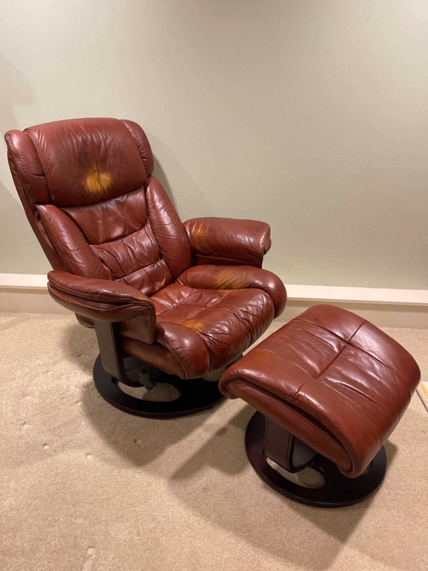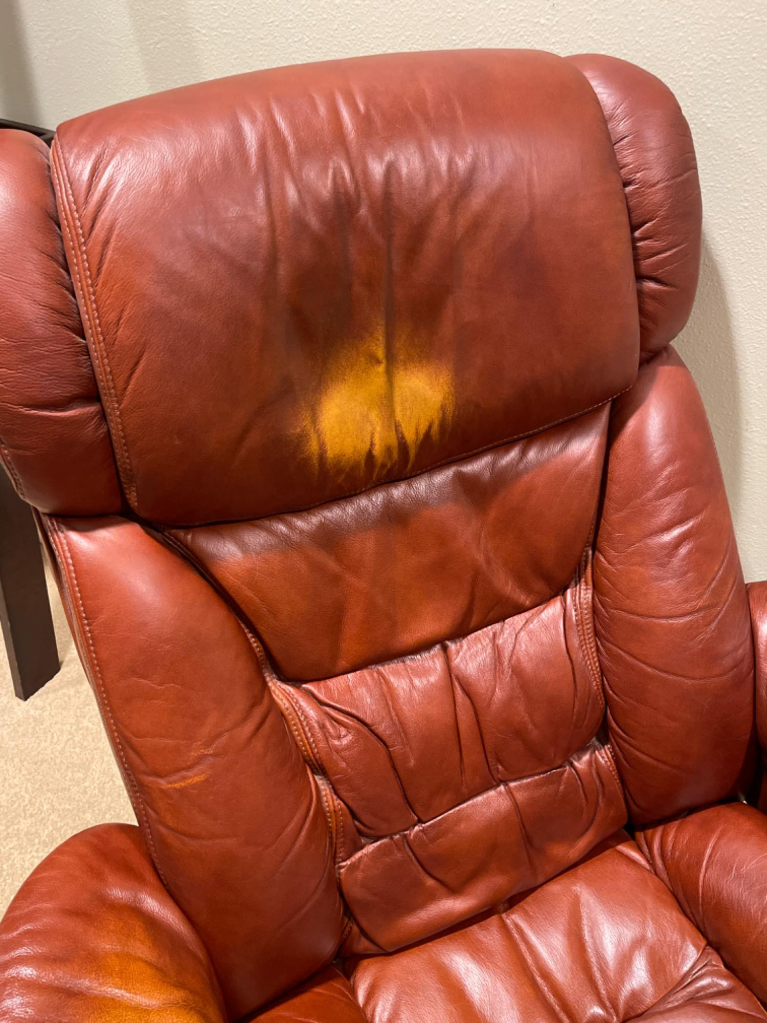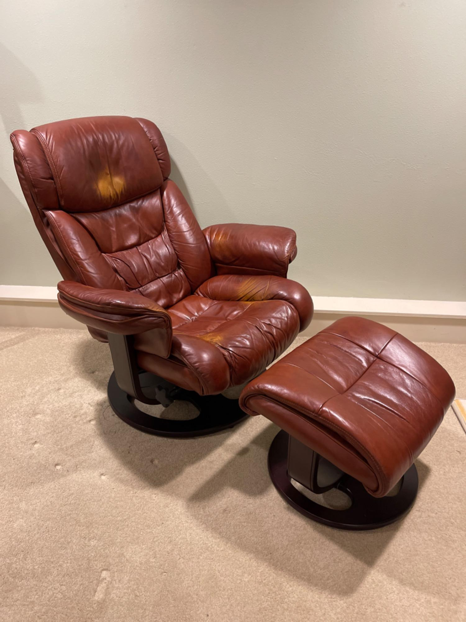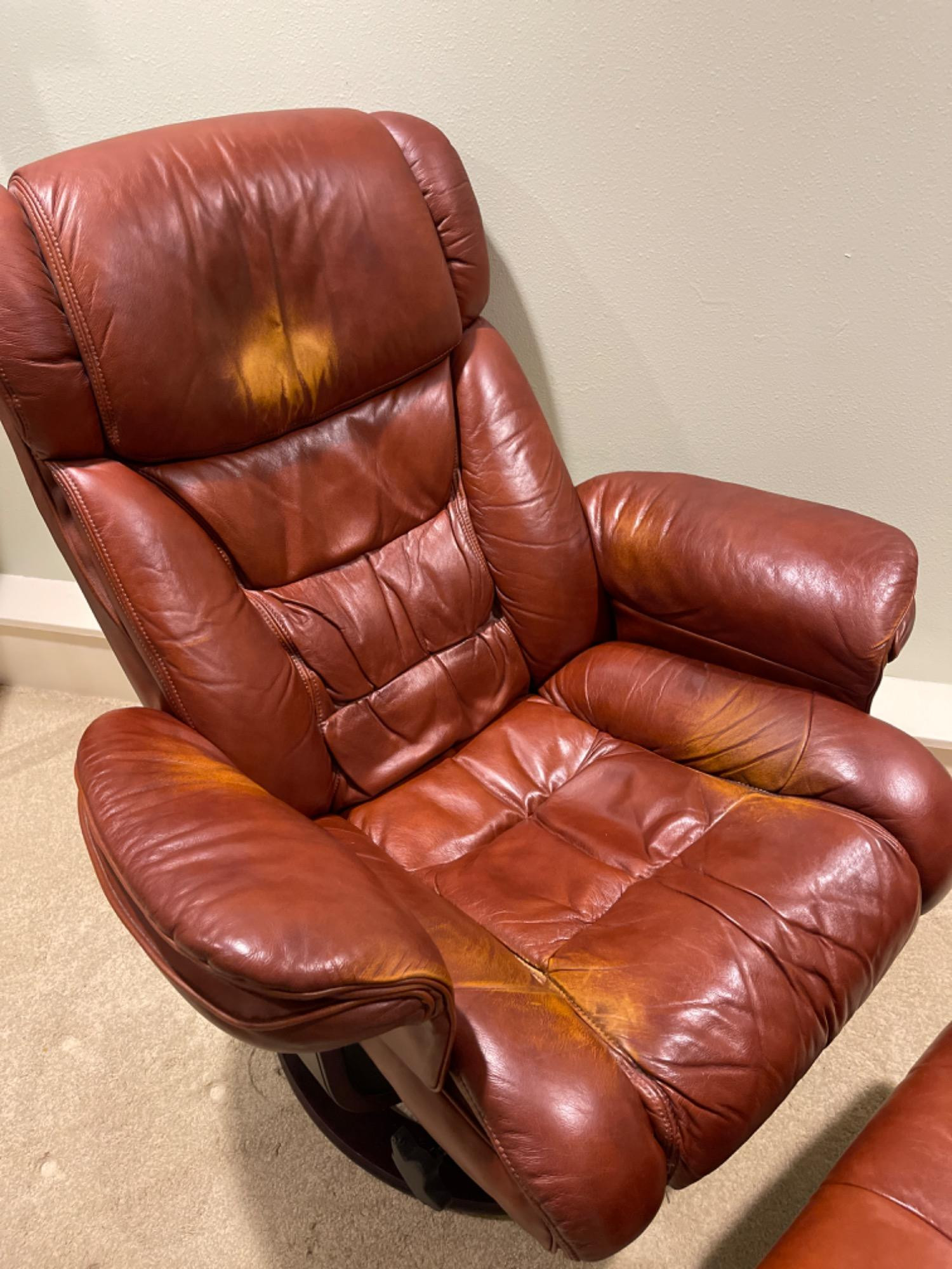 Lane Furniture Red Recliner And Ottoman – Well-Loved Condition Experience the enduring comfort and classic design of this Lane Furniture red recliner. Renowned for their commitment to quality and ergonomic support, Lane Furniture has been a trusted name in the industry since 1912. Condition Notes: Visible Wear: The recliner exhibits multiple stains and scratches, indicative of extensive use. Cushioning: The cushions are noticeably worn in, reflecting frequent usage over time. Unknown if real leather. Dimensions: Chair: 34" L x 34" W x 38" H Ottoman: 22" L x 18.5" W x 16" H