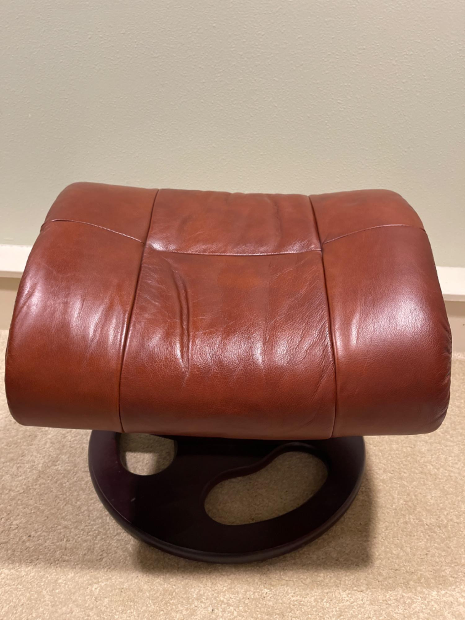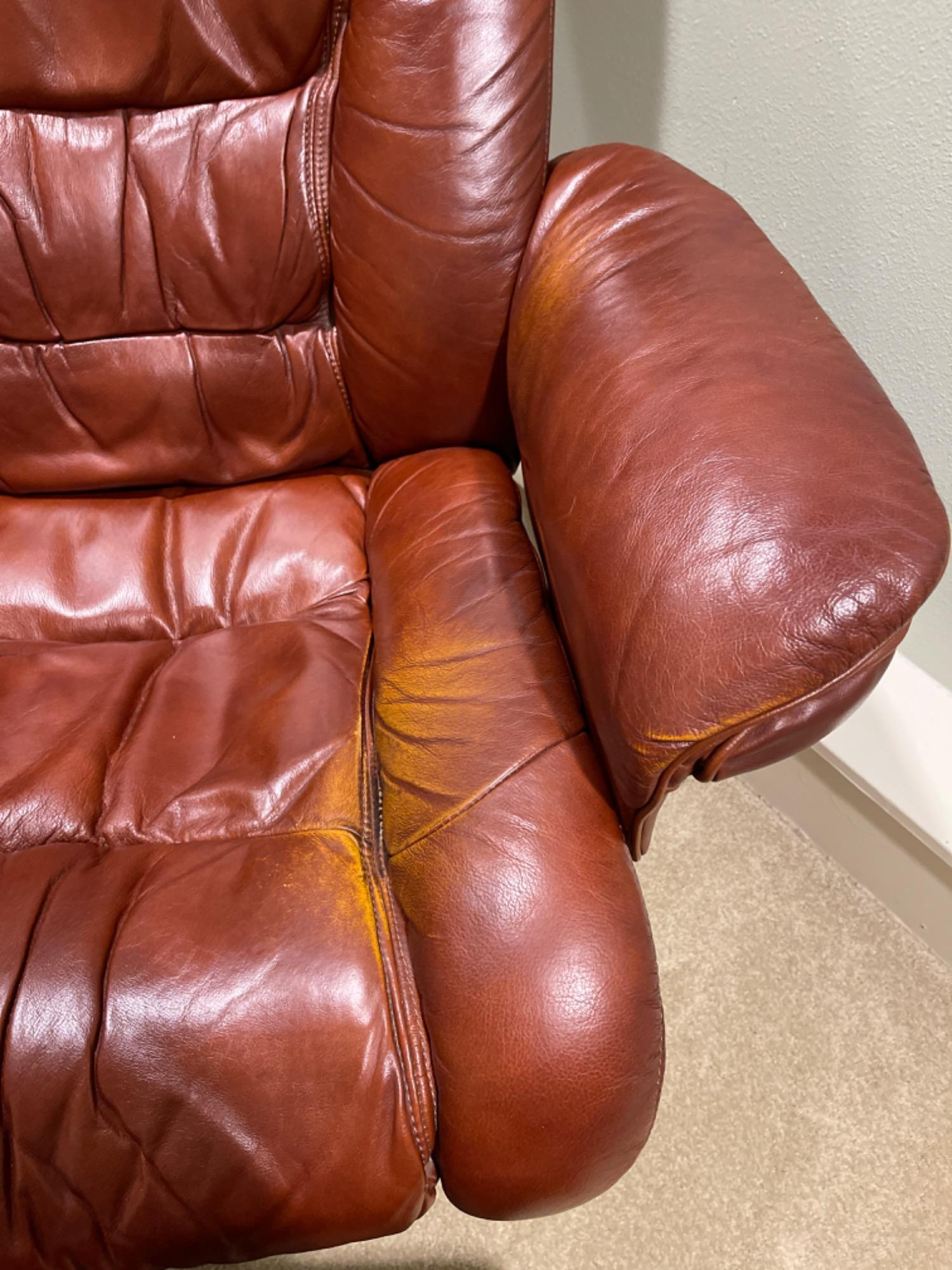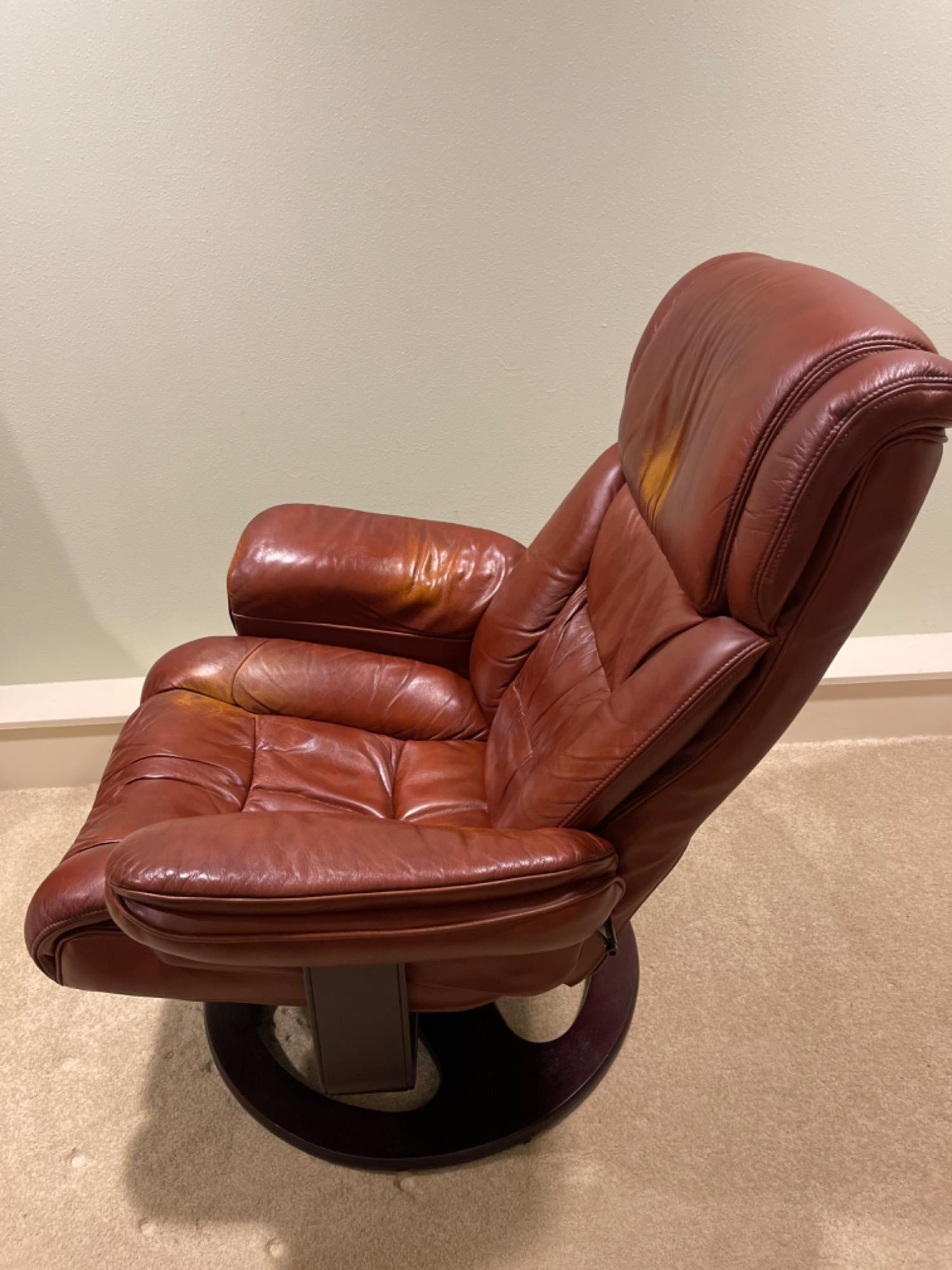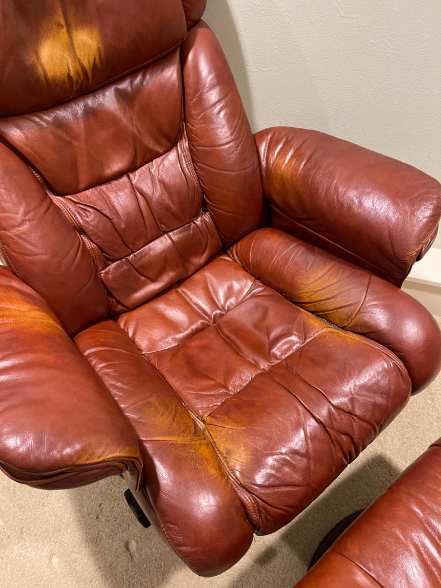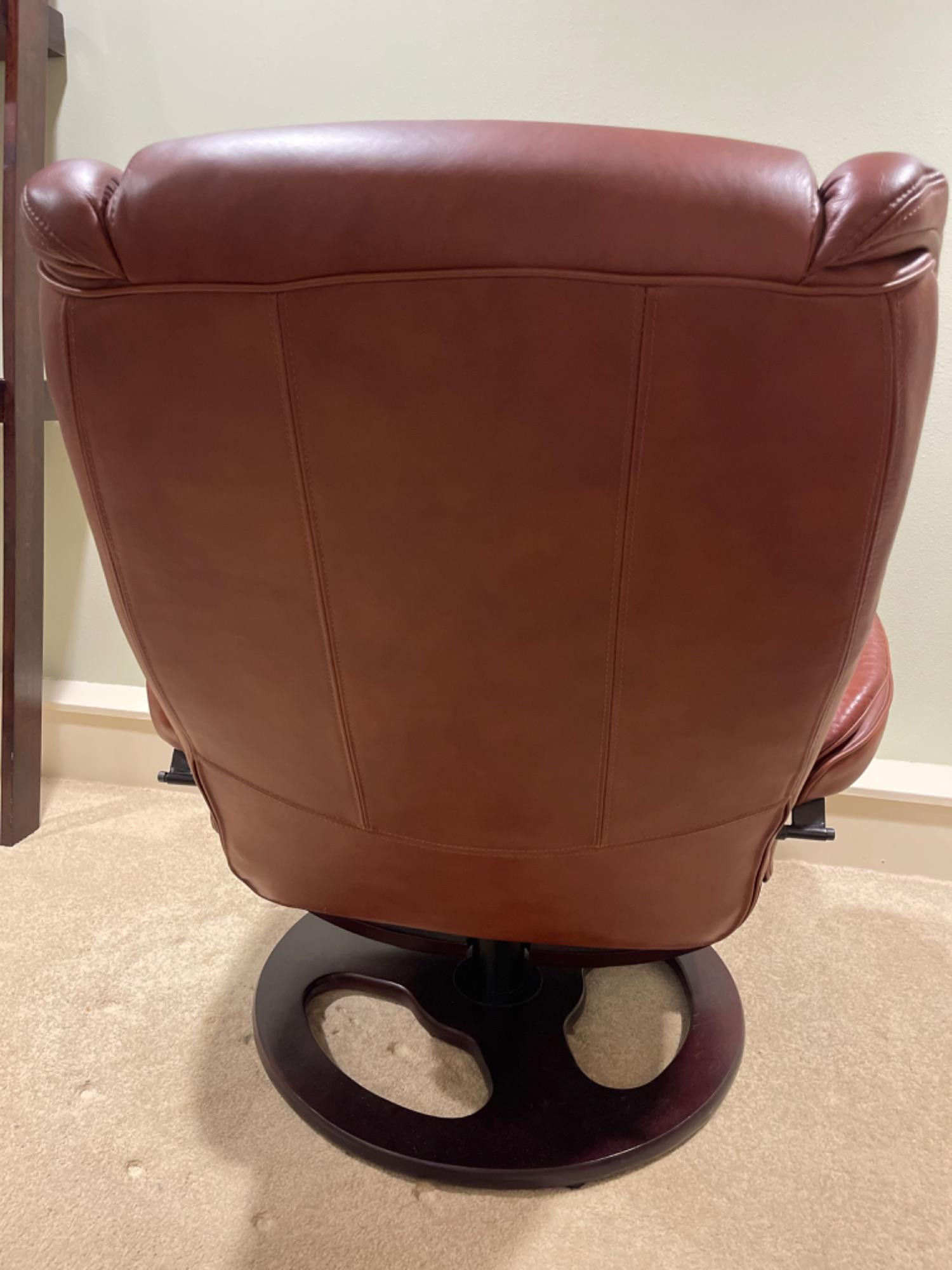 Lane Furniture Red Recliner And Ottoman – Well-Loved Condition Experience the enduring comfort and classic design of this Lane Furniture red recliner. Renowned for their commitment to quality and ergonomic support, Lane Furniture has been a trusted name in the industry since 1912. Condition Notes: Visible Wear: The recliner exhibits multiple stains and scratches, indicative of extensive use. Cushioning: The cushions are noticeably worn in, reflecting frequent usage over time. Unknown if real leather. Dimensions: Chair: 34" L x 34" W x 38" H Ottoman: 22" L x 18.5" W x 16" H