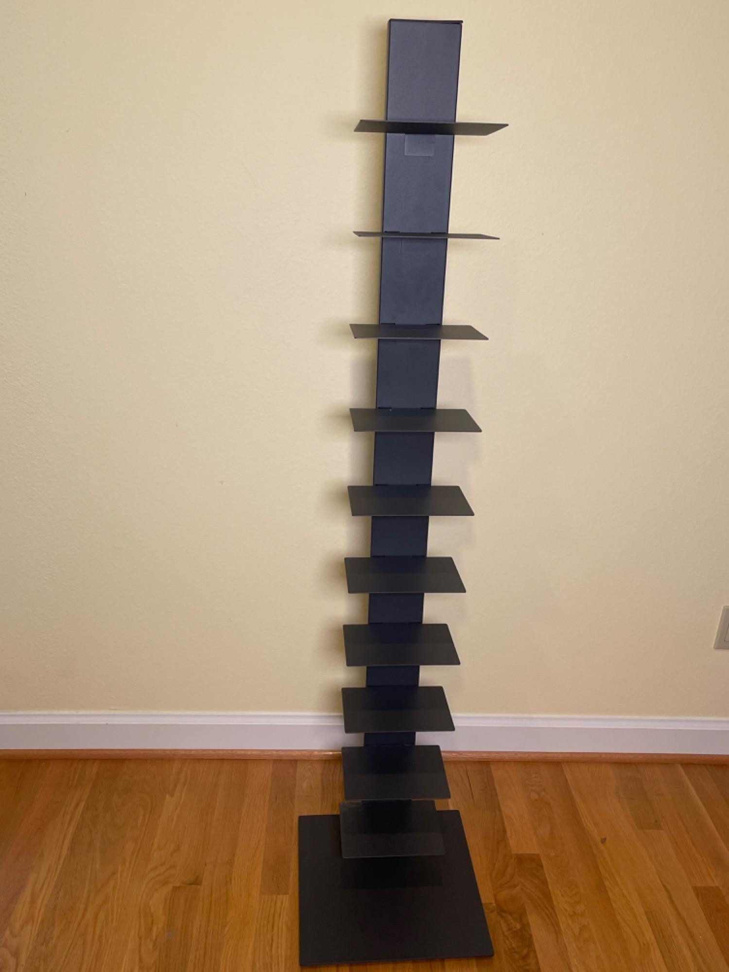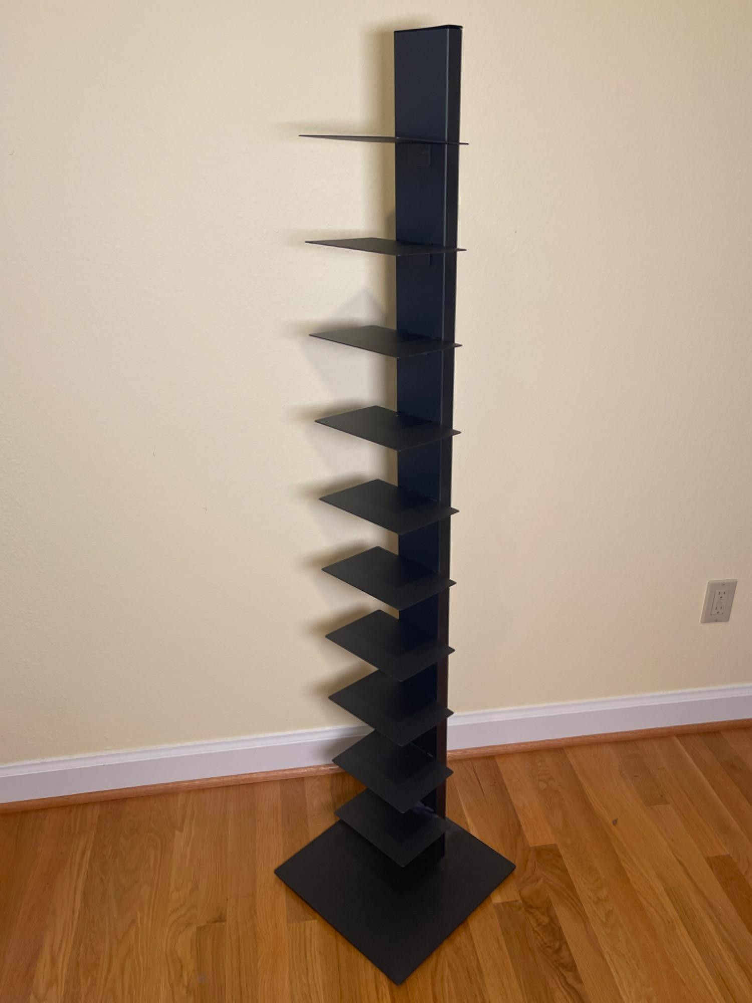 Modern and space-saving Sapiens book tower shelf with a sleek black metal design. Features multiple tiers for vertical book stacking, making it a stylish and functional addition to any home or office.