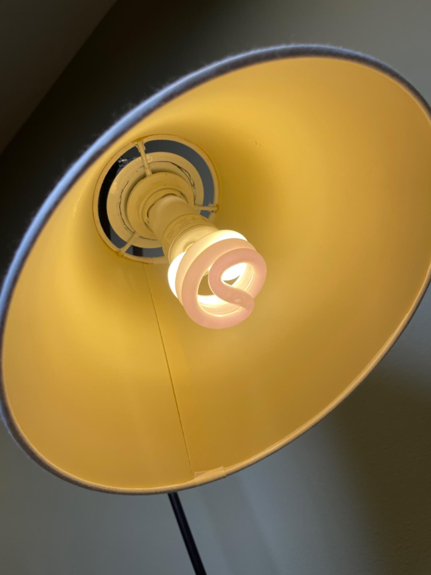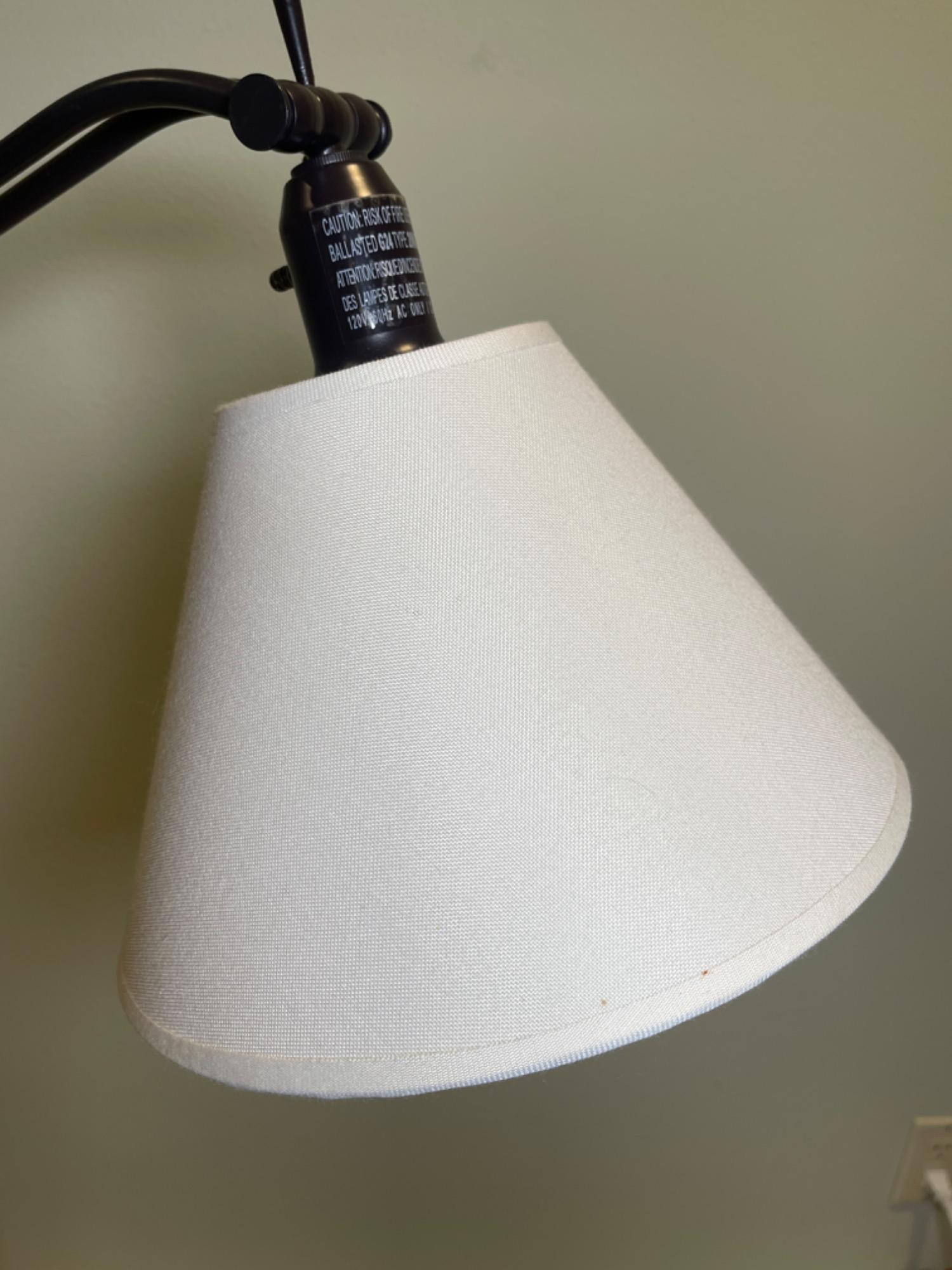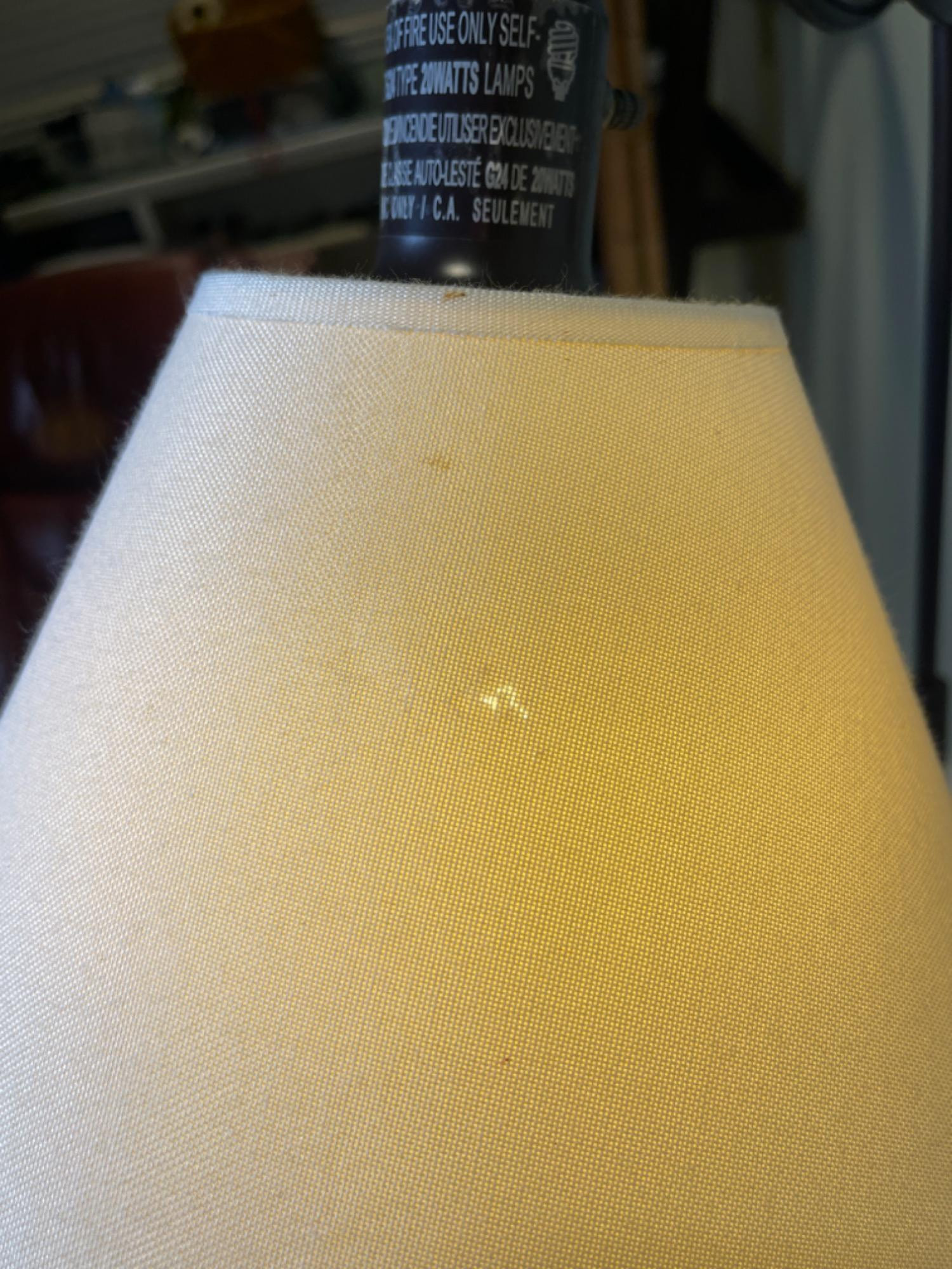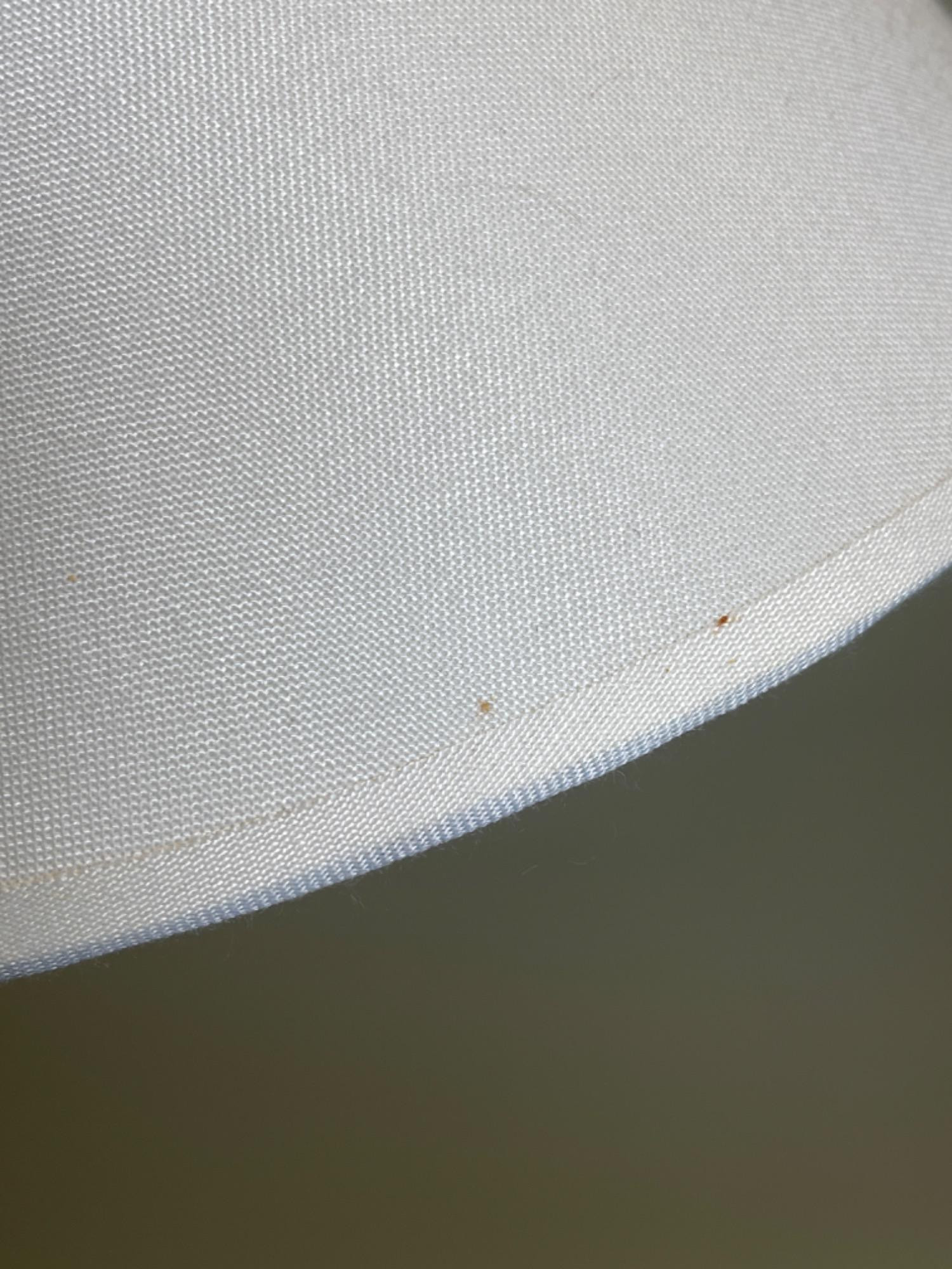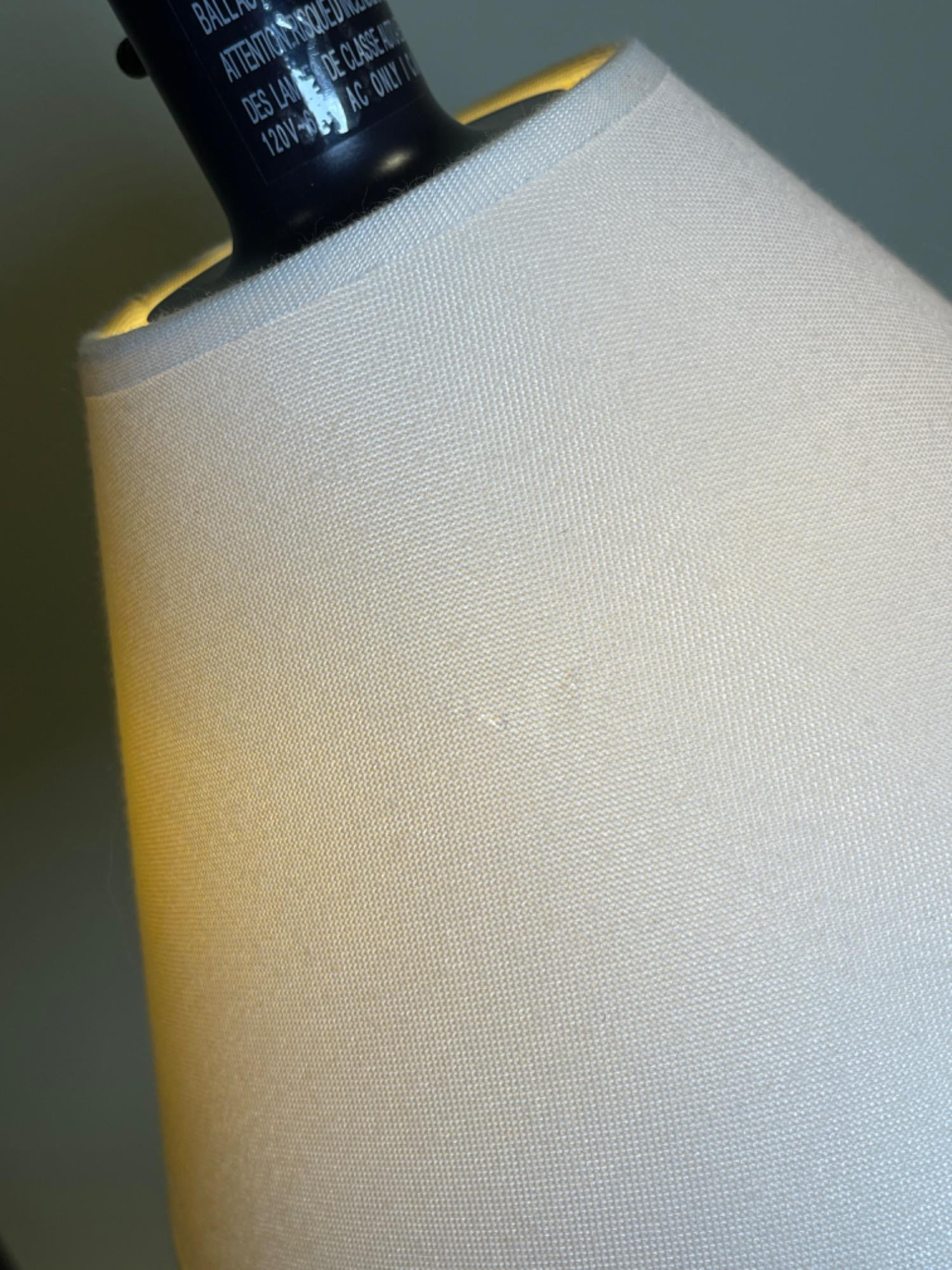 Condition: Tested and works. Minor scuffs and scratches on the base. The shade is in good condition but has some small holes forming.
