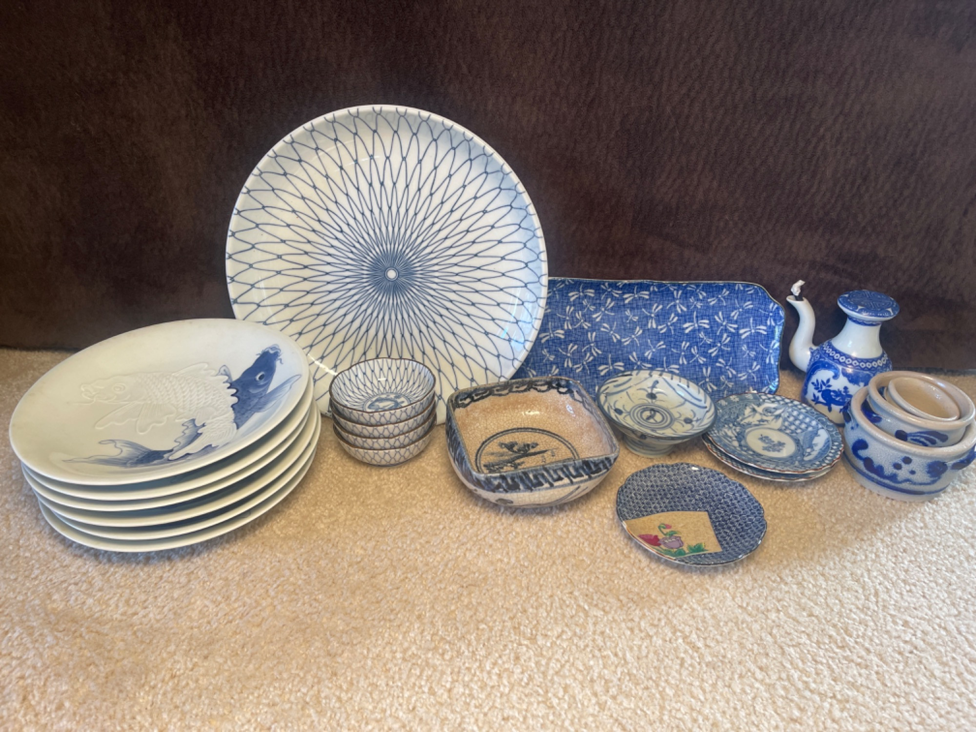 Large Assortment of Vintage Blue and White Japanese Dishes