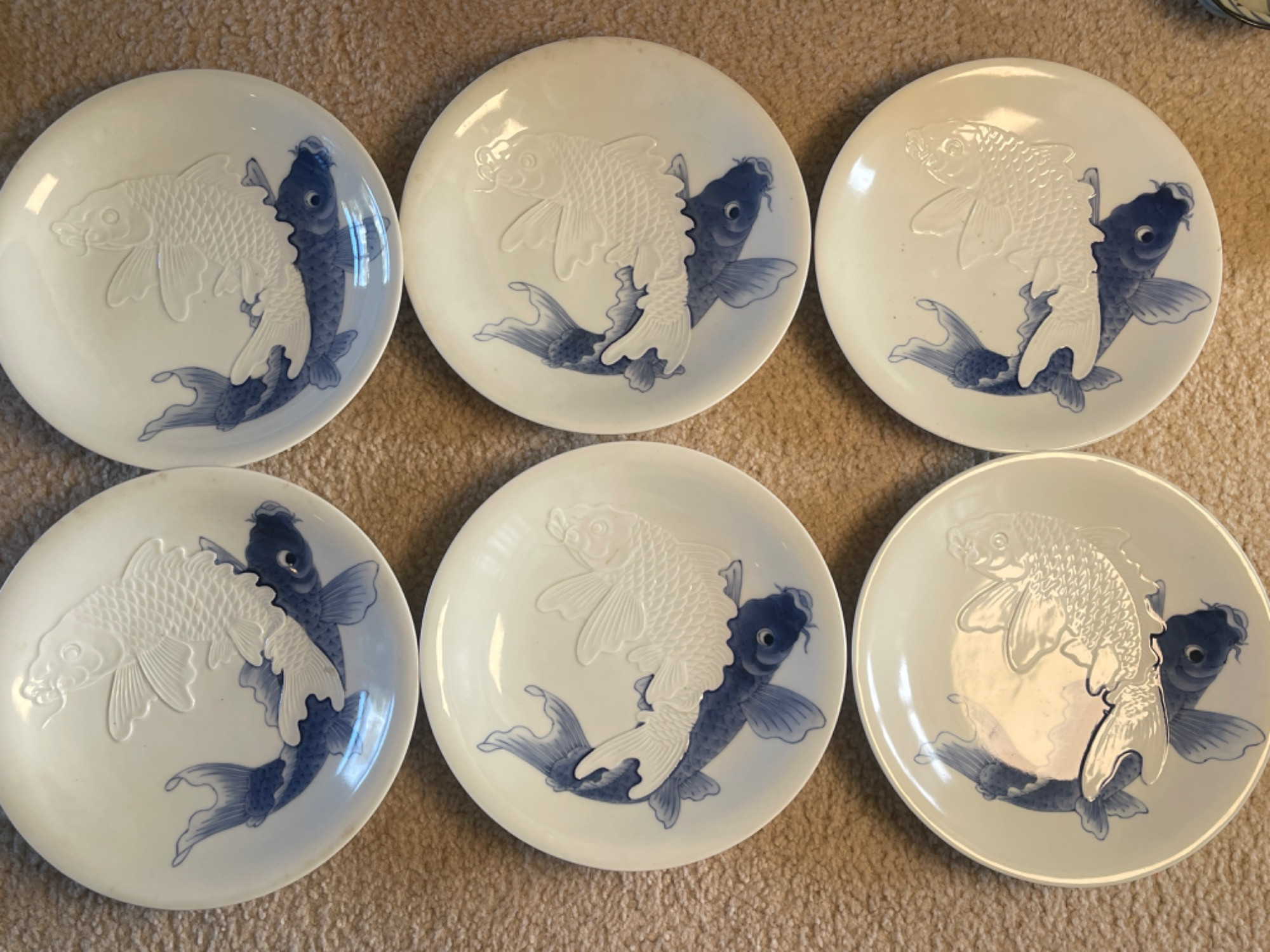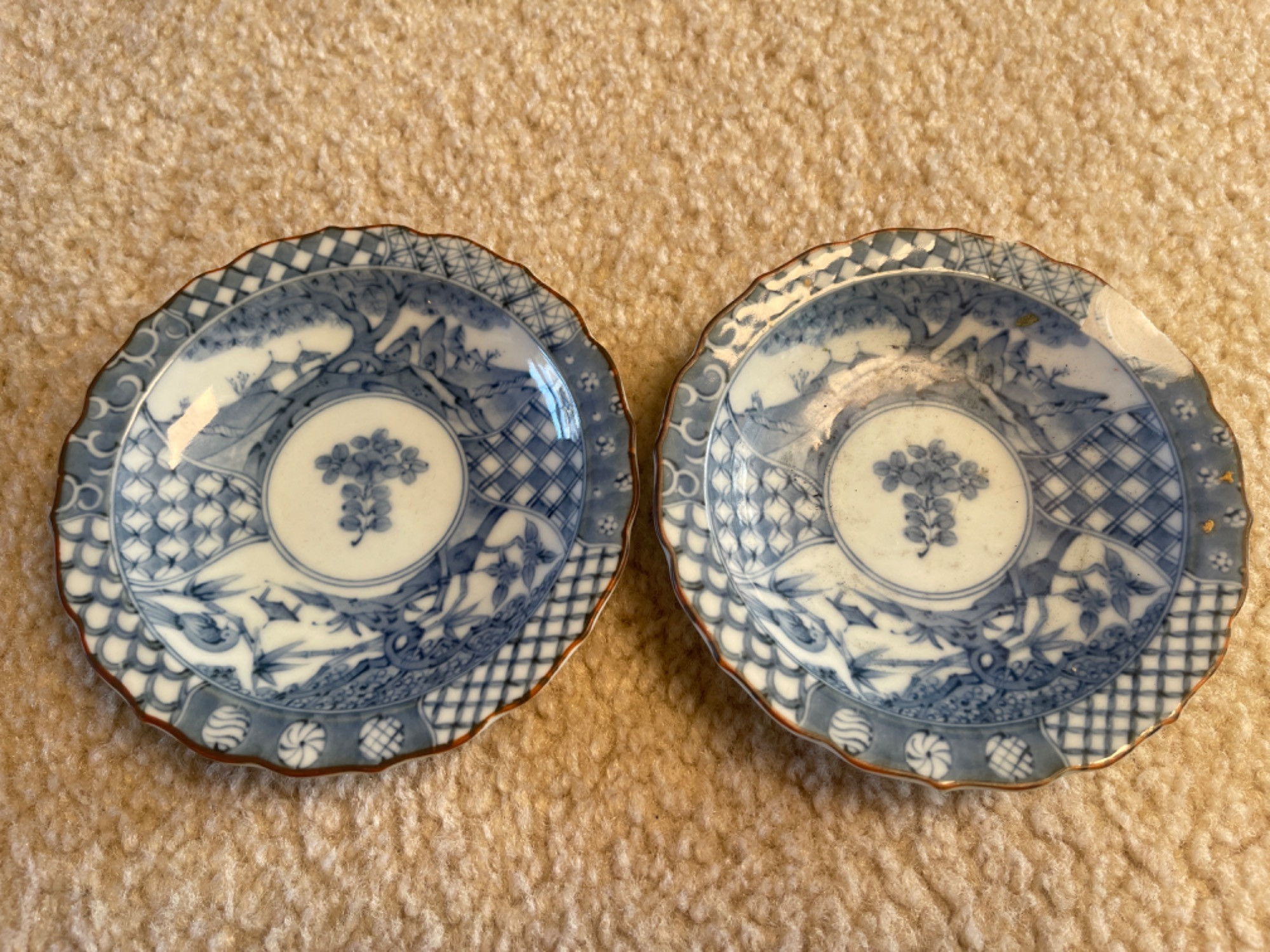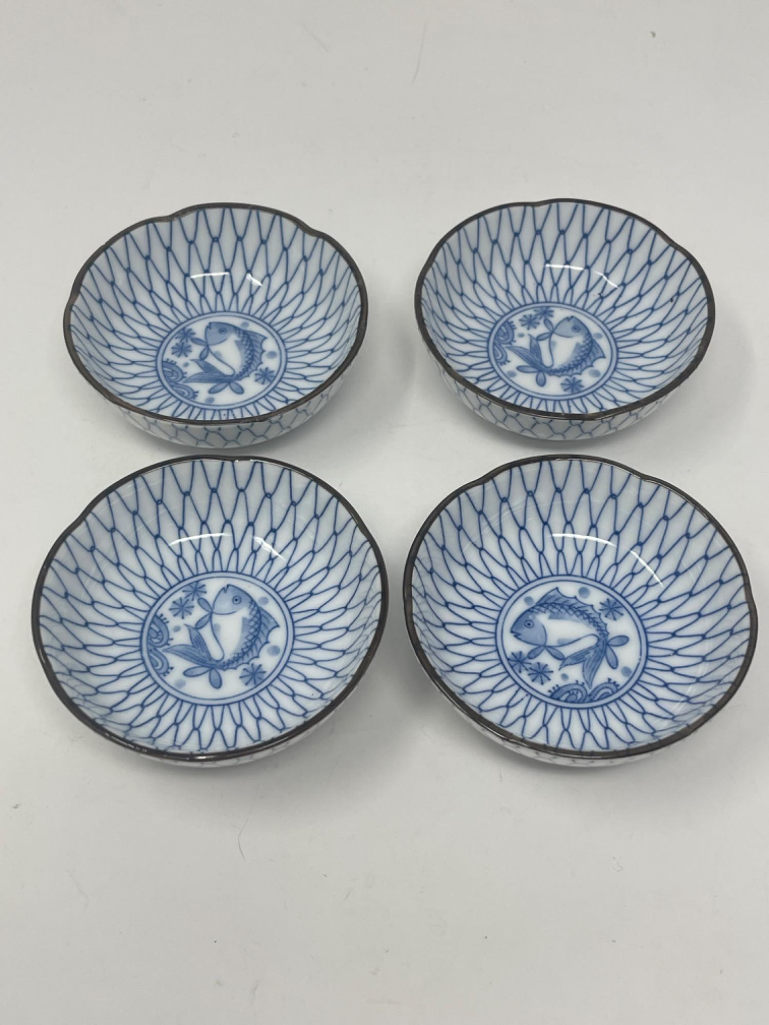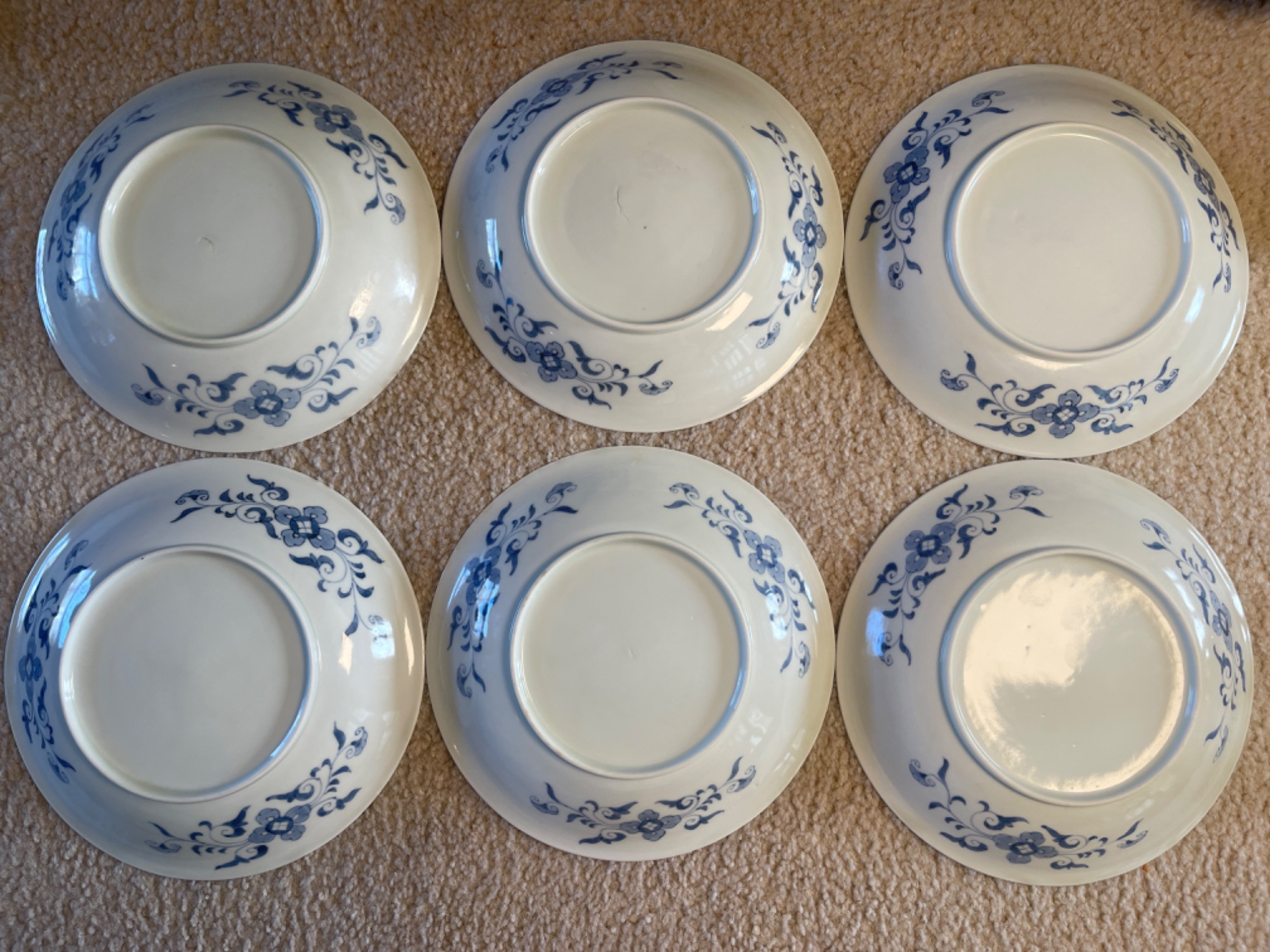 Beautiful collection of vintage Japanese blue and white porcelain and ceramic dishes, featuring a variety of intricate patterns and traditional designs. Many pieces are signed or stamped, showcasing craftsmanship and authenticity.